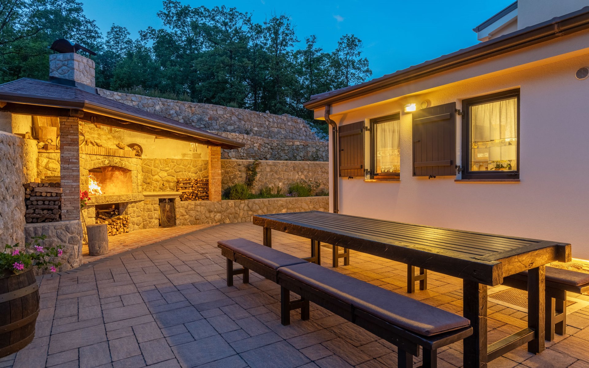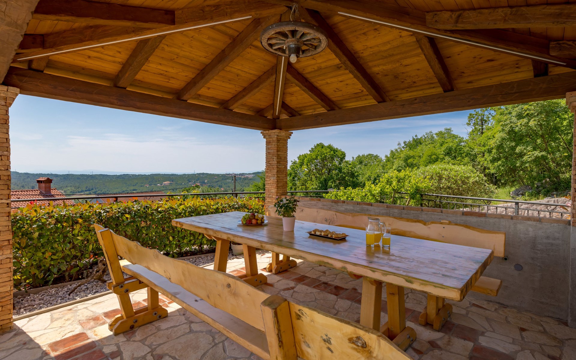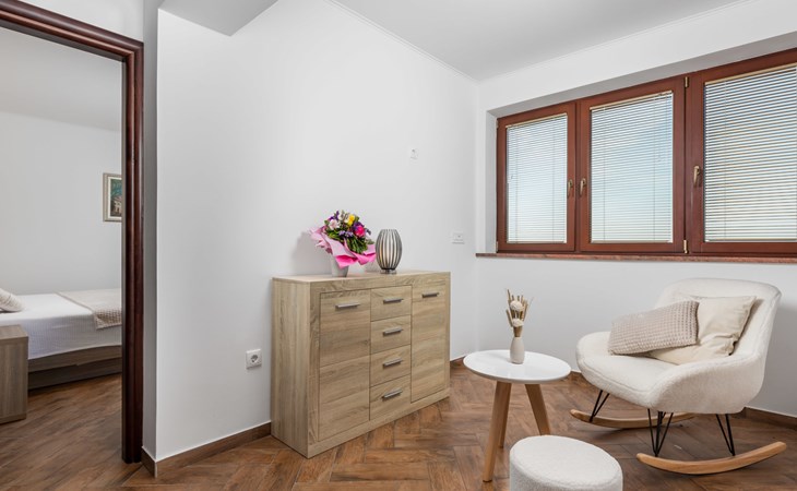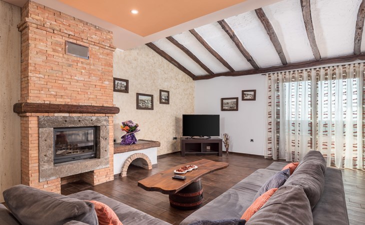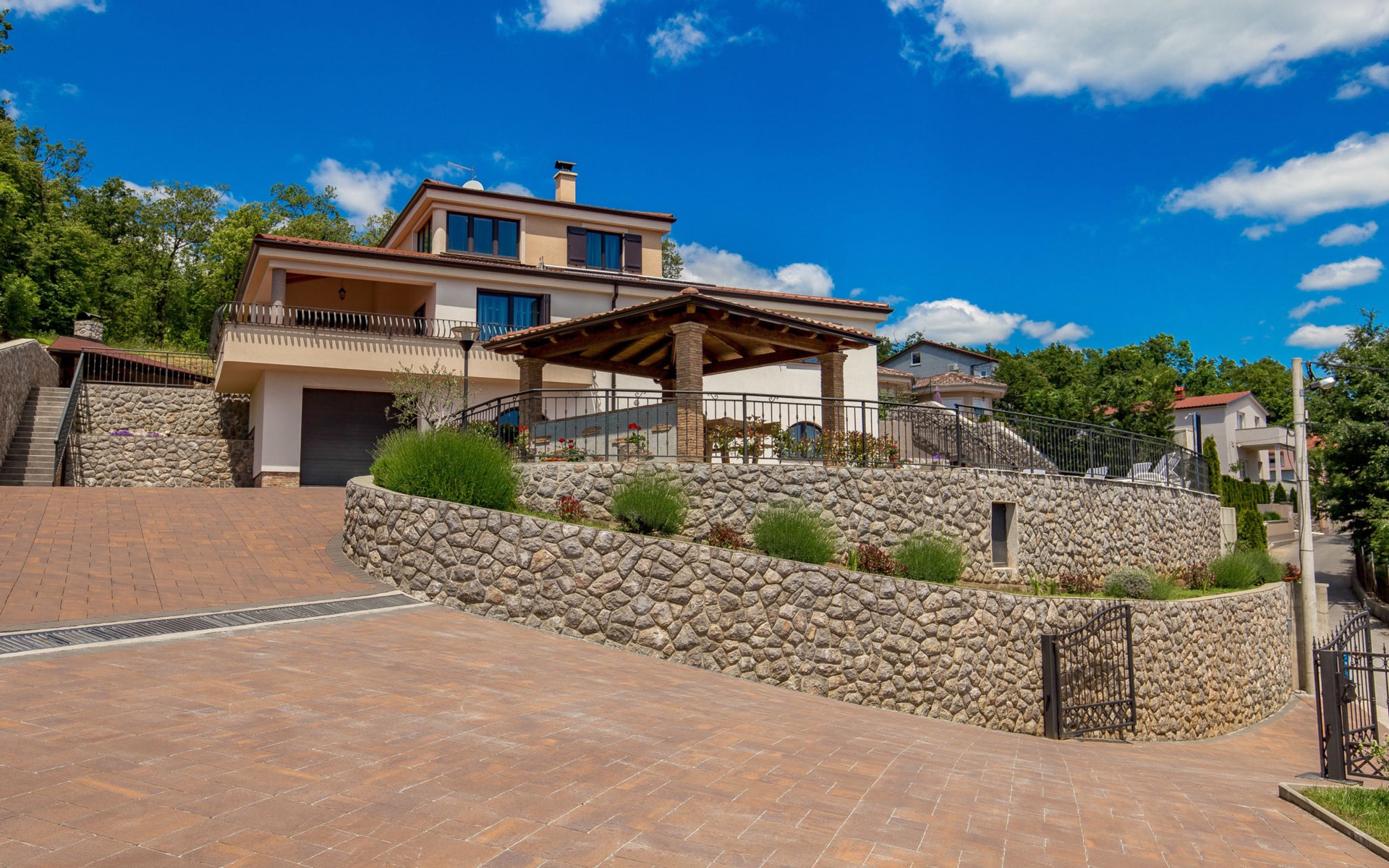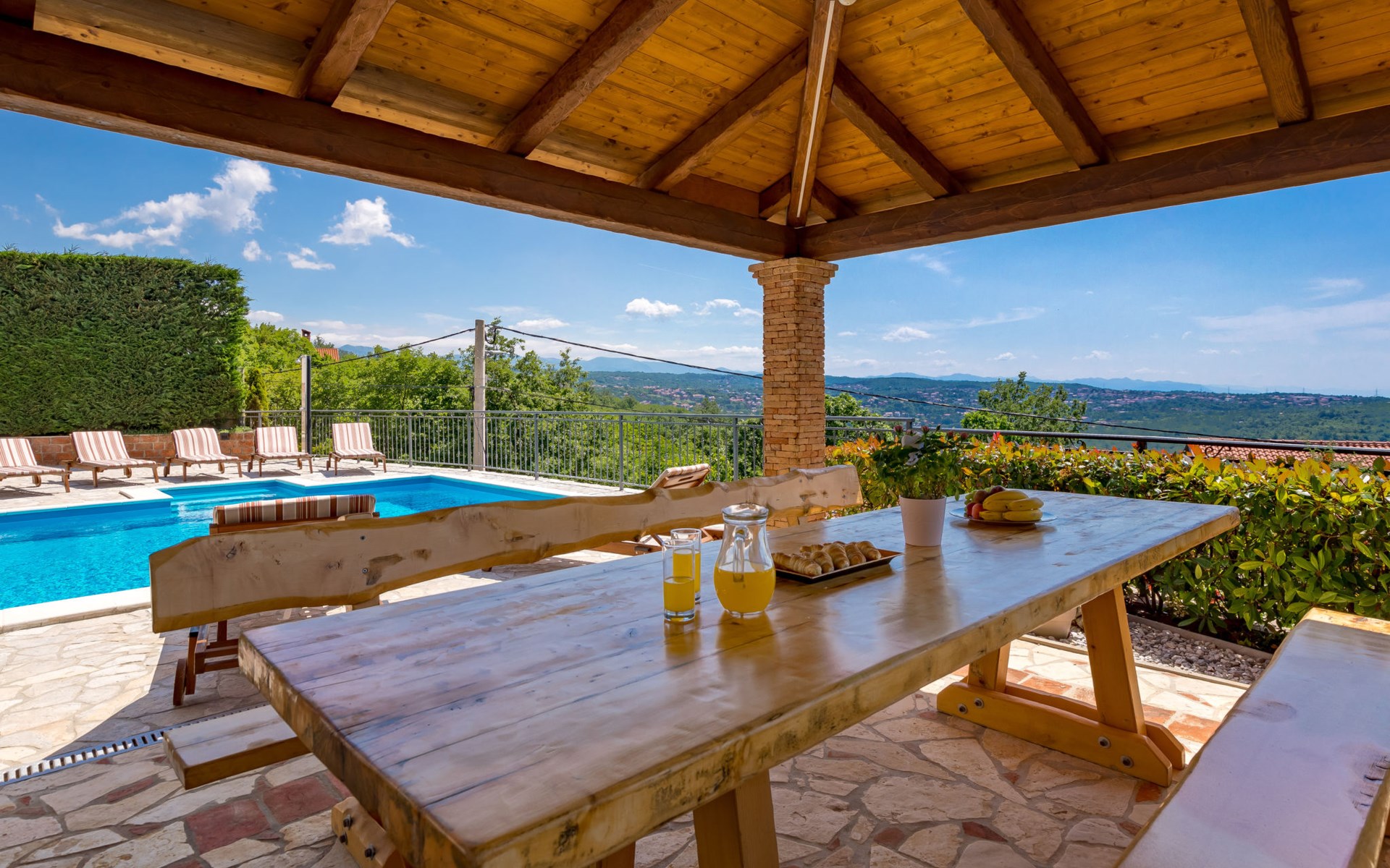 Einfamilienhaus "Villa Toni", auf 3 Stockwerken. 2 km vom Zentrum von Kastav, 7 km vom Zentrum von Opatija, 10 km vom Zentrum von Lovran, 7 km vom Meer. Zur Alleinbenutzung: Grundstück 2'000 m2 (eingezäunt) mit Bäumen, Schwimmbad beheizt (5 x 5 m, 29 m2, 150 cm tief, saisonale Verfügbarkeit: 20.Apr. - 12.Okt.) mit Innentreppe und Salzelektrolyse-Reinigungssystem. Aussendusche, Laube, Terrasse (100 m2), Gartenmöbel, Grill. Im Hause: Internetzugang, Billard, Waschmaschine. 20 m Fussweg bis zum Haus. Parkplatz (für 5 Autos) auf dem Grundstück, Einzelgarage. Einkaufsgeschäft 1 km, Bushaltestelle 600 m, Kieselstrand 7 km, Felsstrand 7 km. Jugendgruppen nur auf Anfrage. Schwimmbad beheizt (extra). Bitte teilen Sie uns mindestens 7 Tage vor Anreise mit, ob eine Poolheizung erforderlich ist.