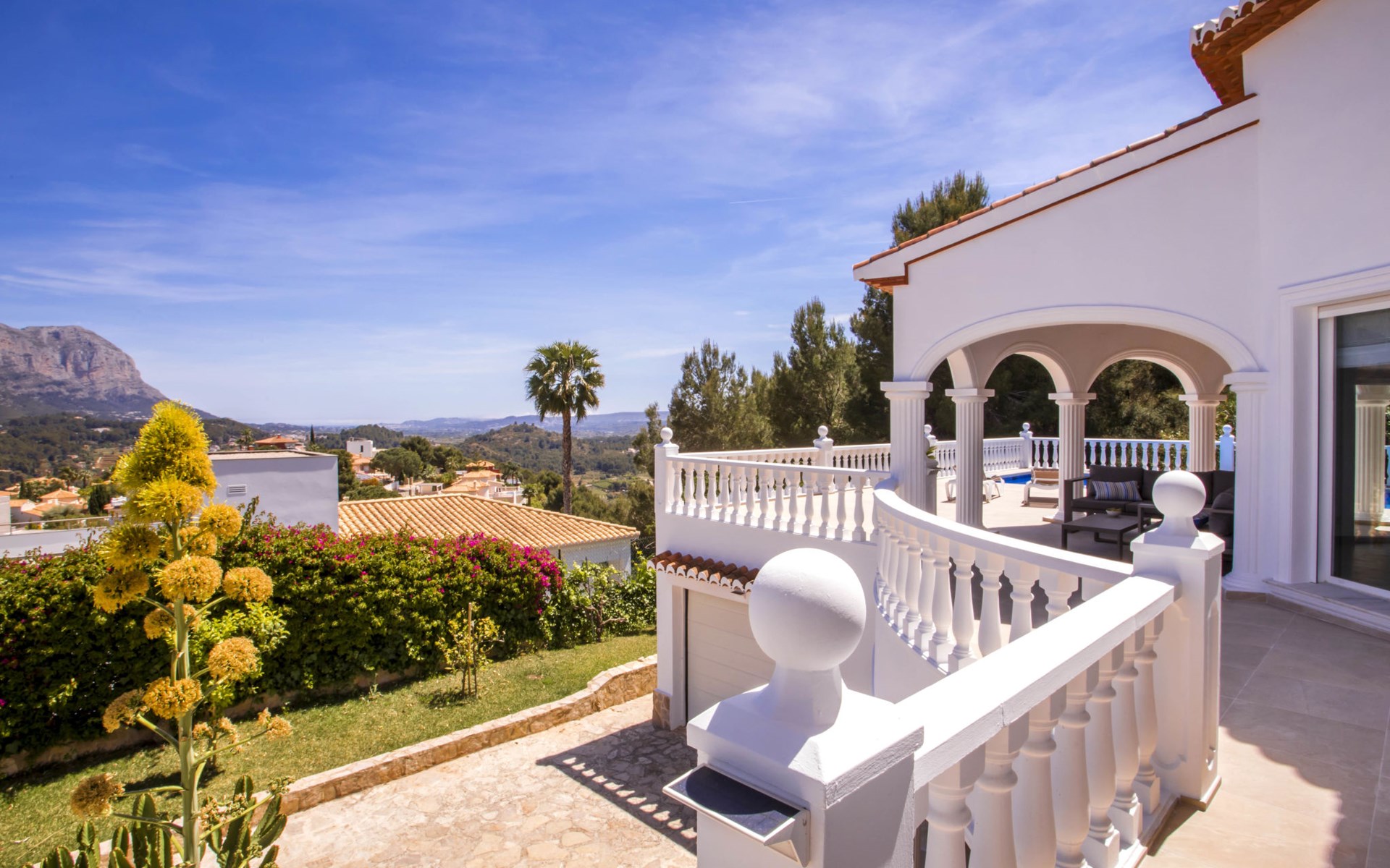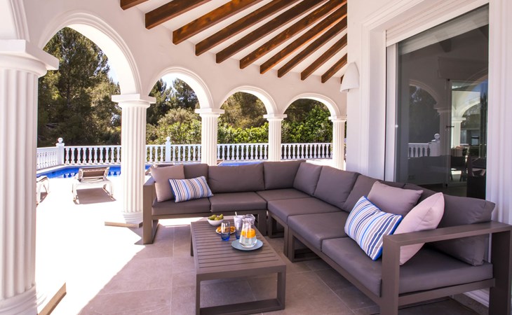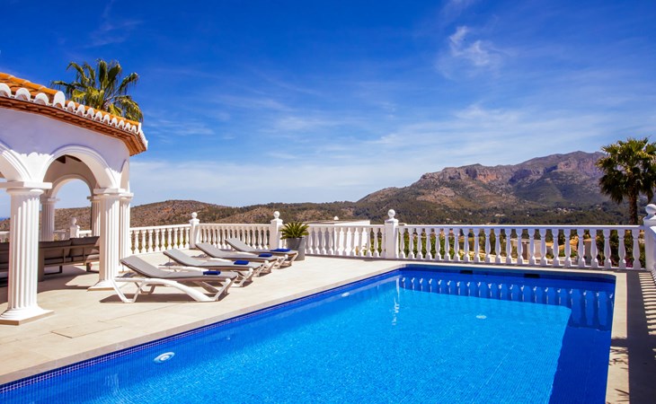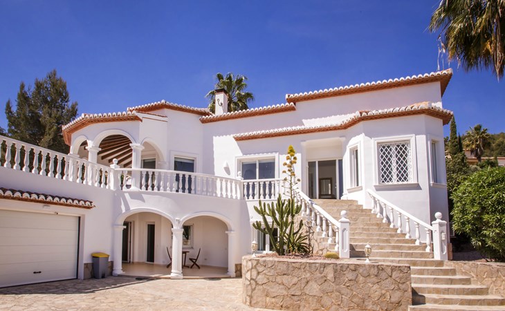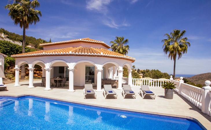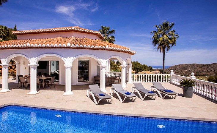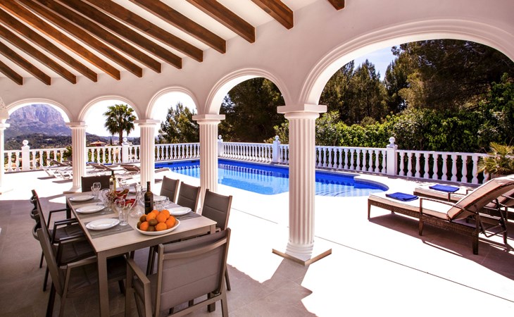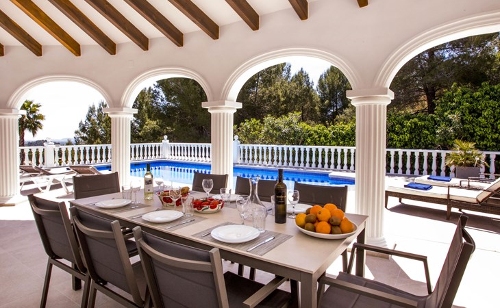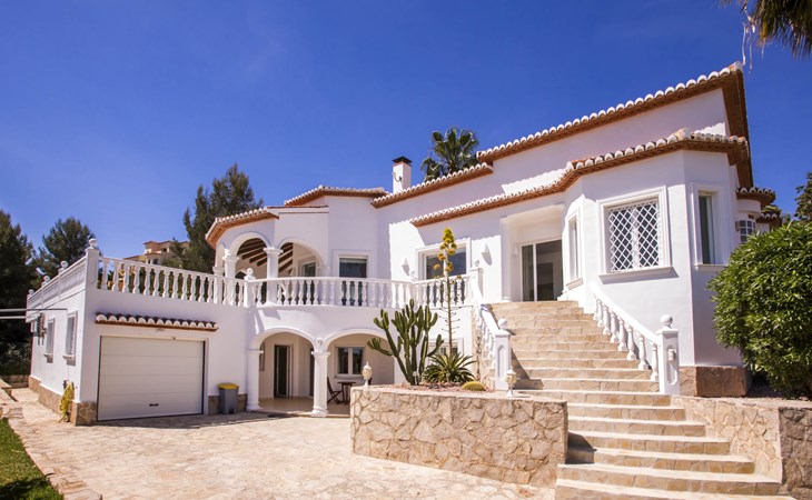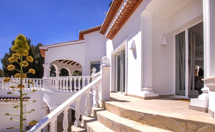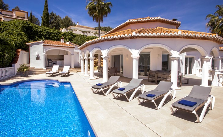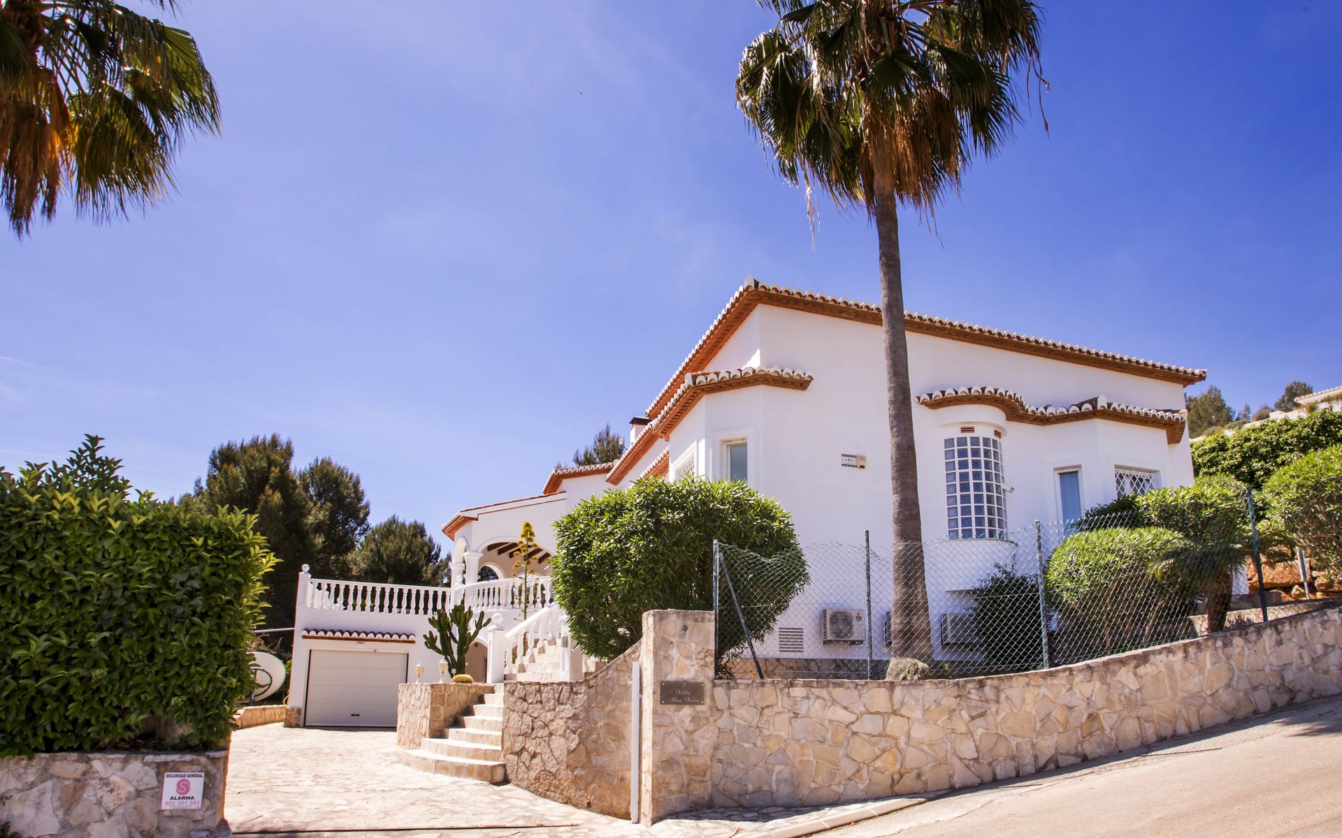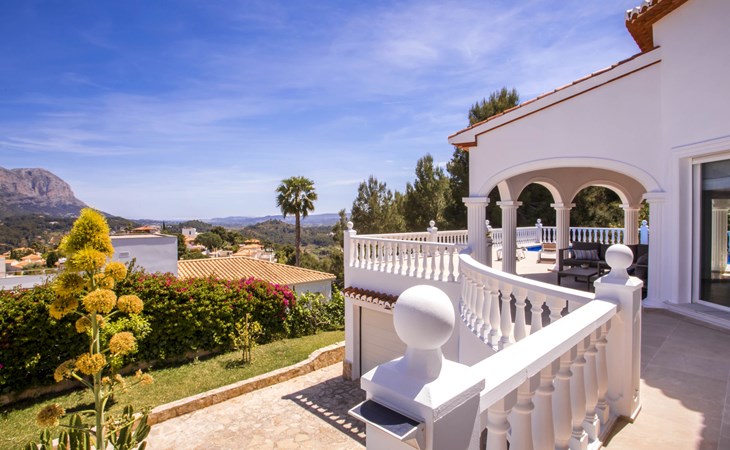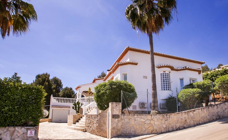La Sella 7 km von Dénia: Sehr grosse, sehr schöne, gemütliche Villa "Villa Alta Vista", umgeben von Bäumen. Ausserhalb des Ortes, 8 km vom Zentrum von Dénia, ruhige, sonnige Lage am Hang, im Villenviertel, verkehrsberuhigte Zone, 6 km vom Meer, 6 km vom Strand. Zur Alleinbenutzung: Schwimmbad eckig (4 x 10 m, 90 - 210 cm tief, saisonale Verfügbarkeit: 01.Jan. - 31.Dez.). Dusche/WC im Poolbereich, Poolhaus mit Kühlschrank, Dusche, WC und Kochherd, Sitzplatz, Laube, Pergola, Terrasse, Gartenmöbel, Grillhaus, Parkplatz (für 2 Autos) auf dem Grundstück. Restaurant 2 km, Bar 2 km, Café 2 km, Bushaltestelle 5.9 km, Bahnstation 10 km, Fähre 10.2 km. Sporthafen 10 km, Jacht-Hafen 10 km, Golfplatz (18 Loch) 5 km, Surfschule 10 km, Segelschule 10 km, Tennis 2 km. Nahe gelegene Sehenswürdigkeiten: La Sella Golf 5 km. Der Besitzer akzeptiert keine Jugendgruppen. Bitte beachten: Die Anlage wird nachts überwacht. Die Nachbarschaft ist sehr lärmempfindlich. Ruhe und gutes Benehmen wird erwartet.