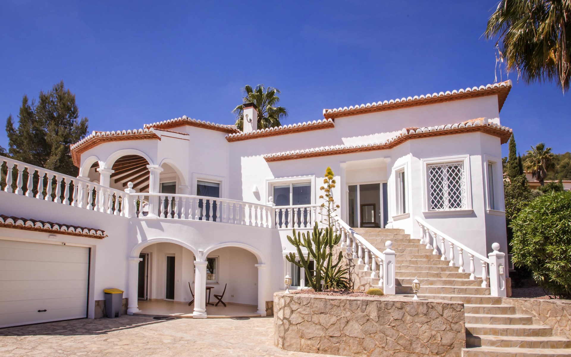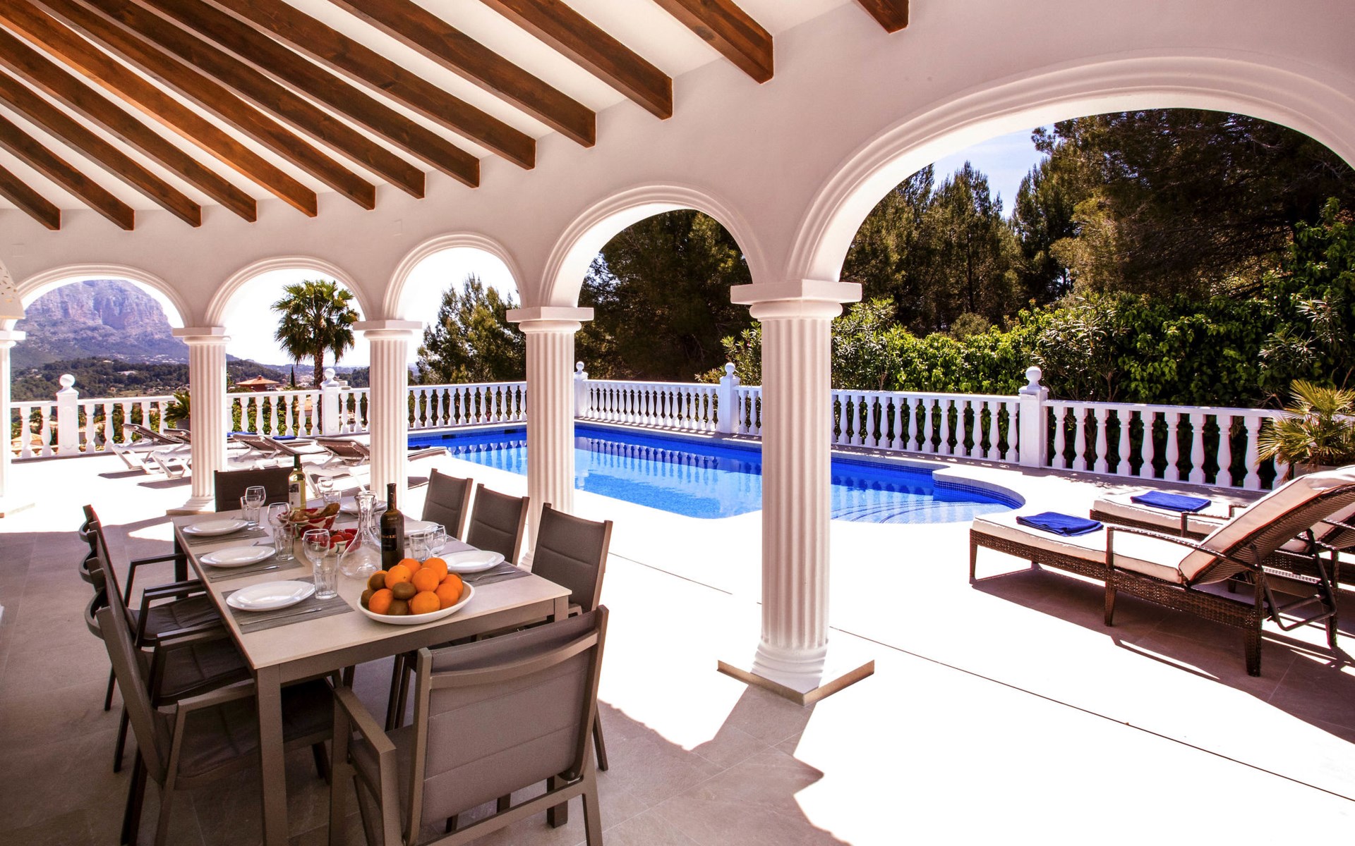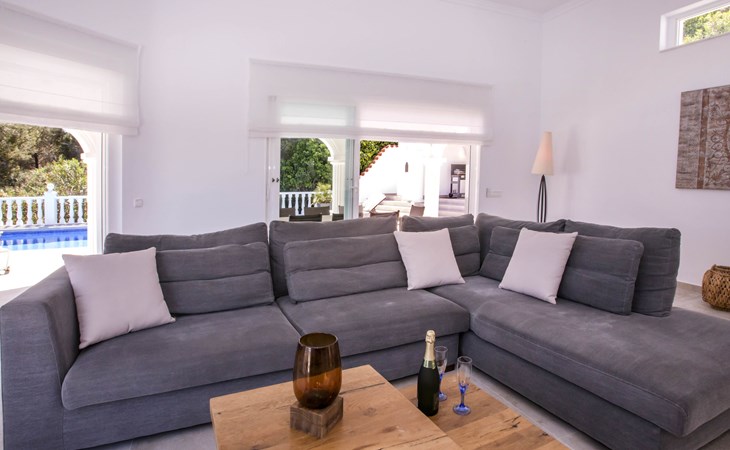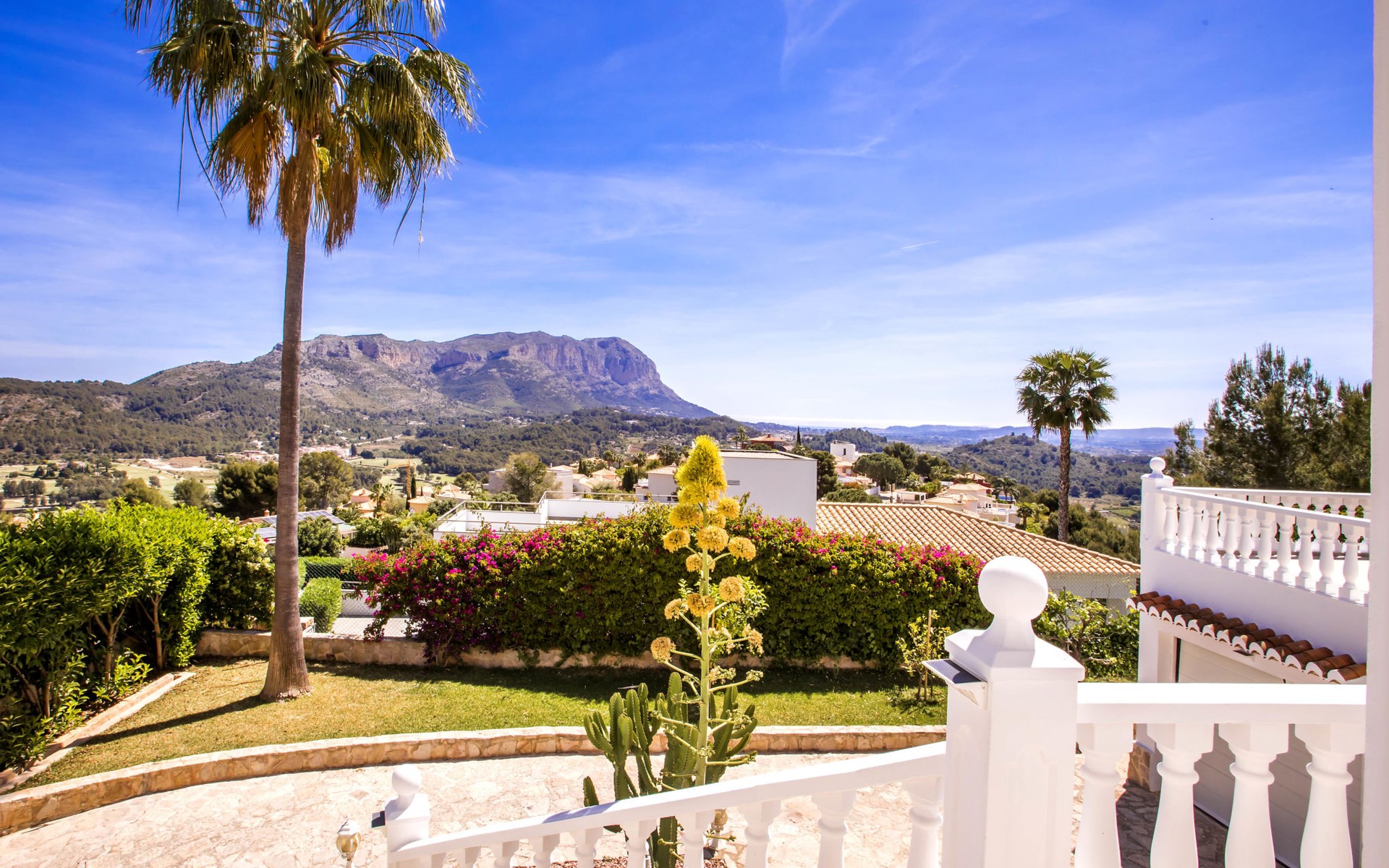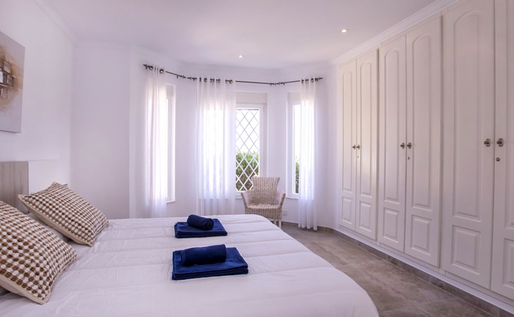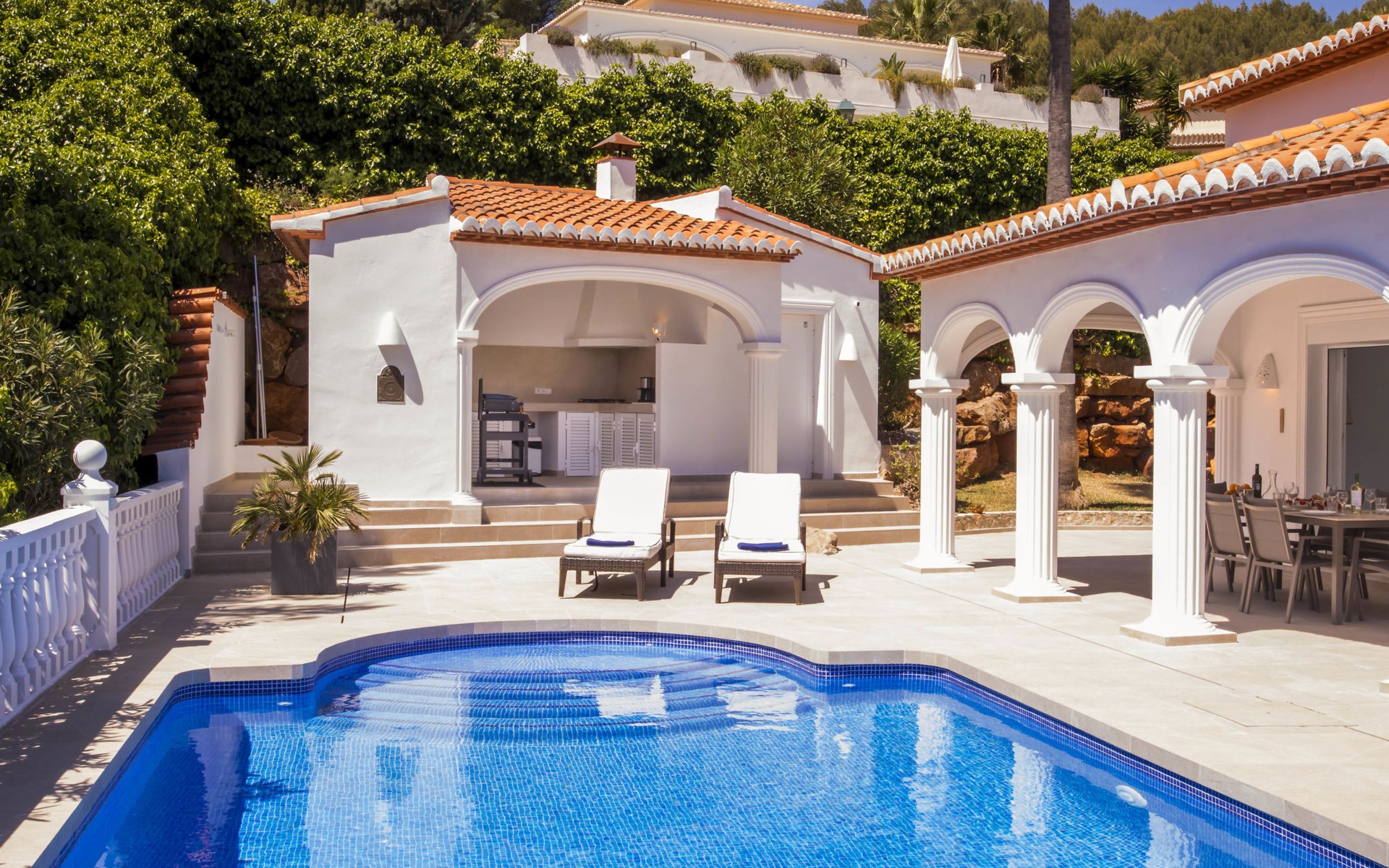 La Sella 7 km von Dénia: Sehr grosse, sehr schöne, gemütliche Villa "Villa Alta Vista", umgeben von Bäumen. Ausserhalb des Ortes, 8 km vom Zentrum von Dénia, ruhige, sonnige Lage am Hang, im Villenviertel, verkehrsberuhigte Zone, 6 km vom Meer, 6 km vom Strand. Zur Alleinbenutzung: Schwimmbad eckig (4 x 10 m, 90 - 210 cm tief, saisonale Verfügbarkeit: 01.Jan. - 31.Dez.). Dusche/WC im Poolbereich, Poolhaus mit Kühlschrank, Dusche, WC und Kochherd, Sitzplatz, Laube, Pergola, Terrasse, Gartenmöbel, Grillhaus, Parkplatz (für 2 Autos) auf dem Grundstück. Restaurant 2 km, Bar 2 km, Café 2 km, Bushaltestelle 5.9 km, Bahnstation 10 km, Fähre 10.2 km. Sporthafen 10 km, Jacht-Hafen 10 km, Golfplatz (18 Loch) 5 km, Surfschule 10 km, Segelschule 10 km, Tennis 2 km. Nahe gelegene Sehenswürdigkeiten: La Sella Golf 5 km. Der Besitzer akzeptiert keine Jugendgruppen. Bitte beachten: Die Anlage wird nachts überwacht. Die Nachbarschaft ist sehr lärmempfindlich. Ruhe und gutes Benehmen wird erwartet.