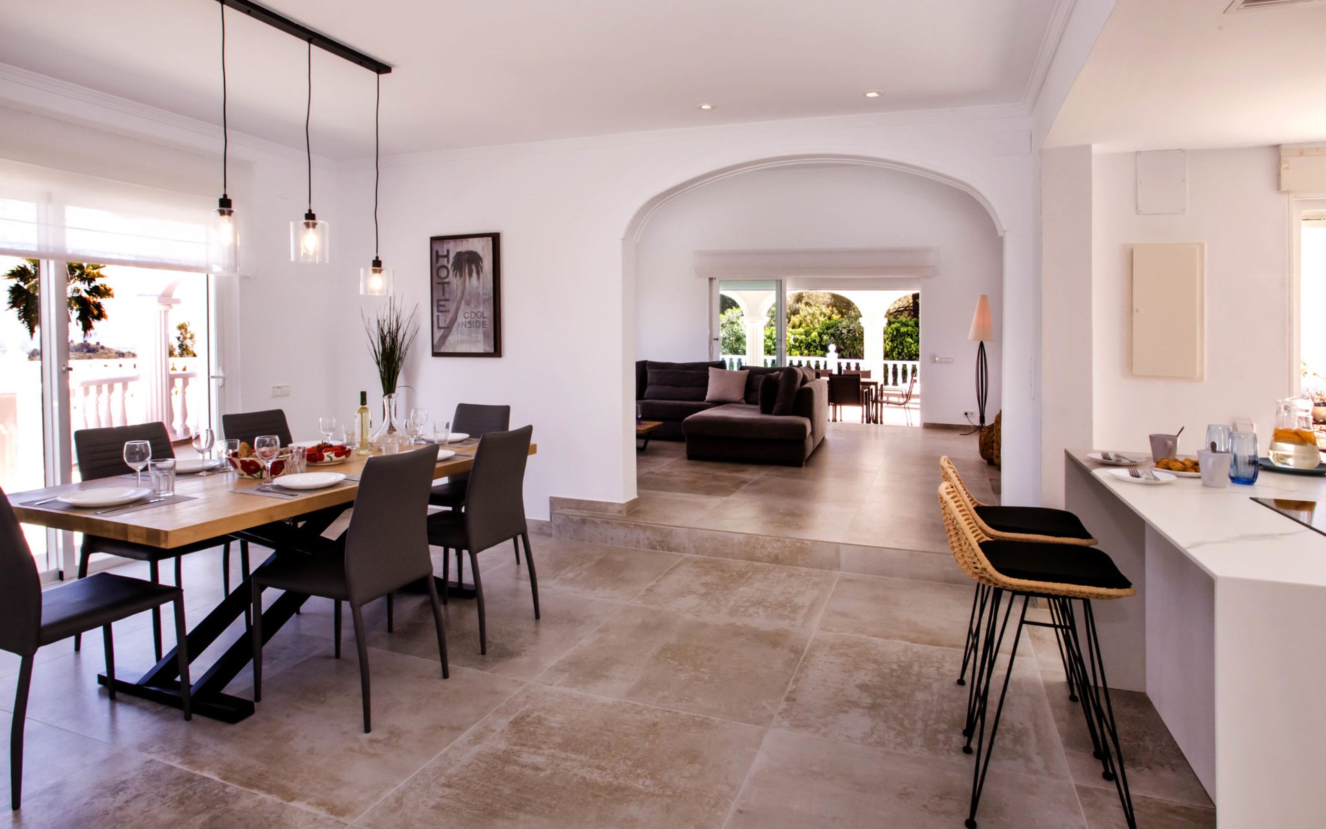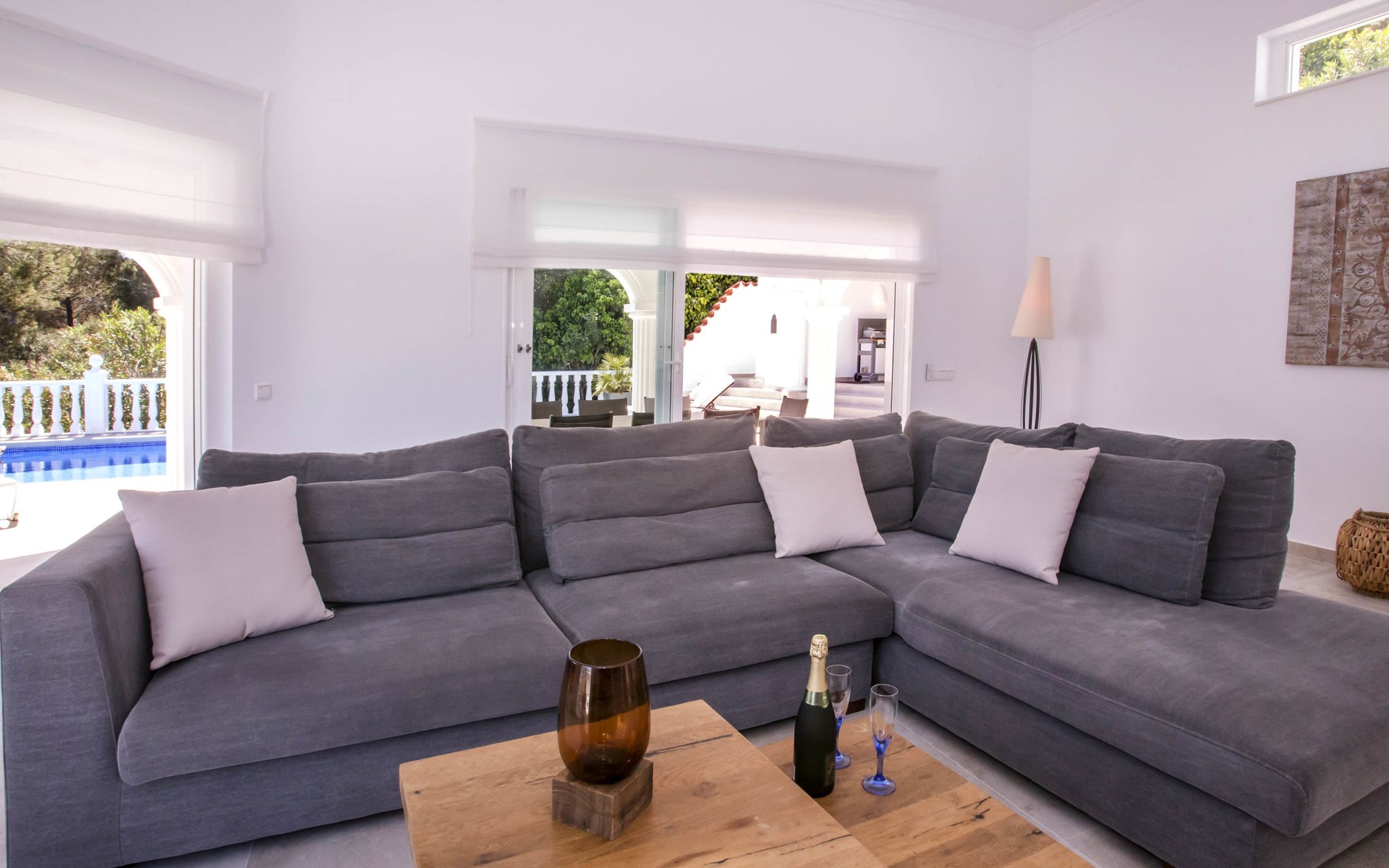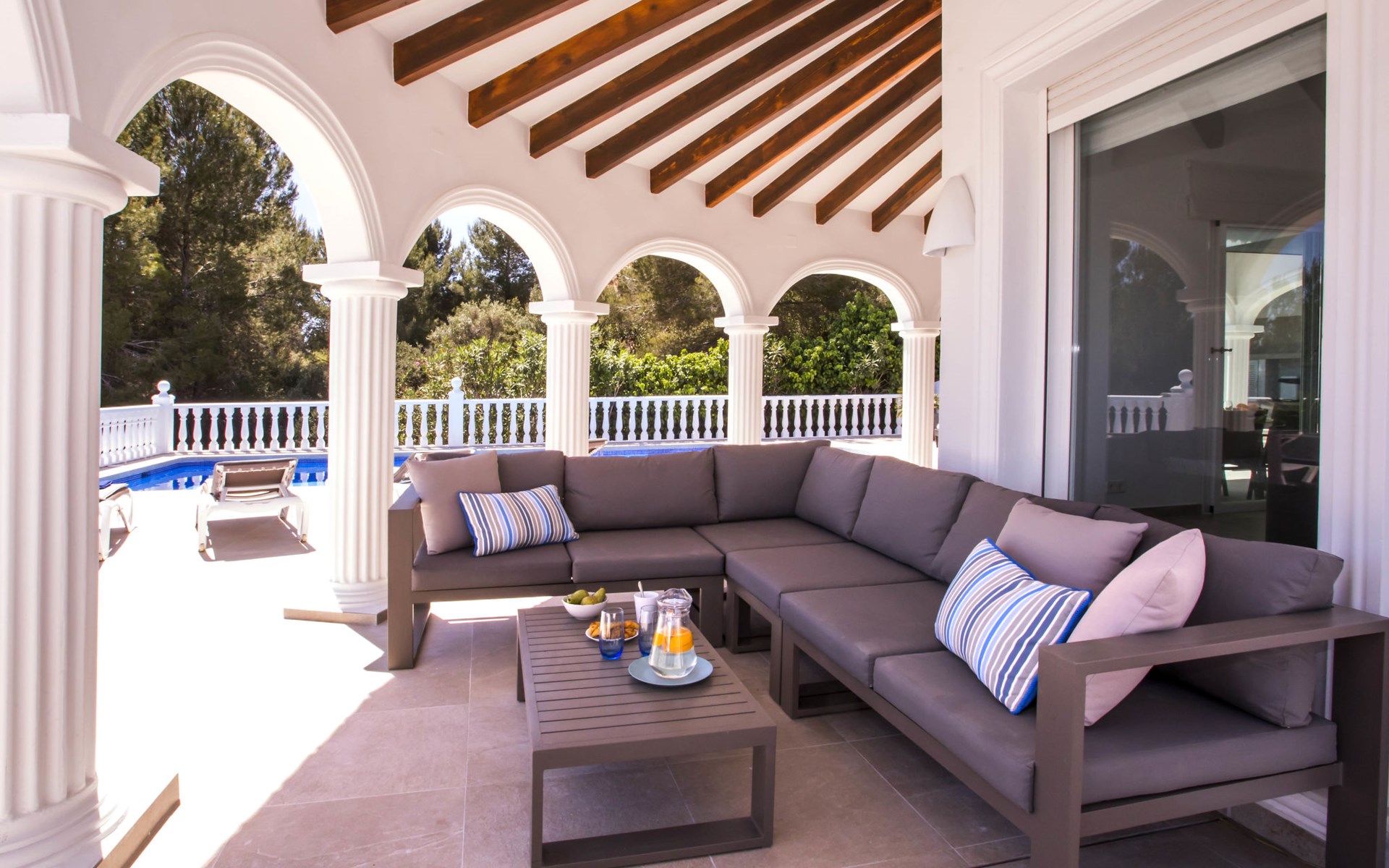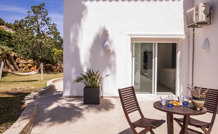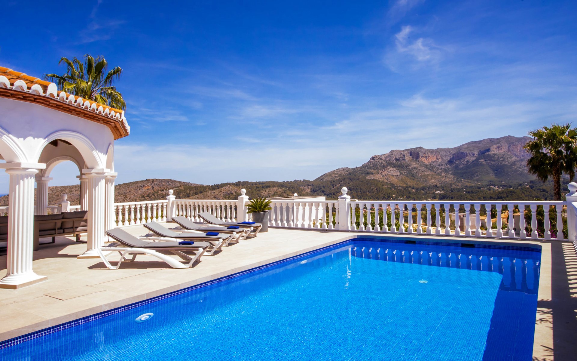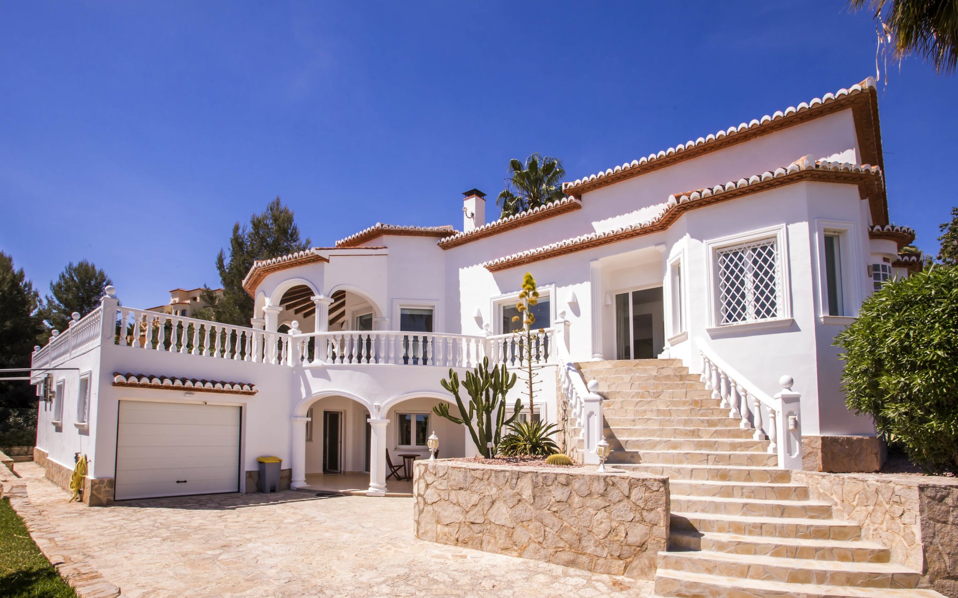 La Sella 7 km von Dénia: Sehr grosse, sehr schöne, gemütliche Villa "Villa Alta Vista", umgeben von Bäumen. Ausserhalb des Ortes, 8 km vom Zentrum von Dénia, ruhige, sonnige Lage am Hang, im Villenviertel, verkehrsberuhigte Zone, 6 km vom Meer, 6 km vom Strand. Zur Alleinbenutzung: Schwimmbad eckig (4 x 10 m, 90 - 210 cm tief, saisonale Verfügbarkeit: 01.Jan. - 31.Dez.). Dusche/WC im Poolbereich, Poolhaus mit Kühlschrank, Dusche, WC und Kochherd, Sitzplatz, Laube, Pergola, Terrasse, Gartenmöbel, Grillhaus, Parkplatz (für 2 Autos) auf dem Grundstück. Restaurant 2 km, Bar 2 km, Café 2 km, Bushaltestelle 5.9 km, Bahnstation 10 km, Fähre 10.2 km. Sporthafen 10 km, Jacht-Hafen 10 km, Golfplatz (18 Loch) 5 km, Surfschule 10 km, Segelschule 10 km, Tennis 2 km. Nahe gelegene Sehenswürdigkeiten: La Sella Golf 5 km. Der Besitzer akzeptiert keine Jugendgruppen. Bitte beachten: Die Anlage wird nachts überwacht. Die Nachbarschaft ist sehr lärmempfindlich. Ruhe und gutes Benehmen wird erwartet.