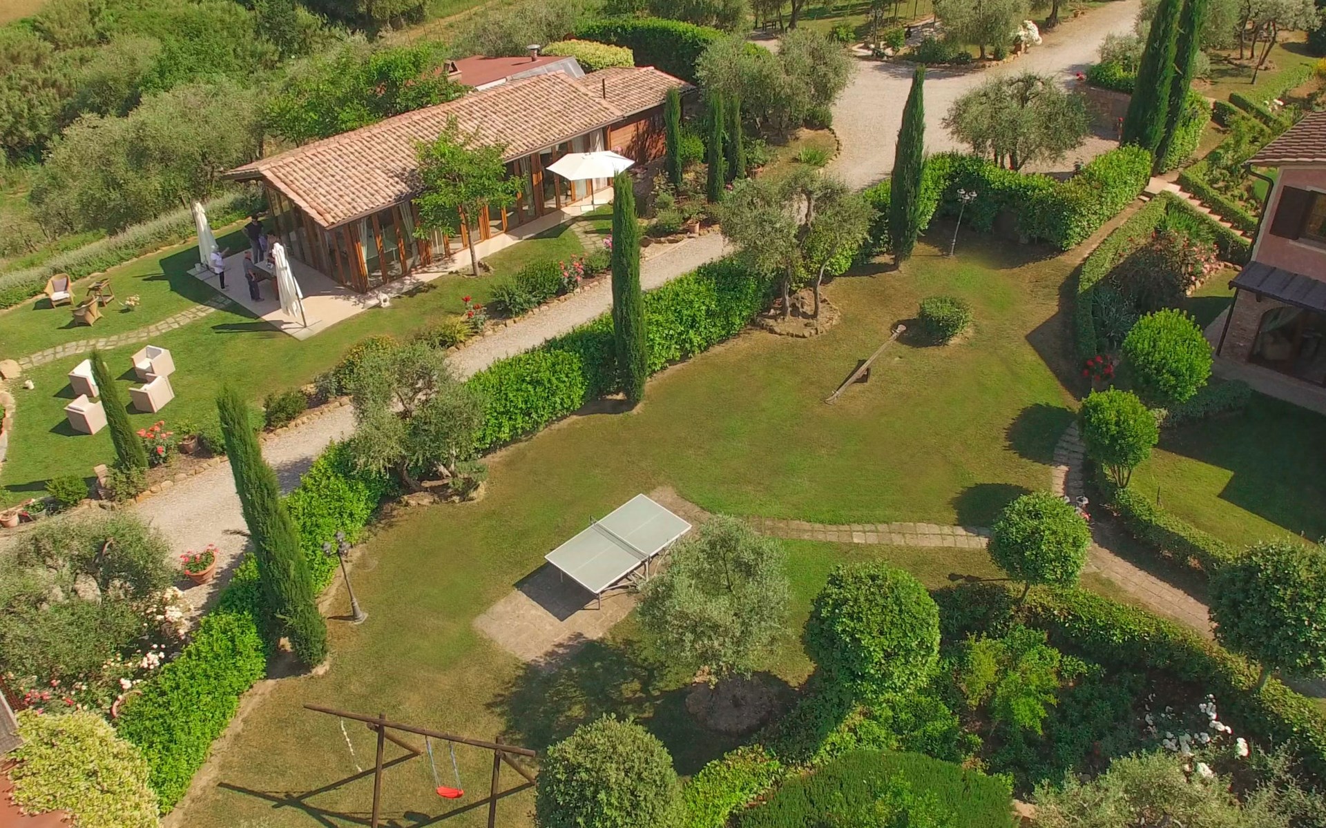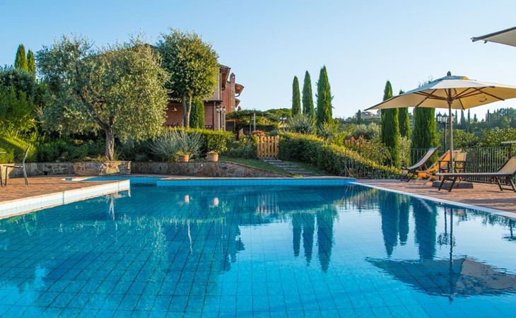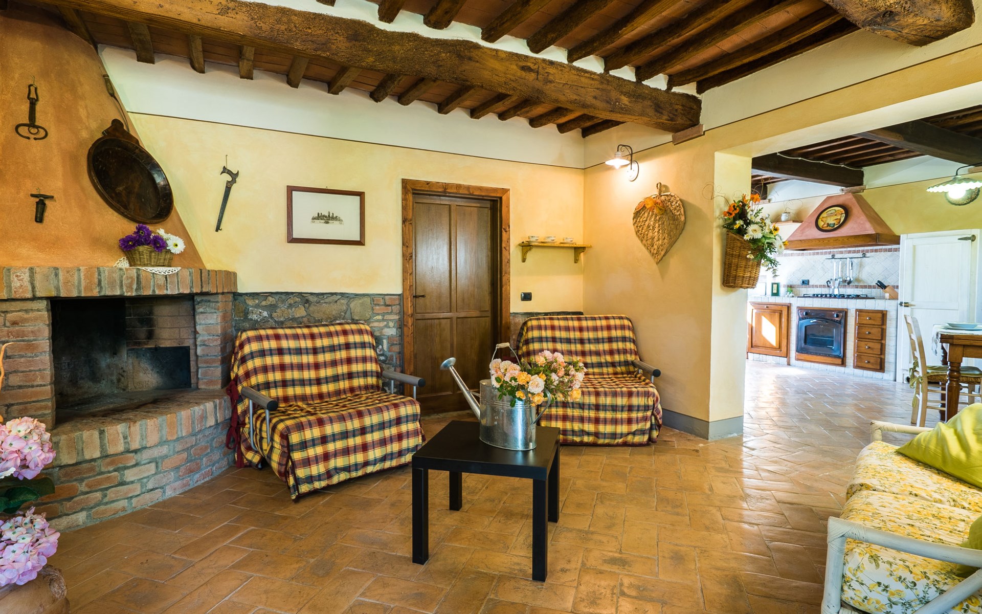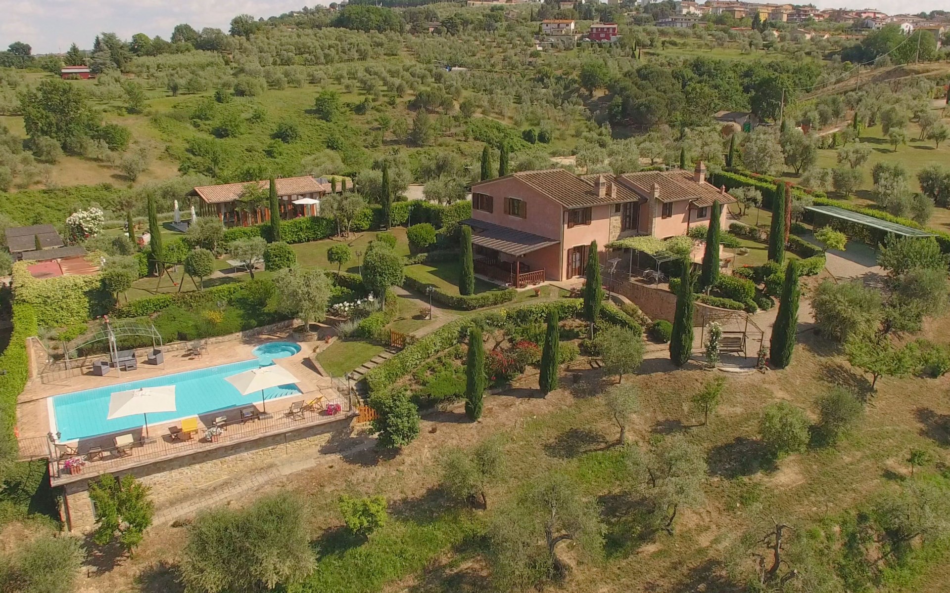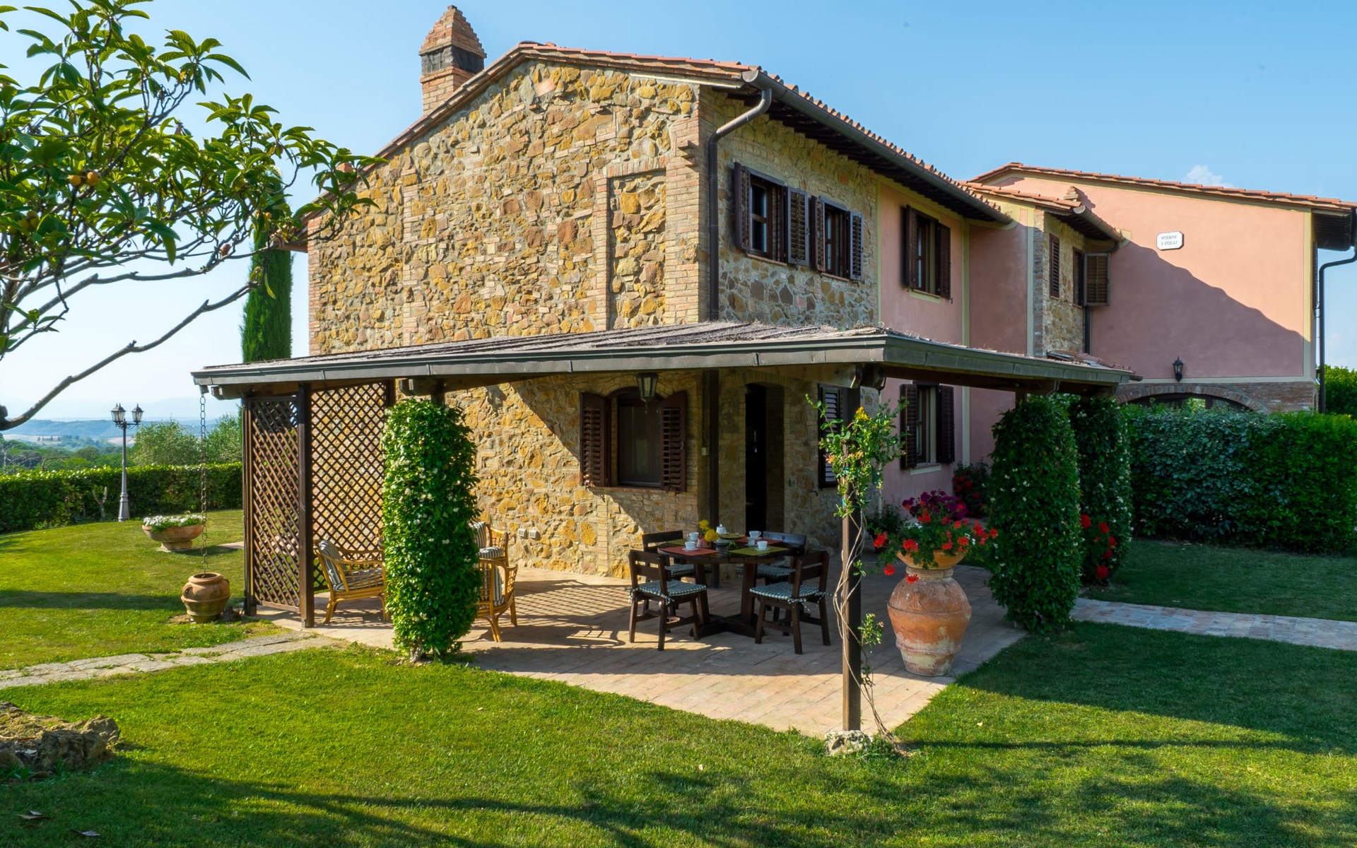 Das von uns angebotene Bauernhaus liegt im Herzen der Toskana. Die Olivenbäume, die Weinreben und der Obstgarten bilden eine wunderbare Kulisse für das sorgfältig restaurierte Bauernhaus, das nach den Merkmalen alter toskanischer Bauernhäuser mit originalen antiken Möbeln eingerichtet ist. Das Gebäude, das als einzelnes Gebäude vermietet wird, besteht aus drei Wohnungen, von denen zwei miteinander verbunden sind und eine freistehende Wohnung von etwa 60 Quadratmetern in einem kleinen Nebengebäude liegt. Vor dem Hauptgebäude befindet sich ein bezaubernder „Partyraum“, ganz in Holz gehalten und von großen Fenstern umgeben, ausgestattet mit Tisch und Stühlen, Sesseln, Holzofen, Grill und Kochplatten. Der Partyraum kann auf Anfrage gegen eine zusätzliche Gebühr gebucht werden, die direkt vor Ort zu entrichten ist. Freistehender Landwirtschaftlicher Betrieb "La Veduta". Mietobjekt bestehend aus Haupt- und Nebengebäude, 1.4 km vom Zentrum von Montaione, 21 km vom Zentrum von San Gimignano, 59 km vom Zentrum von Firenze, alleinstehende, ruhige, sonnige Lage, im Grünen. Zur Alleinbenutzung: Garten 20'000 m2 (nicht eingezäunt), Schwimmbad (6 x 12 m, 120 - 160 cm tief, saisonale Verfügbarkeit: 01.Mai. - 30.Sep.). Aussendusche, Sprudelbad, Tischtennis, Gartenmöbel, Grill, Poolpflege durch den Besitzer/Gärtner. Im Hause: Zentralheizung, Heizung vor Ort zu zahlen, Heizung nur verfügbar von 01.Nov. - 04.Apr.. Parkplatz (für 4 Autos) auf dem Grundstück. Einkaufsgeschäft 1.5 km, Supermarkt 1.5 km, Restaurant 1.5 km, Bushaltestelle 2 km, Sandstrand "Cecina" 67 km, Thermalbad "Casciana Terme" 38 km. Golfplatz (18 Loch) 16 km. Nahe gelegene Sehenswürdigkeiten: Certaldo 17 km, San Miniato 23 km, Volterra 29 km, Lajatico, Colle di Val d'Elsa 35 km, San Casciano in Val di Pesa 40 km, Siena 60 km. Bitte beachten: geeignet für Familien.