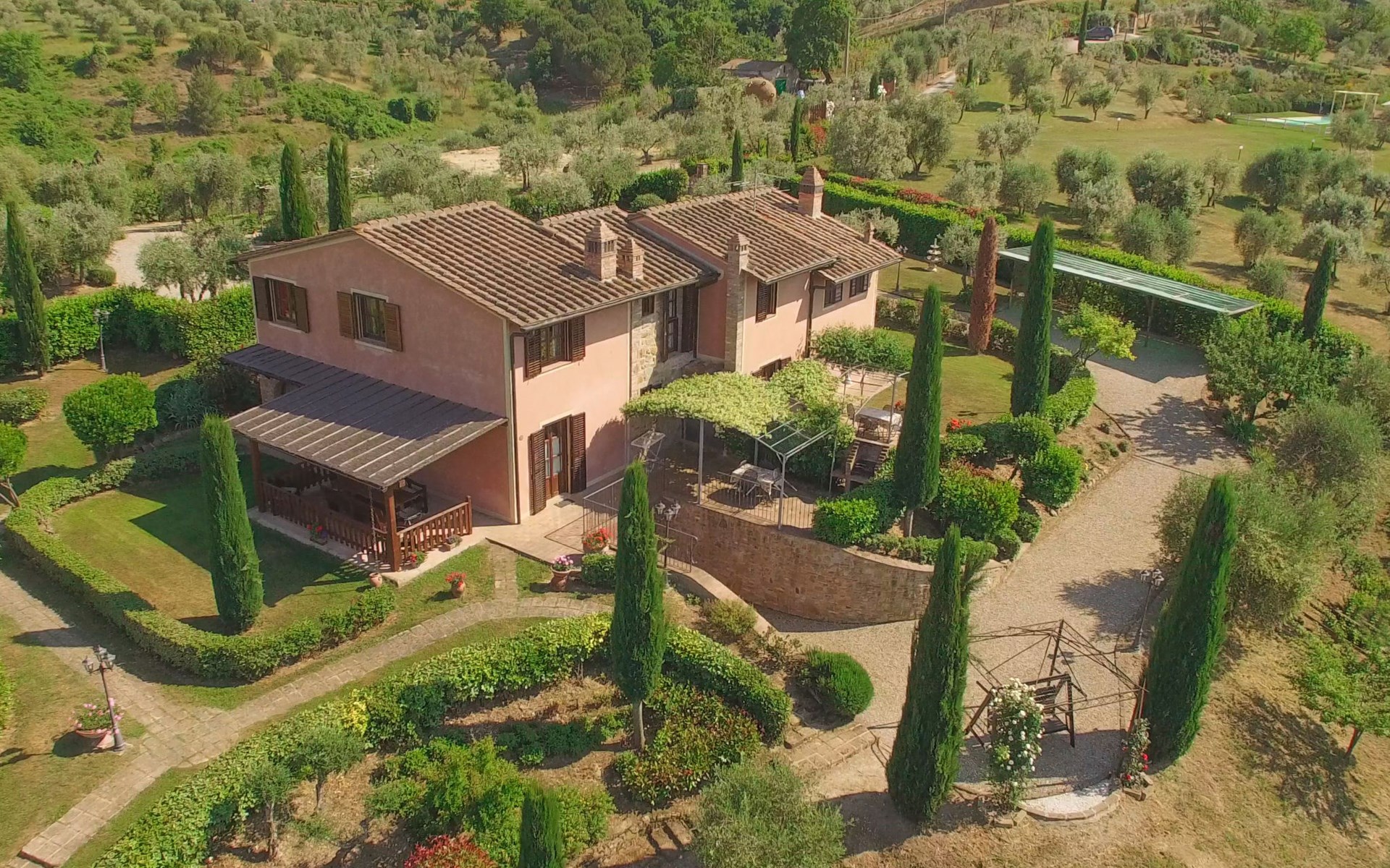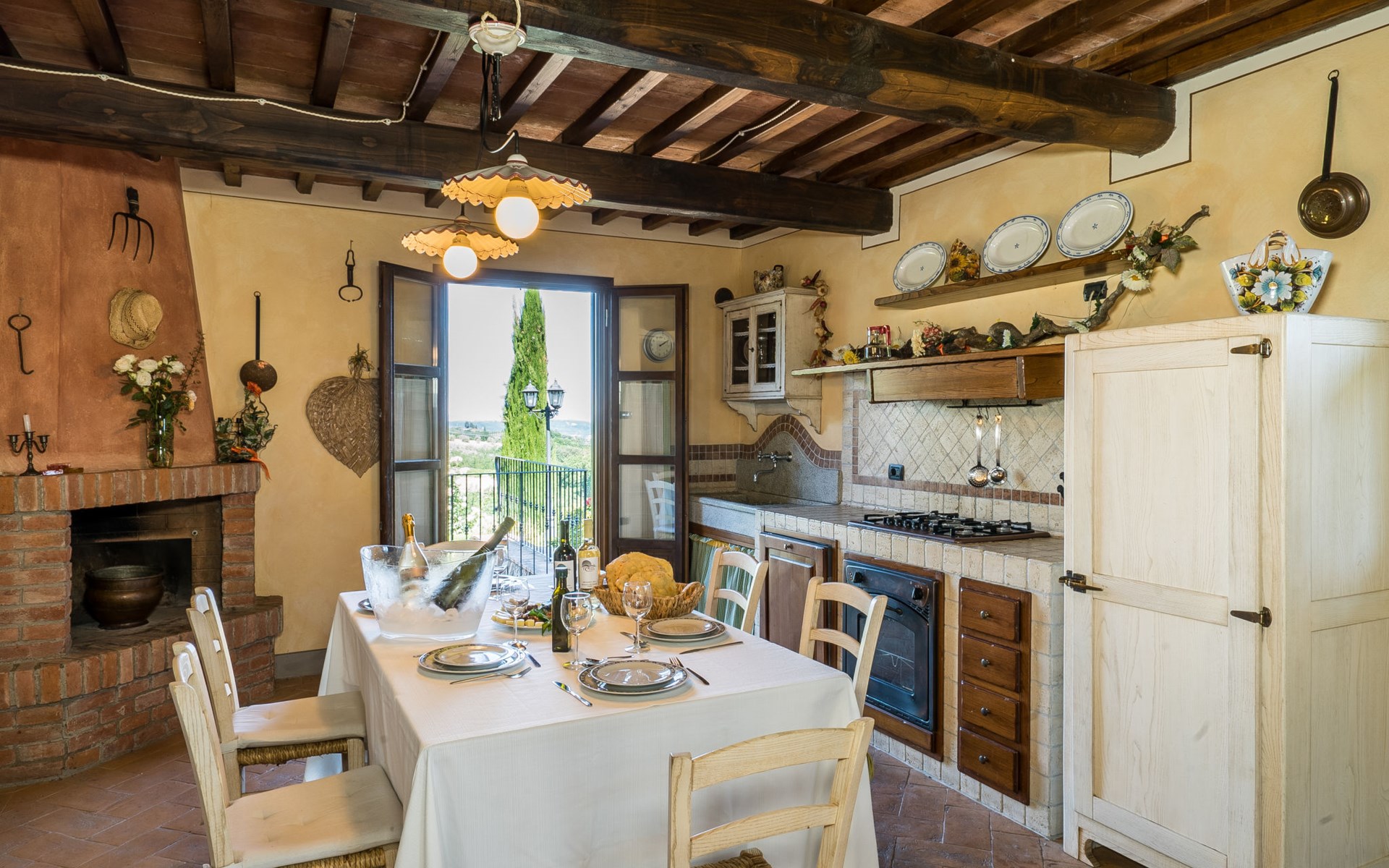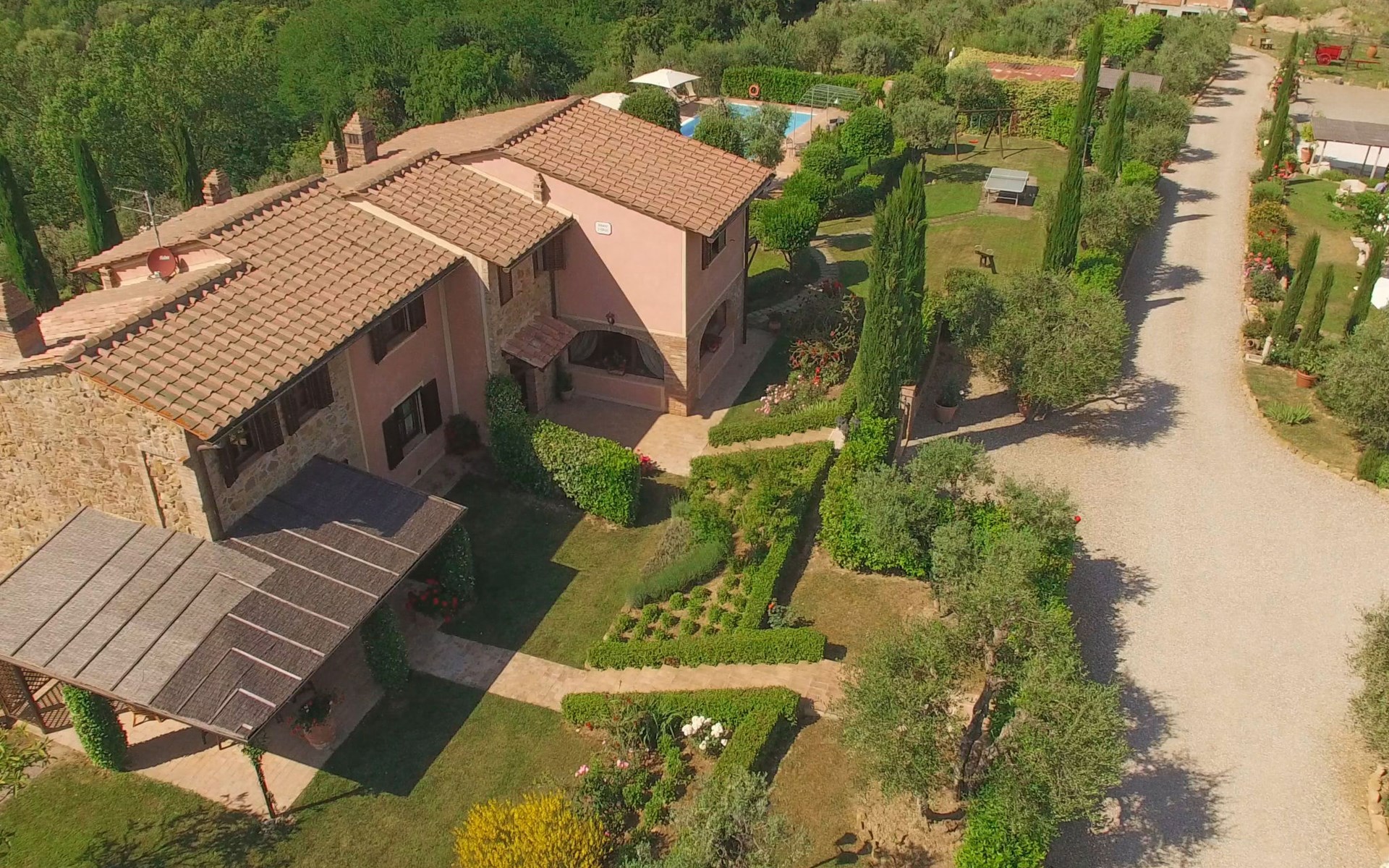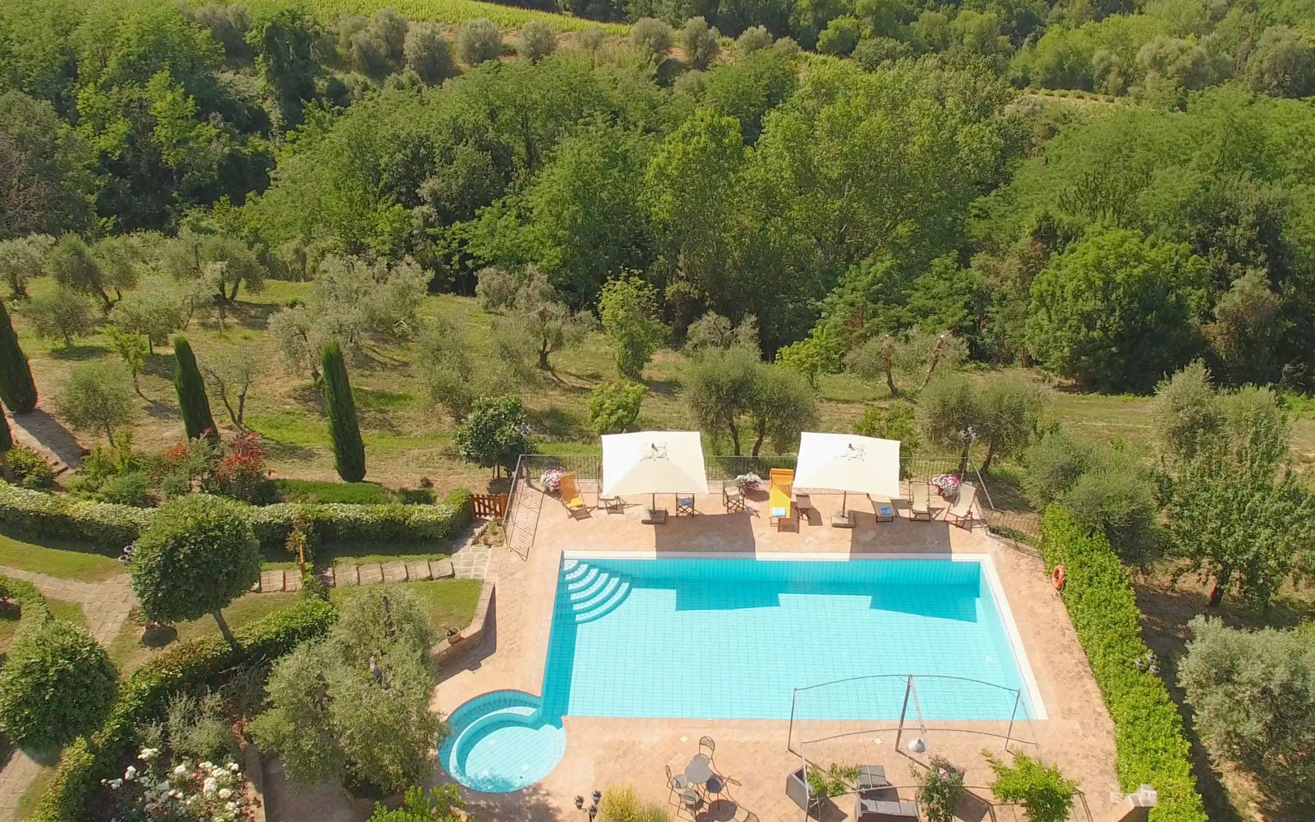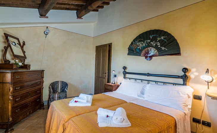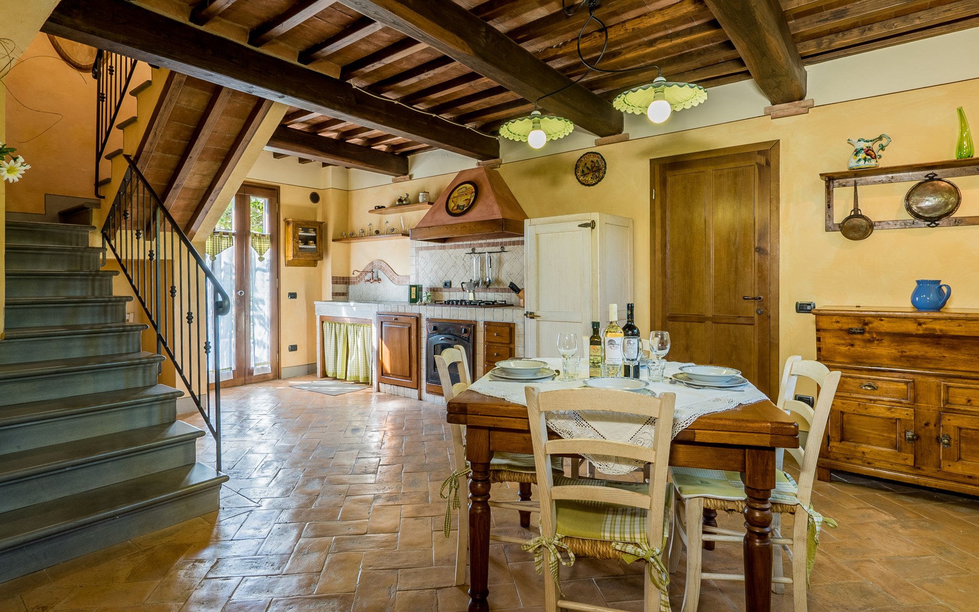 Das von uns angebotene Bauernhaus liegt im Herzen der Toskana. Die Olivenbäume, die Weinreben und der Obstgarten bilden eine wunderbare Kulisse für das sorgfältig restaurierte Bauernhaus, das nach den Merkmalen alter toskanischer Bauernhäuser mit originalen antiken Möbeln eingerichtet ist. Das Gebäude, das als einzelnes Gebäude vermietet wird, besteht aus drei Wohnungen, von denen zwei miteinander verbunden sind und eine freistehende Wohnung von etwa 60 Quadratmetern in einem kleinen Nebengebäude liegt. Vor dem Hauptgebäude befindet sich ein bezaubernder „Partyraum“, ganz in Holz gehalten und von großen Fenstern umgeben, ausgestattet mit Tisch und Stühlen, Sesseln, Holzofen, Grill und Kochplatten. Der Partyraum kann auf Anfrage gegen eine zusätzliche Gebühr gebucht werden, die direkt vor Ort zu entrichten ist. Freistehender Landwirtschaftlicher Betrieb "La Veduta". Mietobjekt bestehend aus Haupt- und Nebengebäude, 1.4 km vom Zentrum von Montaione, 21 km vom Zentrum von San Gimignano, 59 km vom Zentrum von Firenze, alleinstehende, ruhige, sonnige Lage, im Grünen. Zur Alleinbenutzung: Garten 20'000 m2 (nicht eingezäunt), Schwimmbad (6 x 12 m, 120 - 160 cm tief, saisonale Verfügbarkeit: 01.Mai. - 30.Sep.). Aussendusche, Sprudelbad, Tischtennis, Gartenmöbel, Grill, Poolpflege durch den Besitzer/Gärtner. Im Hause: Zentralheizung, Heizung vor Ort zu zahlen, Heizung nur verfügbar von 01.Nov. - 04.Apr.. Parkplatz (für 4 Autos) auf dem Grundstück. Einkaufsgeschäft 1.5 km, Supermarkt 1.5 km, Restaurant 1.5 km, Bushaltestelle 2 km, Sandstrand "Cecina" 67 km, Thermalbad "Casciana Terme" 38 km. Golfplatz (18 Loch) 16 km. Nahe gelegene Sehenswürdigkeiten: Certaldo 17 km, San Miniato 23 km, Volterra 29 km, Lajatico, Colle di Val d'Elsa 35 km, San Casciano in Val di Pesa 40 km, Siena 60 km. Bitte beachten: geeignet für Familien.
