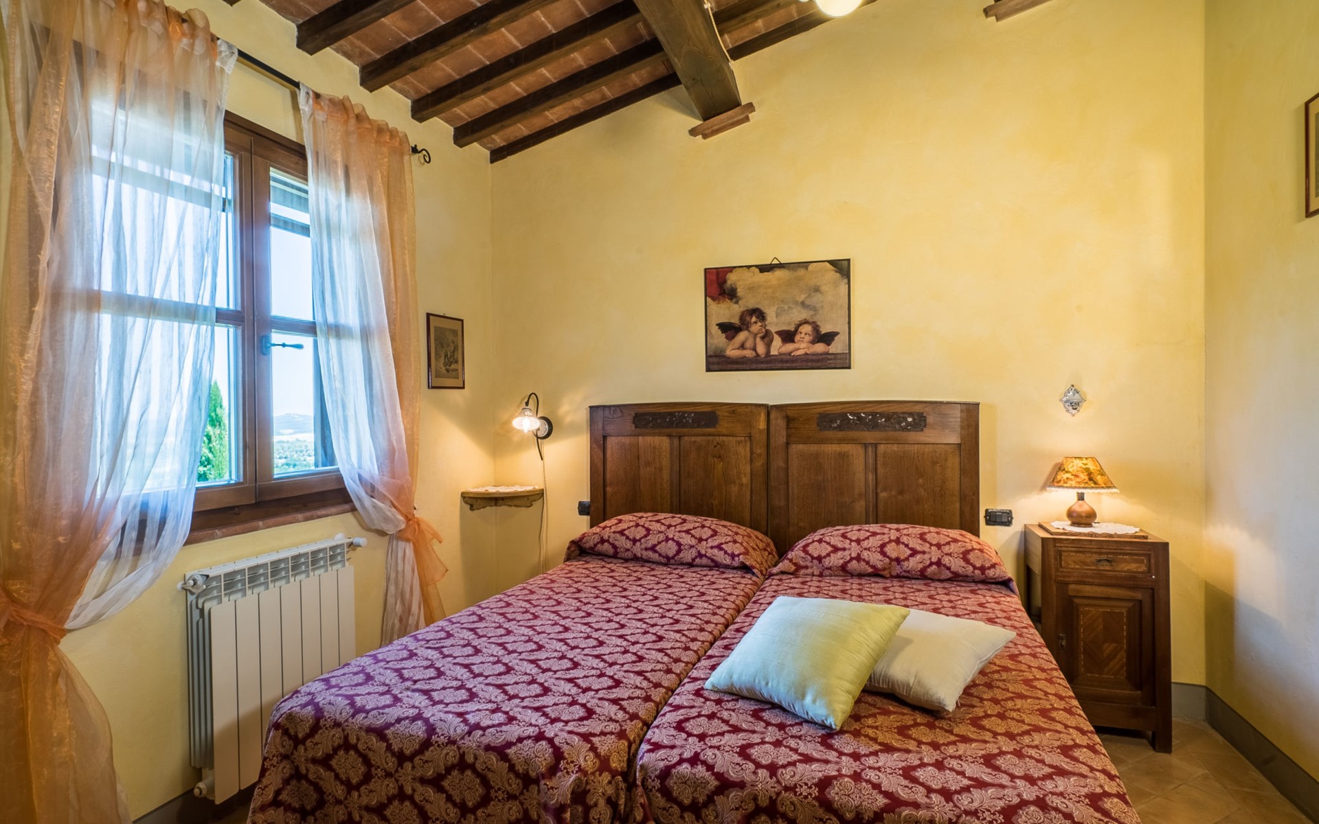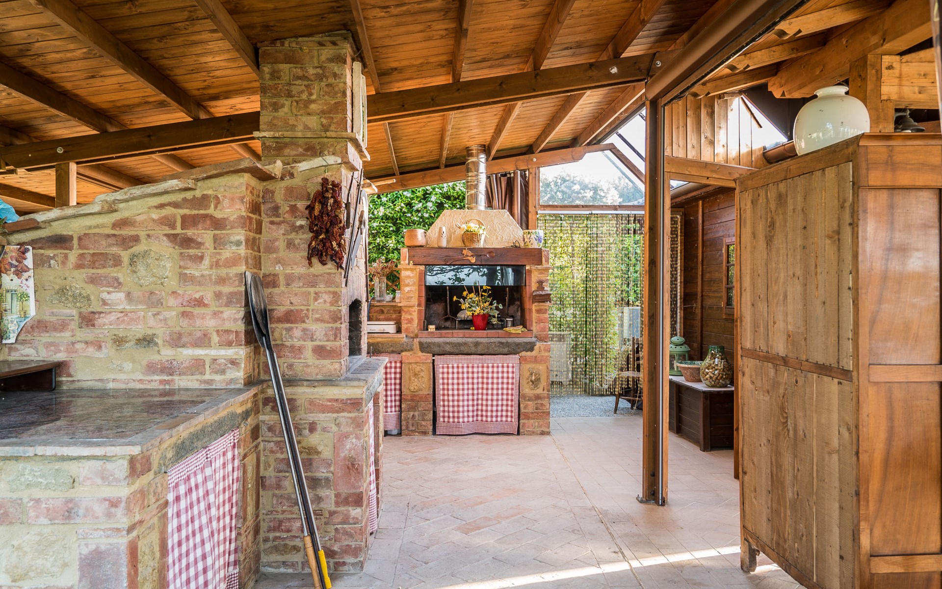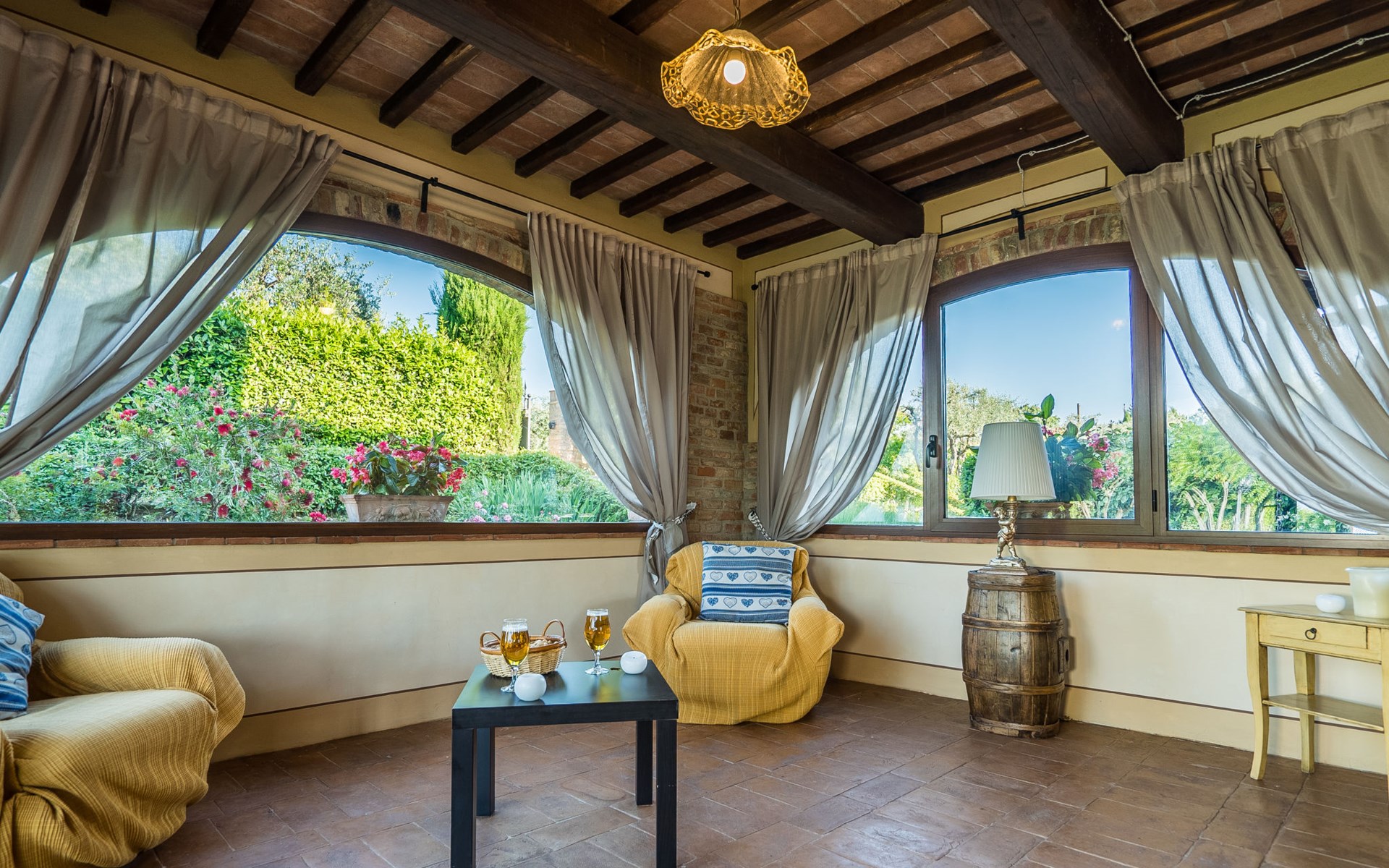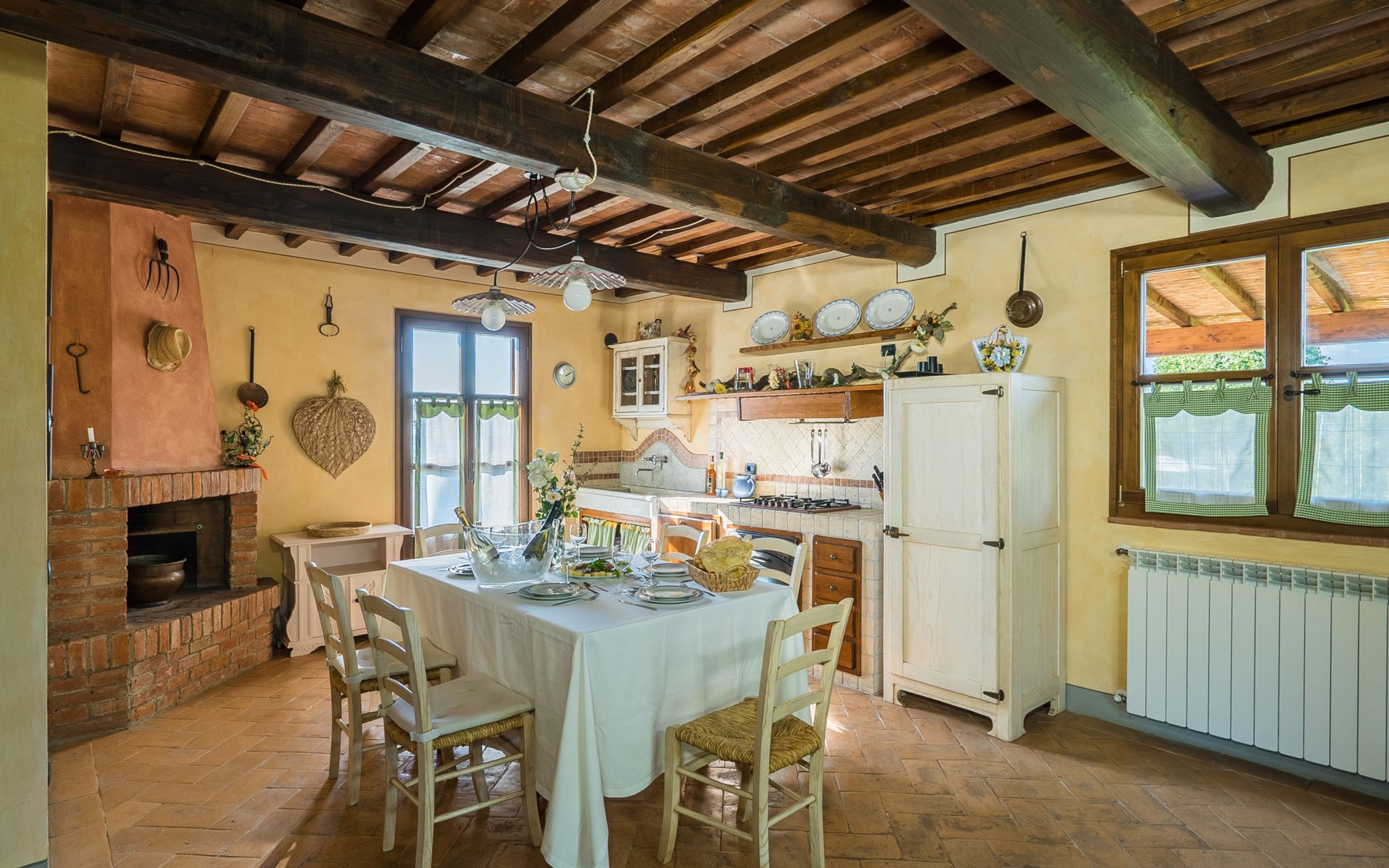 Das von uns angebotene Bauernhaus liegt im Herzen der Toskana. Die Olivenbäume, die Weinreben und der Obstgarten bilden eine wunderbare Kulisse für das sorgfältig restaurierte Bauernhaus, das nach den Merkmalen alter toskanischer Bauernhäuser mit originalen antiken Möbeln eingerichtet ist. Das Gebäude, das als einzelnes Gebäude vermietet wird, besteht aus drei Wohnungen, von denen zwei miteinander verbunden sind und eine freistehende Wohnung von etwa 60 Quadratmetern in einem kleinen Nebengebäude liegt. Vor dem Hauptgebäude befindet sich ein bezaubernder „Partyraum“, ganz in Holz gehalten und von großen Fenstern umgeben, ausgestattet mit Tisch und Stühlen, Sesseln, Holzofen, Grill und Kochplatten. Der Partyraum kann auf Anfrage gegen eine zusätzliche Gebühr gebucht werden, die direkt vor Ort zu entrichten ist. Freistehender Landwirtschaftlicher Betrieb "La Veduta". Mietobjekt bestehend aus Haupt- und Nebengebäude, 1.4 km vom Zentrum von Montaione, 21 km vom Zentrum von San Gimignano, 59 km vom Zentrum von Firenze, alleinstehende, ruhige, sonnige Lage, im Grünen. Zur Alleinbenutzung: Garten 20'000 m2 (nicht eingezäunt), Schwimmbad (6 x 12 m, 120 - 160 cm tief, saisonale Verfügbarkeit: 01.Mai. - 30.Sep.). Aussendusche, Sprudelbad, Tischtennis, Gartenmöbel, Grill, Poolpflege durch den Besitzer/Gärtner. Im Hause: Zentralheizung, Heizung vor Ort zu zahlen, Heizung nur verfügbar von 01.Nov. - 04.Apr.. Parkplatz (für 4 Autos) auf dem Grundstück. Einkaufsgeschäft 1.5 km, Supermarkt 1.5 km, Restaurant 1.5 km, Bushaltestelle 2 km, Sandstrand "Cecina" 67 km, Thermalbad "Casciana Terme" 38 km. Golfplatz (18 Loch) 16 km. Nahe gelegene Sehenswürdigkeiten: Certaldo 17 km, San Miniato 23 km, Volterra 29 km, Lajatico, Colle di Val d'Elsa 35 km, San Casciano in Val di Pesa 40 km, Siena 60 km. Bitte beachten: geeignet für Familien.