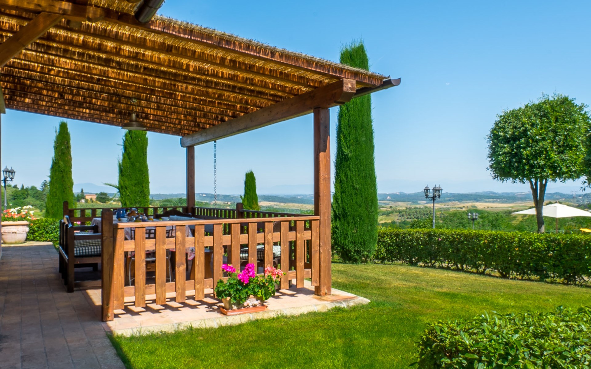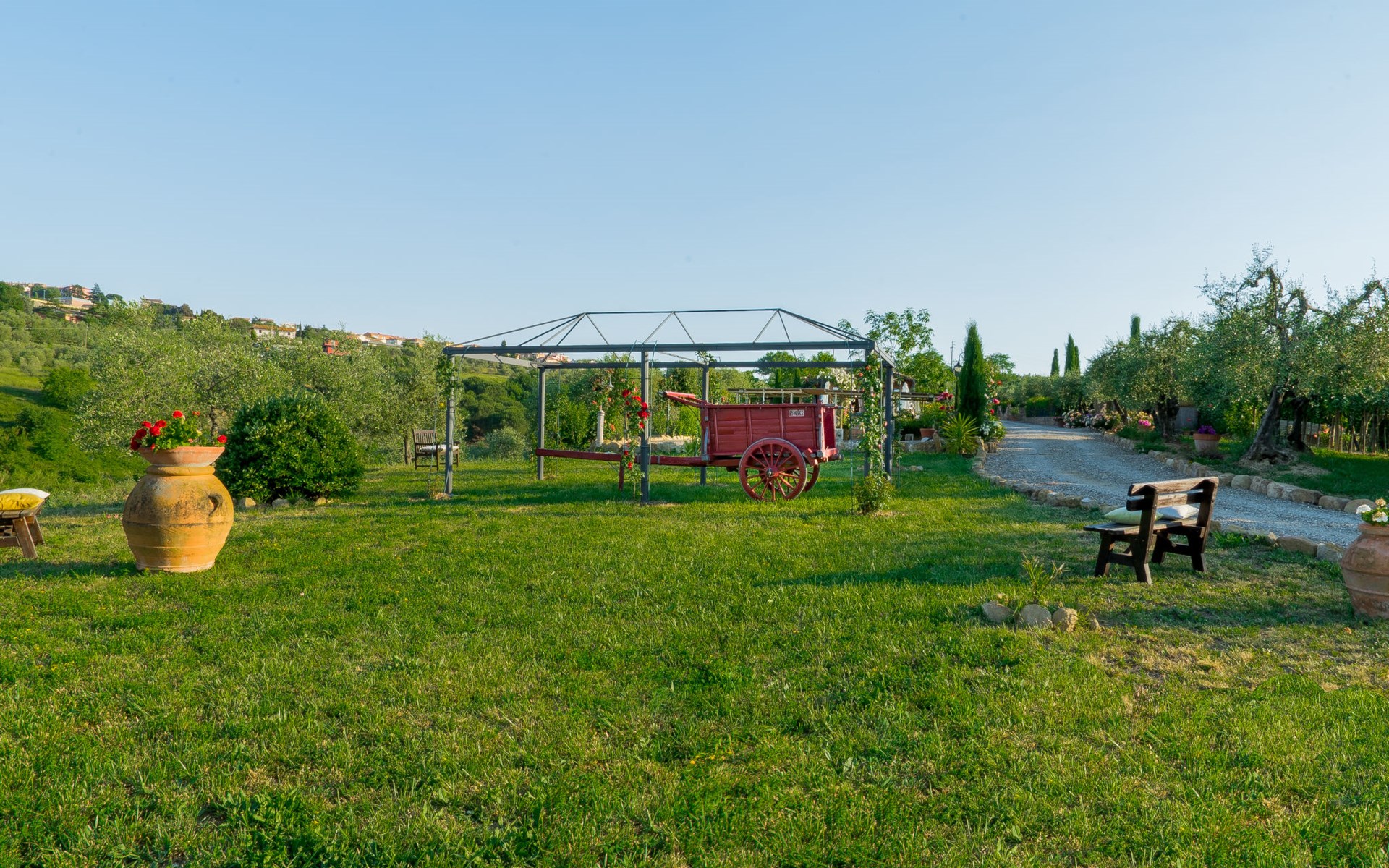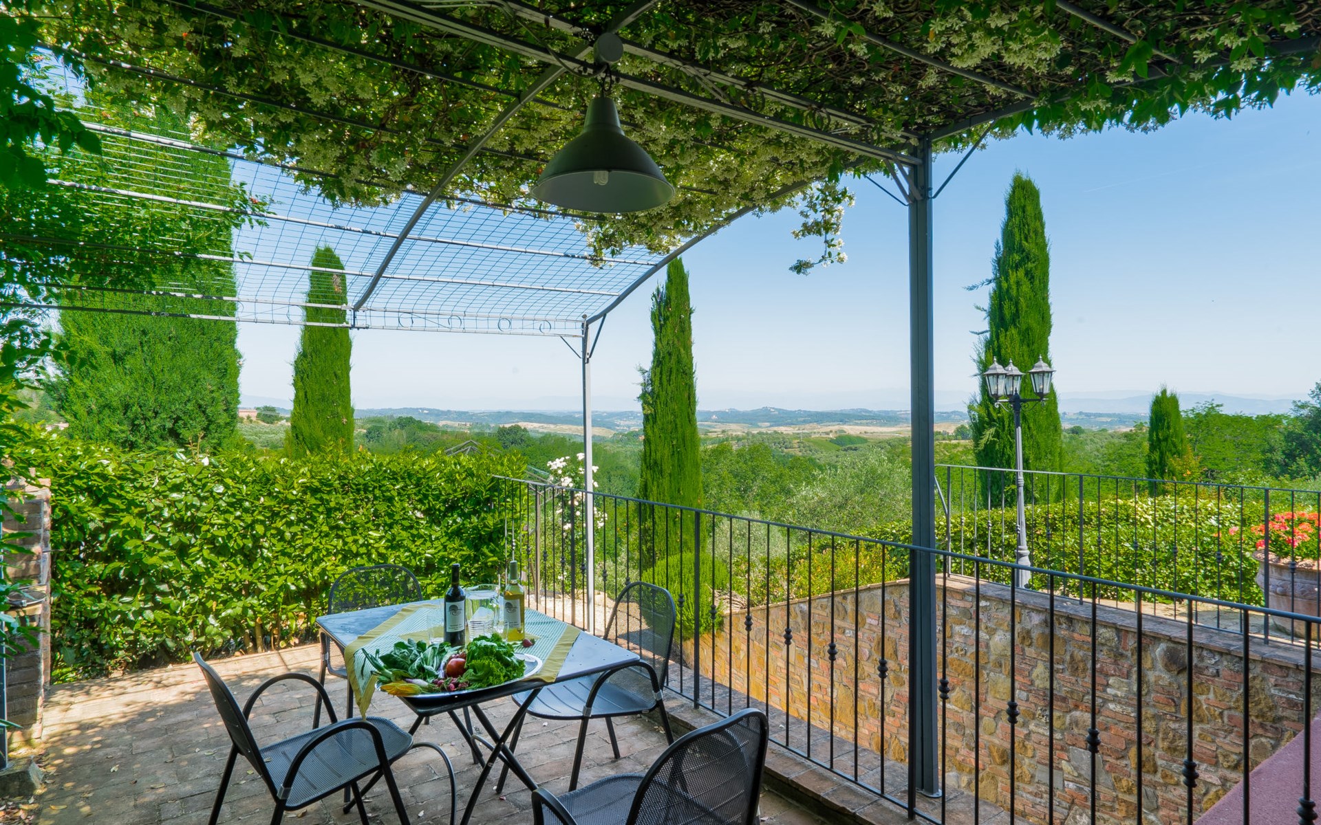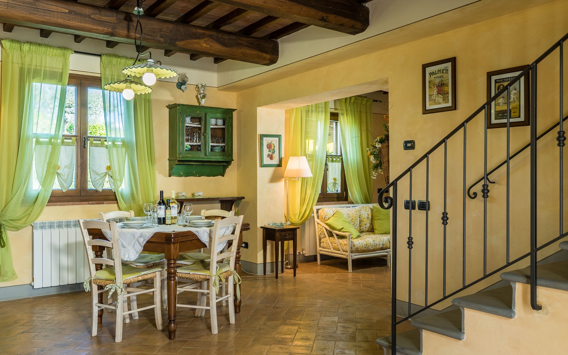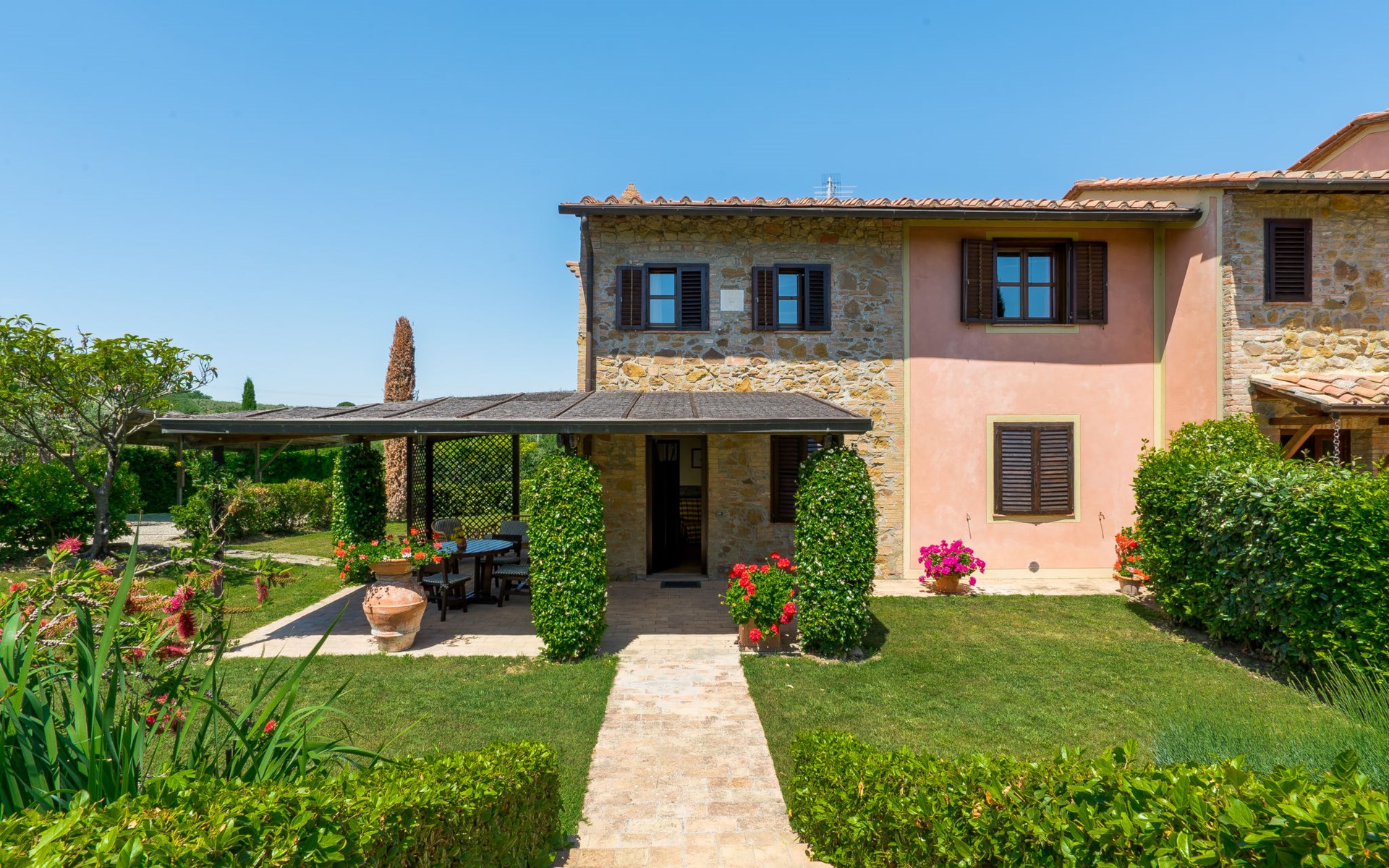 Das von uns angebotene Bauernhaus liegt im Herzen der Toskana. Die Olivenbäume, die Weinreben und der Obstgarten bilden eine wunderbare Kulisse für das sorgfältig restaurierte Bauernhaus, das nach den Merkmalen alter toskanischer Bauernhäuser mit originalen antiken Möbeln eingerichtet ist. Das Gebäude, das als einzelnes Gebäude vermietet wird, besteht aus drei Wohnungen, von denen zwei miteinander verbunden sind und eine freistehende Wohnung von etwa 60 Quadratmetern in einem kleinen Nebengebäude liegt. Vor dem Hauptgebäude befindet sich ein bezaubernder „Partyraum“, ganz in Holz gehalten und von großen Fenstern umgeben, ausgestattet mit Tisch und Stühlen, Sesseln, Holzofen, Grill und Kochplatten. Der Partyraum kann auf Anfrage gegen eine zusätzliche Gebühr gebucht werden, die direkt vor Ort zu entrichten ist. Freistehender Landwirtschaftlicher Betrieb "La Veduta". Mietobjekt bestehend aus Haupt- und Nebengebäude, 1.4 km vom Zentrum von Montaione, 21 km vom Zentrum von San Gimignano, 59 km vom Zentrum von Firenze, alleinstehende, ruhige, sonnige Lage, im Grünen. Zur Alleinbenutzung: Garten 20'000 m2 (nicht eingezäunt), Schwimmbad (6 x 12 m, 120 - 160 cm tief, saisonale Verfügbarkeit: 01.Mai. - 30.Sep.). Aussendusche, Sprudelbad, Tischtennis, Gartenmöbel, Grill, Poolpflege durch den Besitzer/Gärtner. Im Hause: Zentralheizung, Heizung vor Ort zu zahlen, Heizung nur verfügbar von 01.Nov. - 04.Apr.. Parkplatz (für 4 Autos) auf dem Grundstück. Einkaufsgeschäft 1.5 km, Supermarkt 1.5 km, Restaurant 1.5 km, Bushaltestelle 2 km, Sandstrand "Cecina" 67 km, Thermalbad "Casciana Terme" 38 km. Golfplatz (18 Loch) 16 km. Nahe gelegene Sehenswürdigkeiten: Certaldo 17 km, San Miniato 23 km, Volterra 29 km, Lajatico, Colle di Val d'Elsa 35 km, San Casciano in Val di Pesa 40 km, Siena 60 km. Bitte beachten: geeignet für Familien.