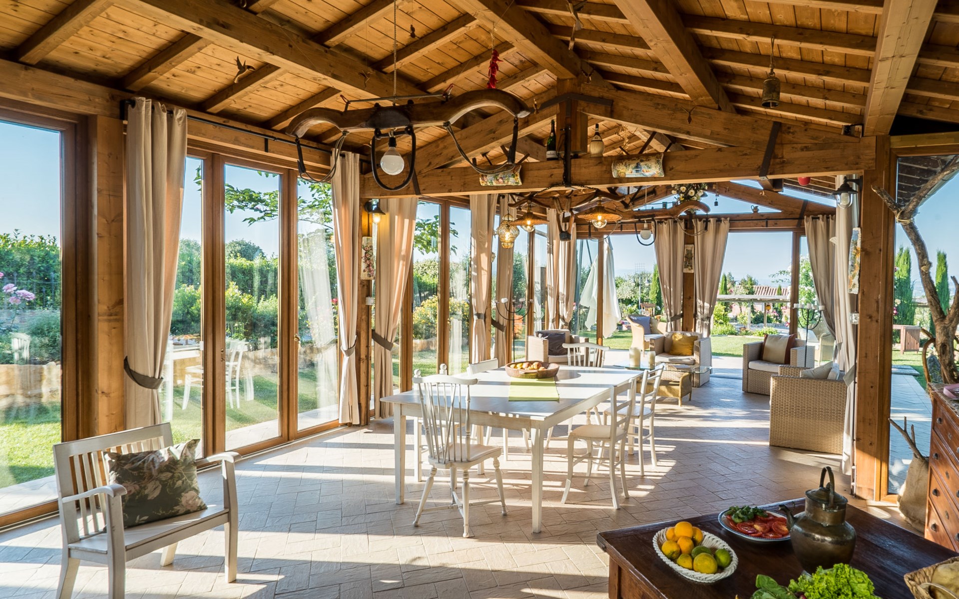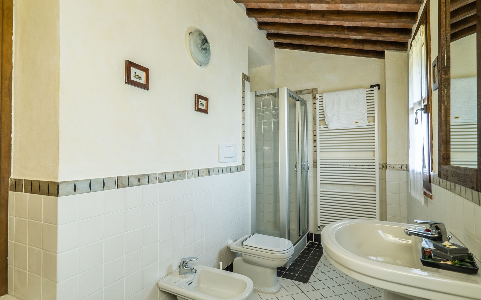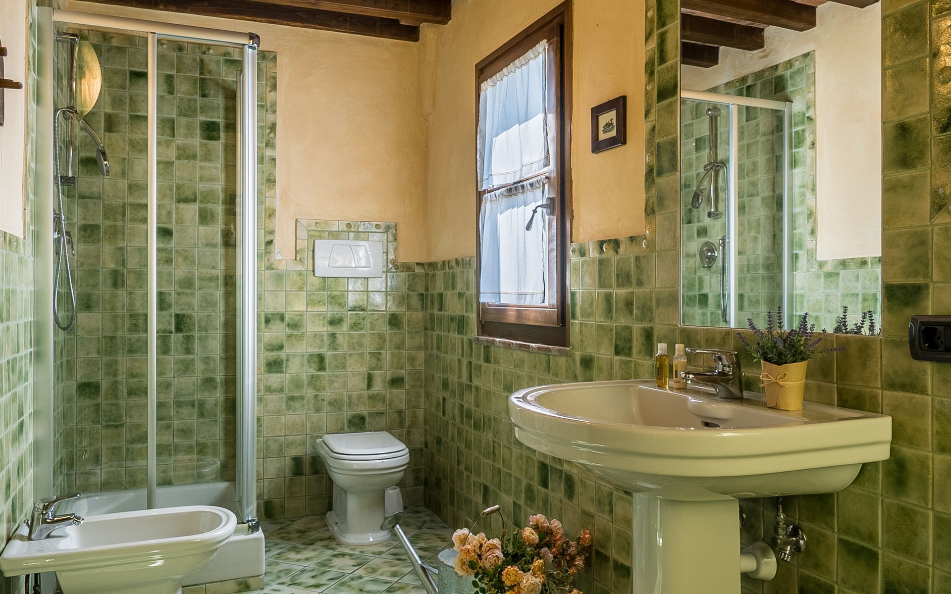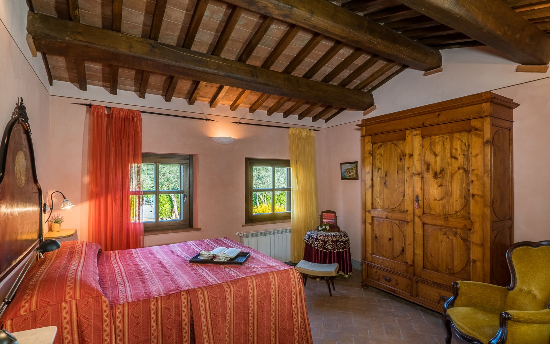 Das von uns angebotene Bauernhaus liegt im Herzen der Toskana. Die Olivenbäume, die Weinreben und der Obstgarten bilden eine wunderbare Kulisse für das sorgfältig restaurierte Bauernhaus, das nach den Merkmalen alter toskanischer Bauernhäuser mit originalen antiken Möbeln eingerichtet ist. Das Gebäude, das als einzelnes Gebäude vermietet wird, besteht aus drei Wohnungen, von denen zwei miteinander verbunden sind und eine freistehende Wohnung von etwa 60 Quadratmetern in einem kleinen Nebengebäude liegt. Vor dem Hauptgebäude befindet sich ein bezaubernder „Partyraum“, ganz in Holz gehalten und von großen Fenstern umgeben, ausgestattet mit Tisch und Stühlen, Sesseln, Holzofen, Grill und Kochplatten. Der Partyraum kann auf Anfrage gegen eine zusätzliche Gebühr gebucht werden, die direkt vor Ort zu entrichten ist. Freistehender Landwirtschaftlicher Betrieb "La Veduta". Mietobjekt bestehend aus Haupt- und Nebengebäude, 1.4 km vom Zentrum von Montaione, 21 km vom Zentrum von San Gimignano, 59 km vom Zentrum von Firenze, alleinstehende, ruhige, sonnige Lage, im Grünen. Zur Alleinbenutzung: Garten 20'000 m2 (nicht eingezäunt), Schwimmbad (6 x 12 m, 120 - 160 cm tief, saisonale Verfügbarkeit: 01.Mai. - 30.Sep.). Aussendusche, Sprudelbad, Tischtennis, Gartenmöbel, Grill, Poolpflege durch den Besitzer/Gärtner. Im Hause: Zentralheizung, Heizung vor Ort zu zahlen, Heizung nur verfügbar von 01.Nov. - 04.Apr.. Parkplatz (für 4 Autos) auf dem Grundstück. Einkaufsgeschäft 1.5 km, Supermarkt 1.5 km, Restaurant 1.5 km, Bushaltestelle 2 km, Sandstrand "Cecina" 67 km, Thermalbad "Casciana Terme" 38 km. Golfplatz (18 Loch) 16 km. Nahe gelegene Sehenswürdigkeiten: Certaldo 17 km, San Miniato 23 km, Volterra 29 km, Lajatico, Colle di Val d'Elsa 35 km, San Casciano in Val di Pesa 40 km, Siena 60 km. Bitte beachten: geeignet für Familien.