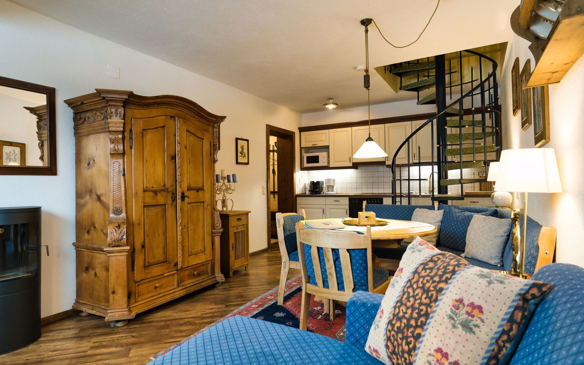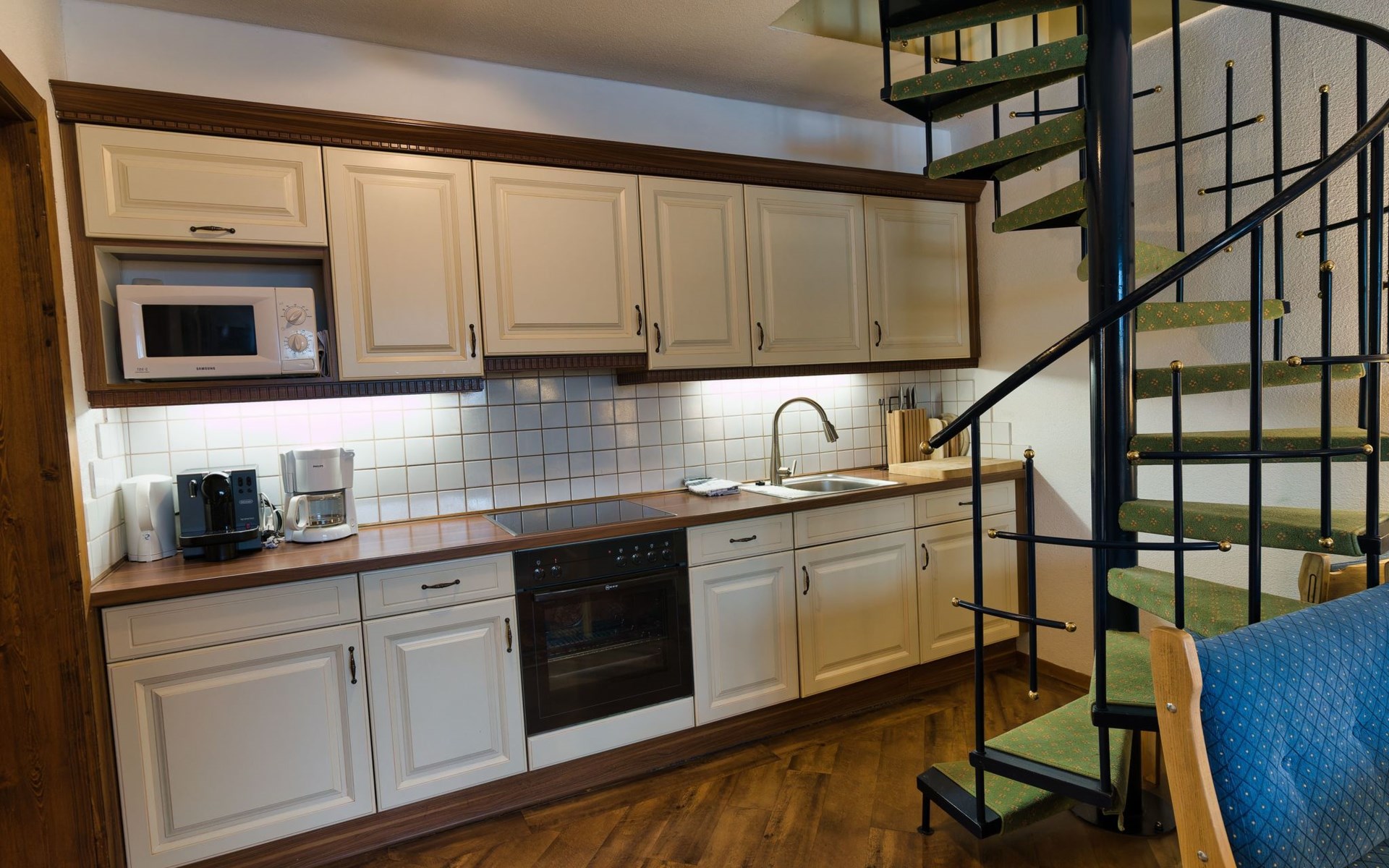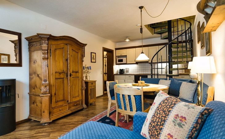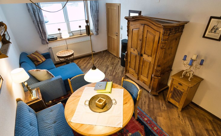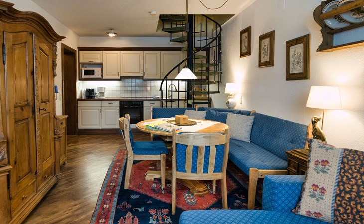 Wenn Sie die Wohnung betreten gelangen Sie zum großzügigen Wohnbereich mit Sitzecke (ausziehbar für eine weitere Person), "Kachelofen" mit Ethanol beheizbar für gemütliche Stunden, SAT-TV, Bücher und diverse Brettspiele. Weiter verfügt dieser Raum über einen Essbereich mit ausziehbarem Tisch und eine offene, voll ausgestattete Küche mit E-Herd, Backrohr, Kühlschrank mit Gefrierfach, Geschirrspüler, Wasserkocher, Filterkaffeemaschine, NESPRESSO Kaffeemaschine, Mikrowelle, Toaster und div. Küchengeräte.