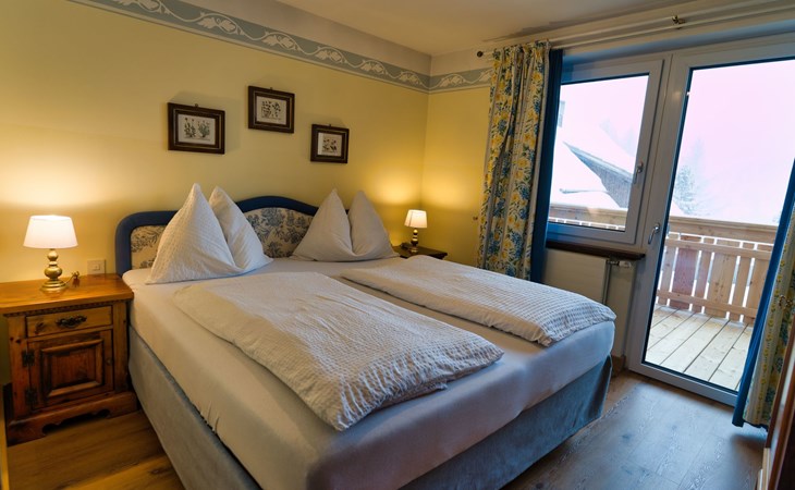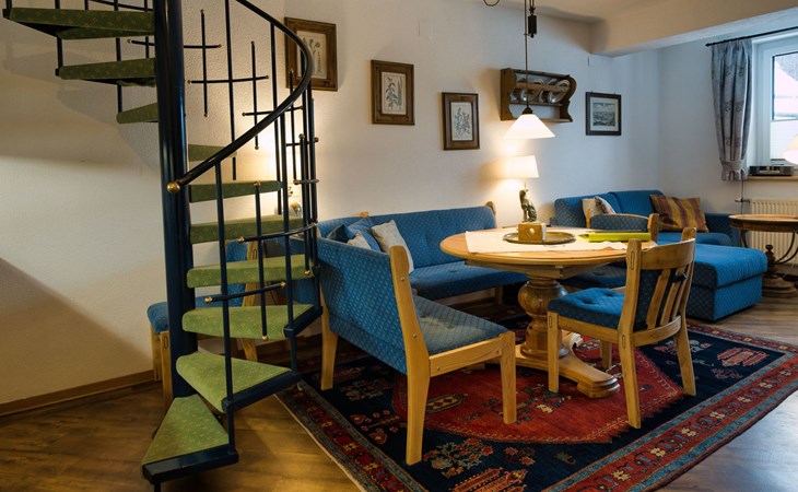 Über eine Wendeltreppe kommt man in den 1. Stock zu den beiden Schlafzimmern (je ein Doppelbett). Von einem der beiden Schlafzimmern gelangt man zu einem großzügigen, südseitigen Balkon mit Liegestühle und Sitzgelegenheit.