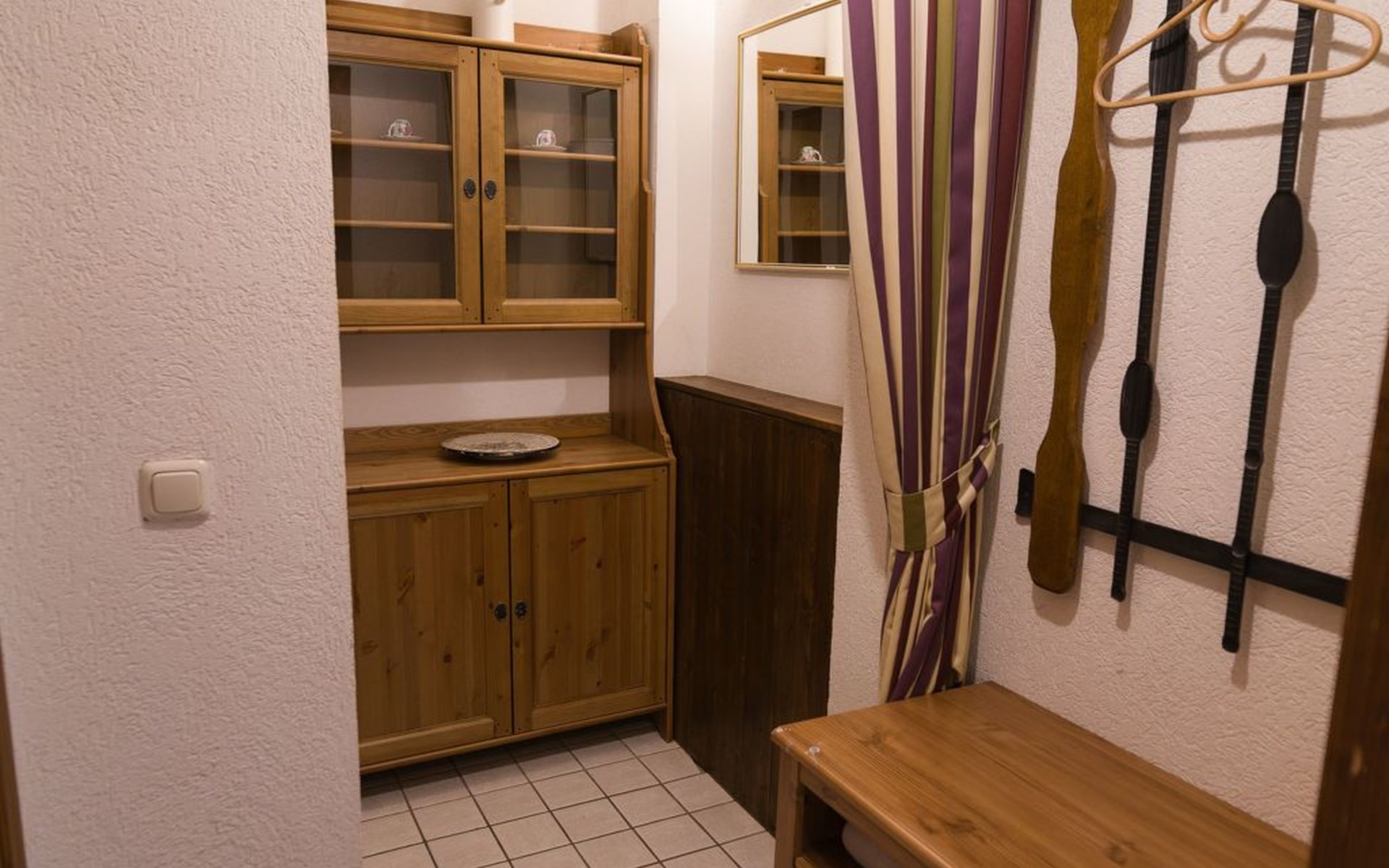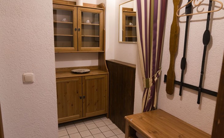 Vom Küchenbereich gelangt man zur Garderobe, Abstellraum und einem Badezimmer mit WC und Dusche.