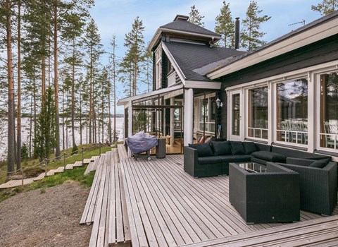 65 km nordöstlich von Kuopio, See Syväri 50 m, am Ufer der Petäjälahti-Bucht gelegen, flaches und hartes Sandbodenufer, eigenes Boot. Dreistöckiges Blockhaus, Baujahr 2007, mit 7 separaten Räumen und Gemeinschaftsraum. Obergeschoss: 2 Ferienwohnungen mit je 1 Schlafzimmer 2+1 Betten (eins mit 1 Doppelbett), Wohnzimmer mit Miniküche, Waschraum, WC, Mikrowelle, TV, CD-Spieler. Zwischen den 2 Ferienwohnungen befindet sich Wohnbereich/Bibliothek mit Sofa und Sesseln für 10 Personen, sowie 2 Zustellbetten. Mittlere Etage: drei Ferienwohnungen, davon 2 mit einem Schlafzimmer mit 2 Betten, Miniküche im Wohnbereich, Waschraum, WC, Mikrowelle, TV, CD-Spieler. Die dritte Ferienwohnung ist eine Einzimmerwohnung mit Etagenbett (1+1 Betten) und Behindertentoilette. In der mittleren Etage befindet sich der Salon des Chalets, der entweder als Konferenzraum oder als Esszimmer dient. Es gibt eine gute Küche, die an Salon angeschlossen ist. Erdgeschoss: 2 Ferienwohnungen mit je 2 Betten (eins mit 1 Doppelbett), Miniküche, Waschraum, WC, Mikrowelle, TV, CD-Spieler. Im Erdgeschoss gibt es auch ein Zimmer mit Kamin, Flachbildfernseher, Billardtisch, DVD- und CD-Spieler. Sauna mit E-Herd, Waschraum (5 Duschen). Auf der Seeseite des Chalets befindet sich eine grosse Terrasse. Ufersauna (50 m²) mit Kaminzimmer / Küche, Sauna (Holzofen), Waschraum, Ankleideraum und grosse Terrasse. Das Gebäude verfügt über elektrische Kochplatte, elektrischen Kühlschrank, Wärmespeicherkamin, warmes und kaltes Wasser, sowie 2 Duschen. Dieses Chalet, im Stadtteil Nipanen, in Tahkovuori, eignet sich ideal für Konferenzen oder als Veranstaltungsort für Partys und Feiern für mehrere Familien. Das Chalet verfügt über alle für Konferenzen erforderlichen AB-Geräte. Das Gebäude befindet sich am Ende einer Strasse, am eigenen Seeufer und das ruhige Grundstück ist in einem natürlichen Zustand. Kein Durchgangsverkehr. Hinweis: Haustiere sind im Erdgeschoss gestattet, ABER NICHT im Kaminzimmer und in der Saunaabteilung. Buchungen sind ab 16:00 Uhr am Anreisetag bis 12:00 Uhr (Mittag) am Abreisetag gültig. (Dies gilt auch für Wochenendbuchungen). Das Haus wird nicht an junge Leute vermietet.