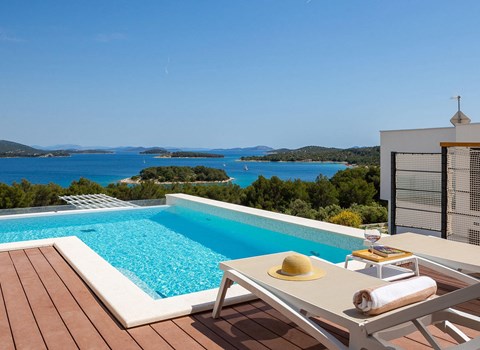 Der Außenbereich dieses Ferienhauses ist so gestaltet, dass er Ihnen eine ruhige und private Oase bietet. Das Highlight ist zweifelsohne der große 55 m² große Pool, der an warmen Sommertagen und -nächten für Abkühlung sorgt. Rund um den Pool bietet der gepflegte Garten, der nur Ihnen zur Verfügung steht, eine üppige Kulisse und zusätzlichen Raum zum Entspannen. Die Villa verfügt über Terrassen auf beiden Etagen und eine weitere auf dem Dach, die alle mit bequemen Loungemöbeln ausgestattet sind. Diese Terrassen sind ideal, um die frische Luft zu genießen, den Panoramablick auf das Meer und die Insel zu genießen oder einfach Zeit mit Ihren Lieben zu verbringen.