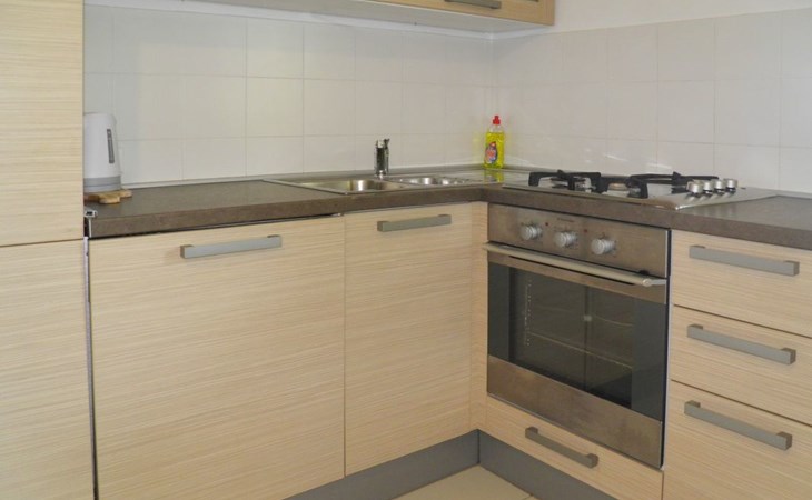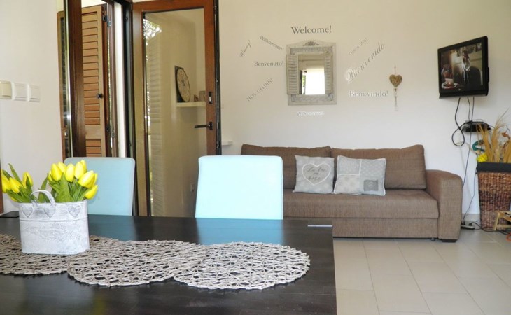 Wohnbereich : Wohn-, Esszimmer und Küche sind eine Einheit; Esstisch und Sitzgelegenheiten für alle Personen; eine zusätzl. Schlafmögl. auf einer Schlafcouch; mit Balkon; Gefliest Küche : Kochnische, Geschirr, Kochtöpfe, Besteck u.ä. sind vorhanden, Geschirrtücher vorhanden, Elektroherd, Anzahl der Kochplatten: 4, Kühlschrank mit Gefrierfach, Kaffeemaschine