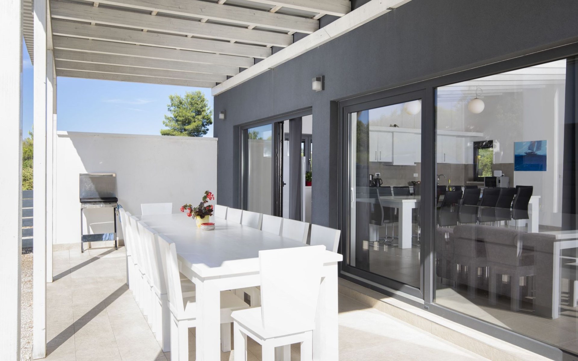Der Außenbereich ist mit einem Grill und einem großen Esstisch ideal zum Essen und Unterhalten.