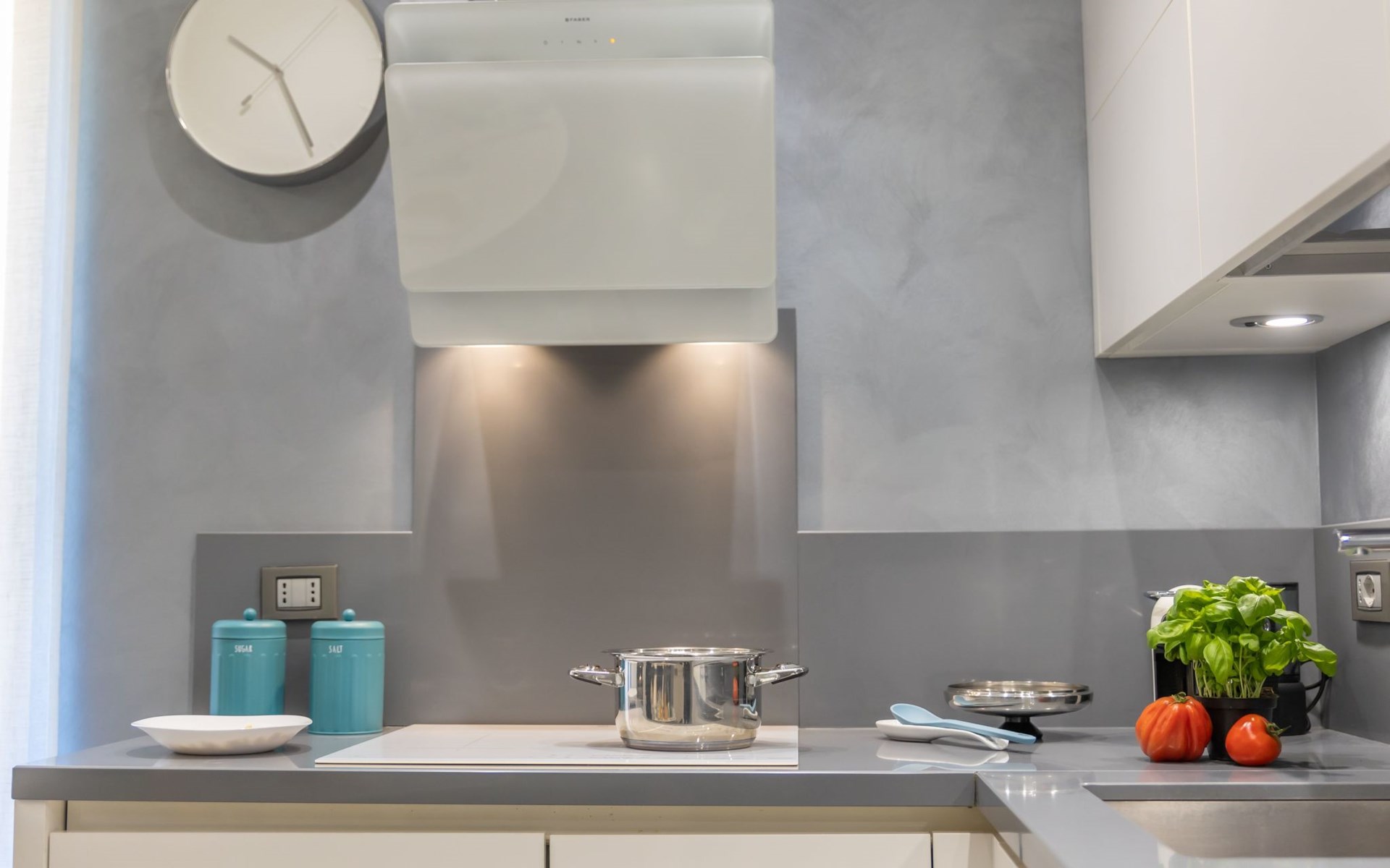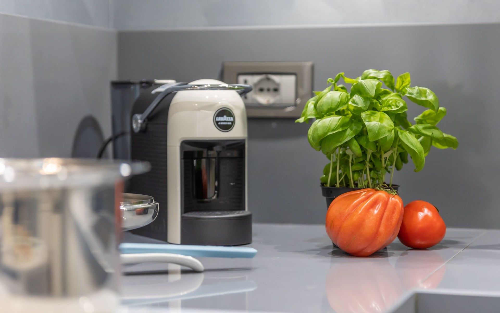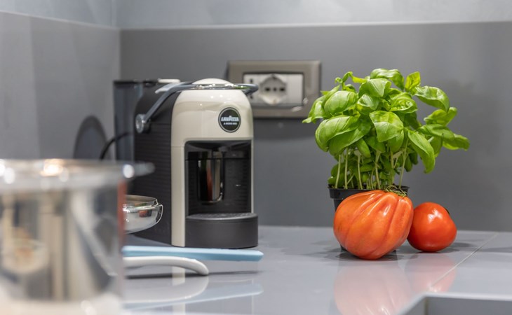 Die Bestätigung kommt aus dem Wohnbereich, der von dem großen Ledersofa auf der einen Seite und der offenen Küche auf der anderen Seite dominiert wird. Die Küche ist sehr weiß, super ausgestattet und verfügt über einen Kühl- und Gefrierschrank, eine Waschmaschine und einen Geschirrspüler, Induktionskochfelder und einen Doppel-Backofen: elektrisch und Mikrowelle. Es fehlt wirklich an nichts, auch nicht an Kleingeräten: die Kaffeepadmaschine, der Toaster.