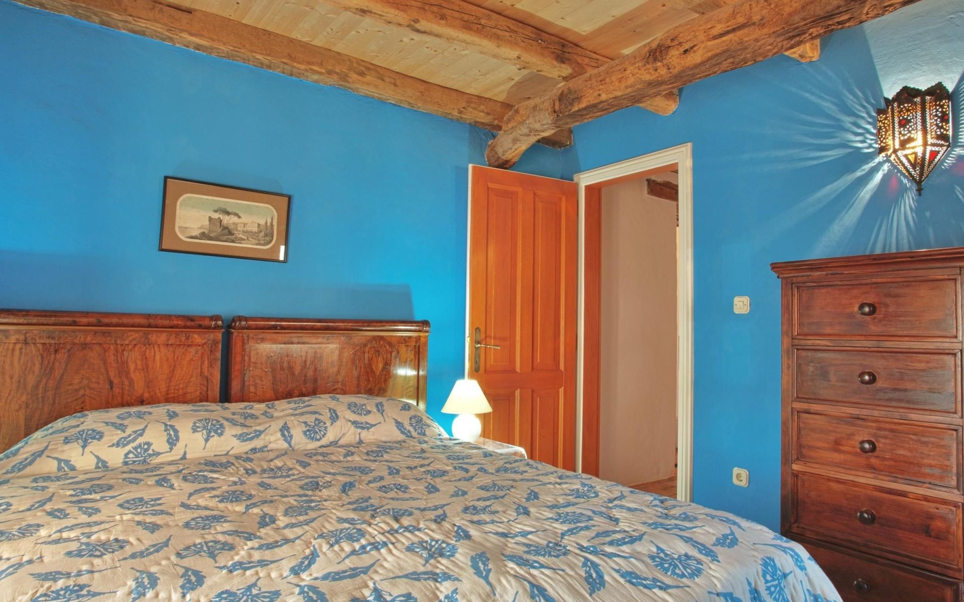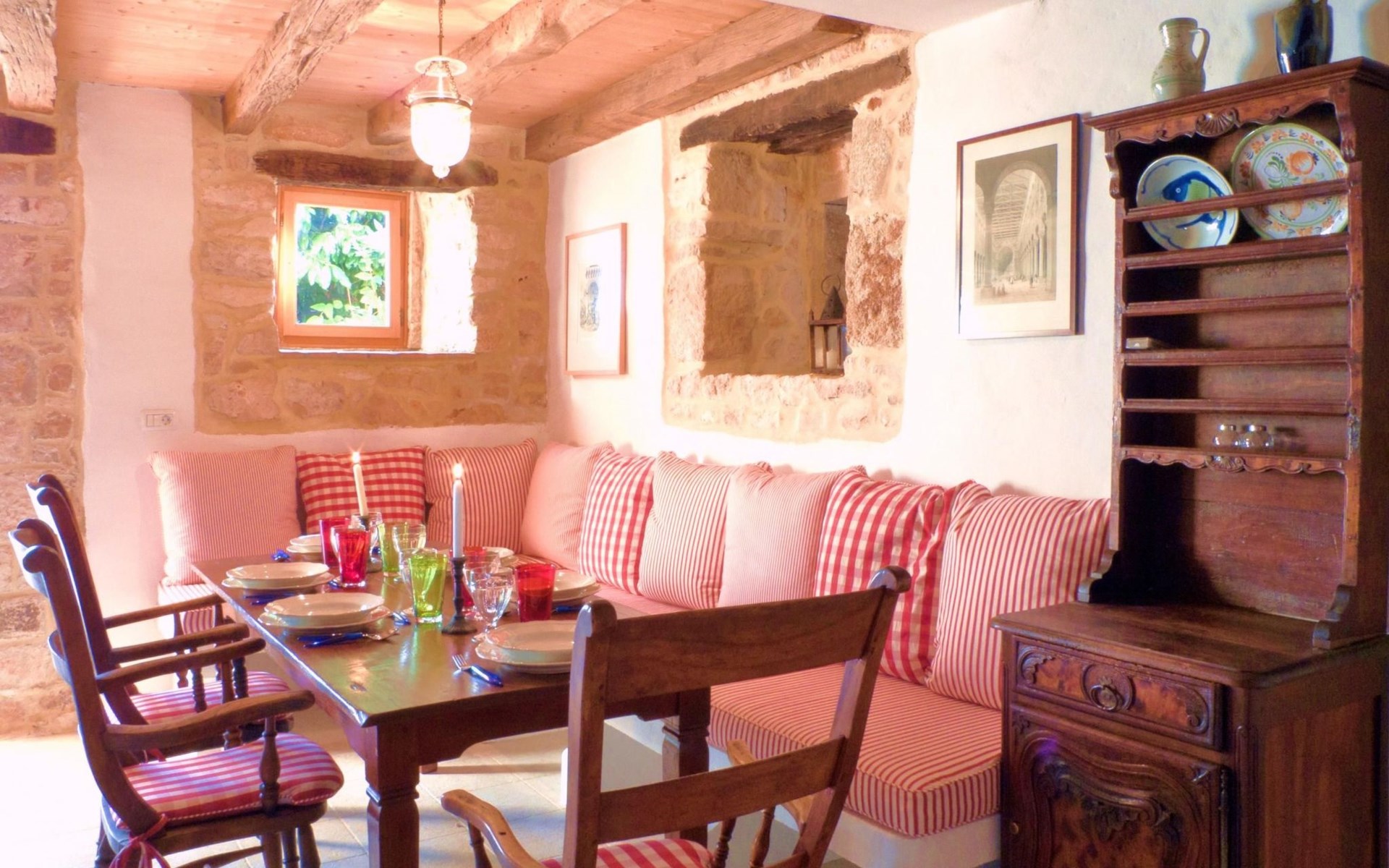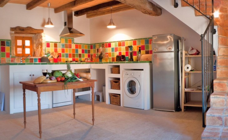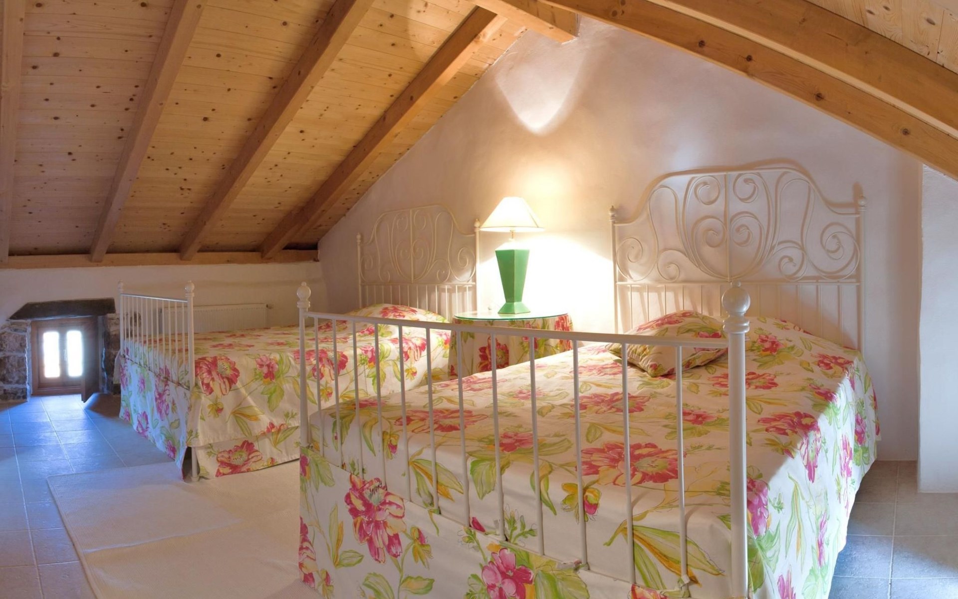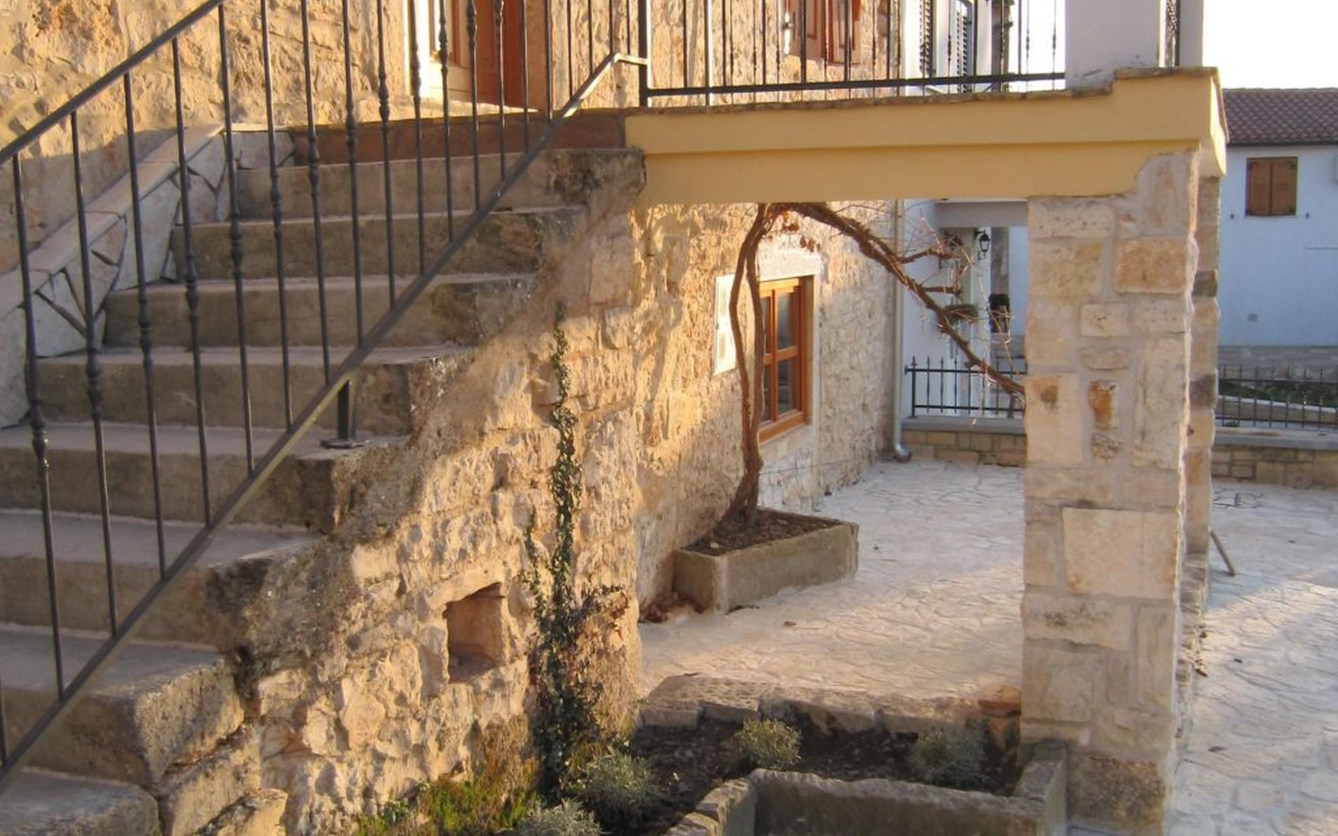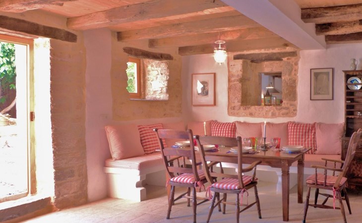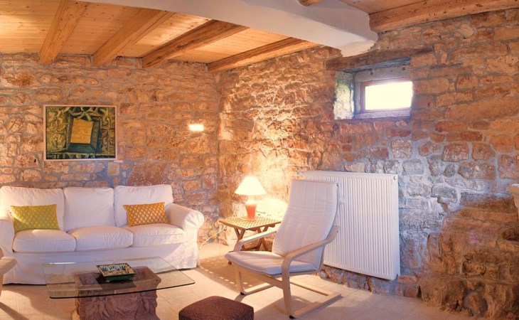 Das Haus besteht aus dicken Steinmauern (teilweise noch aus der byzantinischen Zeit), vielen Nischen und verwinkelten Ecken. Es hat zwei offene Kamine und von Künstlerhand bemalte Fliesen in Bad und Küche. Jedes Schlafzimmer ist in einer anderen Farbe gehalten. Hier können Sie die Seele baumeln lassen und sich wirklich erholen – vollkommen abseits des Touristenstroms. Das Haus bietet acht Personen bequem Platz. Sie finden im Haupthaus ein aufwendig und luxuriös renoviertes Steinhaus auf zwei Etagen vor: Es gibt drei Doppelbettzimmer, ein Zweibettzimmer, drei Bäder (zwei davon mit separater Dusche), eine gut ausgestattete Küche (Herd, Backofen, Waschmaschine, Geschirrspüler, Kühl/Gefrierschrank, elektrische Küchengeräte), Küche und Salon mit offenem Kamin, TV mit Satellitenanschluss, DVD Player, Radio CD Player. Beide Häuser verfügen über eine Zentralheizung. Die Bettenmaße sind: Rosa Schlafzimmer, Doppelbett: 180/200cm, gelbes Schlafzimmer, Doppelbett: 180/200cm, blaues Schlafzimmer, Doppelbett: 160/200cm, Zweibettzimmer, geblümter Stoff, jedes Bett: 135/200cm. Ab 2015 steht auch WLAN zur Verfügung.