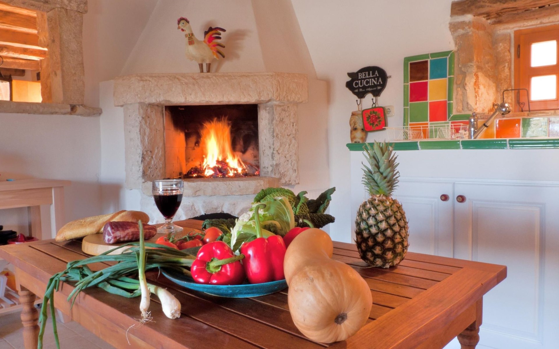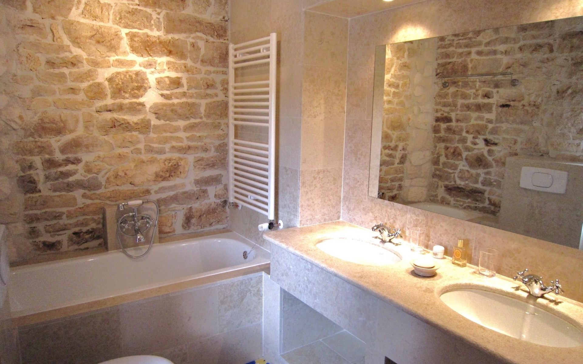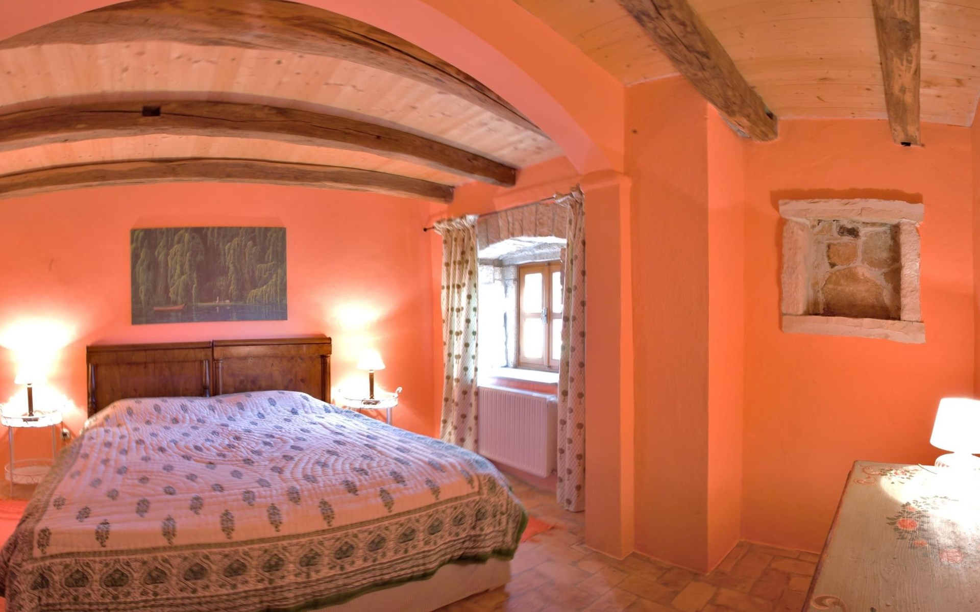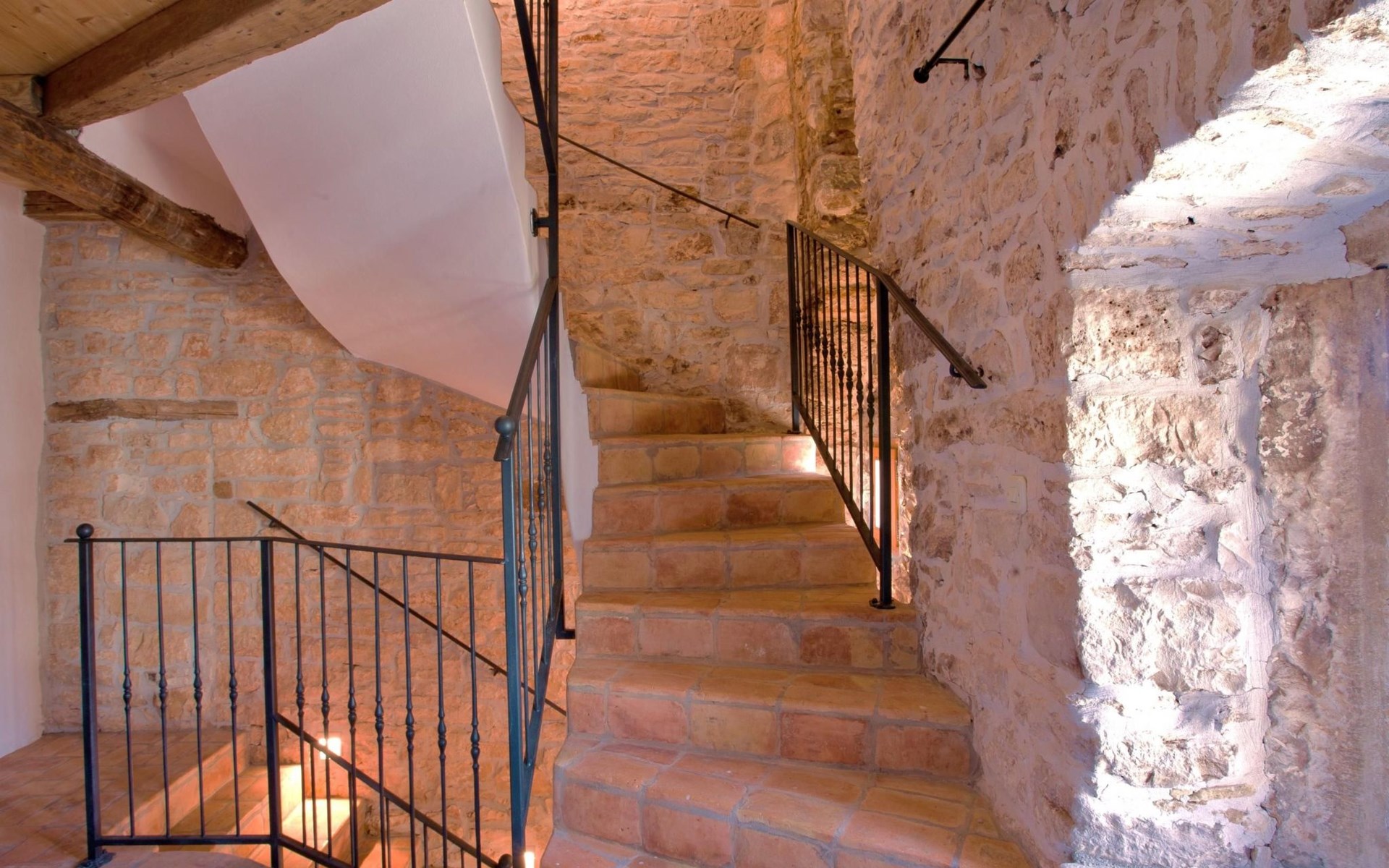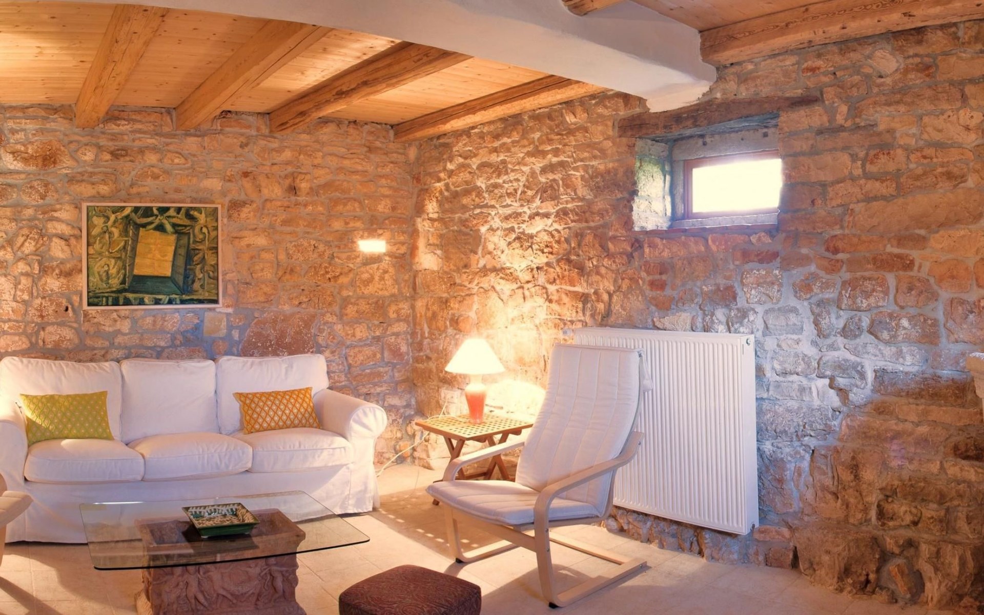 Das Haus besteht aus dicken Steinmauern (teilweise noch aus der byzantinischen Zeit), vielen Nischen und verwinkelten Ecken. Es hat zwei offene Kamine und von Künstlerhand bemalte Fliesen in Bad und Küche. Jedes Schlafzimmer ist in einer anderen Farbe gehalten. Hier können Sie die Seele baumeln lassen und sich wirklich erholen – vollkommen abseits des Touristenstroms. Das Haus bietet acht Personen bequem Platz. Sie finden im Haupthaus ein aufwendig und luxuriös renoviertes Steinhaus auf zwei Etagen vor: Es gibt drei Doppelbettzimmer, ein Zweibettzimmer, drei Bäder (zwei davon mit separater Dusche), eine gut ausgestattete Küche (Herd, Backofen, Waschmaschine, Geschirrspüler, Kühl/Gefrierschrank, elektrische Küchengeräte), Küche und Salon mit offenem Kamin, TV mit Satellitenanschluss, DVD Player, Radio CD Player. Beide Häuser verfügen über eine Zentralheizung. Die Bettenmaße sind: Rosa Schlafzimmer, Doppelbett: 180/200cm, gelbes Schlafzimmer, Doppelbett: 180/200cm, blaues Schlafzimmer, Doppelbett: 160/200cm, Zweibettzimmer, geblümter Stoff, jedes Bett: 135/200cm. Ab 2015 steht auch WLAN zur Verfügung.