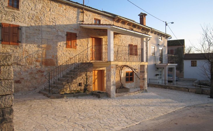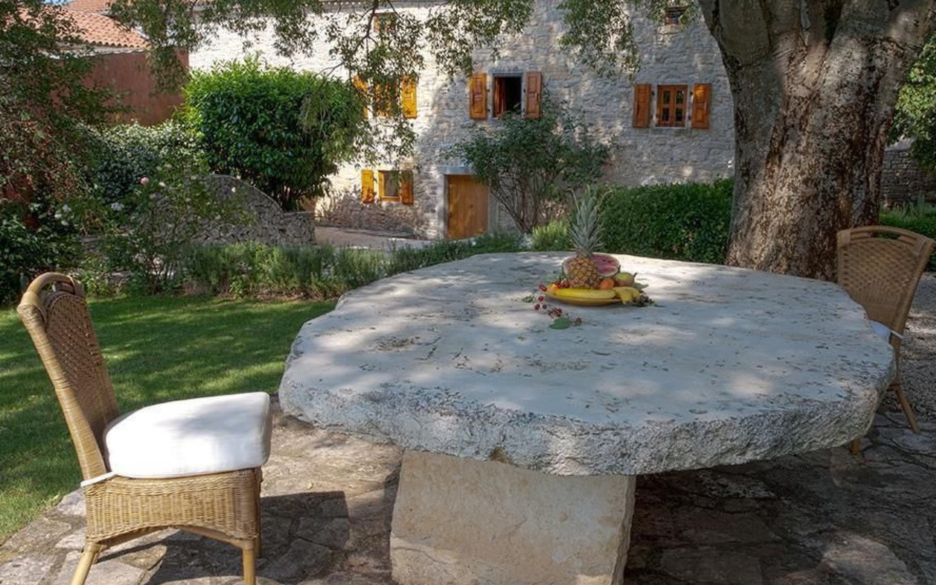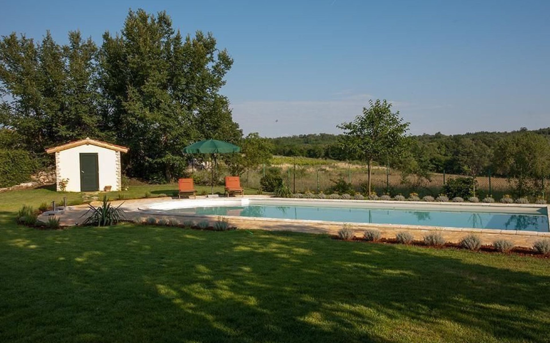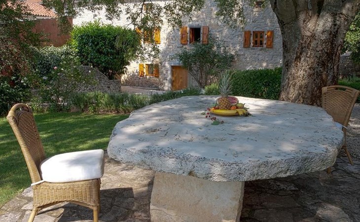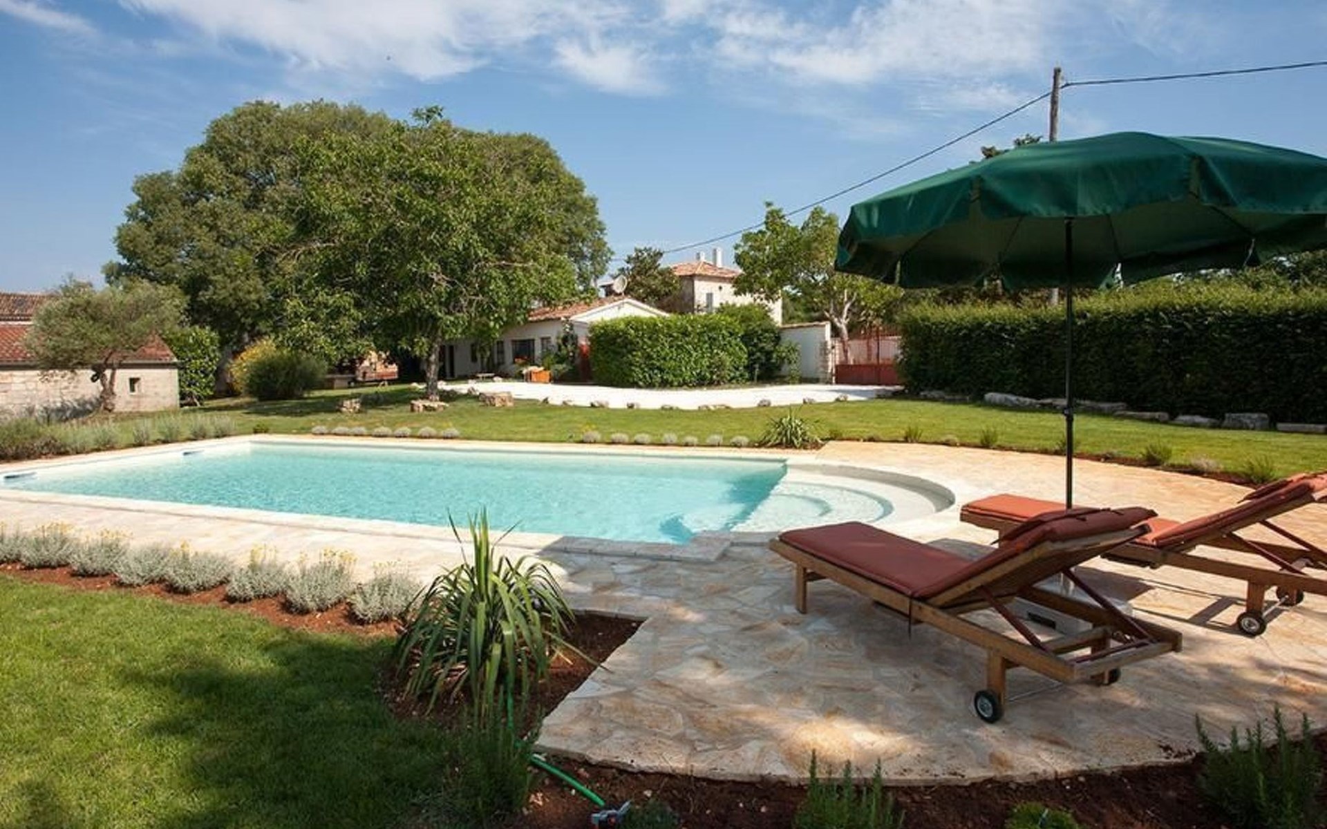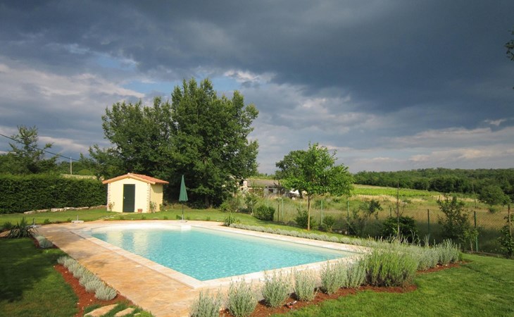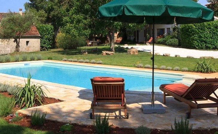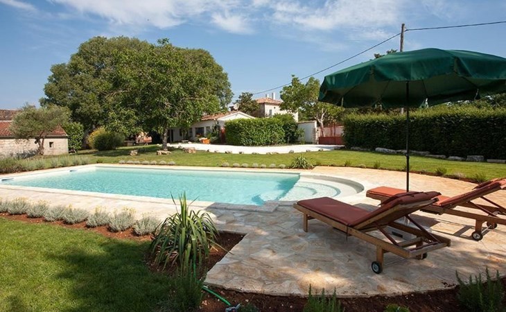 Es liegt eingebettet in einen großen Garten (2300qm) mit altem Baumbestand und hat ein großes Schwimmbad (12x5 m) mit römischen, halbrunden Treppen und Terrasse aus Natursteinen. Das Meer und Provinzstadt Porec sind in fünfzehn Kilometern zu erreichen. Der selten große Garten um die beiden Häuser wirkt wie eine saftig grüne Oase aus einer anderen Welt. Stolz wächst dort mitten im Grünen eine 400 Jahre alte, riesige Ladonia aus dem Boden und spendet beiden Häusern den nötigen Schatten während der sommerlich flirrenden Mittagshitze. Unter dem imposanten Baum steht ein uriger Natursteintisch für romantisch mediterrane Mahlzeiten und sonstige gemeinsamen Momente im Garten. Das Poolwasser ist ökologisch up-to-date mit einer leichten Meeressalzsohle angereichert. Für romantische Abende im Pool sorgt eine Unterwasser Beleuchtung. An diesem Ferienort können Sie wirklich Energie auftanken und den Rest der Welt mit ihren Herausforderungen total hinter sich lassen. Im Außenbereich gibt es Gartenmöbel, Sonnenliegen, drei Sonnenschirme am Pool, Tischtennis, Grill und es sind Parkplätze für vier Autos vorhanden (zwei direkt am Haus, zwei an der hinteren Garteneinfahrt).