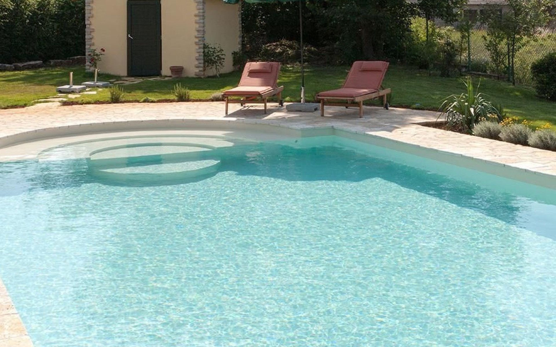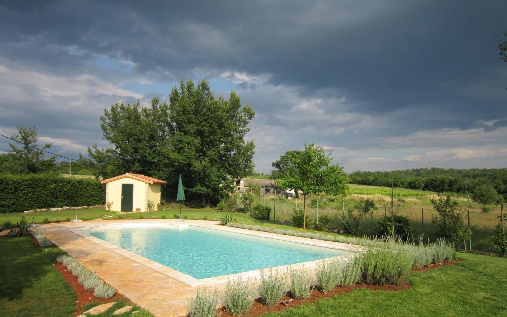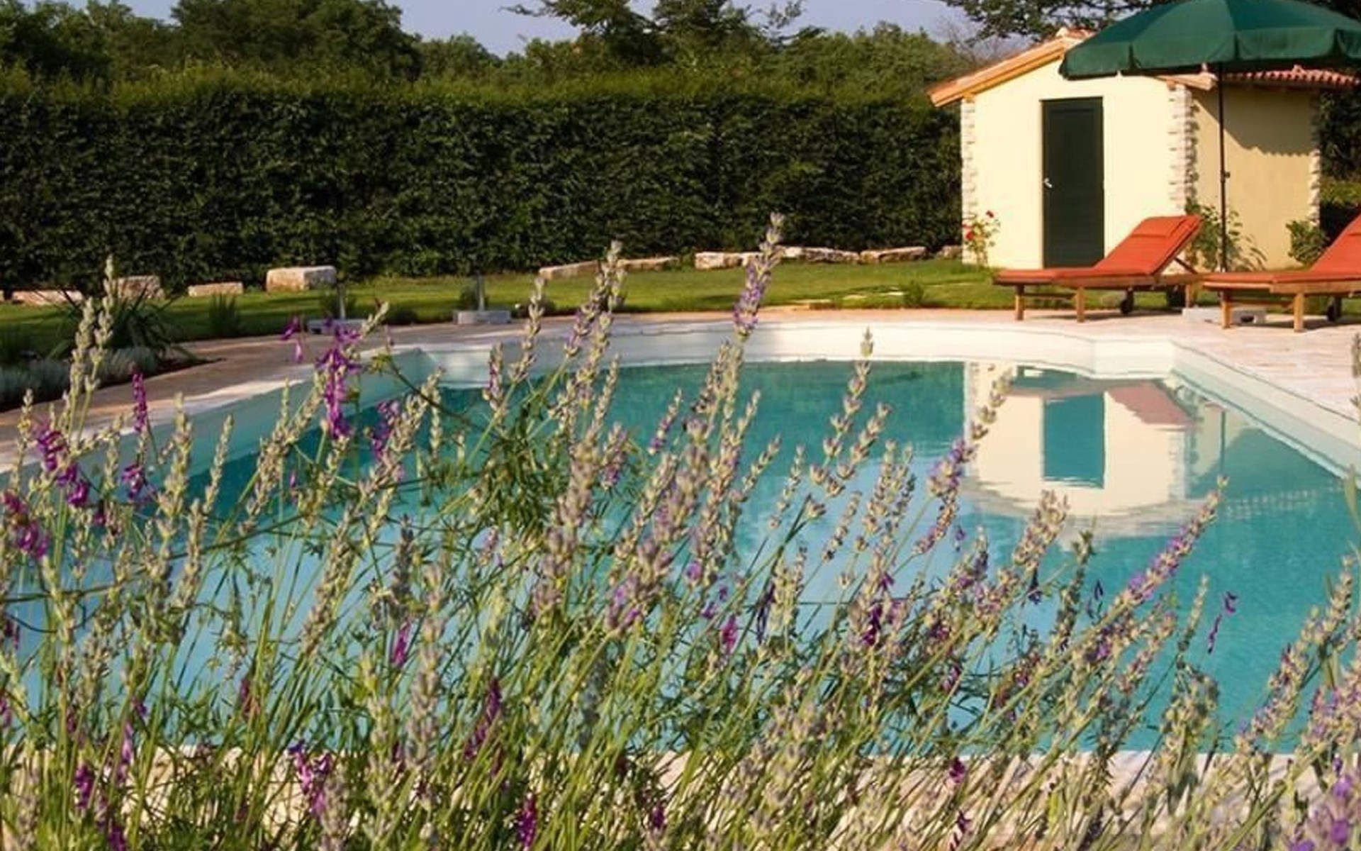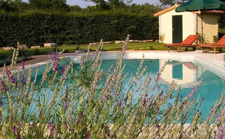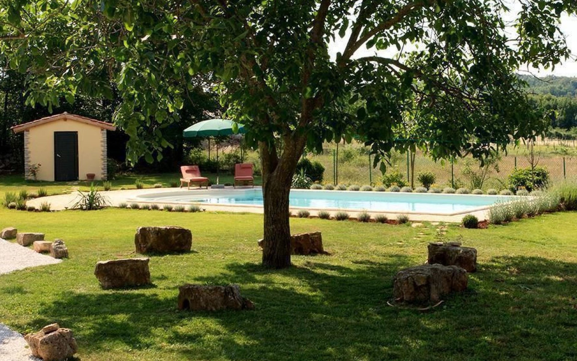 Es liegt eingebettet in einen großen Garten (2300qm) mit altem Baumbestand und hat ein großes Schwimmbad (12x5 m) mit römischen, halbrunden Treppen und Terrasse aus Natursteinen. Das Meer und Provinzstadt Porec sind in fünfzehn Kilometern zu erreichen. Der selten große Garten um die beiden Häuser wirkt wie eine saftig grüne Oase aus einer anderen Welt. Stolz wächst dort mitten im Grünen eine 400 Jahre alte, riesige Ladonia aus dem Boden und spendet beiden Häusern den nötigen Schatten während der sommerlich flirrenden Mittagshitze. Unter dem imposanten Baum steht ein uriger Natursteintisch für romantisch mediterrane Mahlzeiten und sonstige gemeinsamen Momente im Garten. Das Poolwasser ist ökologisch up-to-date mit einer leichten Meeressalzsohle angereichert. Für romantische Abende im Pool sorgt eine Unterwasser Beleuchtung. An diesem Ferienort können Sie wirklich Energie auftanken und den Rest der Welt mit ihren Herausforderungen total hinter sich lassen. Im Außenbereich gibt es Gartenmöbel, Sonnenliegen, drei Sonnenschirme am Pool, Tischtennis, Grill und es sind Parkplätze für vier Autos vorhanden (zwei direkt am Haus, zwei an der hinteren Garteneinfahrt).