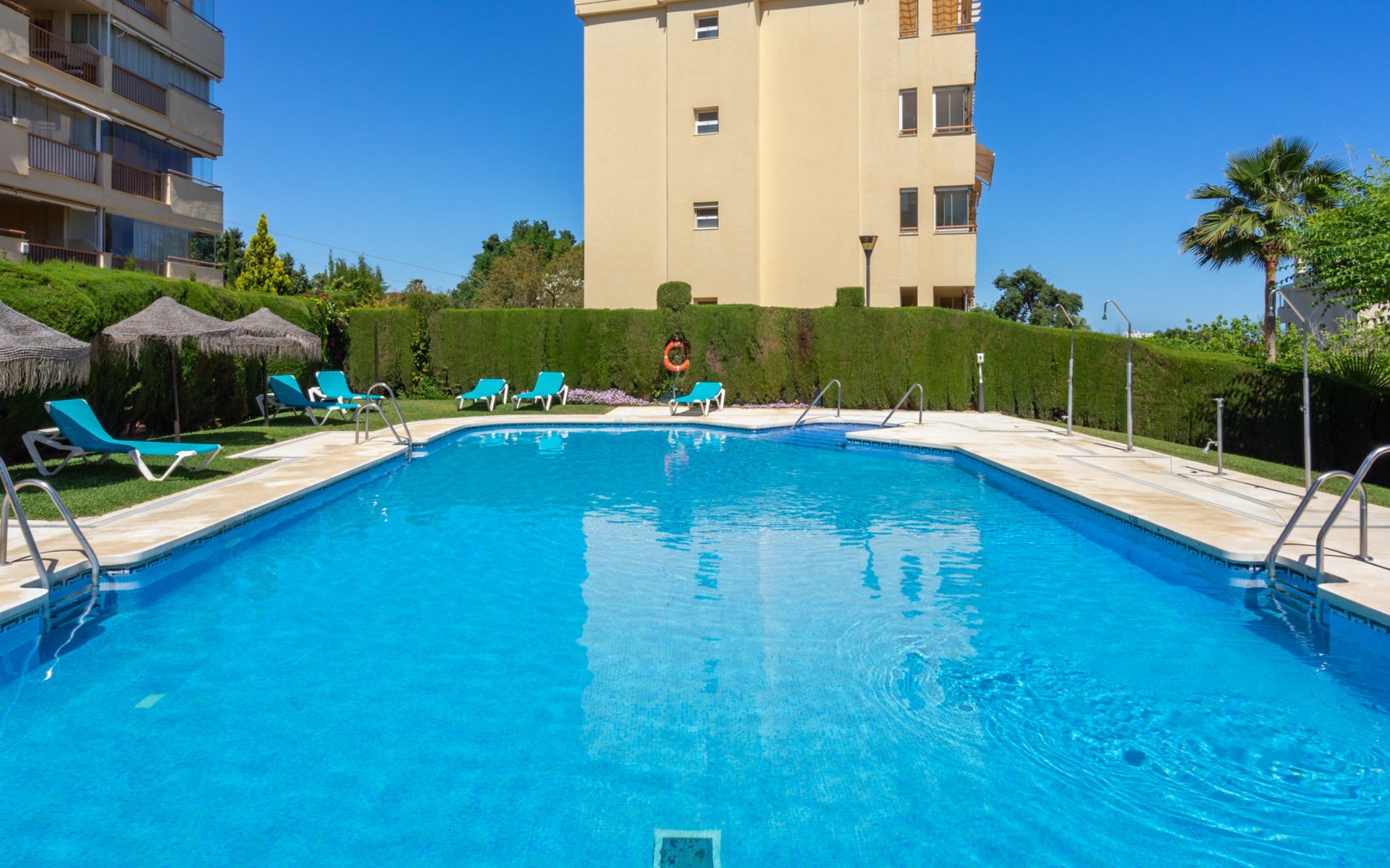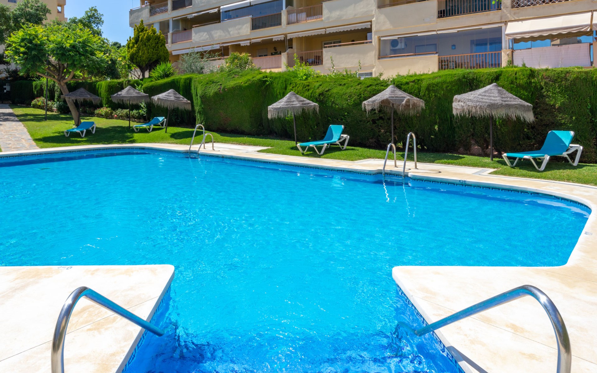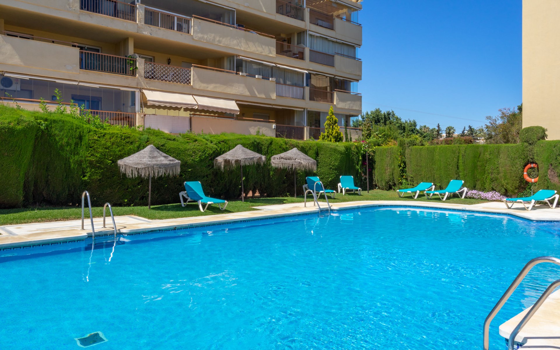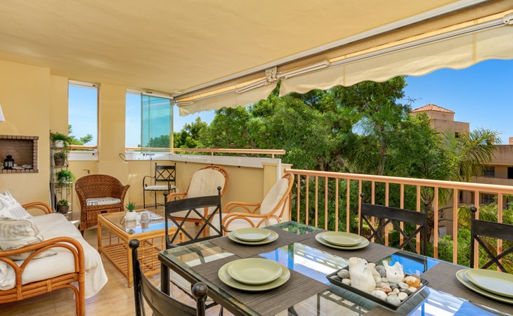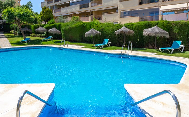 Calahonda 15 km von Marbella: Appartementhaus, Baujahr 2002. Im Ortszentrum von Calahonda, 500 m vom Meer, 500 m vom Strand. Zur Mitbenutzung: Garten mit Rasen, Schwimmbad (saisonale Verfügbarkeit: 01.Jan. - 31.Dez.). Dusche/WC im Poolbereich, Parkplatz (beschränkte Anzahl), öffentliche Parkplätze auf der Strasse. Supermarkt, Restaurant 400 m, Bushaltestelle 400 m, Sandstrand "Calahonda" 500 m. Golfplatz (18 Loch) 2.5 km, Tennis 2 km.