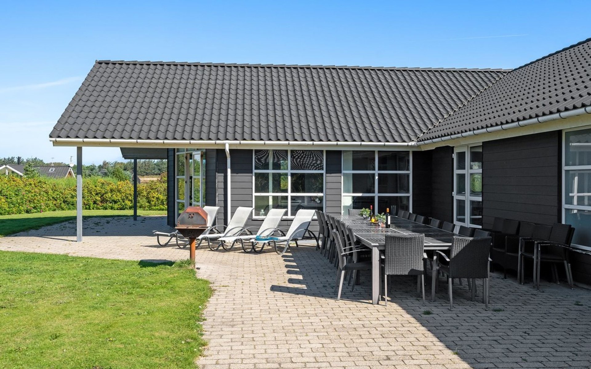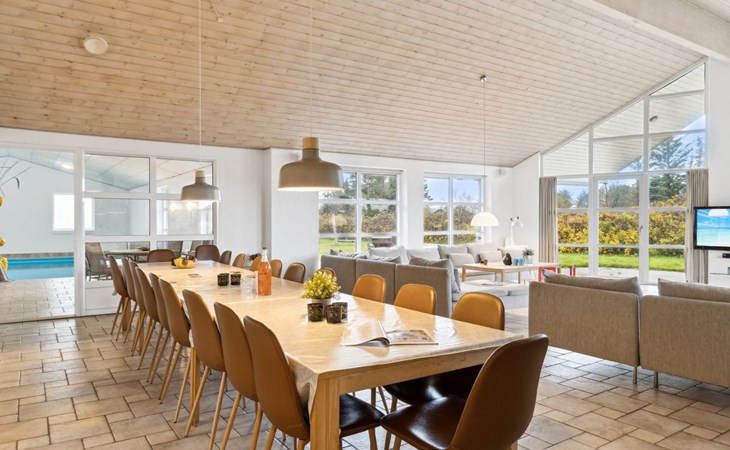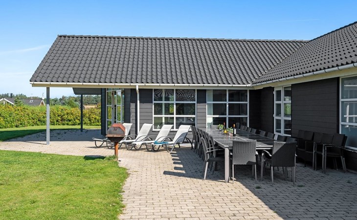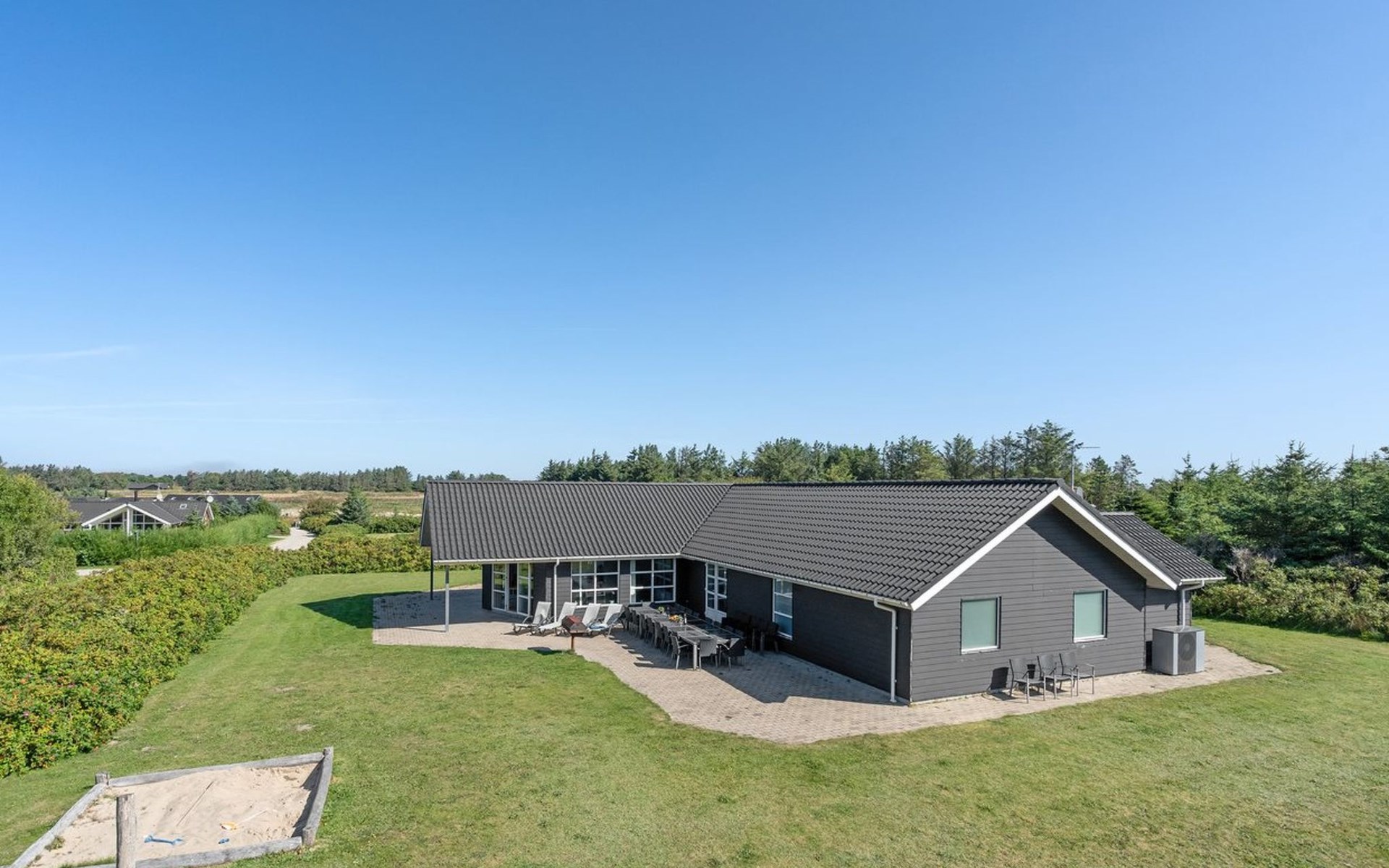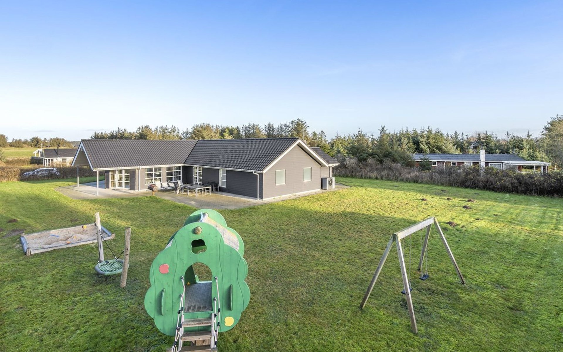 Einfamilienhaus, Baujahr 2005. 500 m vom Meer. Zur Alleinbenutzung: naturbelassenes Grundstück 2'500 m2, Hallenbad (3 x 6 m, 23 m2, 144 - 144 cm tief). Terrasse (50 m2), Kinderspielplatz (Rutschbahn, Schaukel). Im Hause: Sauna, Tischfussball, Waschmaschine, Wäschetrockner. Parkplatz beim Haus. Lebensmittelgeschäft 5 km. Golfplatz 5 km. Der Besitzer akzeptiert keine Jugendgruppen.