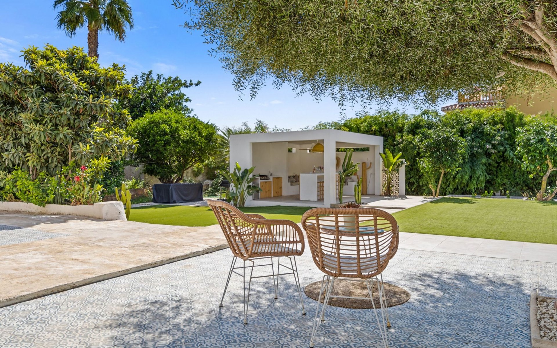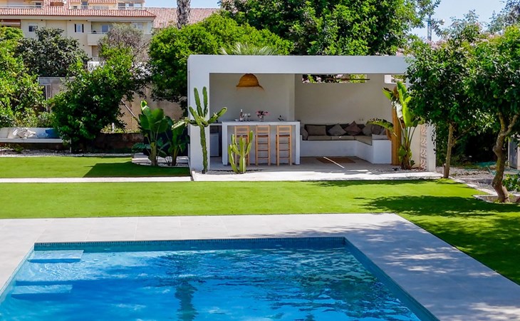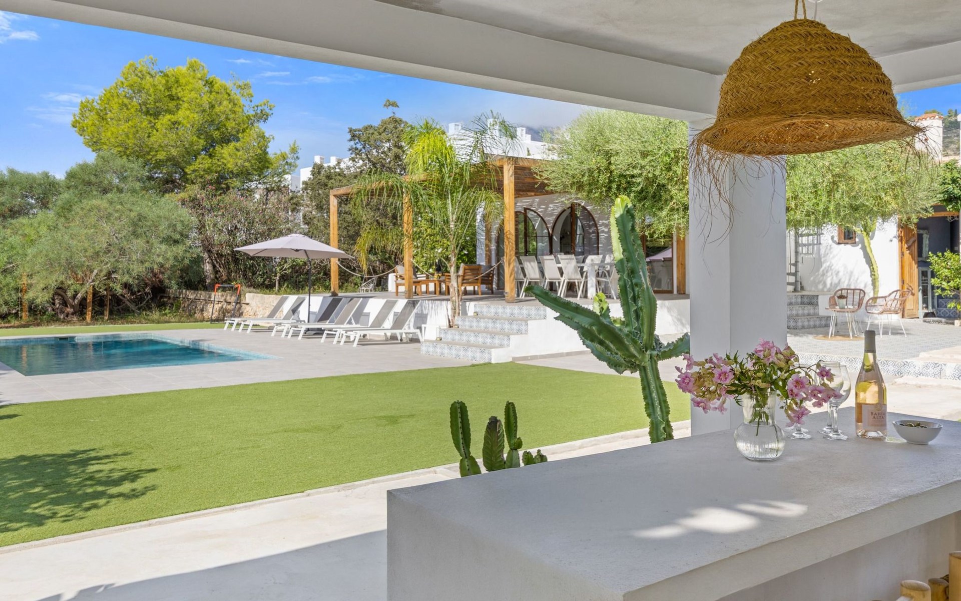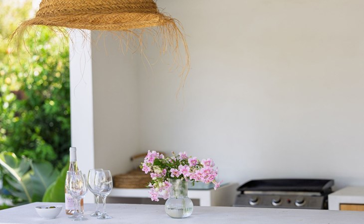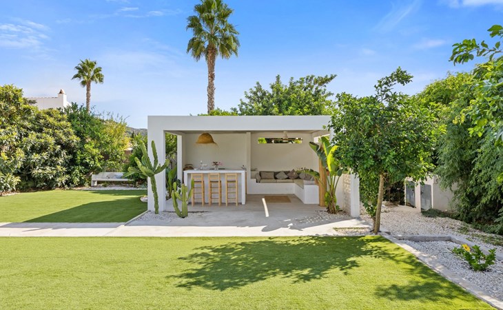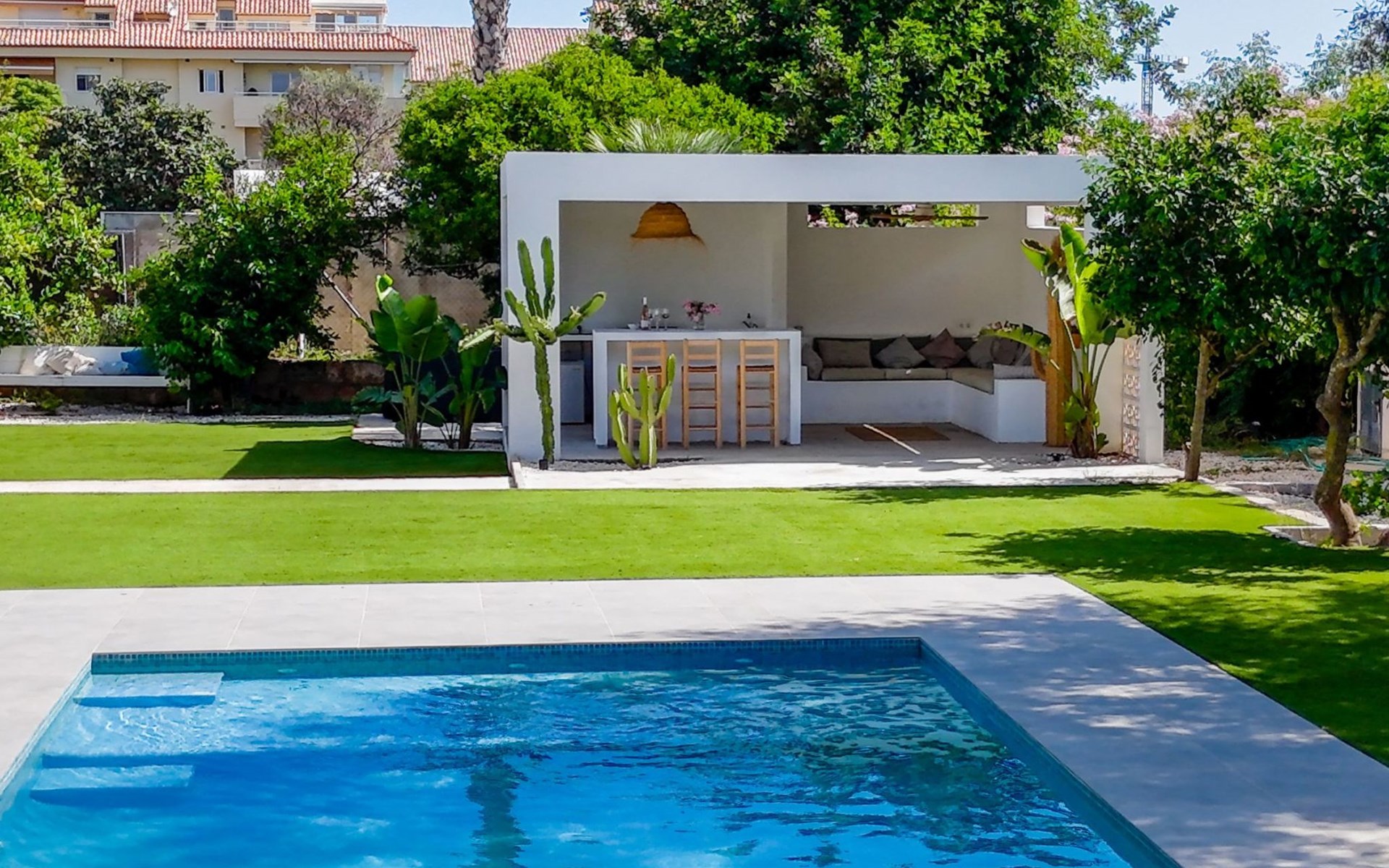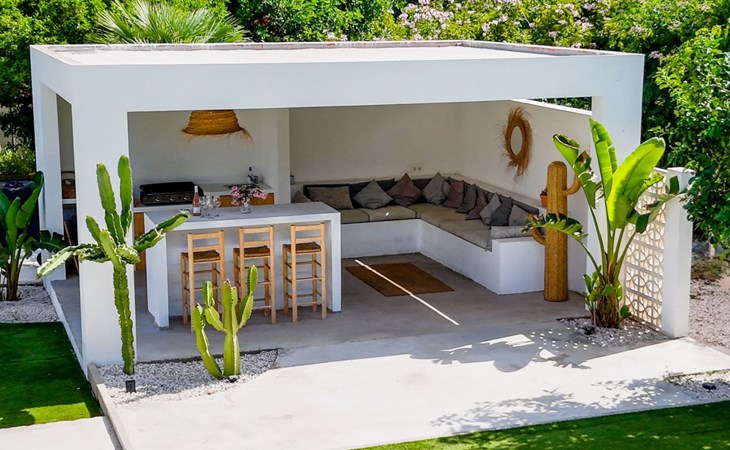 Unser Lieblingsmerkmal ist das Gartenhaus, das den Pool und den Garten überblickt und Schatten, Sitzgelegenheiten in der Lounge und an der Bar sowie eine Außenküche mit Grillplatz und Gasplancha bietet.