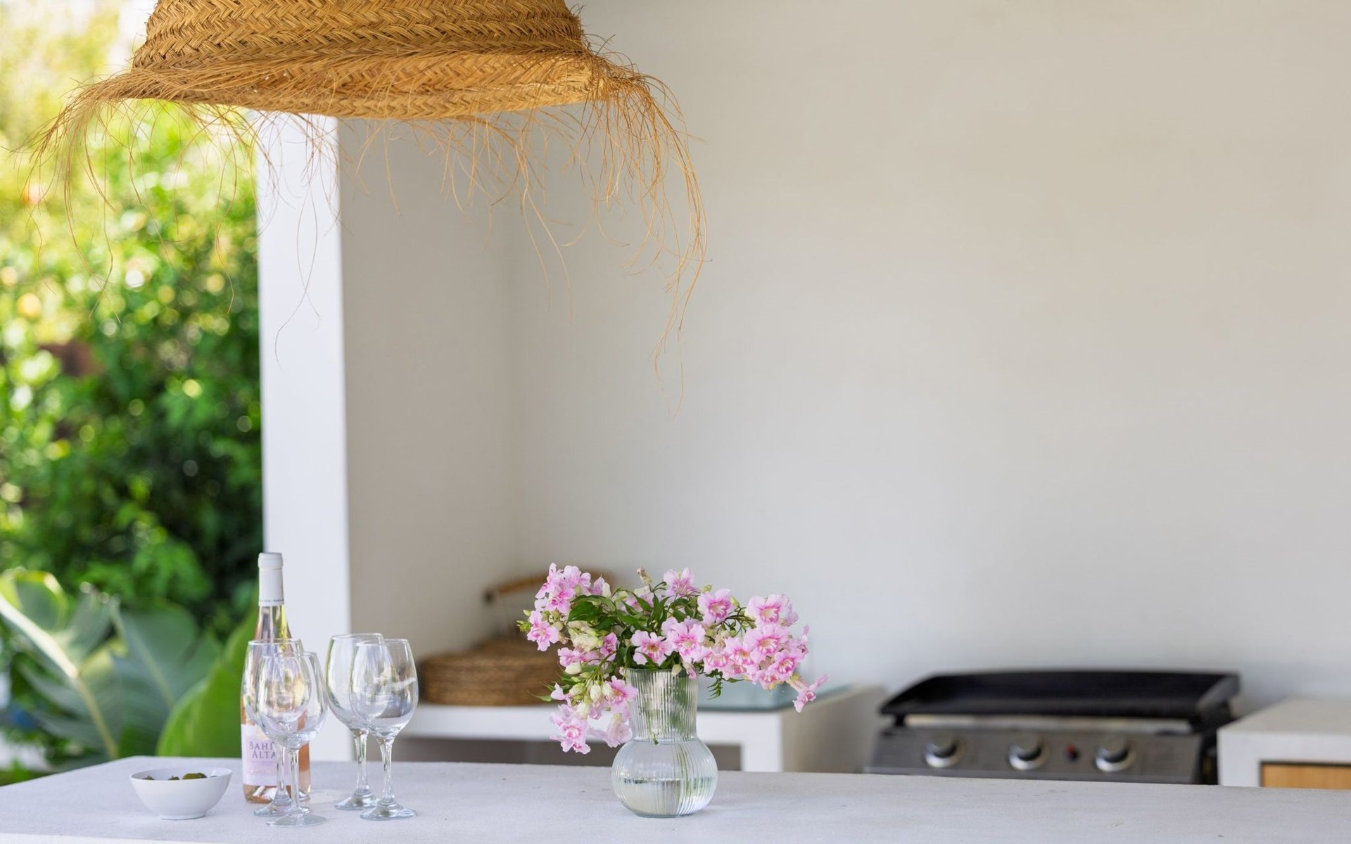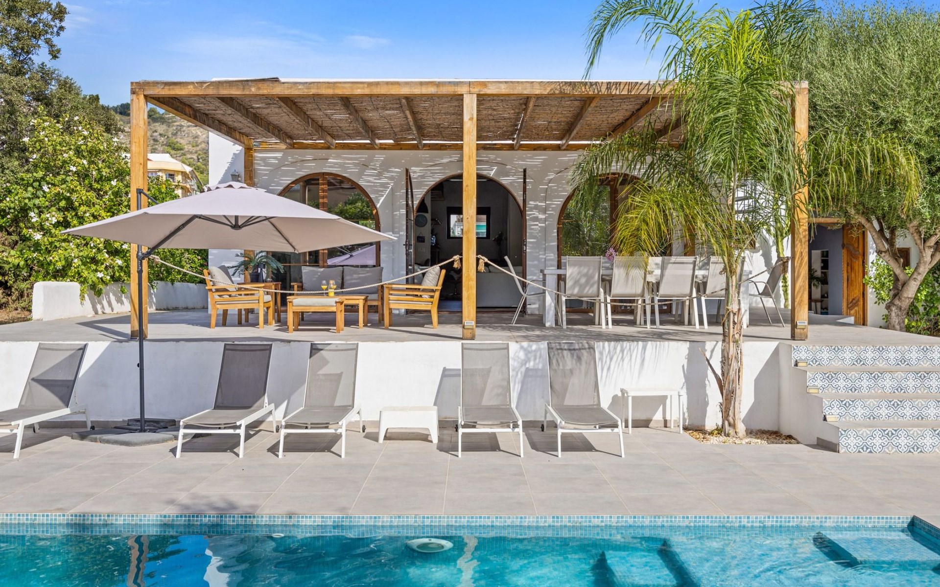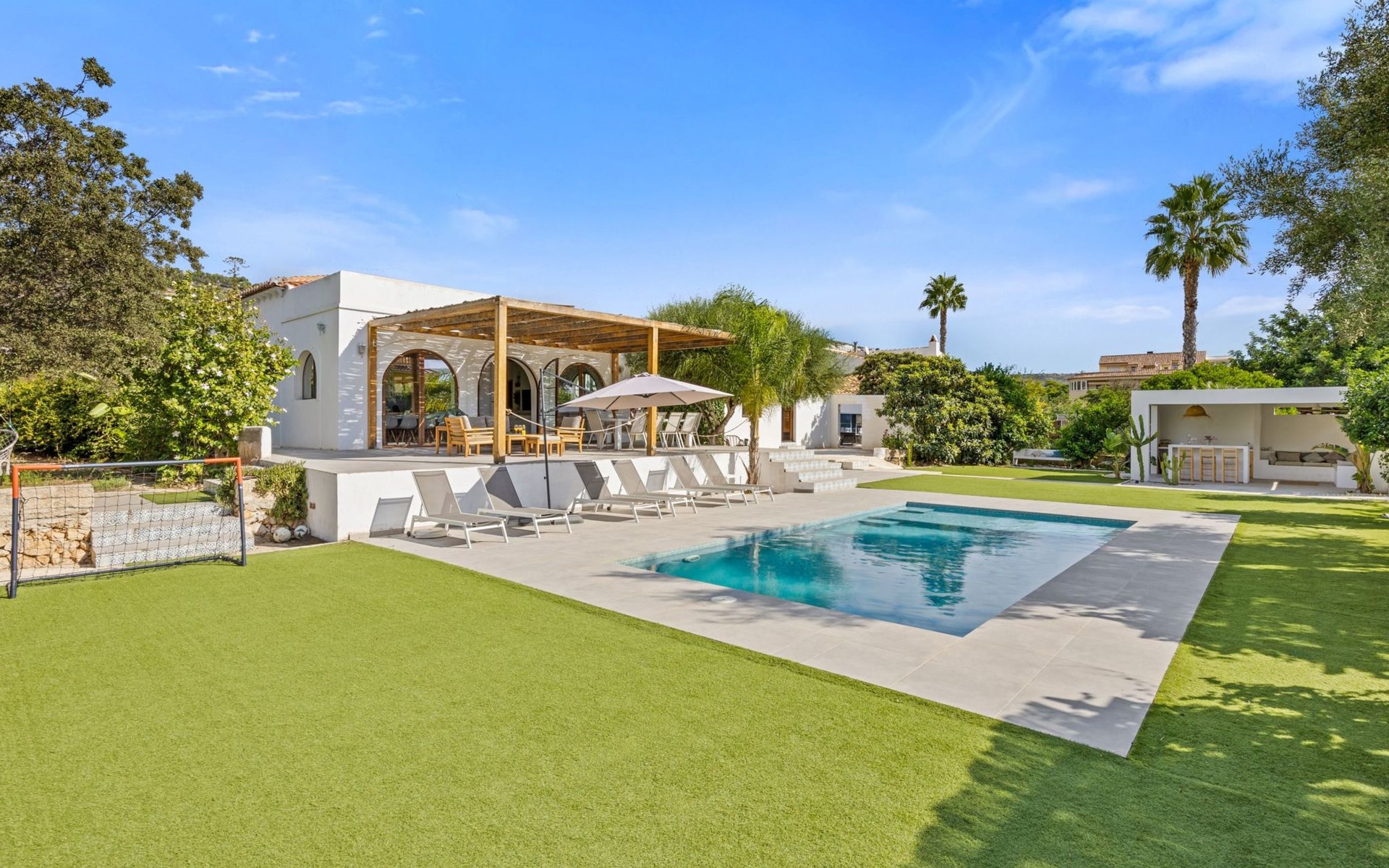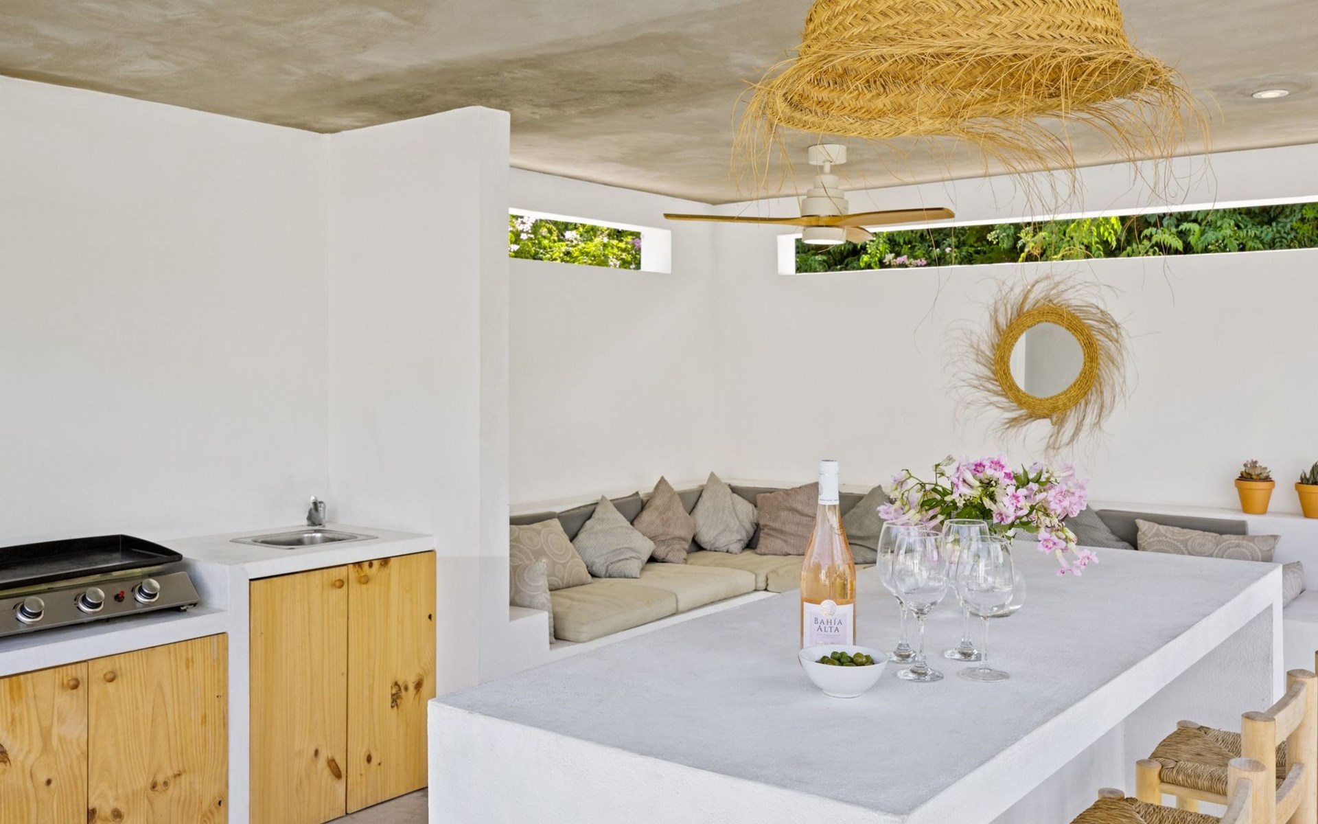 Unser Lieblingsmerkmal ist das Gartenhaus, das den Pool und den Garten überblickt und Schatten, Sitzgelegenheiten in der Lounge und an der Bar sowie eine Außenküche mit Grillplatz und Gasplancha bietet.