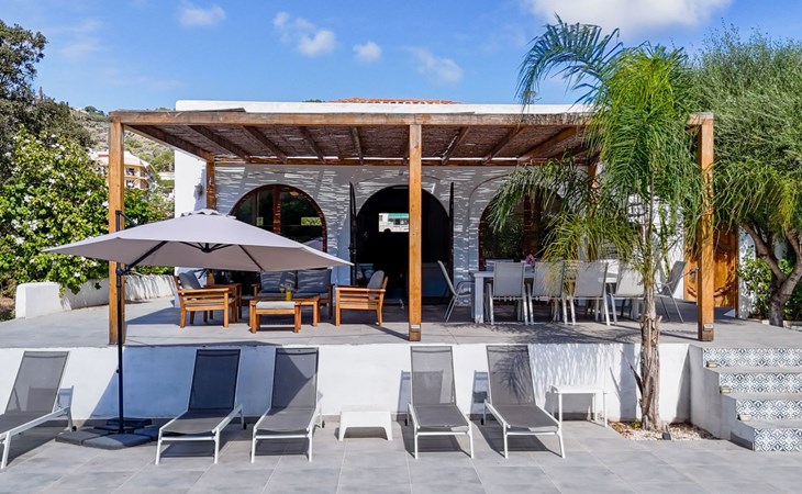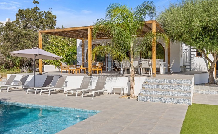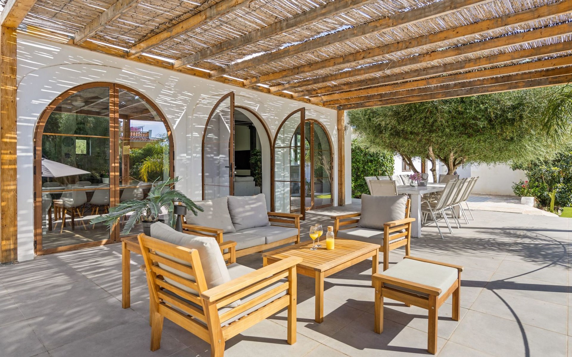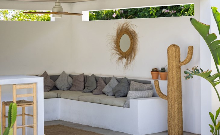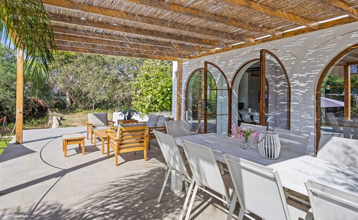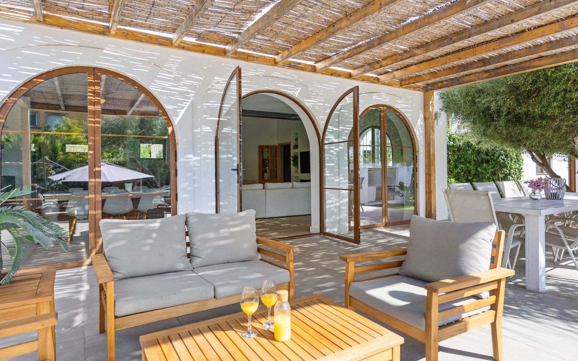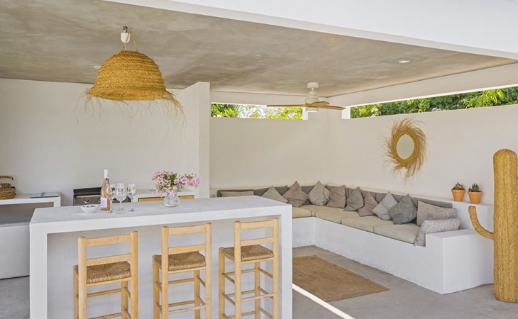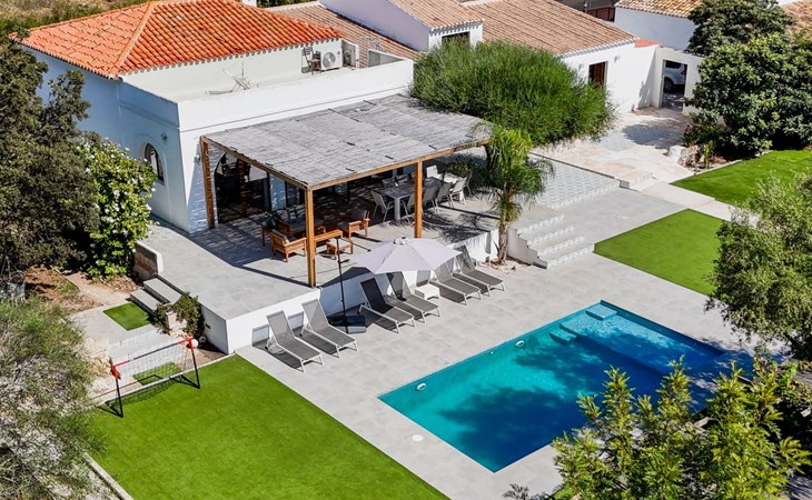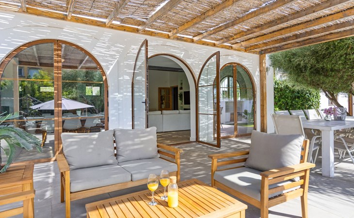 Die Villa verfügt über einen hellen und luftigen offenen Wohnbereich mit Küche, Esszimmer und Büro. Es gibt 6 Schlafzimmer, 3 x Doppelzimmer, 2 x Zweibettzimmer mit 2 x Einzelbetten in jedem und 1 x Einzelzimmer mit 1 x Einzelbett. Das Haus verfügt über zwei Bäder, eines mit Badewanne und Dusche, das andere mit begehbarer Dusche. Das Haus ist voll klimatisiert. Der Wohnbereich verfügt über Doppeltüren, die auf eine große schattige Naya mit Esstisch und Lounge-Sitzgelegenheiten öffnen und mit Blick auf den Pool und Garten.