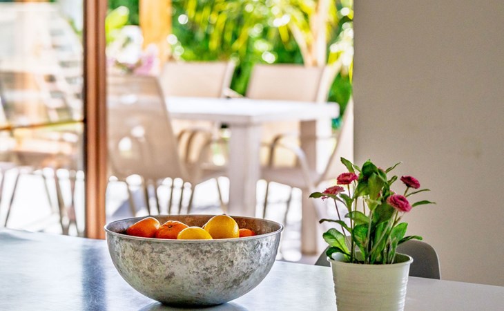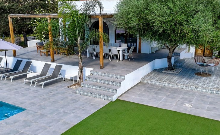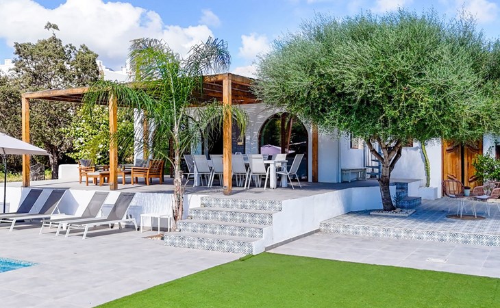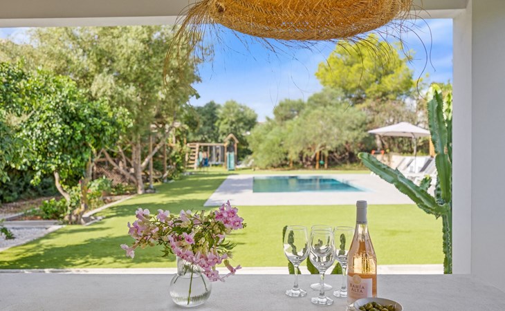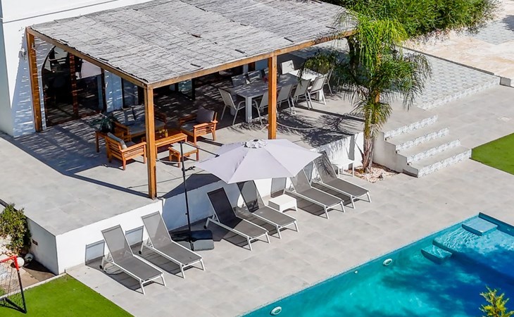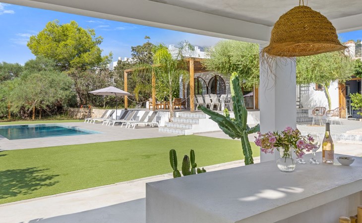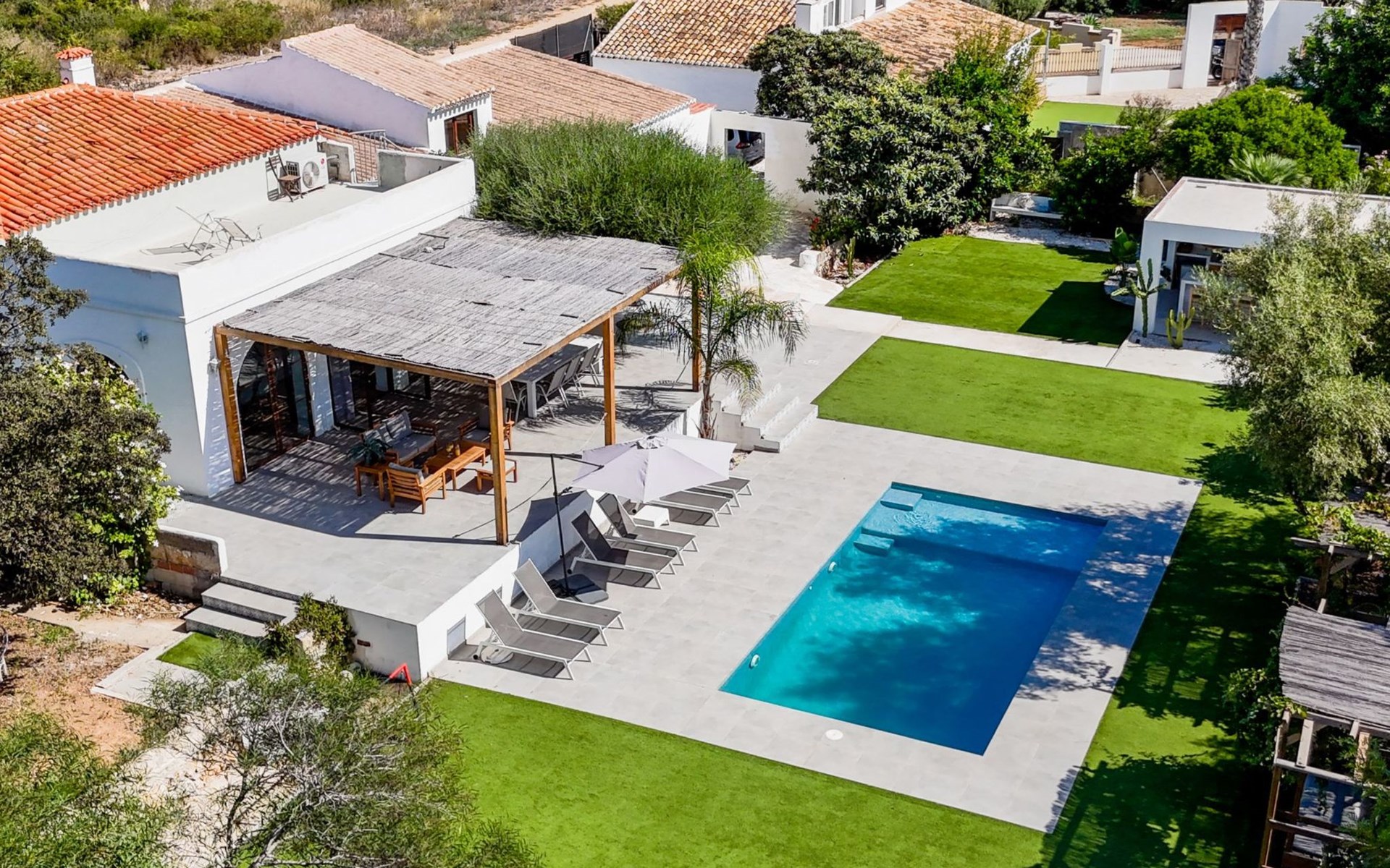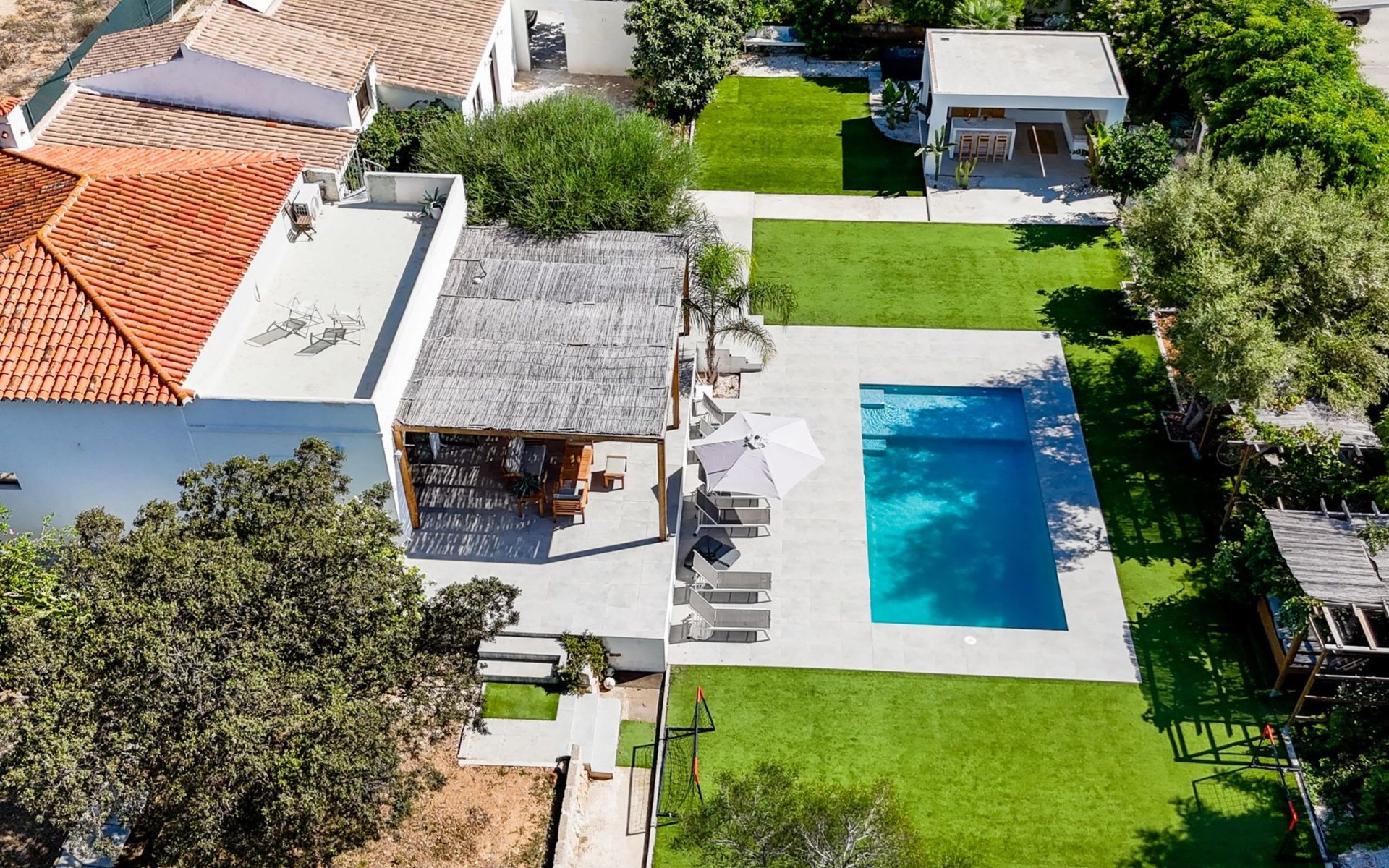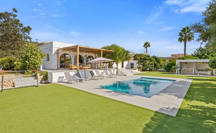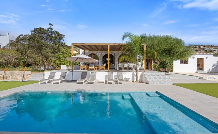 Die Villa verfügt über einen hellen und luftigen offenen Wohnbereich mit Küche, Esszimmer und Büro. Es gibt 6 Schlafzimmer, 3 x Doppelzimmer, 2 x Zweibettzimmer mit 2 x Einzelbetten in jedem und 1 x Einzelzimmer mit 1 x Einzelbett. Das Haus verfügt über zwei Bäder, eines mit Badewanne und Dusche, das andere mit begehbarer Dusche. Das Haus ist voll klimatisiert. Der Wohnbereich verfügt über Doppeltüren, die auf eine große schattige Naya mit Esstisch und Lounge-Sitzgelegenheiten öffnen und mit Blick auf den Pool und Garten.