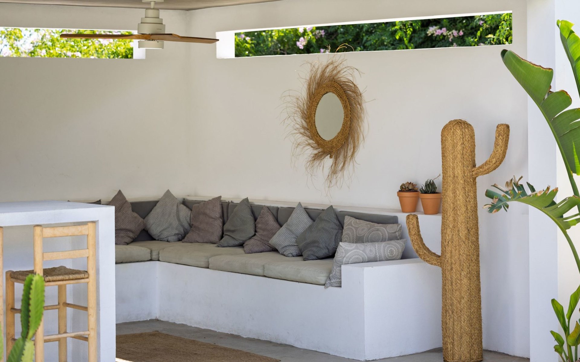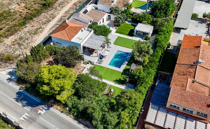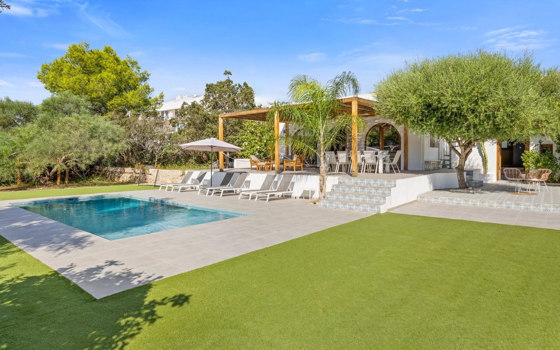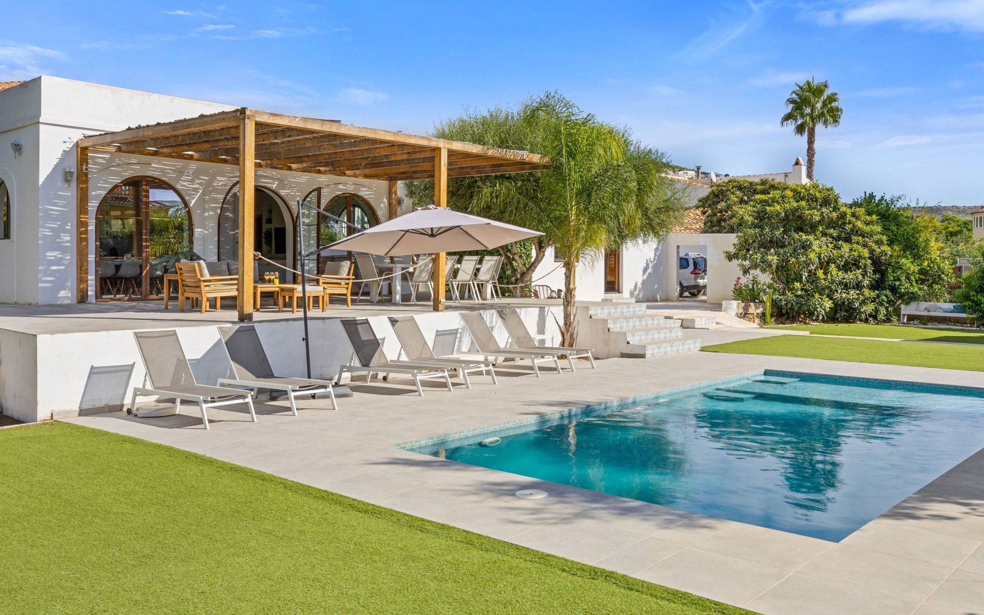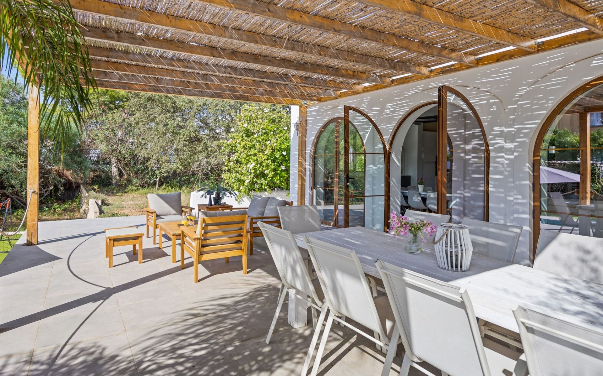 Die Villa verfügt über einen hellen und luftigen offenen Wohnbereich mit Küche, Esszimmer und Büro. Es gibt 6 Schlafzimmer, 3 x Doppelzimmer, 2 x Zweibettzimmer mit 2 x Einzelbetten in jedem und 1 x Einzelzimmer mit 1 x Einzelbett. Das Haus verfügt über zwei Bäder, eines mit Badewanne und Dusche, das andere mit begehbarer Dusche. Das Haus ist voll klimatisiert. Der Wohnbereich verfügt über Doppeltüren, die auf eine große schattige Naya mit Esstisch und Lounge-Sitzgelegenheiten öffnen und mit Blick auf den Pool und Garten.