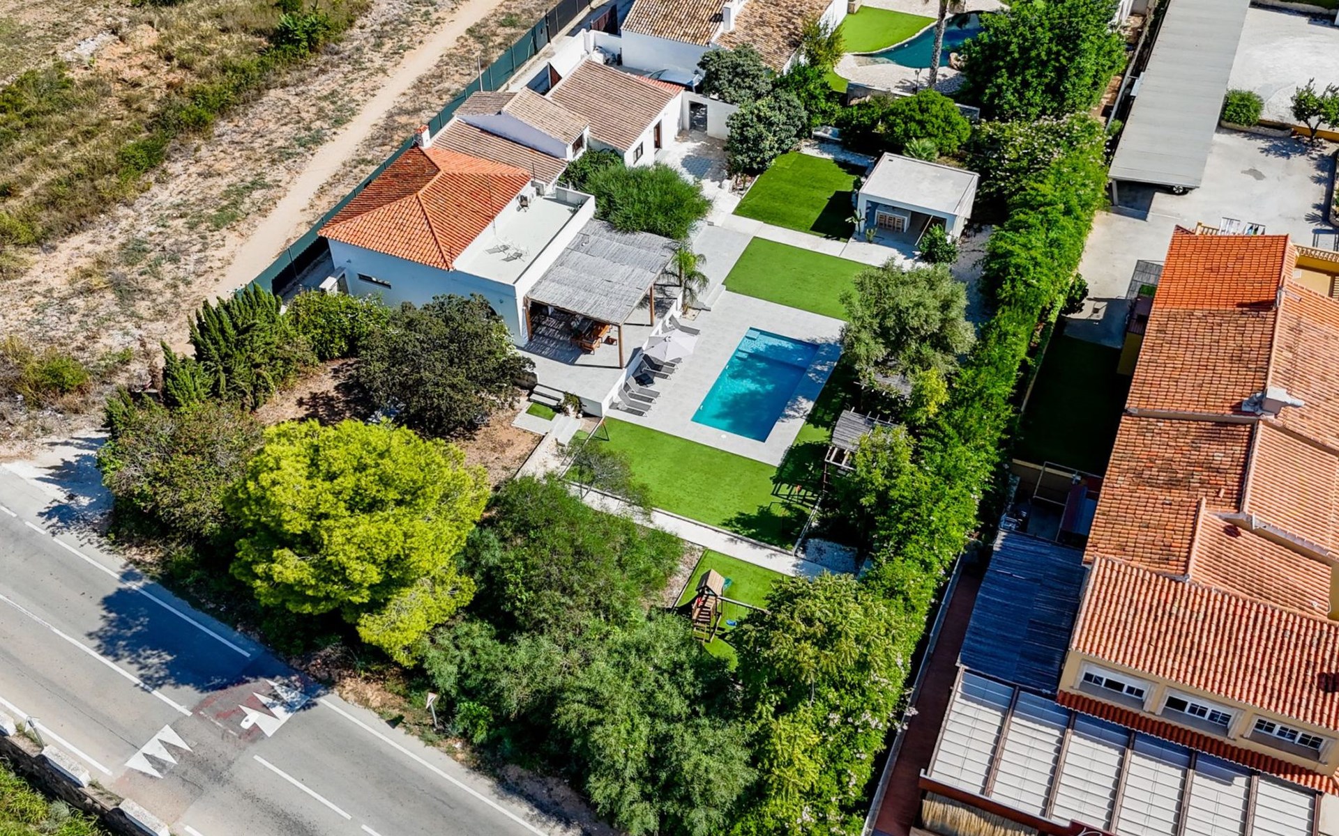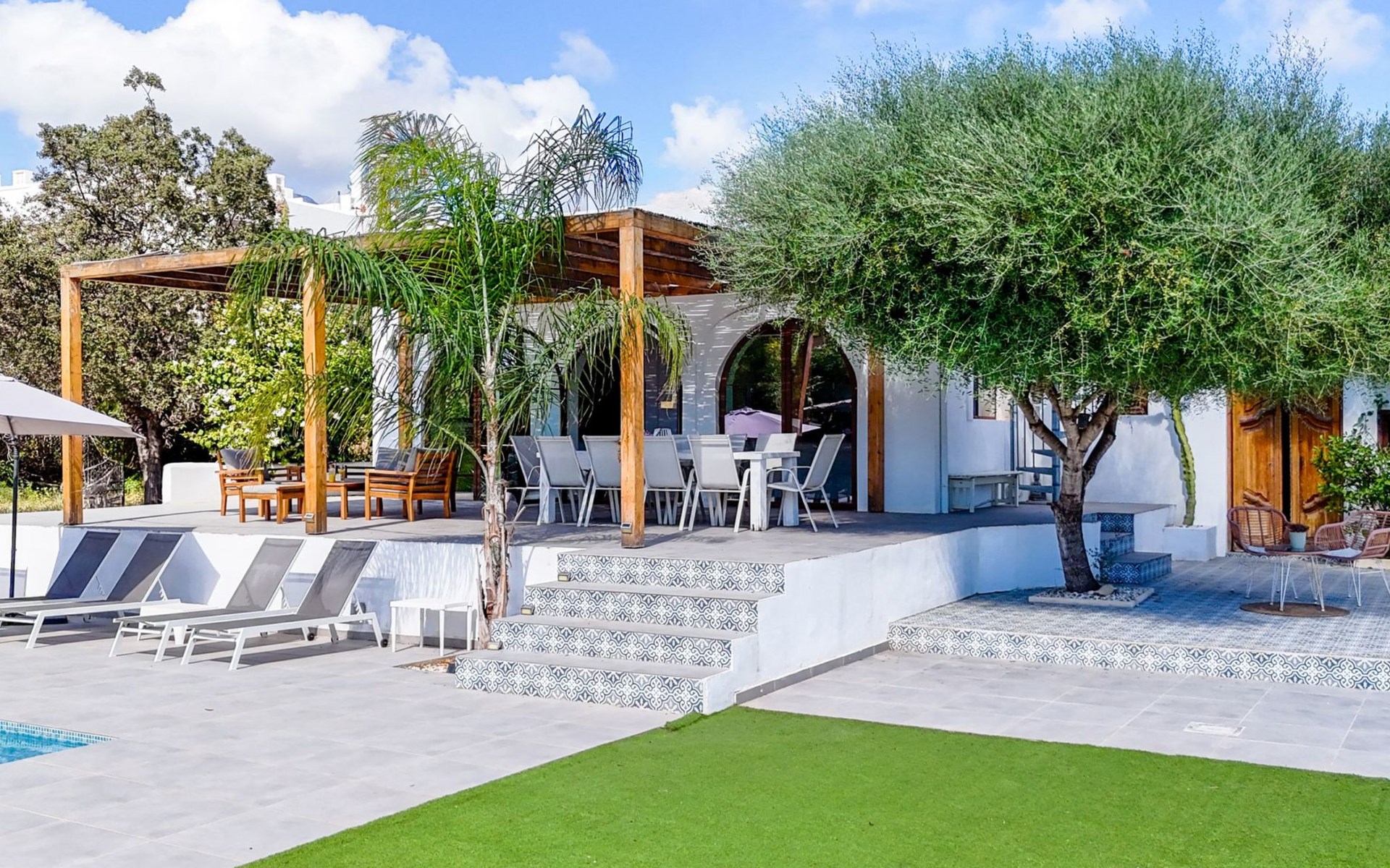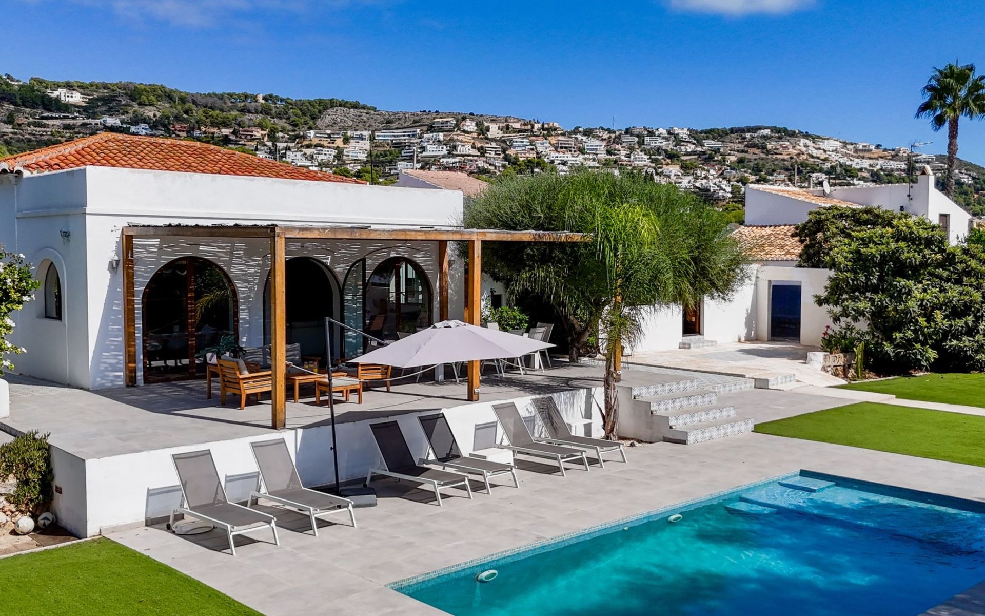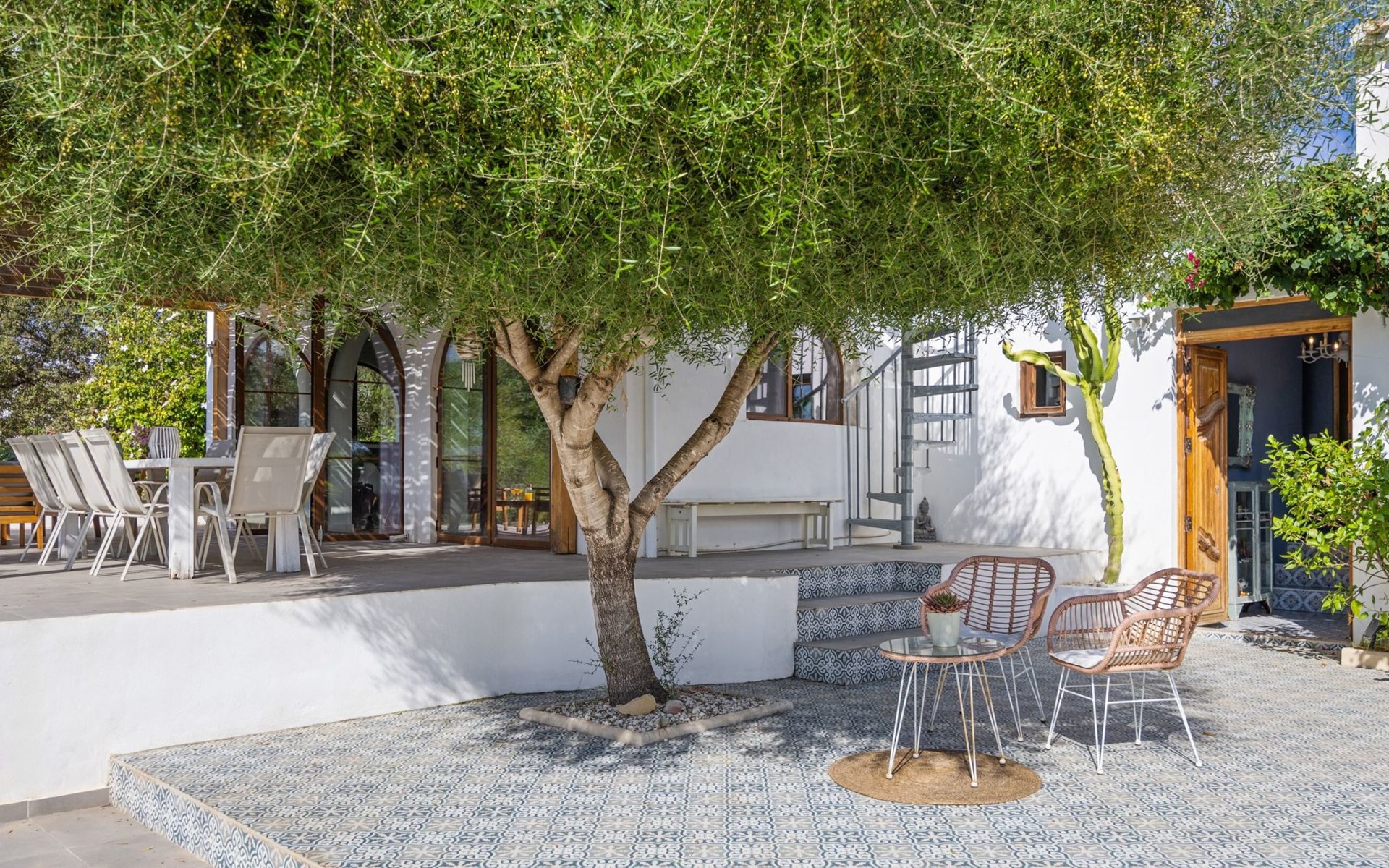 Die Villa verfügt über einen hellen und luftigen offenen Wohnbereich mit Küche, Esszimmer und Büro. Es gibt 6 Schlafzimmer, 3 x Doppelzimmer, 2 x Zweibettzimmer mit 2 x Einzelbetten in jedem und 1 x Einzelzimmer mit 1 x Einzelbett. Das Haus verfügt über zwei Bäder, eines mit Badewanne und Dusche, das andere mit begehbarer Dusche. Das Haus ist voll klimatisiert. Der Wohnbereich verfügt über Doppeltüren, die auf eine große schattige Naya mit Esstisch und Lounge-Sitzgelegenheiten öffnen und mit Blick auf den Pool und Garten.