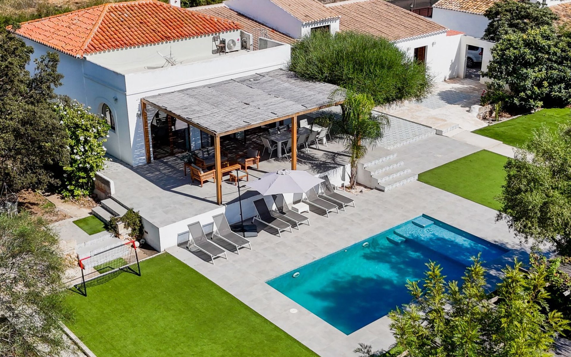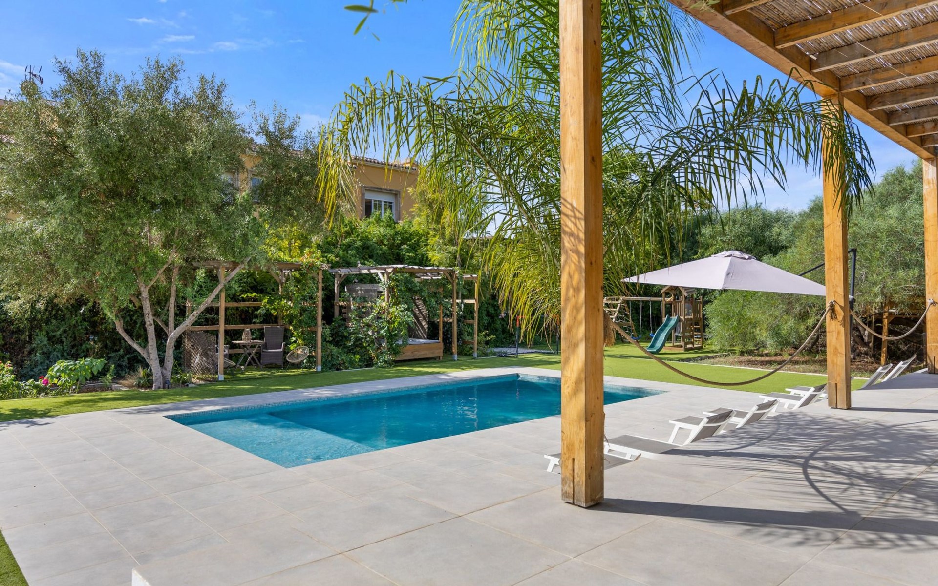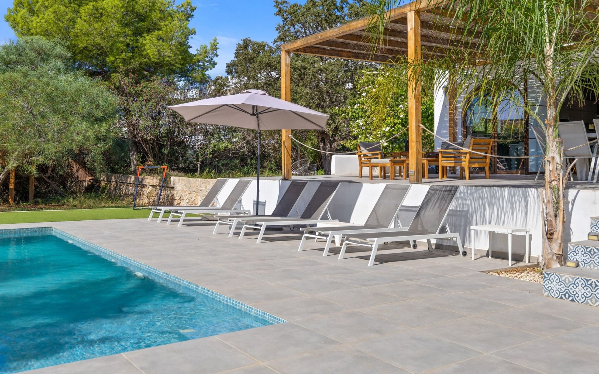 Der Pool ist ideal für die Kleinen, da er über eine große, flache Plattform verfügt, die zum Planschen einlädt. Es gibt viele Sitzgelegenheiten im Freien, 6 Sonnenliegen, Schaukelstühle und ein schattiges Tagesbett. Es gibt auch eine Außendusche. Wir haben auch einen Holzspielplatz mit Schaukeln und Rutsche, Fußballtore und ein Baumhaus, um die Kinder zu unterhalten.