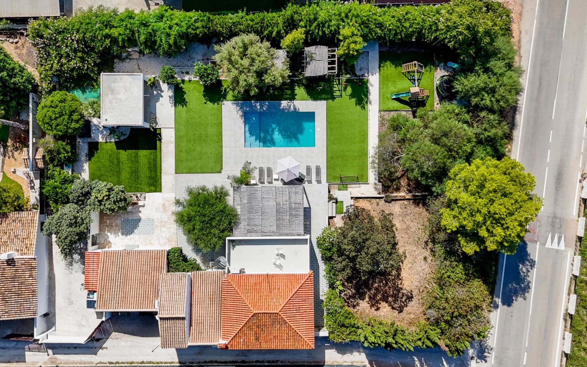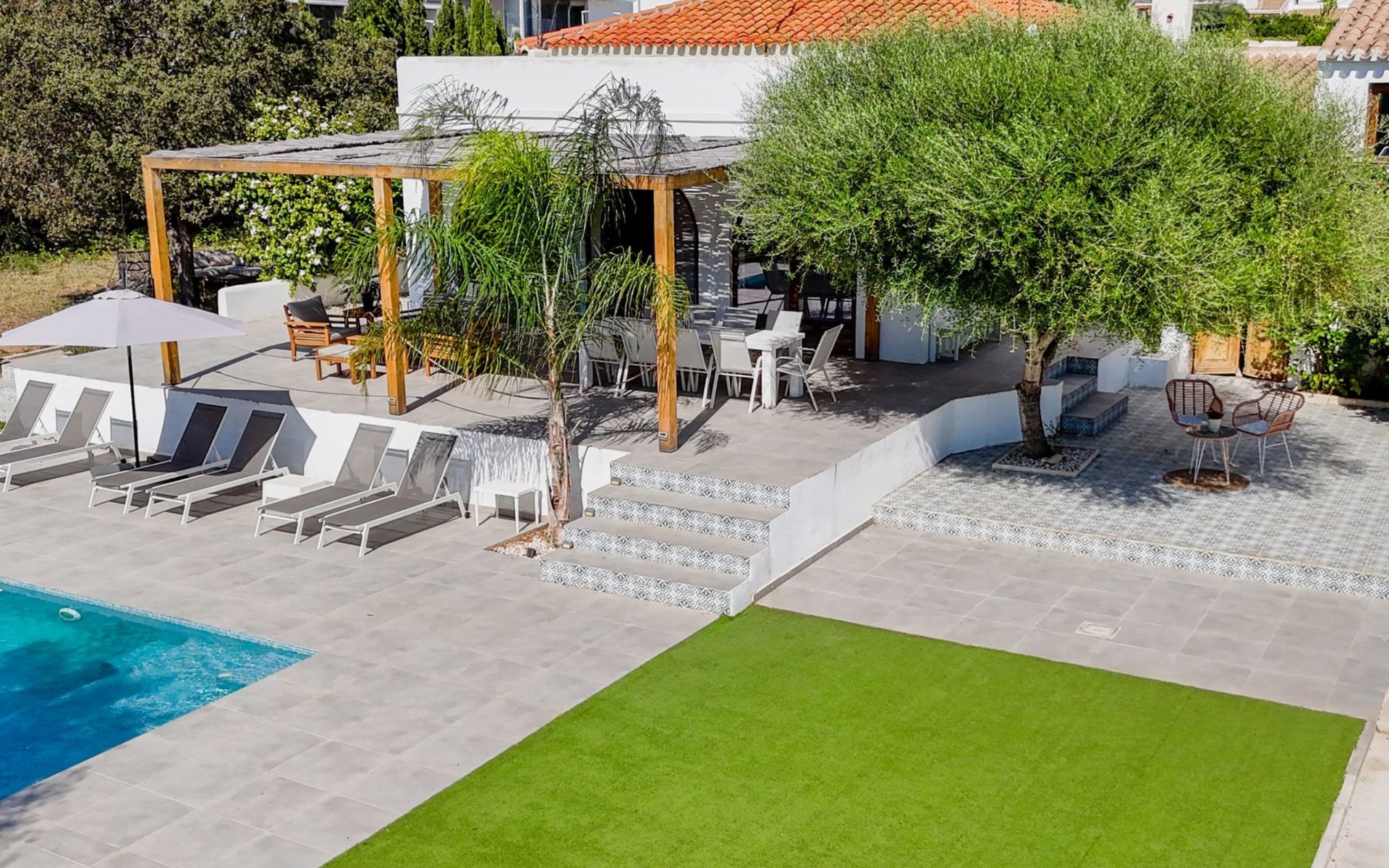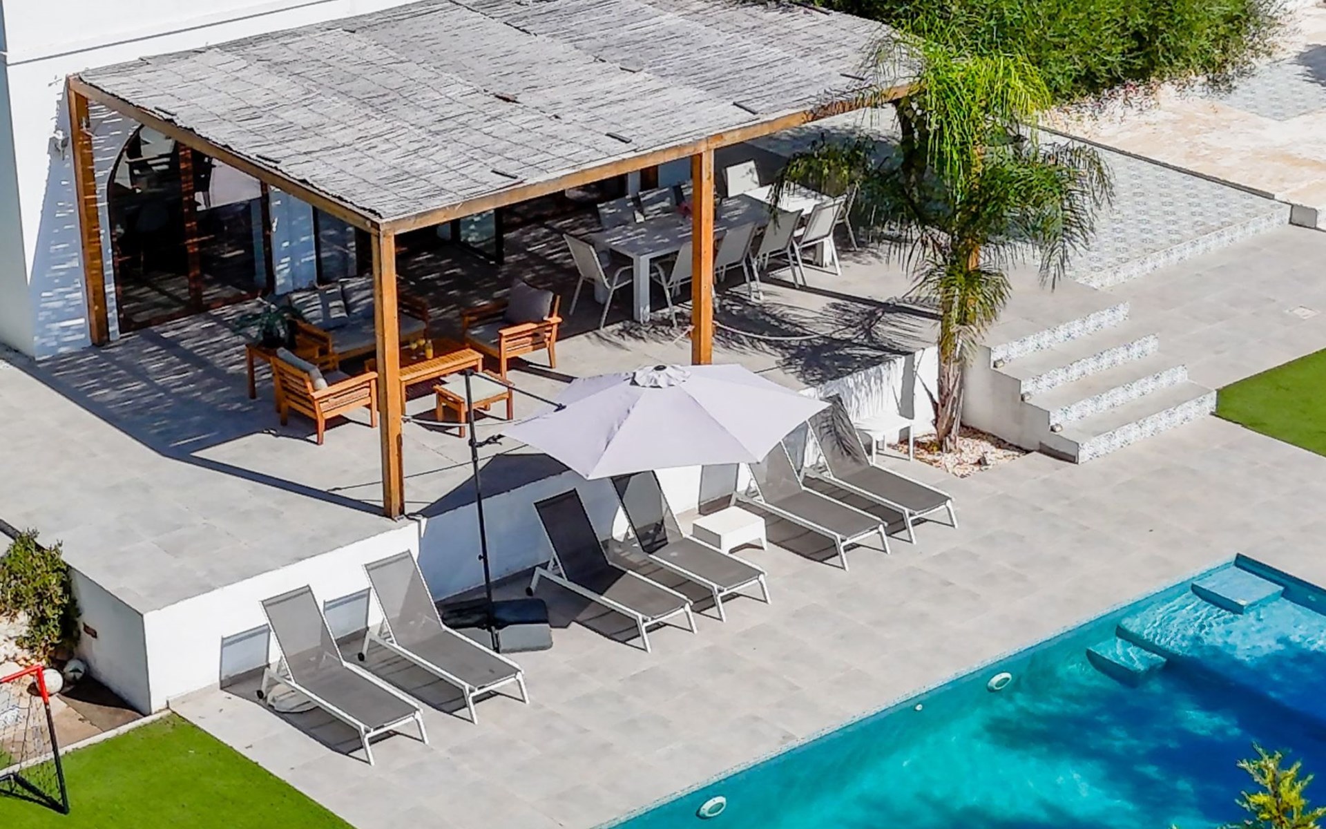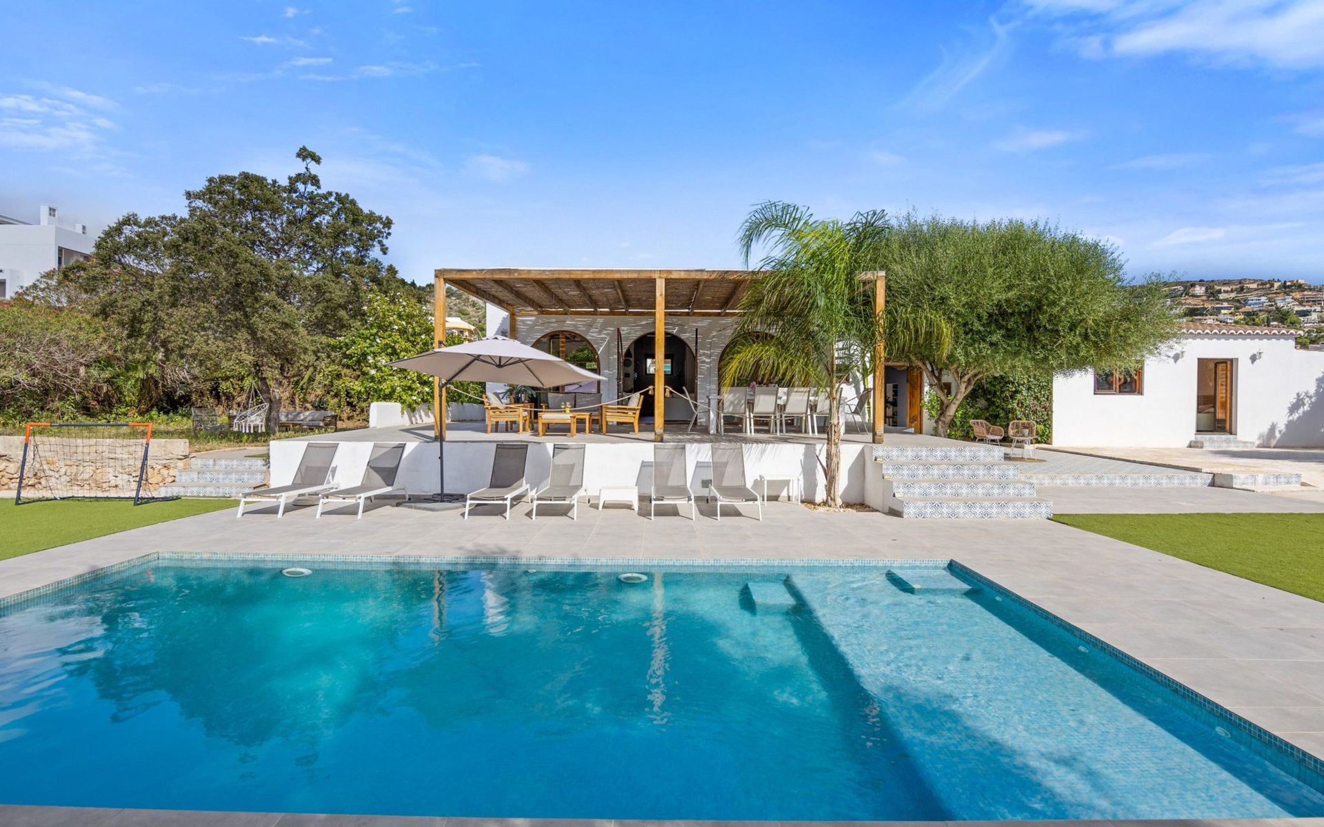 Der Pool ist ideal für die Kleinen, da er über eine große, flache Plattform verfügt, die zum Planschen einlädt. Es gibt viele Sitzgelegenheiten im Freien, 6 Sonnenliegen, Schaukelstühle und ein schattiges Tagesbett. Es gibt auch eine Außendusche. Wir haben auch einen Holzspielplatz mit Schaukeln und Rutsche, Fußballtore und ein Baumhaus, um die Kinder zu unterhalten.
