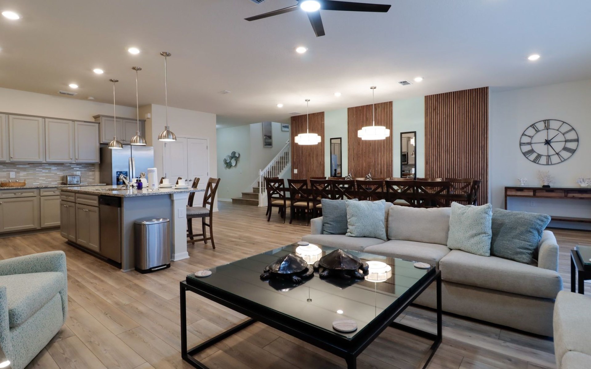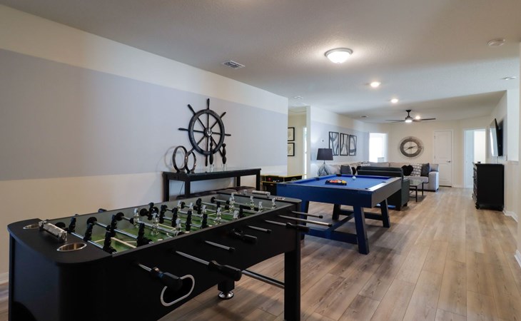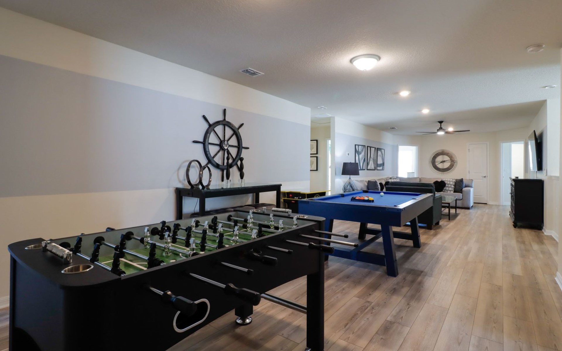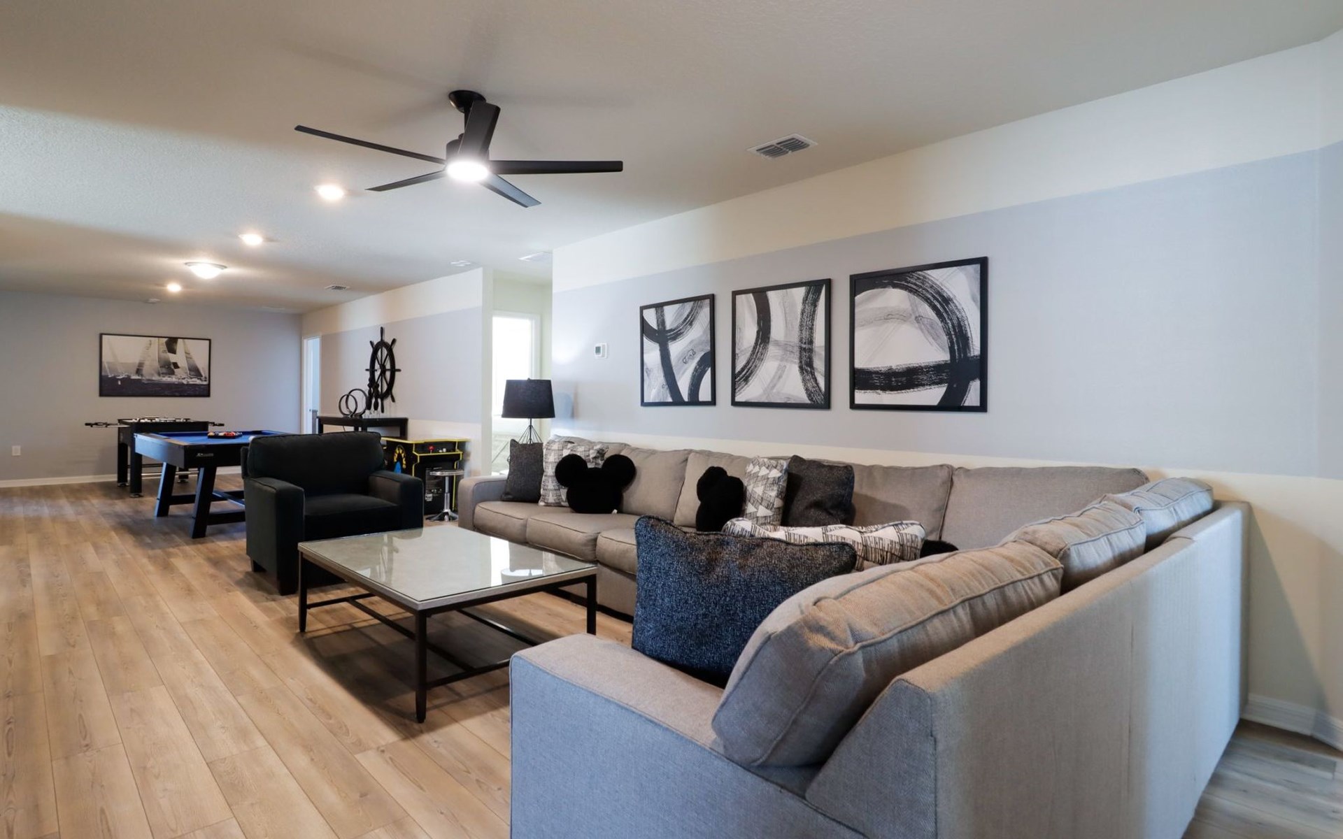 Treten Sie ein in dieses weitläufige, vollständig modernisierte Haus mit 10 Schlafzimmern, das mühelos große Gruppen oder Familien beherbergen kann. Das offene Konzept im Hauptgeschoss sorgt dafür, dass alle bequem zusammenkommen können, und bietet zwei getrennte Wohnbereiche, ein Spielzimmer und einen großen Poolbereich - hier's never a dull moment here. The welcoming family room, adjacent to the kitchen, features a sizeable sectional, a flat-screen TV, and direct access to the pool deck. Upstairs, another living area provides additional space to unwind with its own large sectional, flat-screen TV, and an open layout that leads into the games room, making it an ideal spot for entertainment or relaxation.