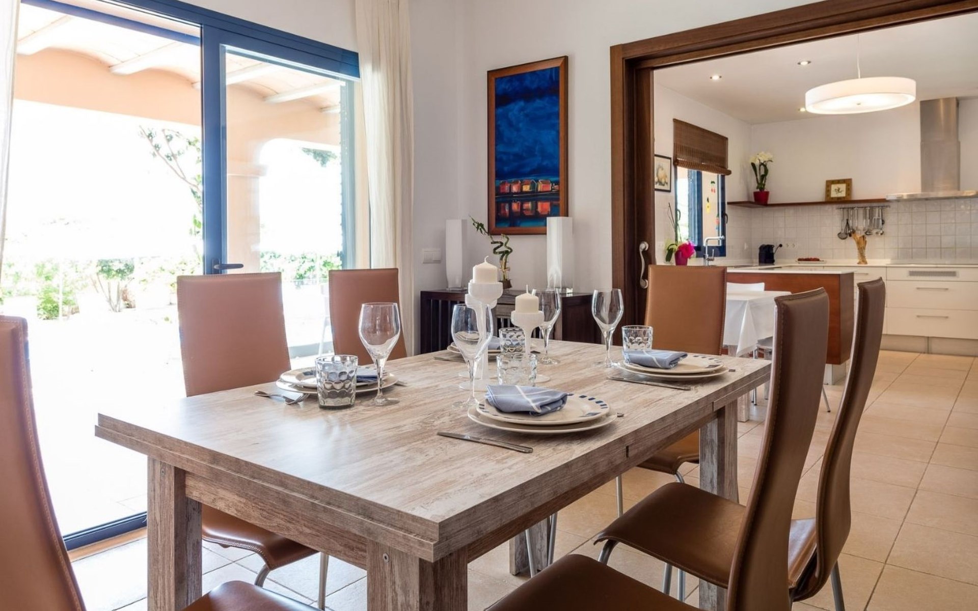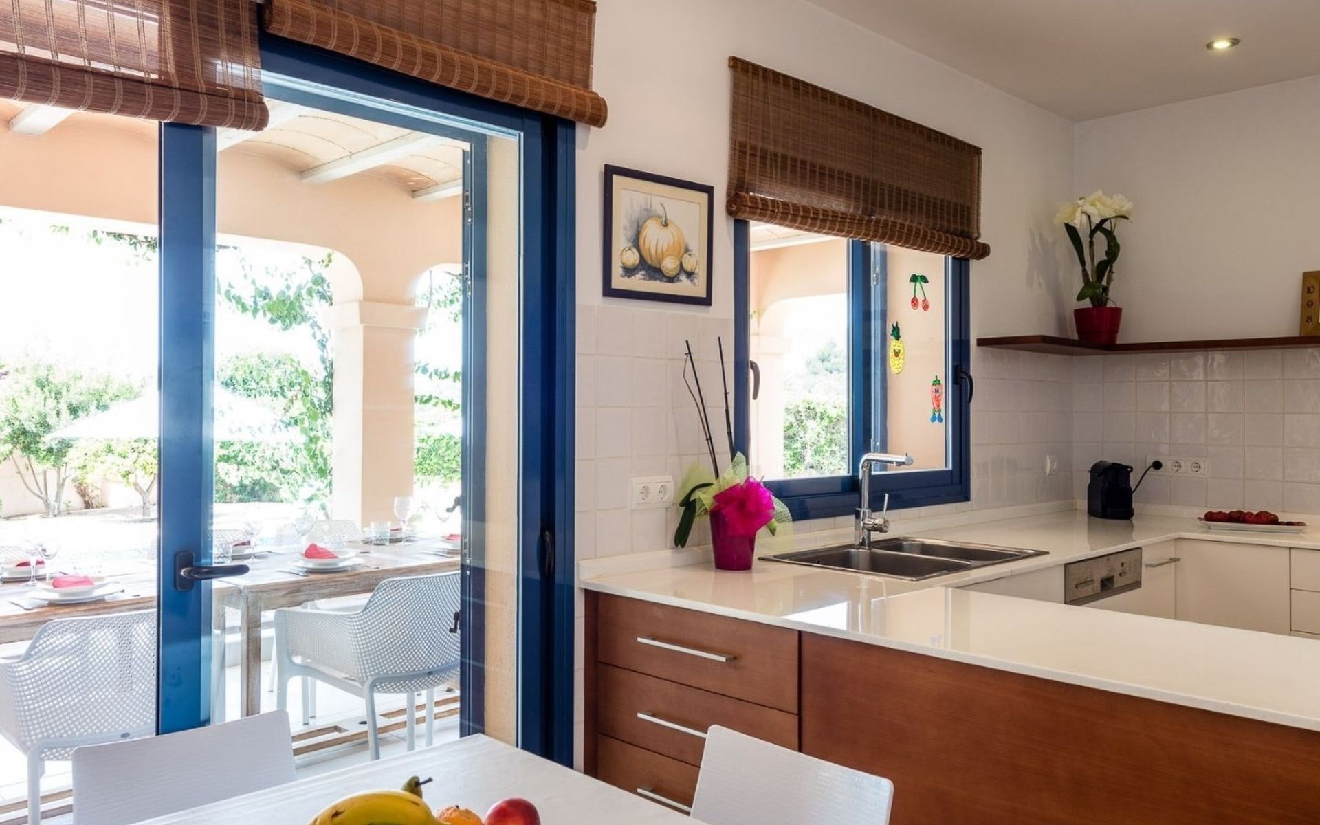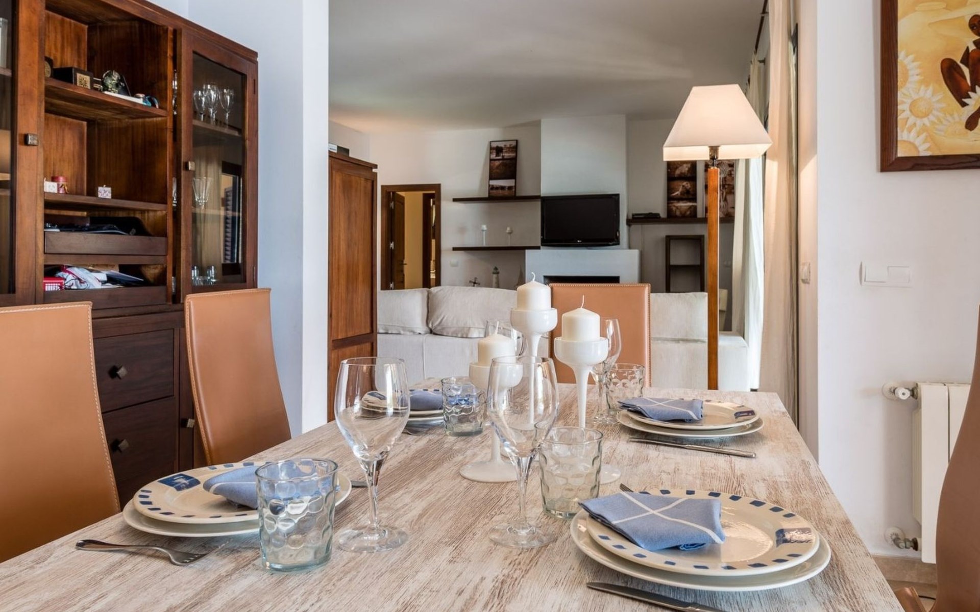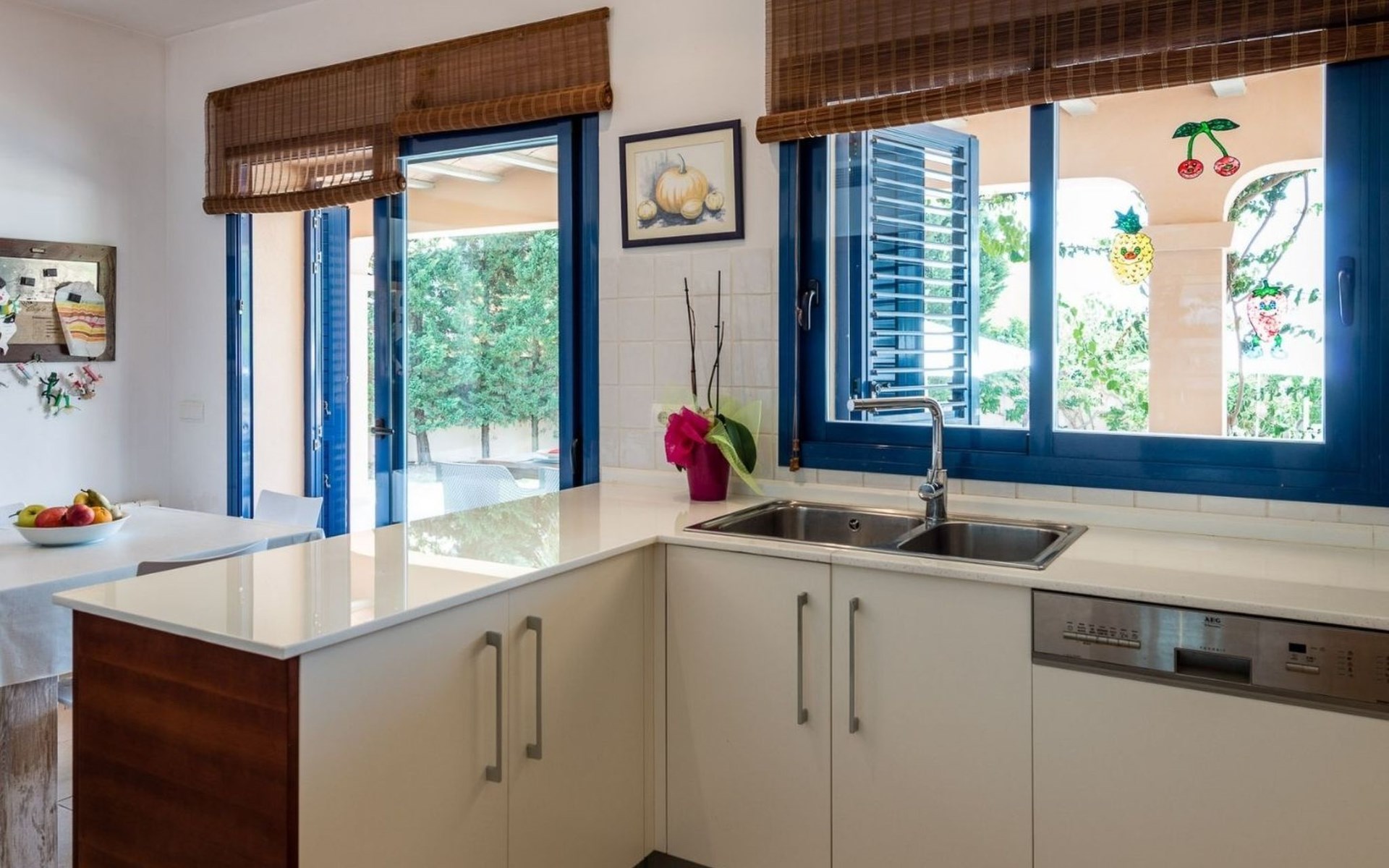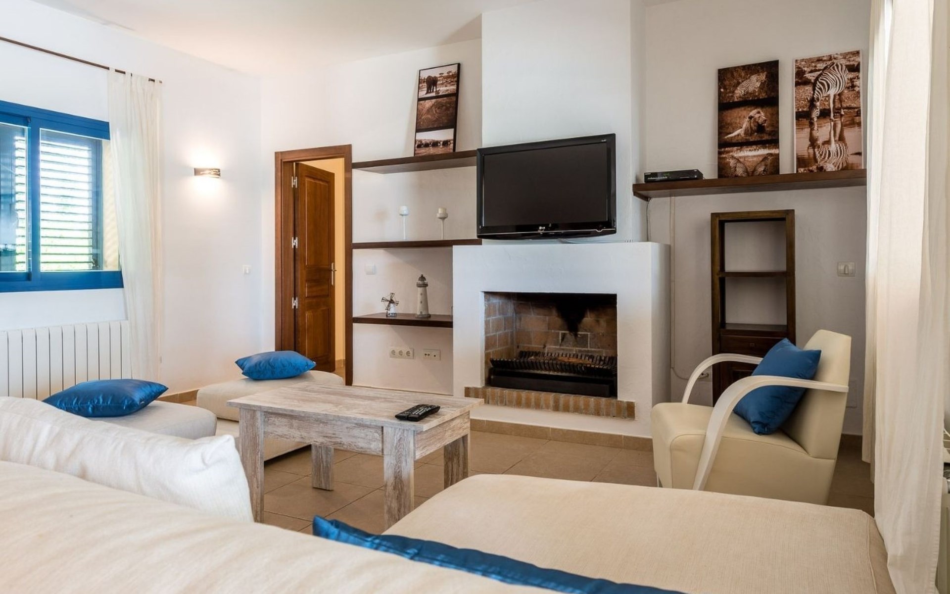 Das Innere der Villa ist gemütlich und raffiniert eingerichtet, so dass Sie sich sofort wie zu Hause fühlen werden. Das Wohnzimmer ist geräumig und komfortabel, mit weißen Sofas, die einen schönen Kontrast zu den großen blauen Fenstern bilden, die typisch für die Gegend sind, und einem Tisch aus Naturholz, der dem Ambiente einen Hauch von Klasse verleiht. Die fünf Schlafzimmer können bis zu 10 Personen beherbergen und sind individuell und geschmackvoll eingerichtet, inspiriert von den besten Einrichtungspublikationen. Drei Badezimmer, die mit allem Komfort ausgestattet sind, präsentieren einen rustikalen Stil, der sich harmonisch in die klassische Architektur der Villa einfügt.