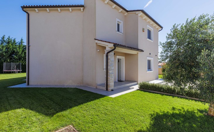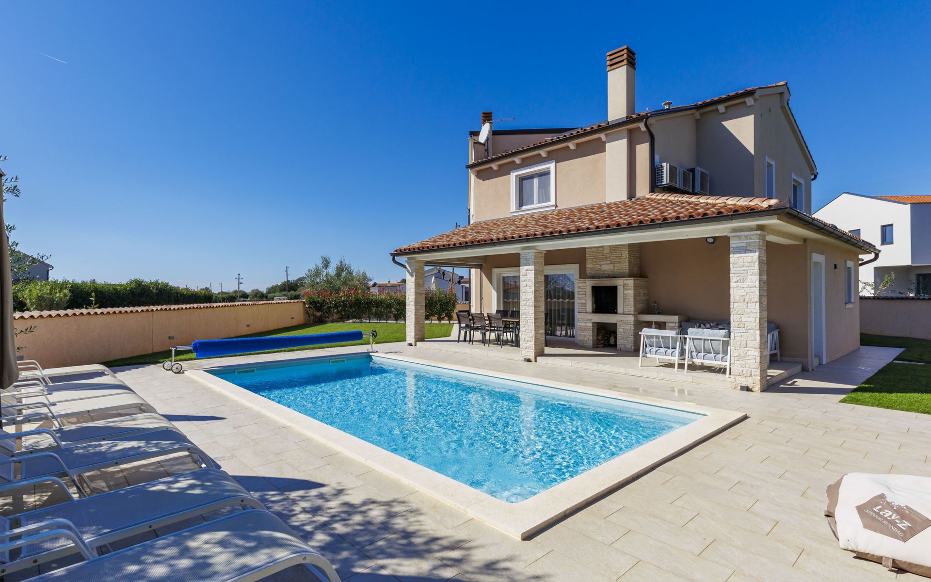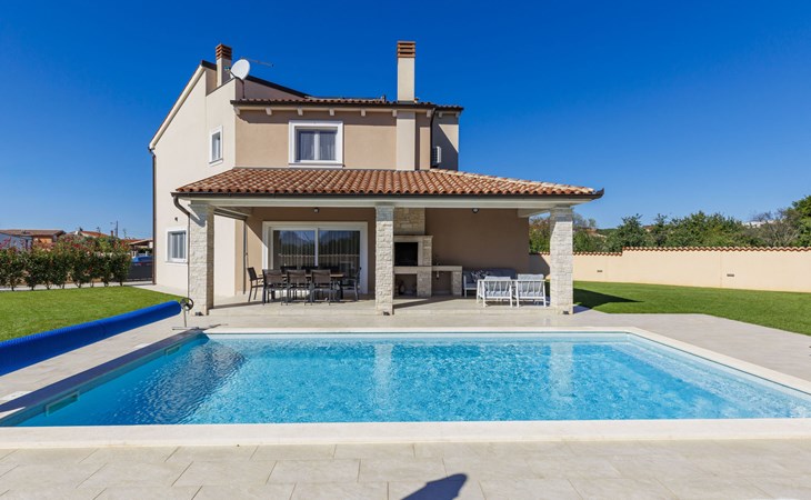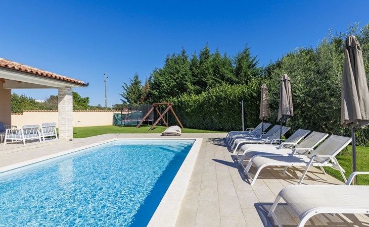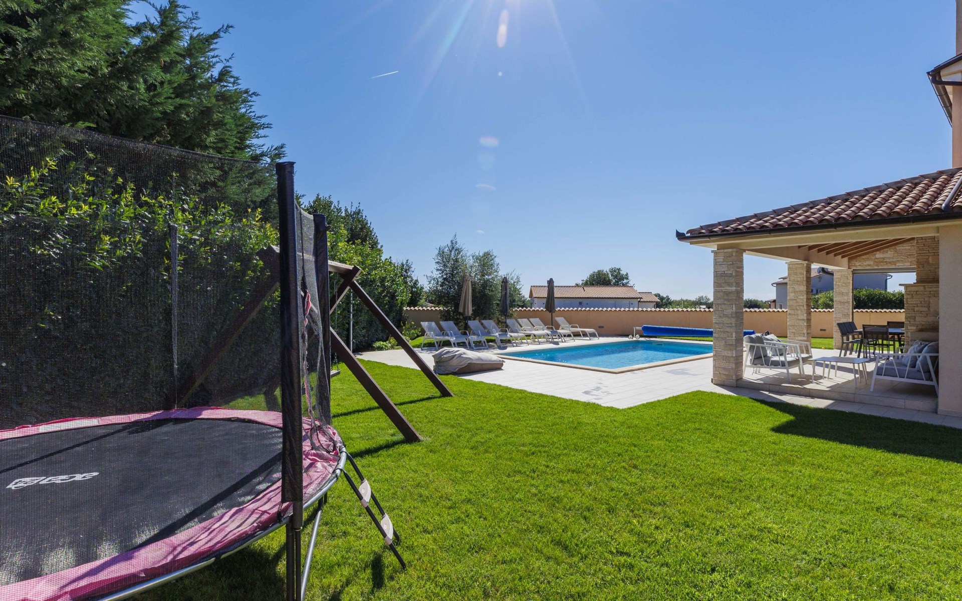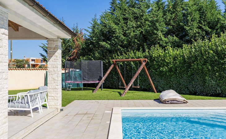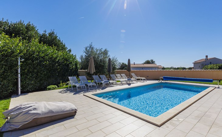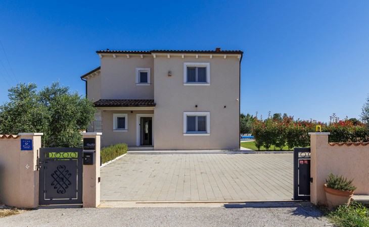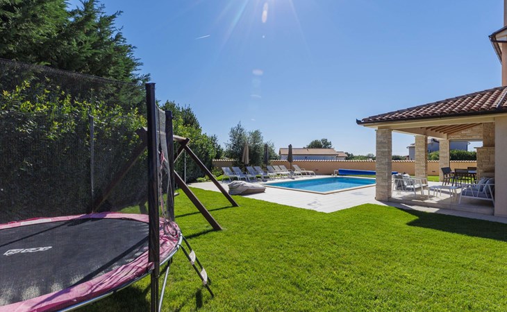 Villa "Magica", auf 2 Stockwerken. Im Weiler Loborika, 6 km vom Zentrum von Pula, 6 km vom Zentrum von Marčana, ruhige, sonnige Lage, 8 km vom Meer. Zur Alleinbenutzung: Grundstück 1'200 m2 (eingezäunt), Garten mit Pflanzen und Blumen, Schwimmbad eckig, beheizt (8 x 4 m, 140 cm tief, saisonale Verfügbarkeit: 01.Apr. - 01.Nov.) mit Innentreppe. Aussendusche, Terrasse (30 m2), Gartenmöbel, Grill, Kinderspielplatz (Schaukel), Poolpflege durch den Besitzer/Gärtner. Im Hause: Internetzugang, Trampolin, Waschmaschine. Parkplatz (für 4 Autos) beim Haus auf dem Grundstück. Einkaufsgeschäft 2.3 km, Supermarkt 6 km, Restaurant 2 km, Café 2.3 km, Bushaltestelle 2.3 km, Sandstrand 16 km, Kieselstrand 13 km. Tennis 15 km, Reitstall 5 km, Wanderwege ab Haus 100 m, Radweg 150 m. Nahe gelegene Sehenswürdigkeiten: Amphitheater 8 km, National park Brijuni 14 km, Nature park Rt. Kamenjak 18 km.