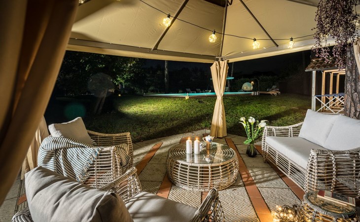 OUTSIDE Im Außenbereich können Sie auf den Wegen im Grünen spazieren gehen und so kleine private Ecken erreichen. Auf der rechten Seite des Hauses haben Sie Zugang zu einem großen, eingezäunten Park, in dem sich ein schönes Schwimmbad mit Liegestühlen, Schaukelstühlen und einem Pavillon mit Lounge befindet. 3 hölzerne "Kabinen" beherbergen die Umkleidekabine und die Dusche. In der Nähe gibt es einen kleinen Basketballplatz und eine Tischtennisplatte.