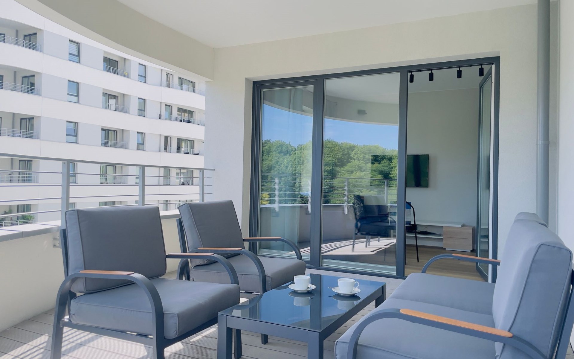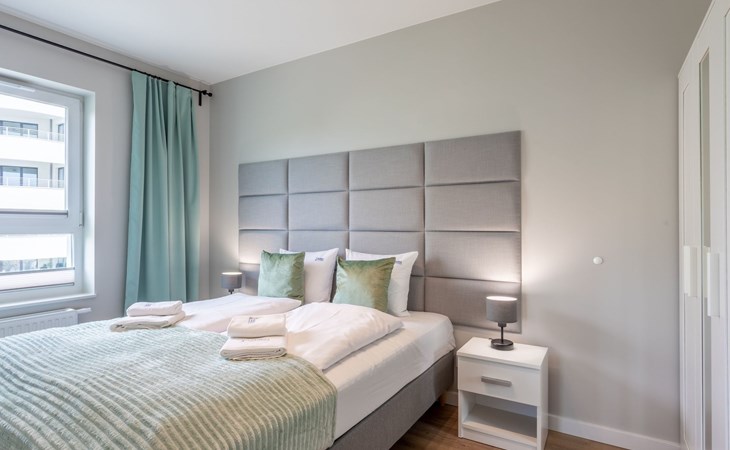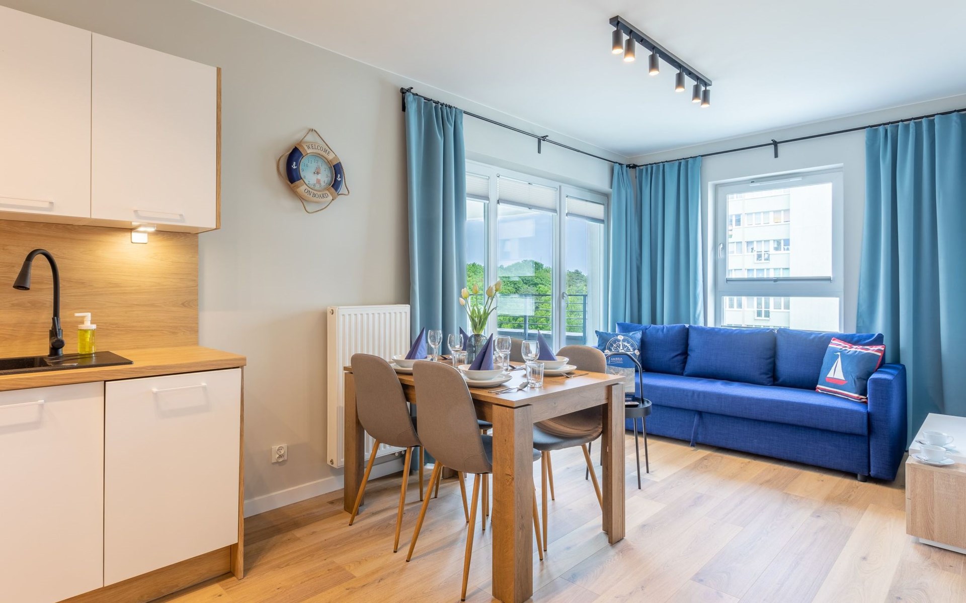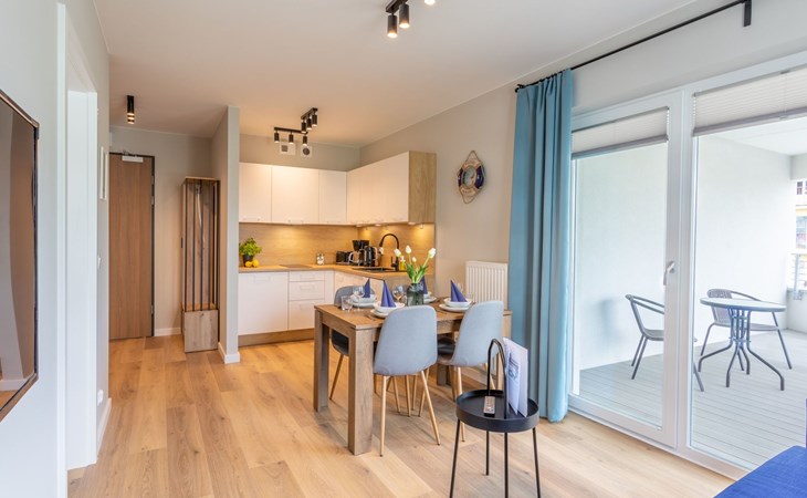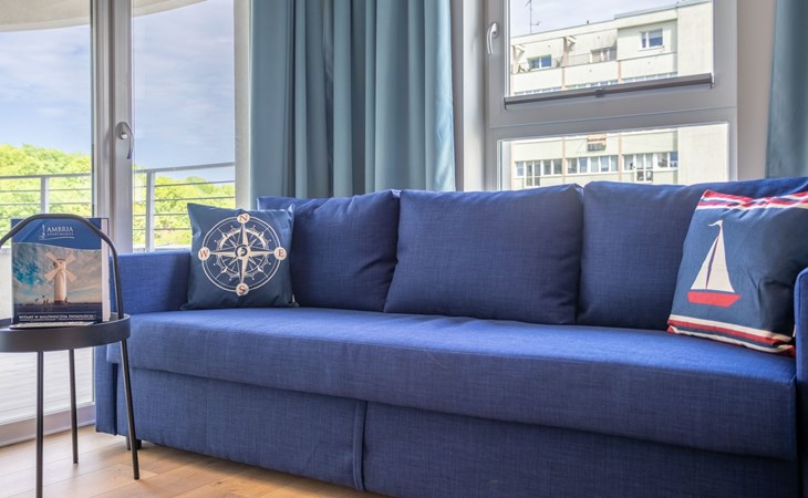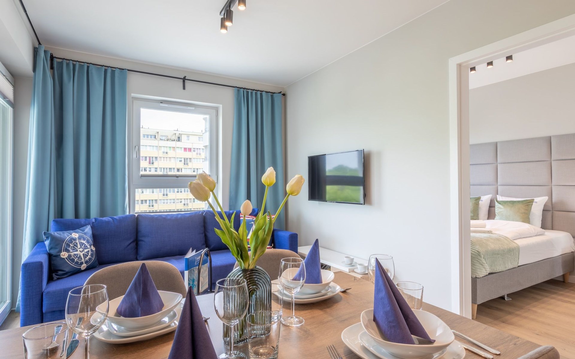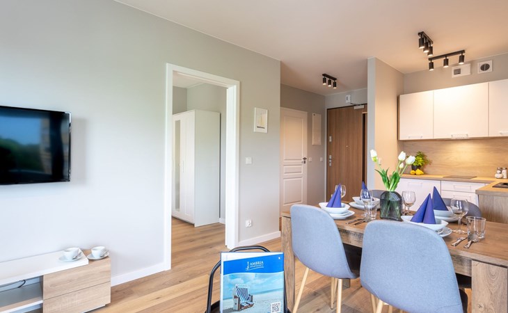 Es ist Apartment mit sehr geräumigen Schlafzimmer, Wohnzimmer mit gut ausgestatteten Küchenzeile, Essbereich und modernen Badezimmer mit Gesamtfläche von 35 m2, sowie einem Terrasse, der perfekte Erweiterung der nutzbaren Fläche darstellt. Sehr bequemes Doppelbett im Schlafzimmer und Sofa mit Schlaffunktion im Wohnbereich sorgen für erholsamen Schlaf. Eine komfortable und komfortable Ausstattung garantiert einen angenehmen Aufenthalt, sowohl für private als auch für geschäftliche Zwecke. Das Interieur ist sehr originell gestaltet, dominiert von Grau- und Weißtönen, die mit einem Blauton gebrochen sind, sowie schönen Holzdetails, die dezent in moderne Möbel oder Accessoires eingeschmuggelt werden, die das Interieur erwärmen und mit ihrer Textur und ihrem unkonventionellen Aussehen begeistern.