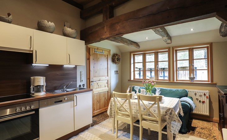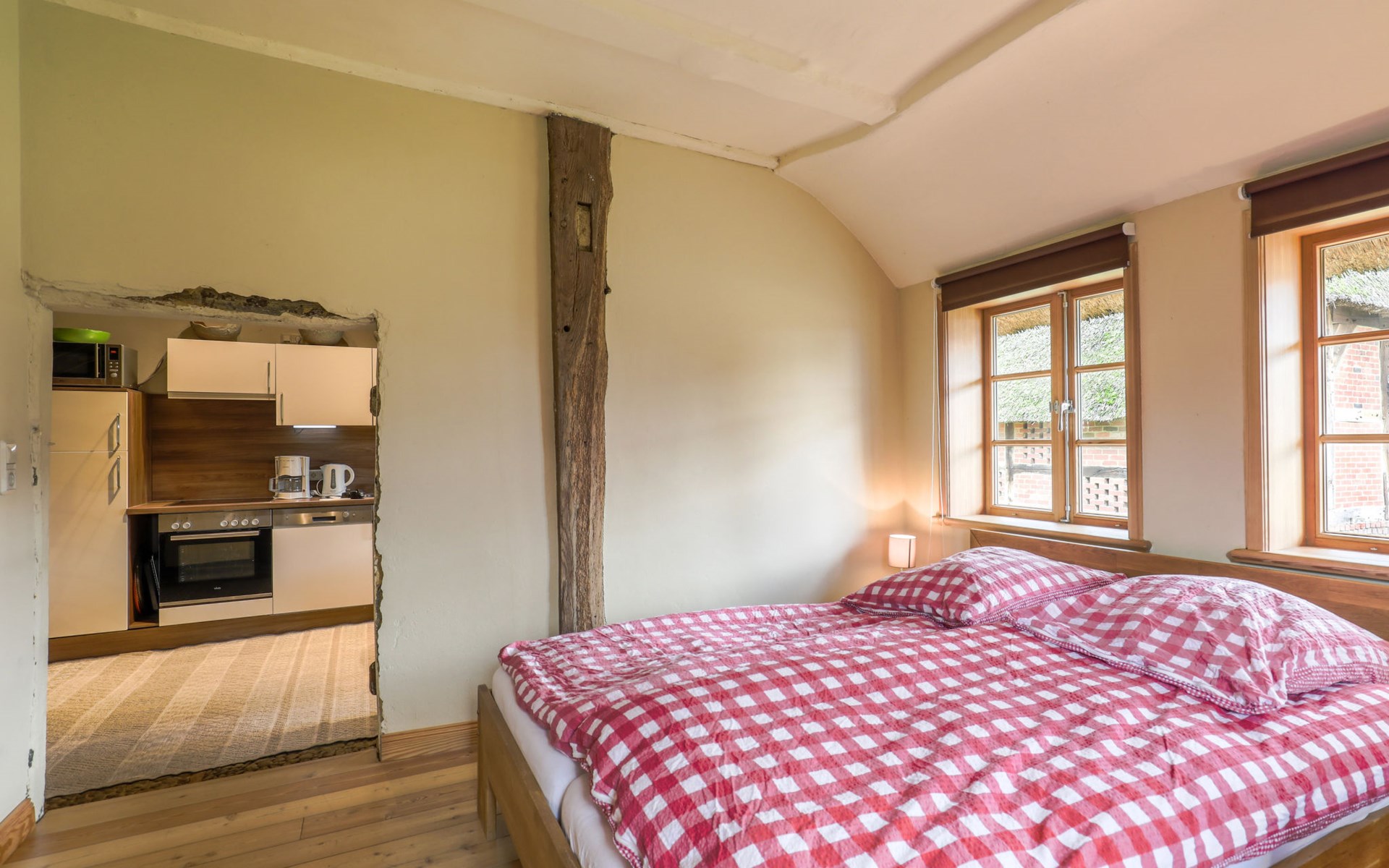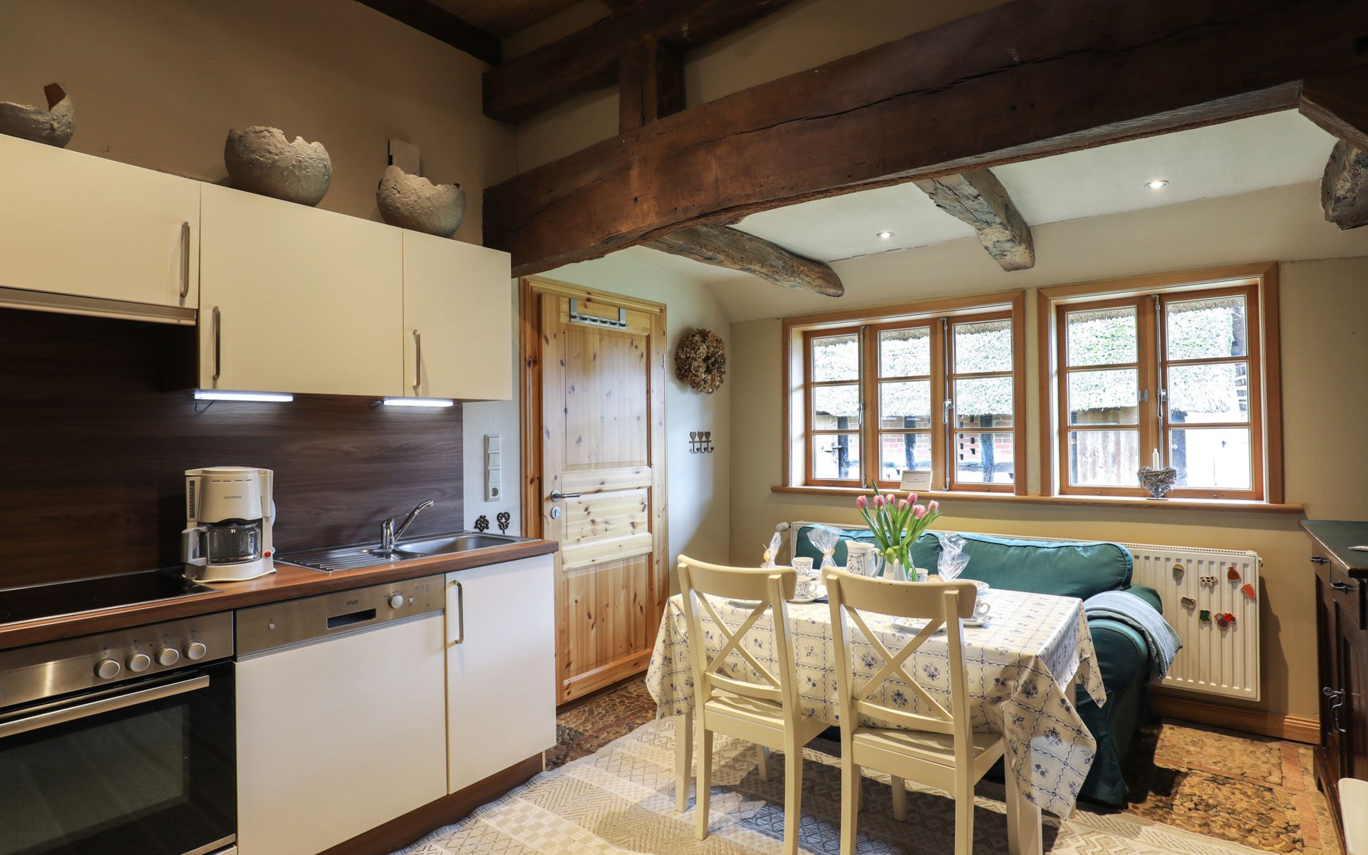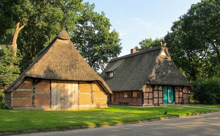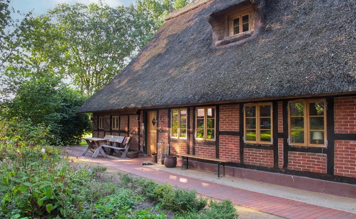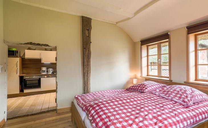 Rustikales Landhaus "Dat Litsche Hus", aus dem 18. Jahrhundert, umgeben von Bäumen und Wiesen. 2 Wohnungen im Ferienhaus. Im Ort Ober-Ochtenhausen, 2 km vom See, 700 m vom Fluss, im Grünen. Zur Mitbenutzung: Grundstück 1'500 m2, grosser Garten mit Bäumen, Wiese, Hof. Kinderspielplatz (Rutschbahn, Schaukel). Im Hause: Aufenthaltsraum, Tischtennis, Tischfussball, Zentralheizung, Waschmaschine (zur Mitbenutzung), Fahrräder vorhanden. Parkplatz beim Haus. Bushaltestelle 200 m, See Moorsee 2 km. Bitte beachten: geeignet für Familien. Auf dem Grundstück Tierhaltung. Nach Absprache Ponyreiten für Kinder (8-10 Jahre). Im Eingangsbereich des Ferienhauses ca. 70 m² großer Gemeinschaftsraum mit mehreren Sitzgruppen, Sofas, Kaminofen, Klavier, Stereoanlage zur gemeinsamen Nutzung. Sichtbares Deckengebälk, alte Fliesen- und Steinböden sowie teils Antiquitäten sind mit modernem Wohnkomfort gekonnt kombiniert.