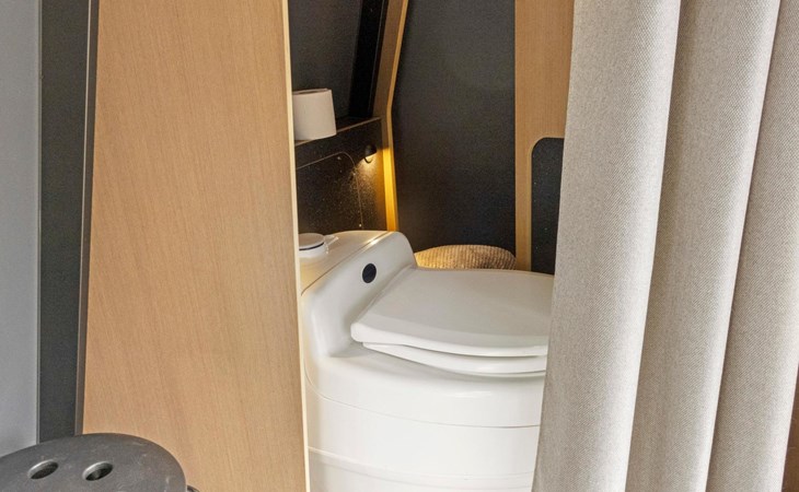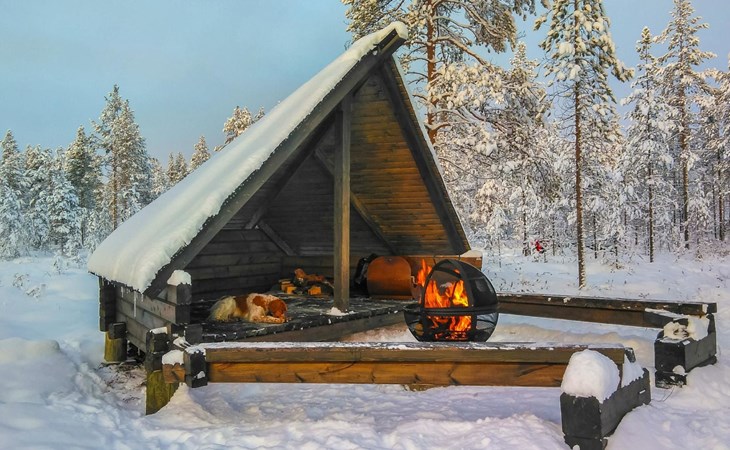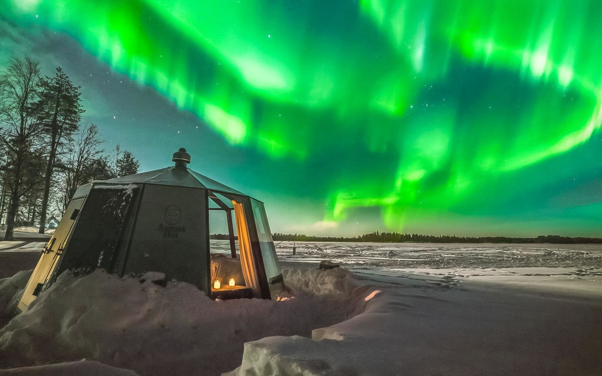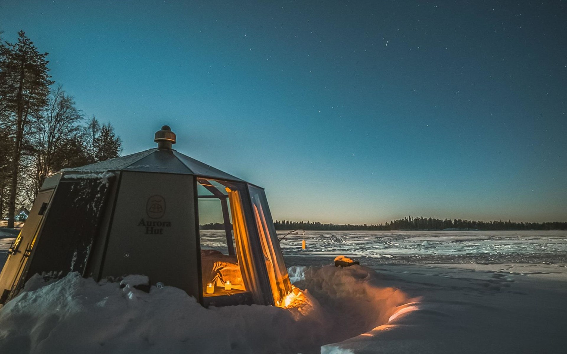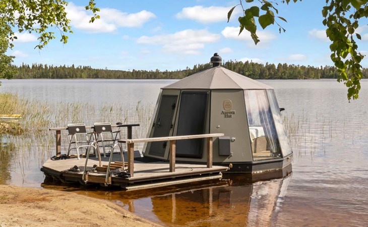 On the beach, a partially glass-walled igloo-style cabin with double bed. The igloo has heating, lighting, kitchenette (gas stove, fridge, sink) and chemical toilet.