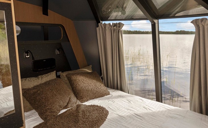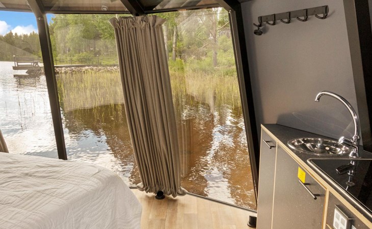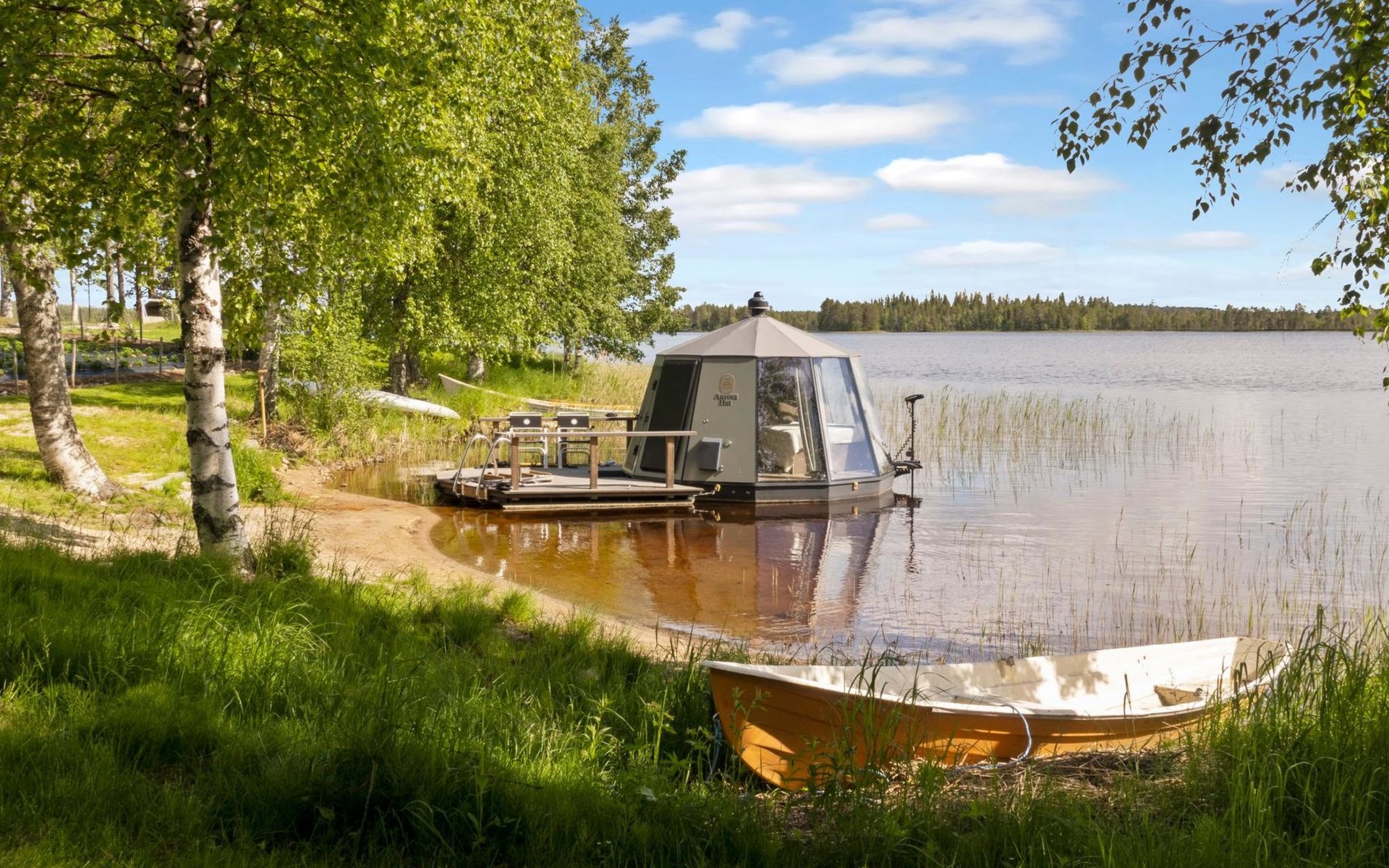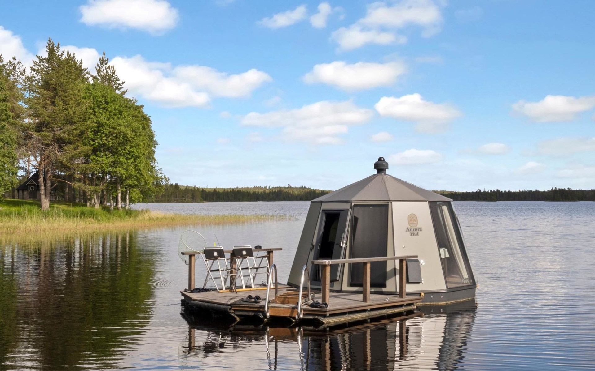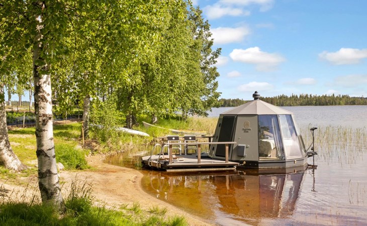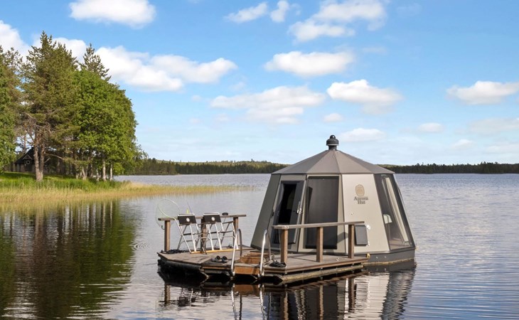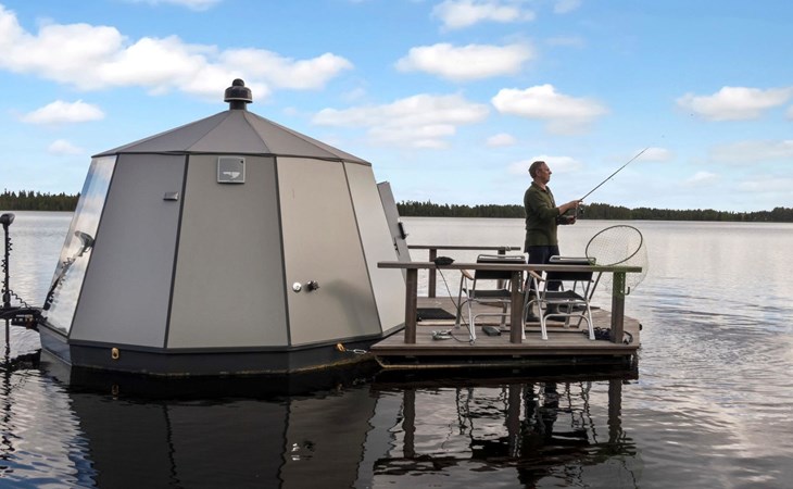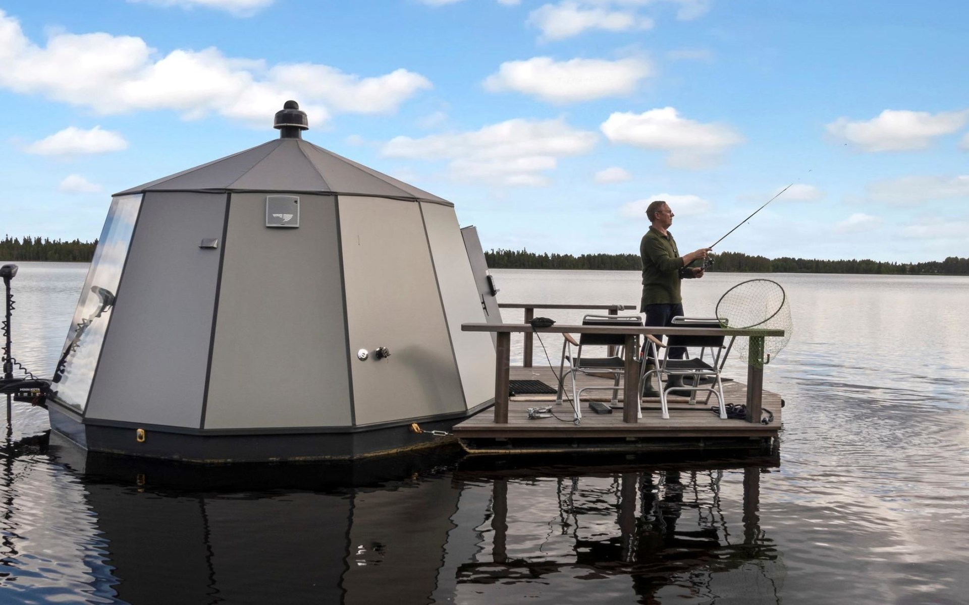 The igloo has a small terrace, which is suitable for staying outside on the water. The power source is an electric motor, which can be used to drive the igloo cabin on the lake in the summer. In winter, the igloo can be moved by using a snowmobile.