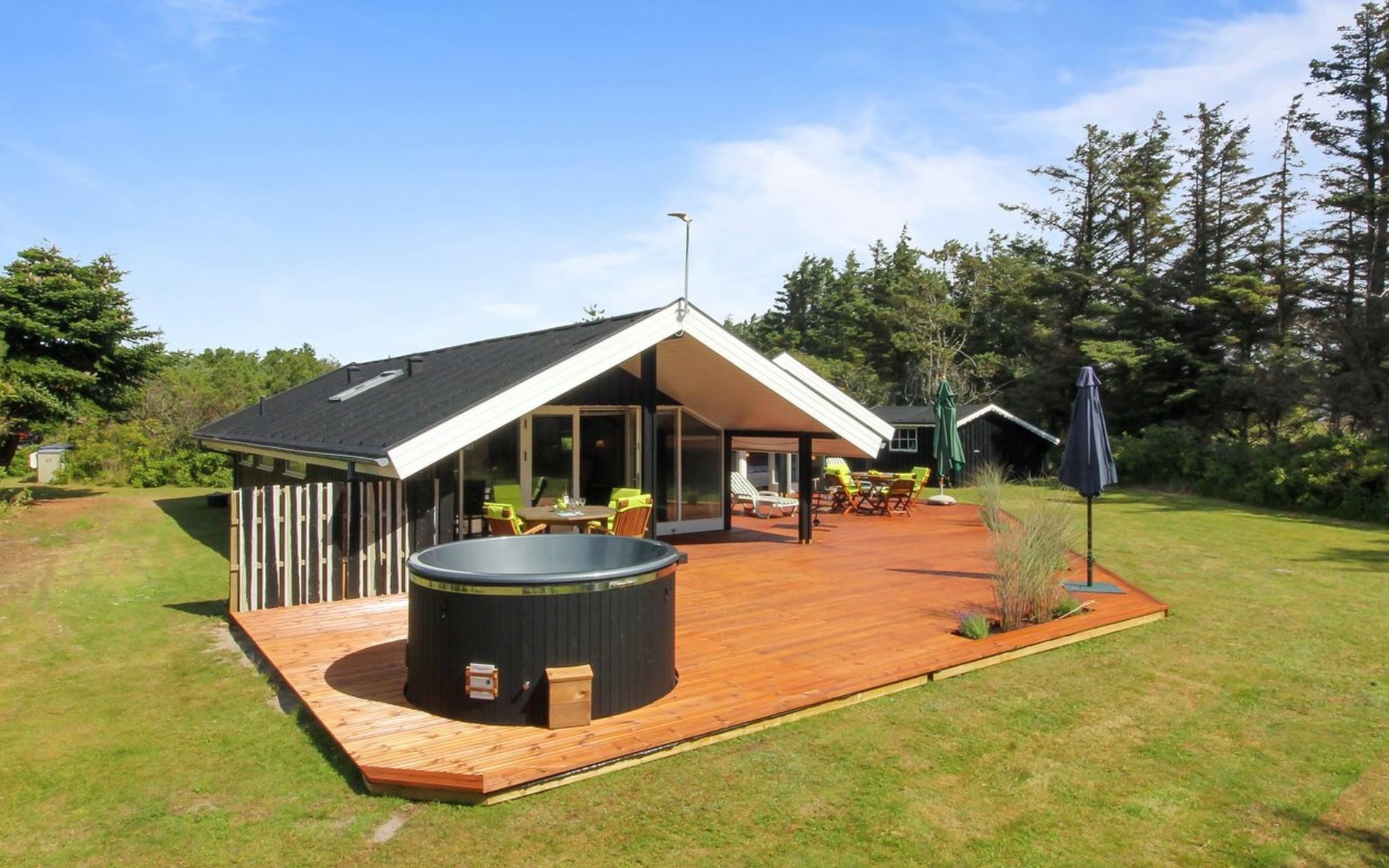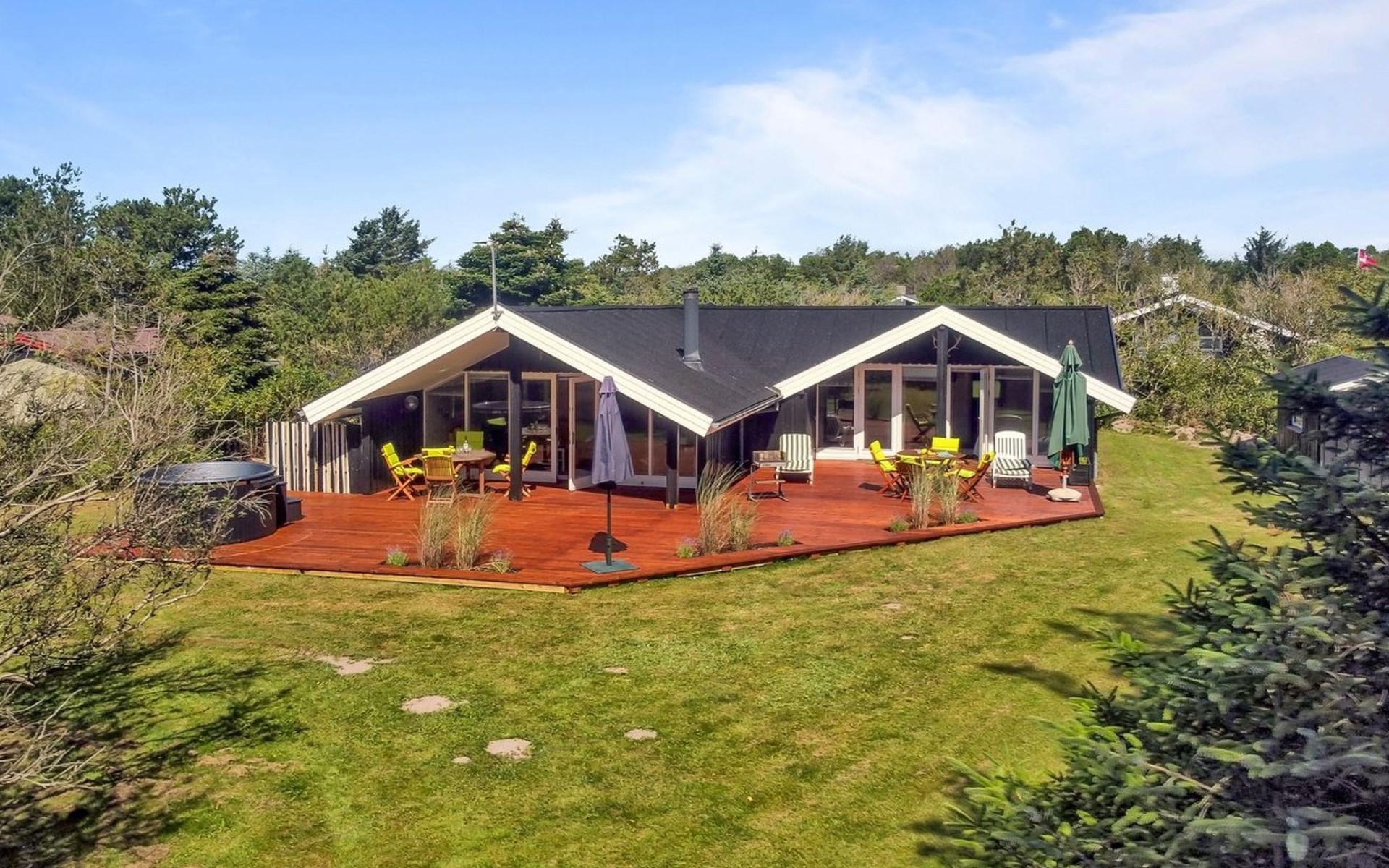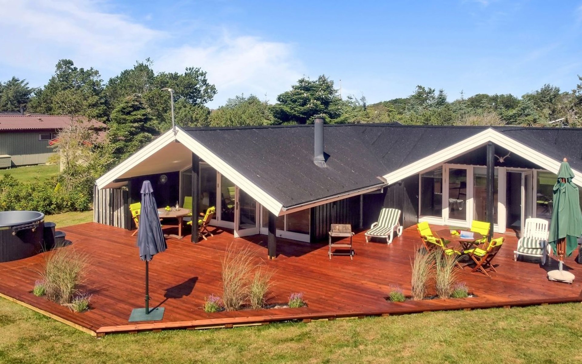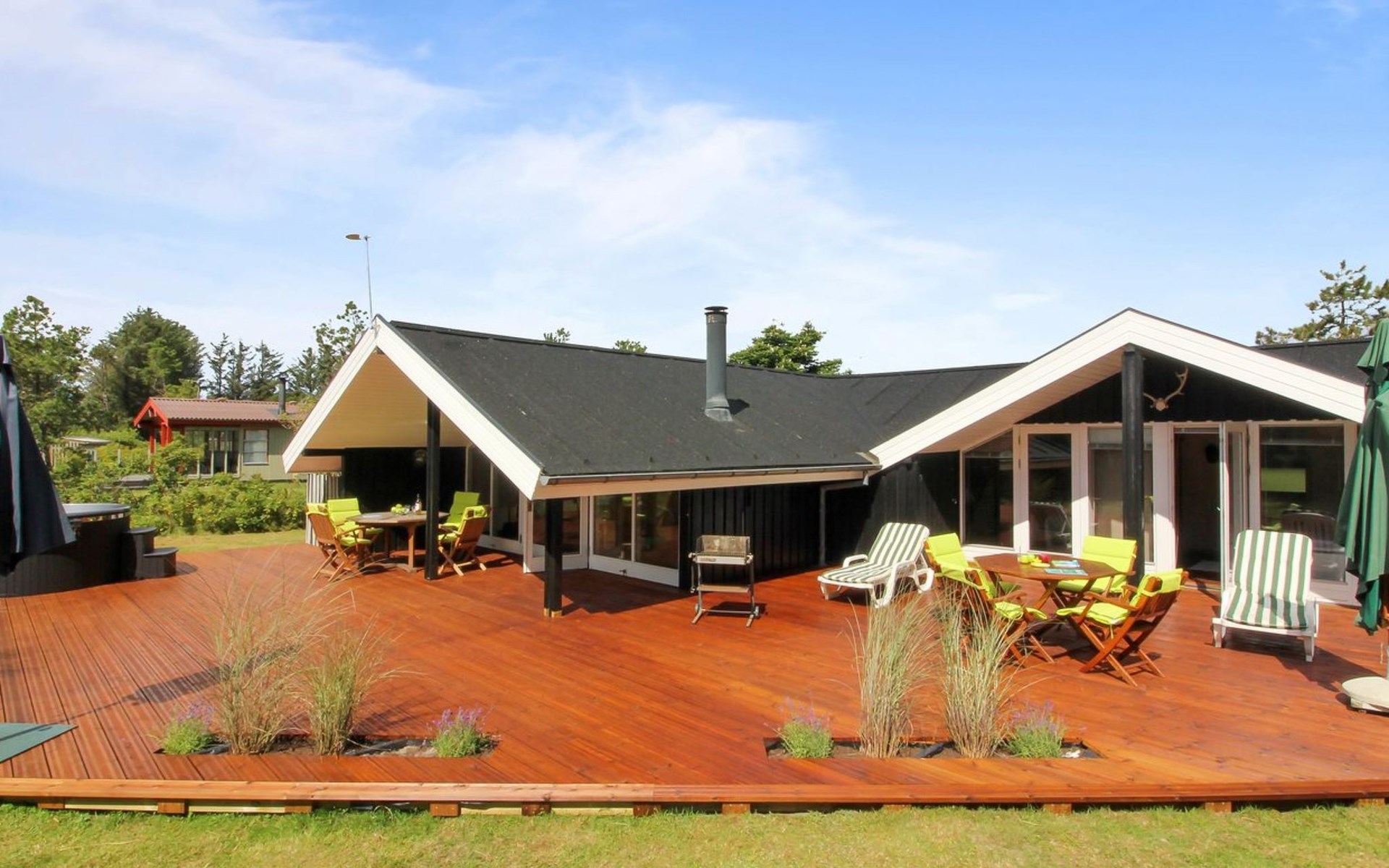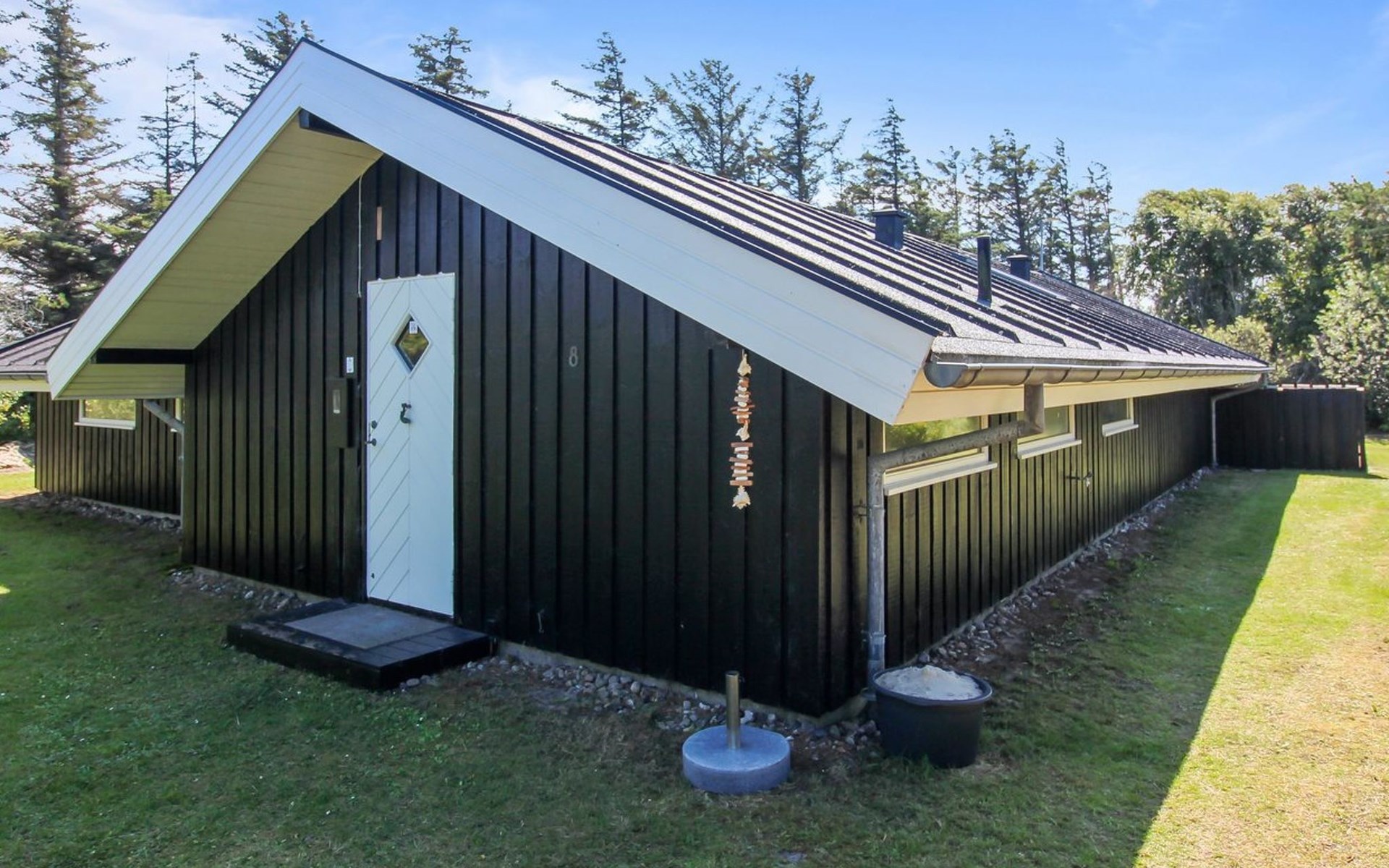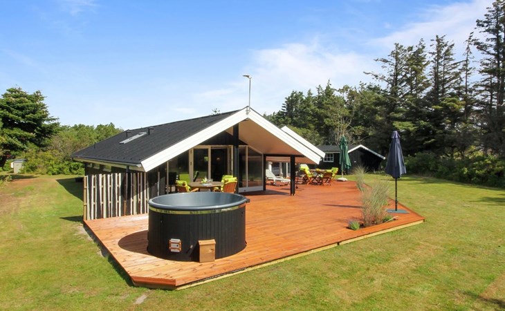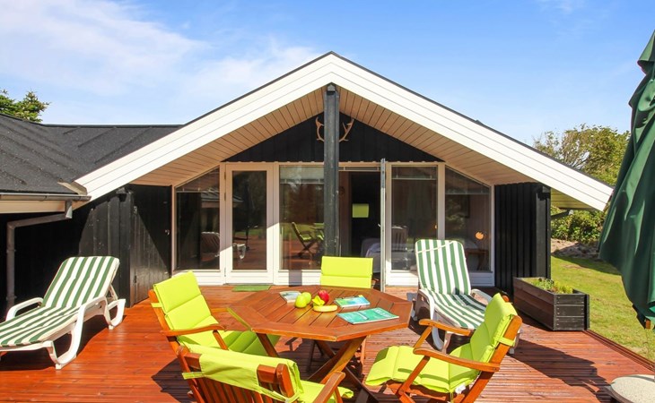 Einfamilienhaus, Baujahr 1976. 700 m vom Meer. Zur Alleinbenutzung: naturbelassenes Grundstück 1'262 m2. Terrasse (75 m2), Grill. Im Hause: Waschmaschine, Wäschetrockner. Parkplatz beim Haus. Lebensmittelgeschäft 3.5 km. Golfplatz 5 km. Der Besitzer akzeptiert keine Jugendgruppen.