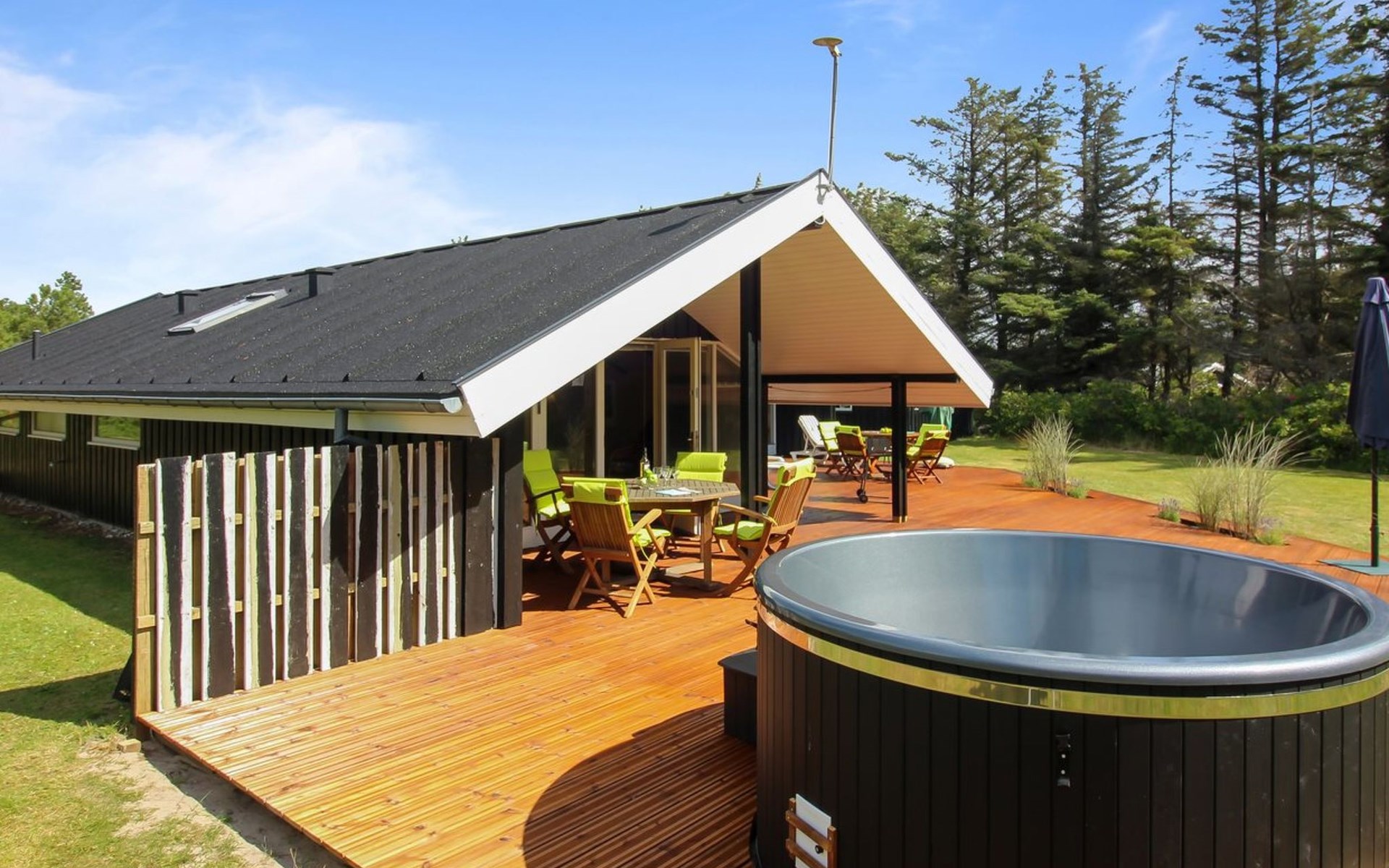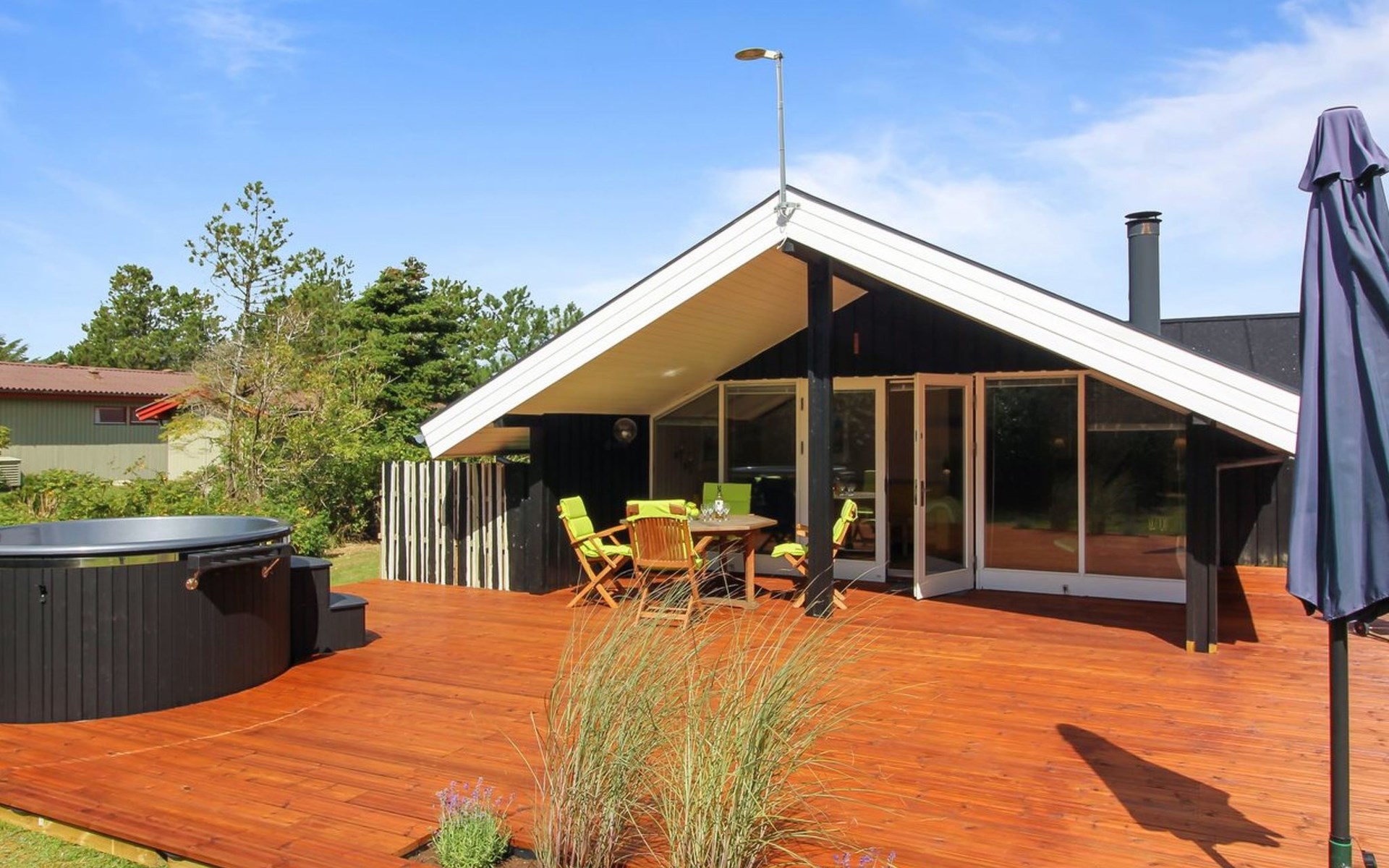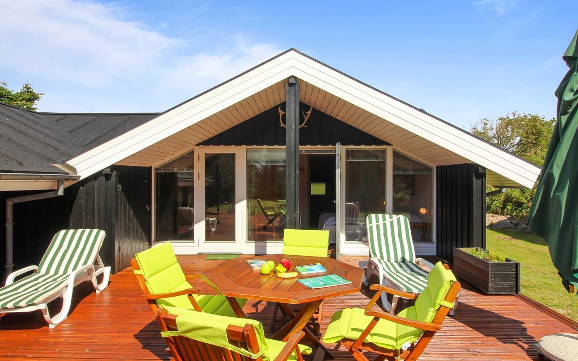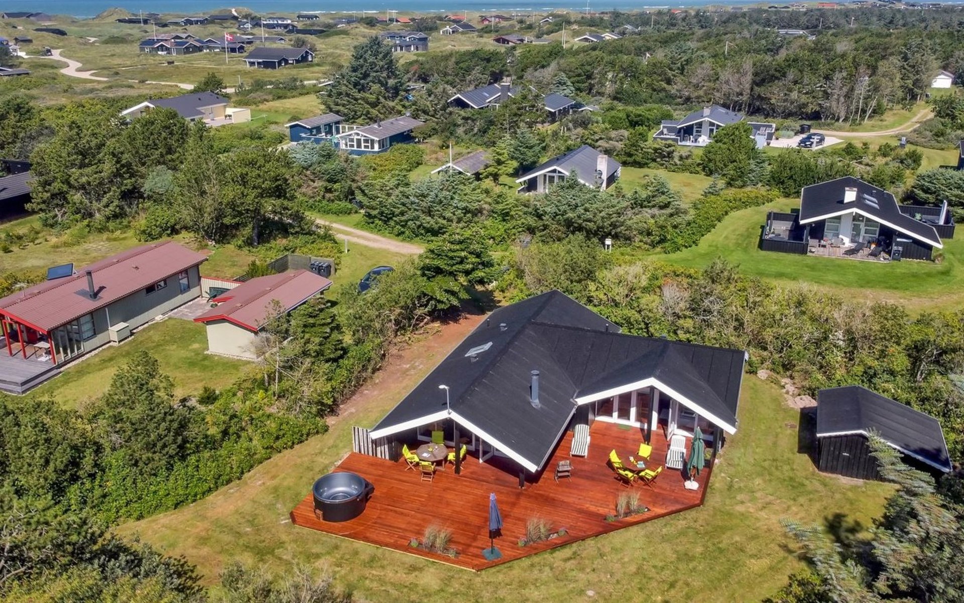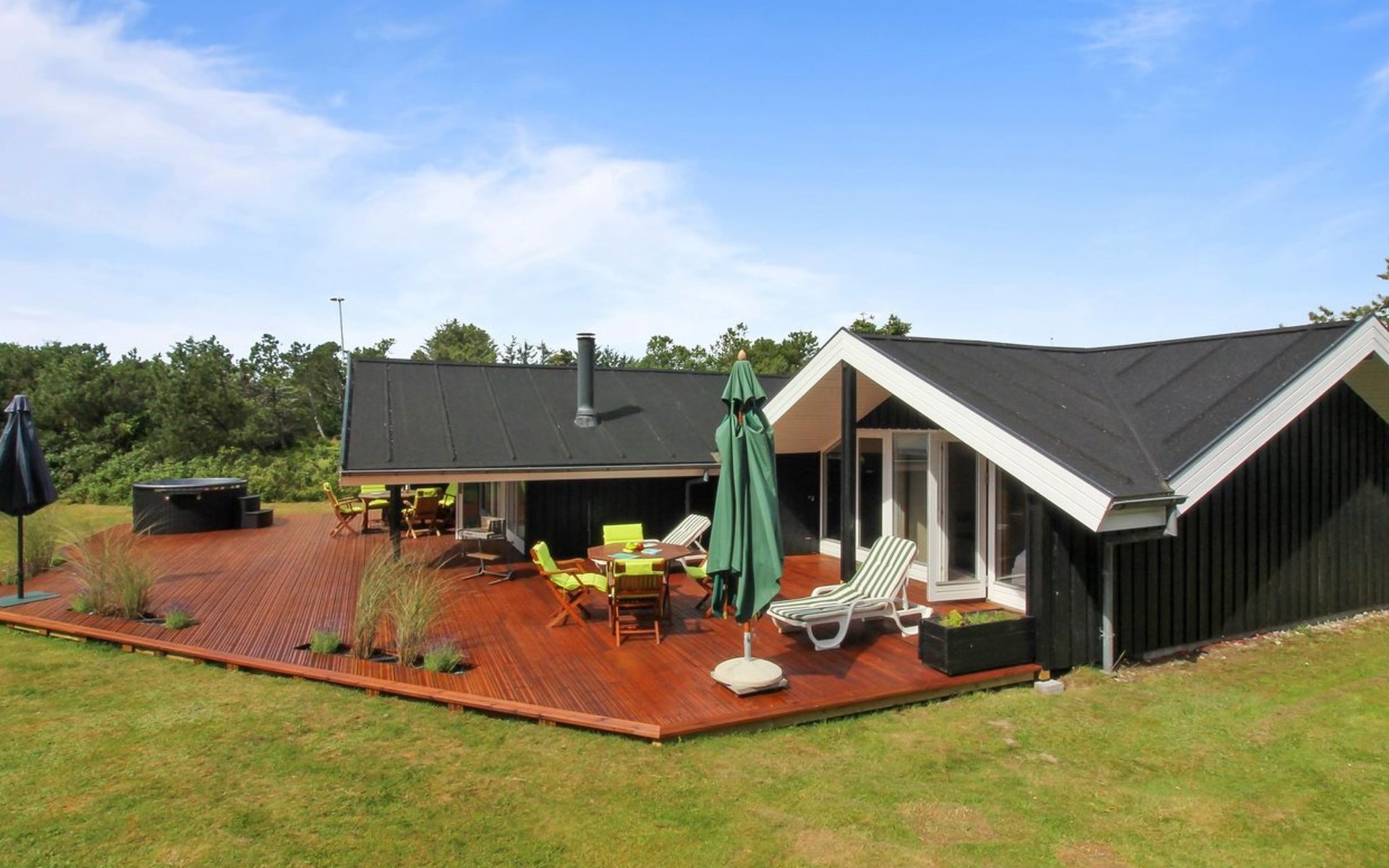 Einfamilienhaus, Baujahr 1976. 700 m vom Meer. Zur Alleinbenutzung: naturbelassenes Grundstück 1'262 m2. Terrasse (75 m2), Grill. Im Hause: Waschmaschine, Wäschetrockner. Parkplatz beim Haus. Lebensmittelgeschäft 3.5 km. Golfplatz 5 km. Der Besitzer akzeptiert keine Jugendgruppen.
