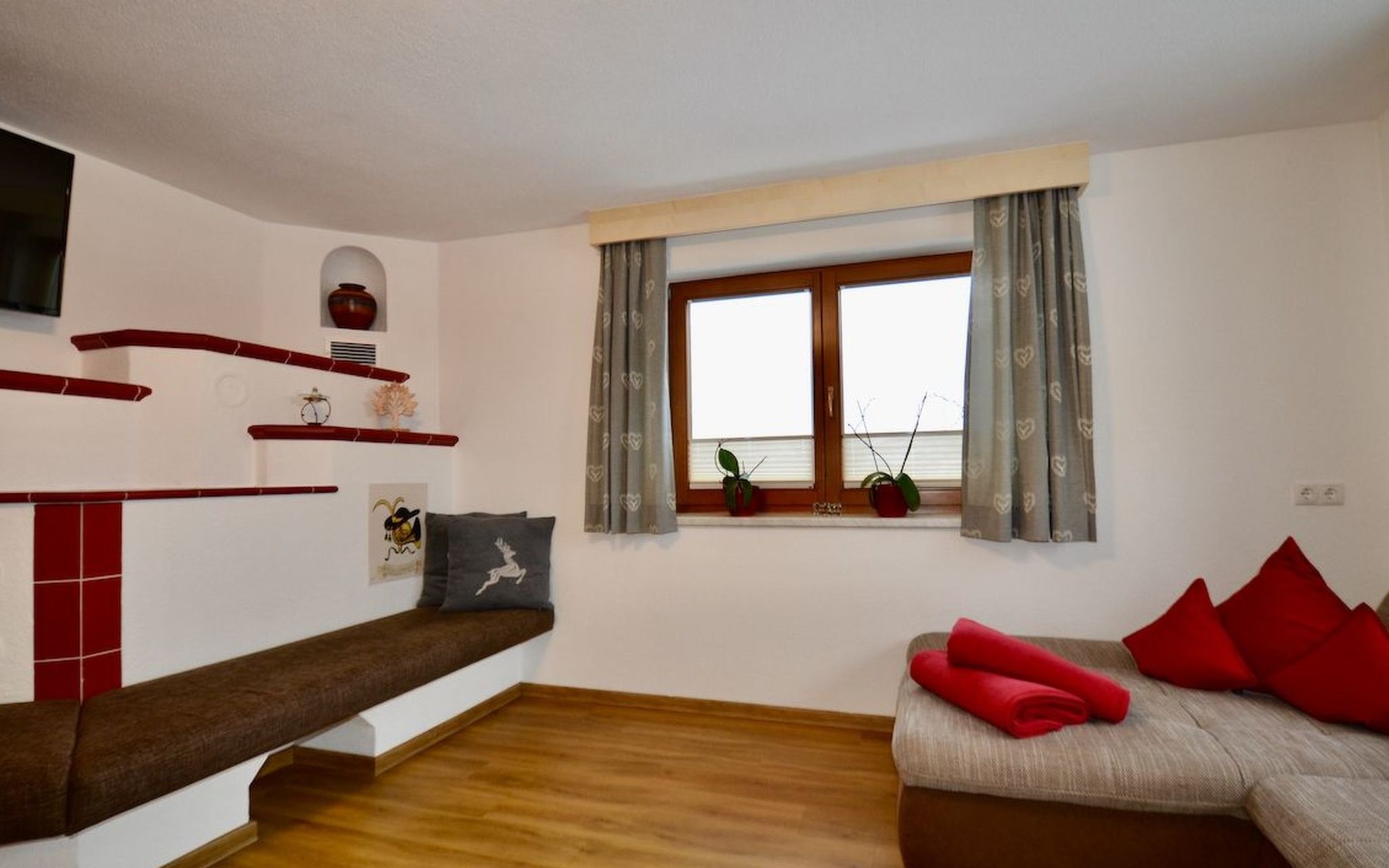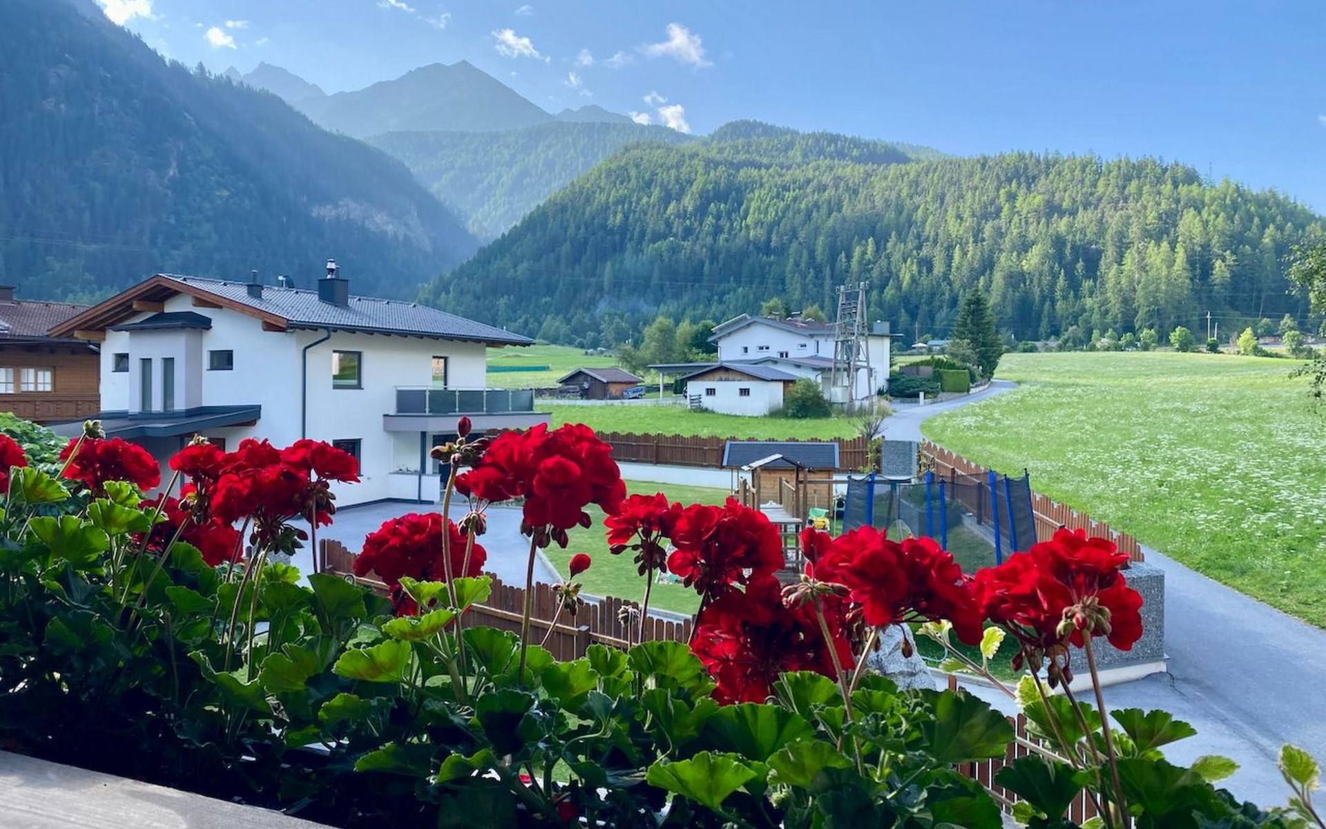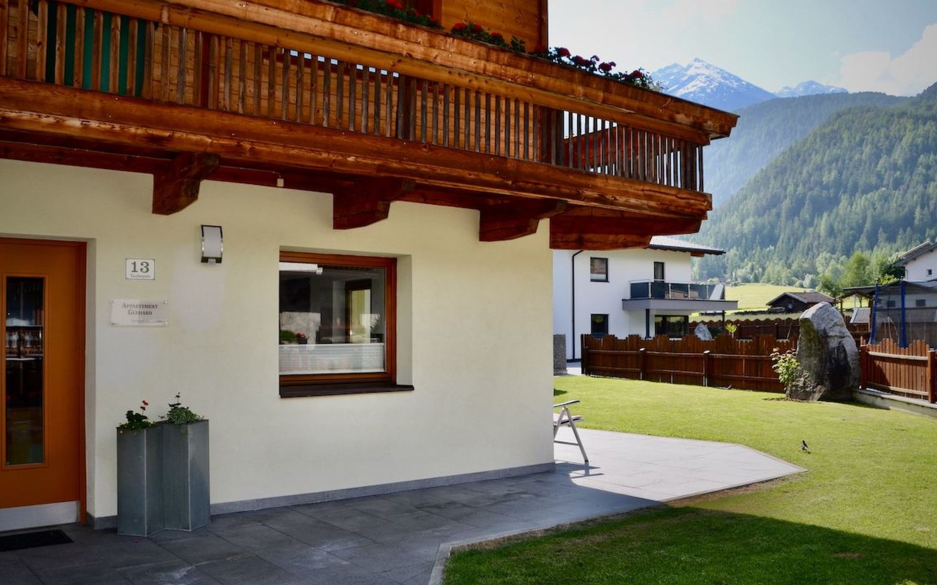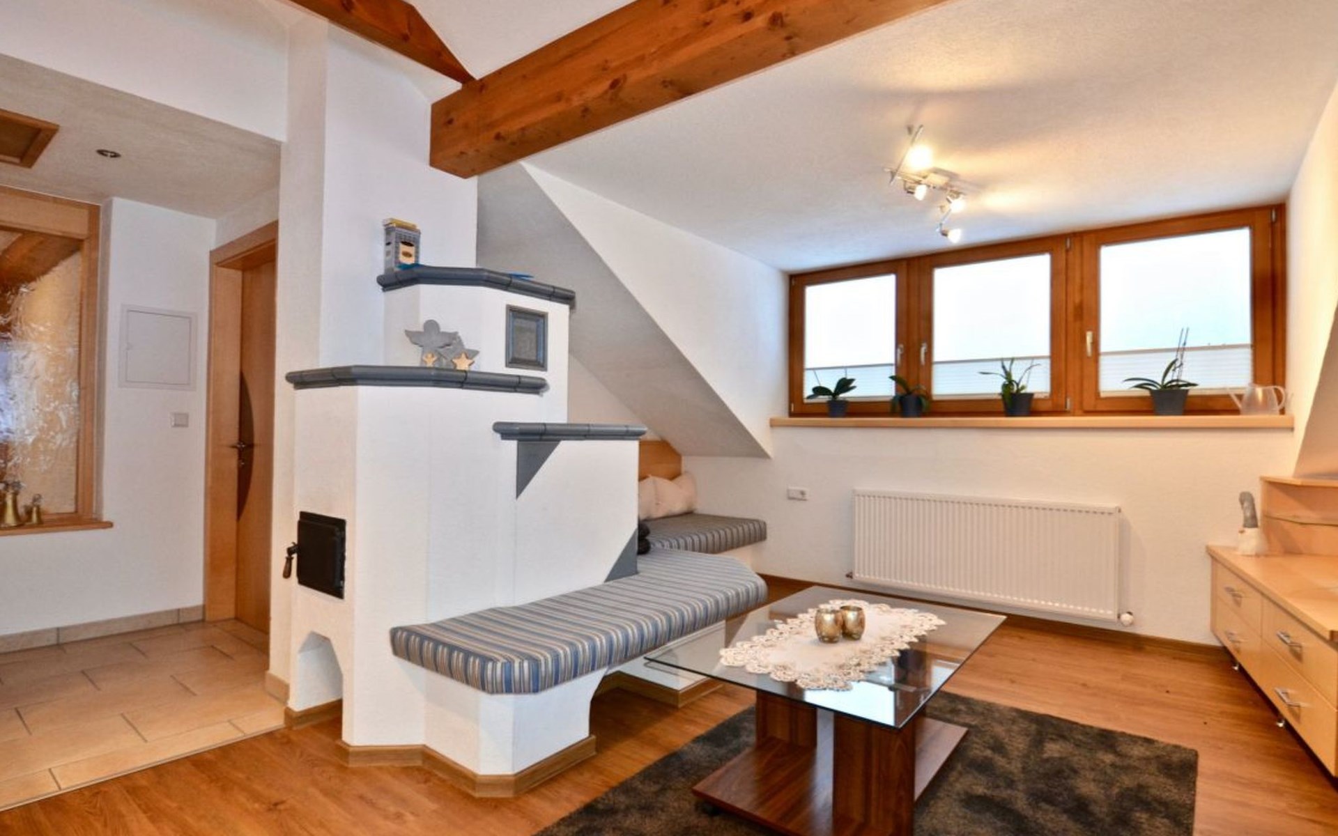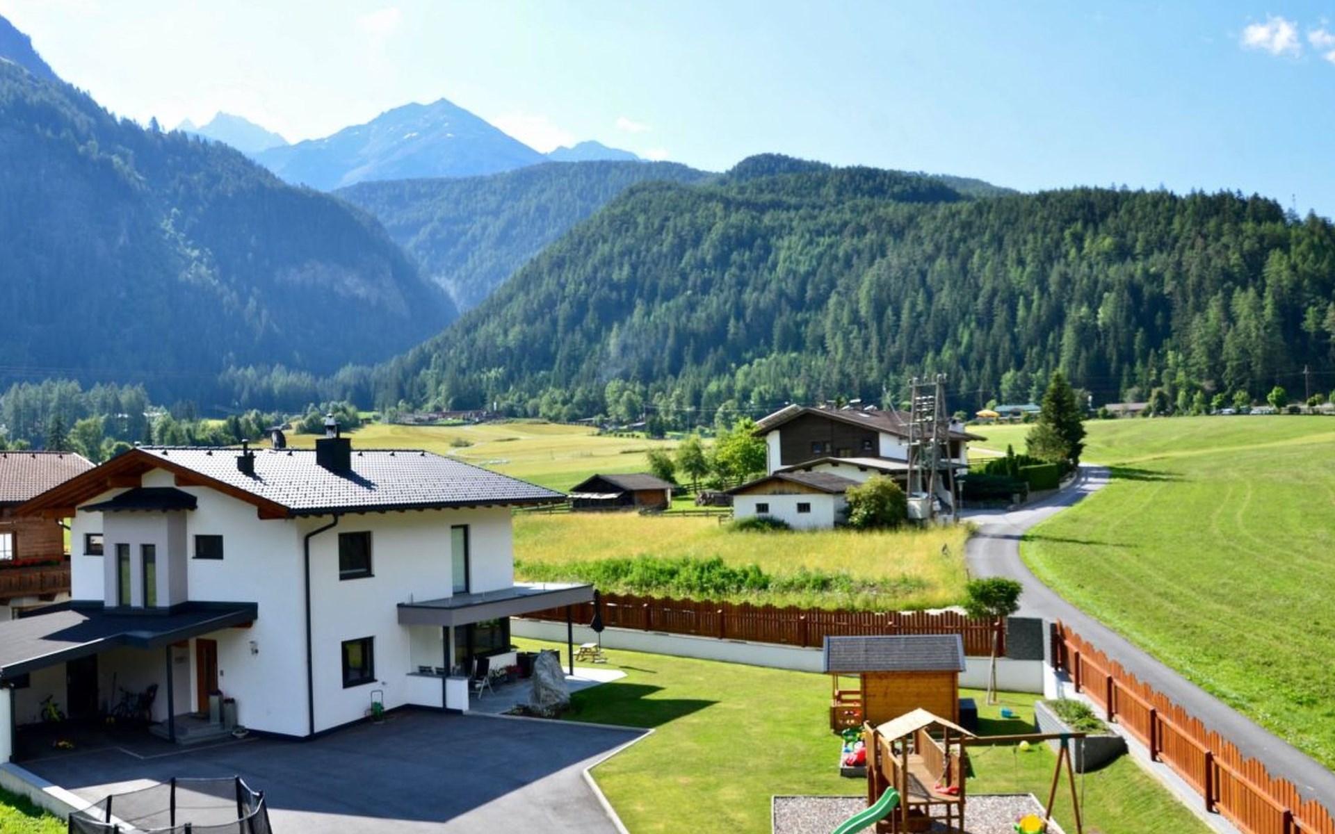 Im 2. Obergeschoss befindet sich zudem ein Wohnbereich mit Kachelofen und Ofenbank. Von hier aus hat man einen traumhaften Ausblick auf die Ötztaler Bergwelt. Im Garten befindet sich eine Sitzecke mit Grillmöglichkeit und ein Spielplatz mit Trampolin.