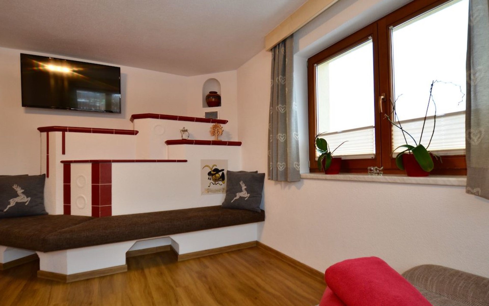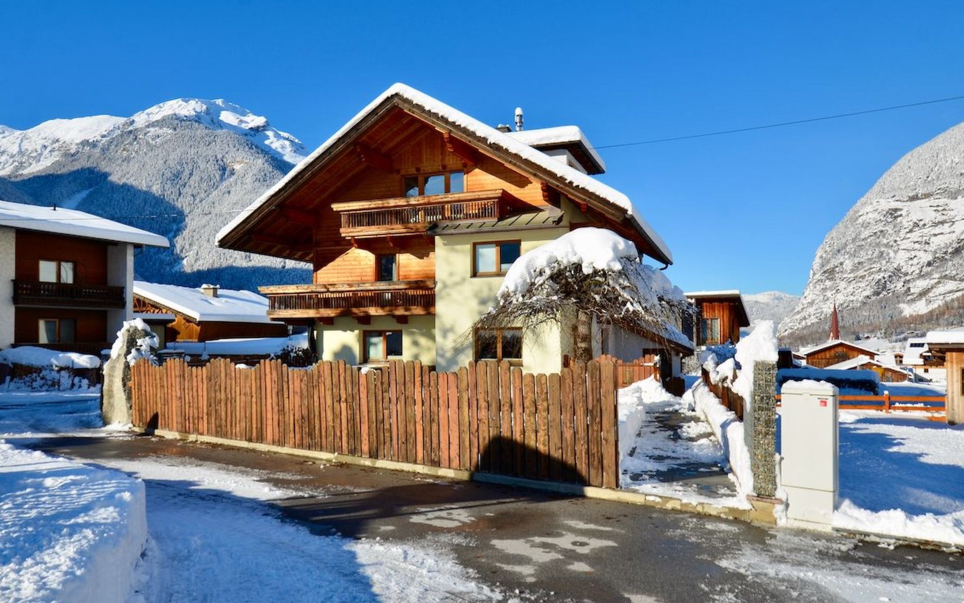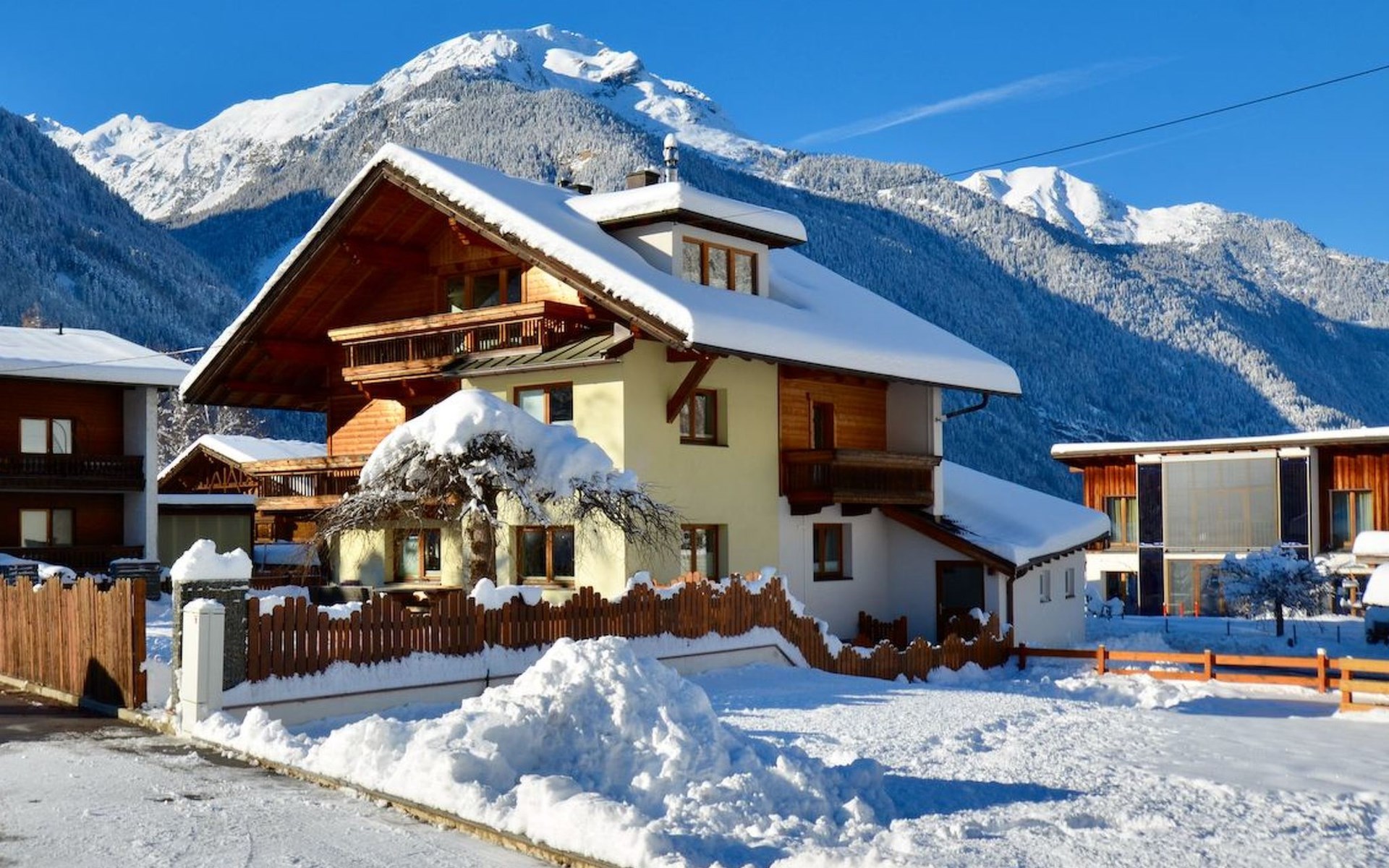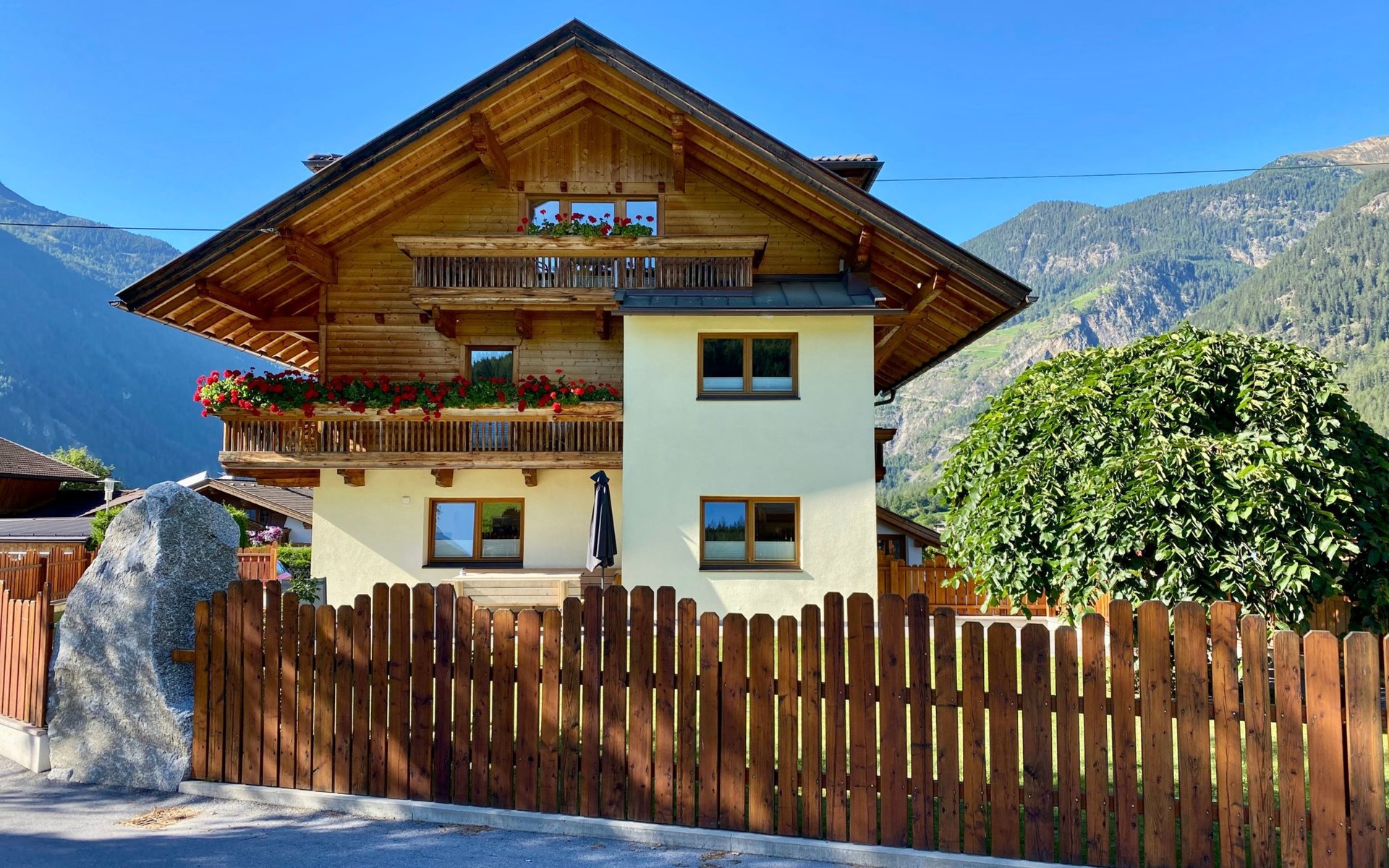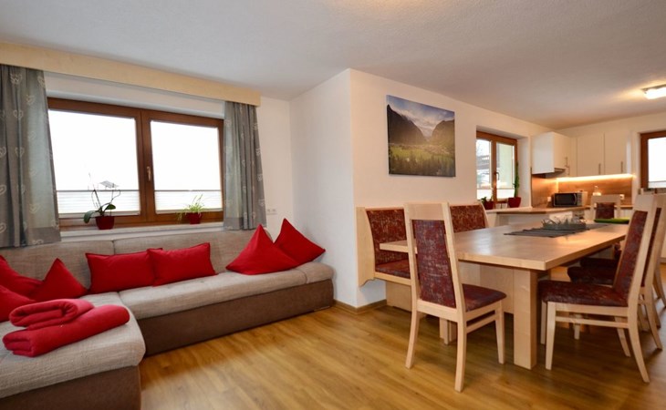 Im 2. Obergeschoss befindet sich zudem ein Wohnbereich mit Kachelofen und Ofenbank. Von hier aus hat man einen traumhaften Ausblick auf die Ötztaler Bergwelt. Im Garten befindet sich eine Sitzecke mit Grillmöglichkeit und ein Spielplatz mit Trampolin.