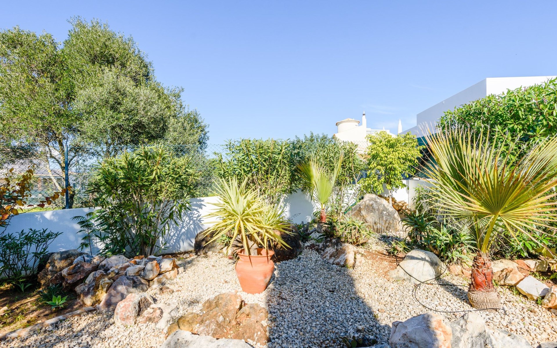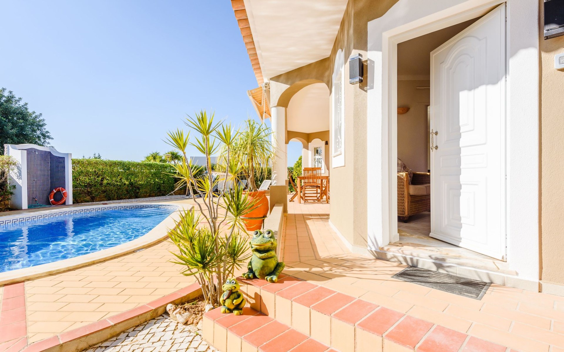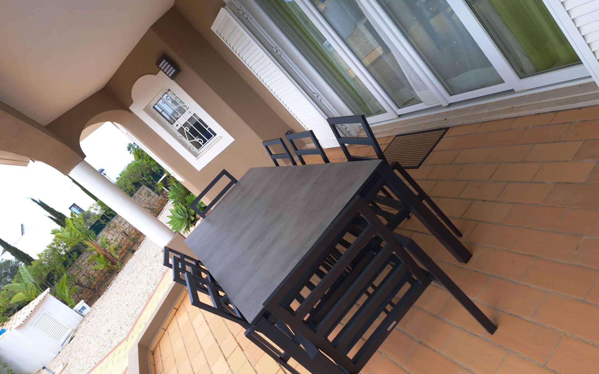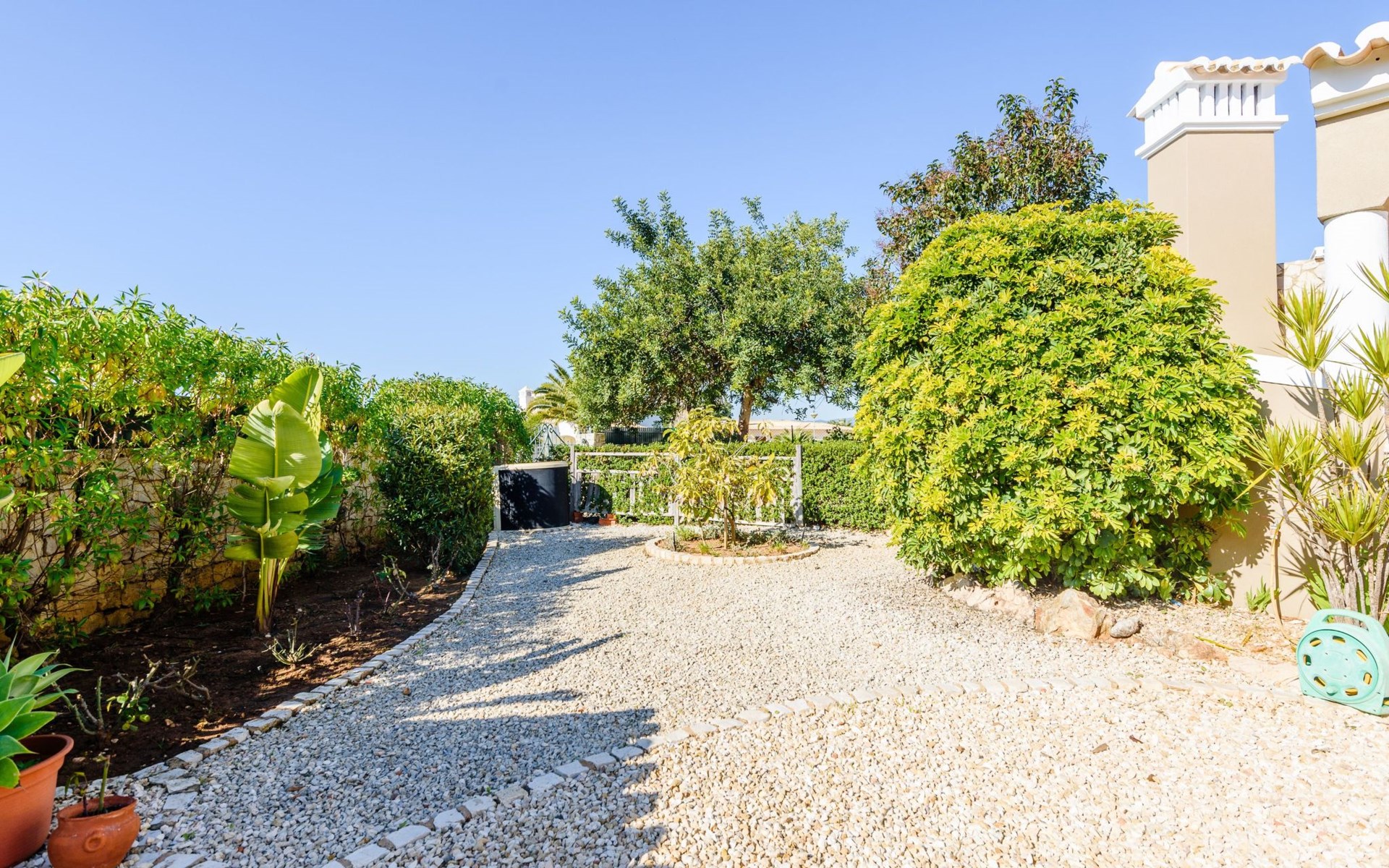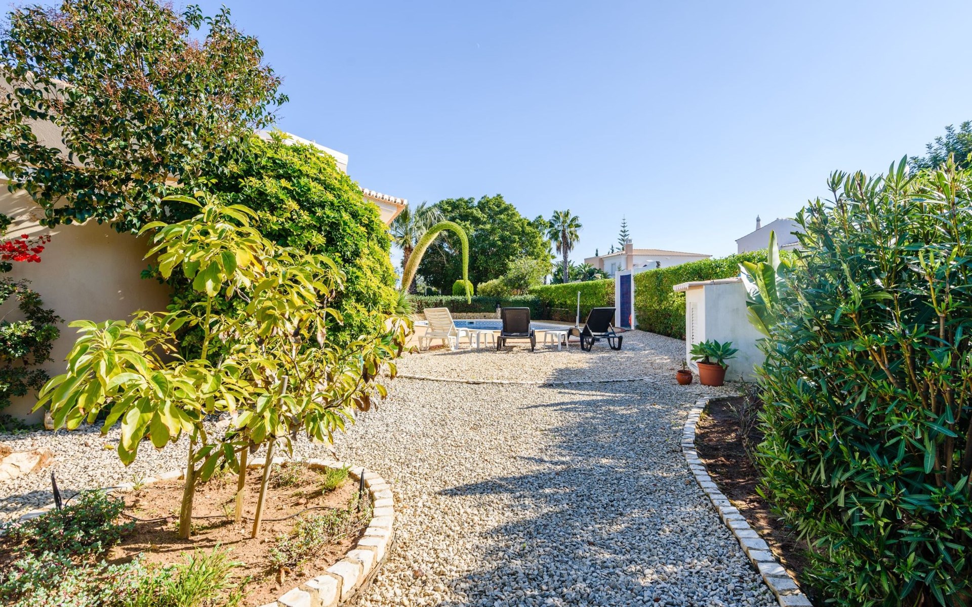 Das Äußere von Casa Rita ist eine Verkörperung von Freizeit und Entspannung. Der weitläufige, gesicherte Garten mit seinen vielen Obstbäumen bildet eine herrliche Kulisse für den privaten Pool und den Grillplatz. Die überdachte Terrasse bietet einen großzügigen, schattigen Zufluchtsort vor der Wärme der Sonne und ist der perfekte Ort, um den Außenpool zu genießen. Sonnenliegen und zusätzliche Schattenspender sorgen für ein erfrischendes und entspannendes Erlebnis im Freien.
