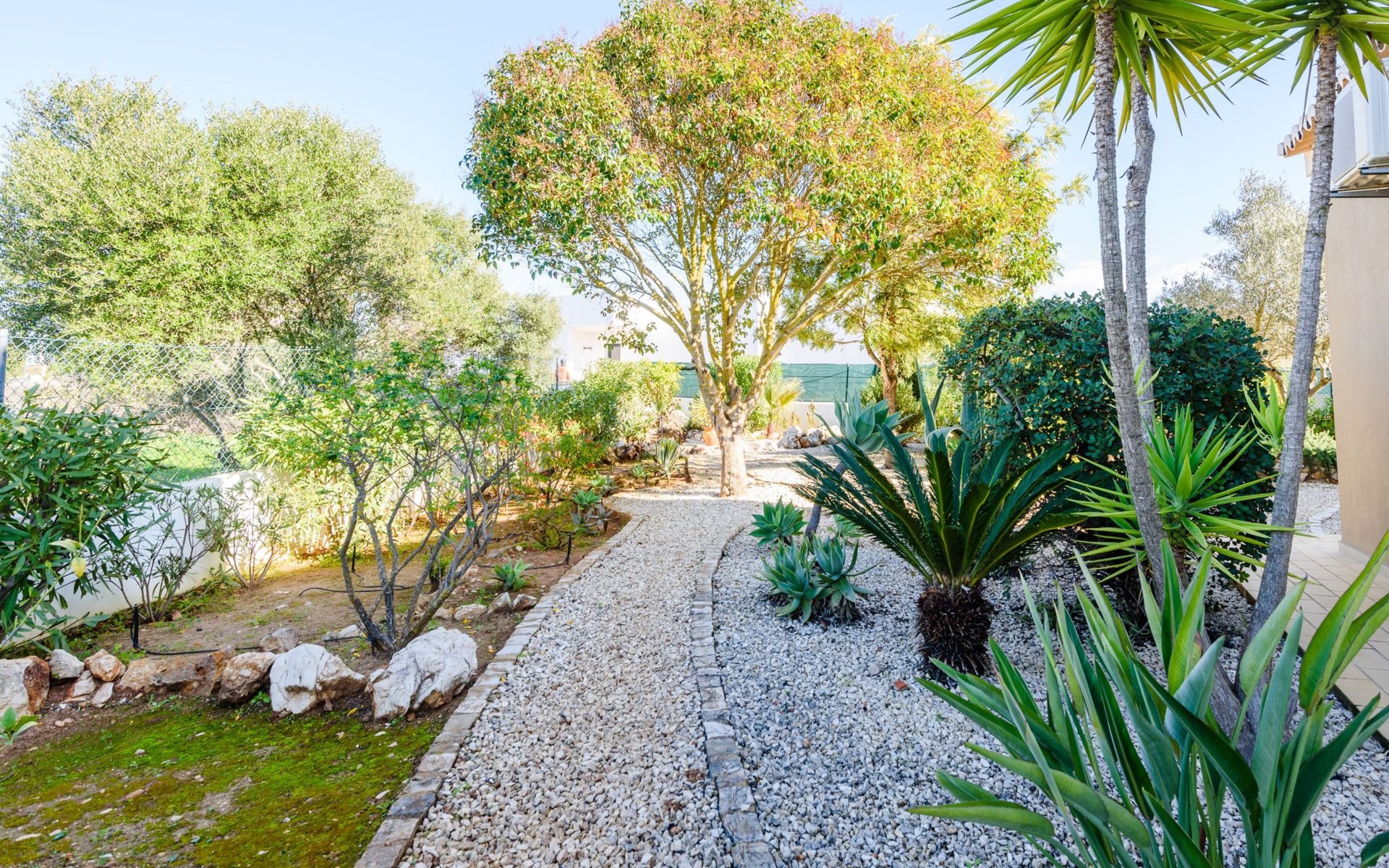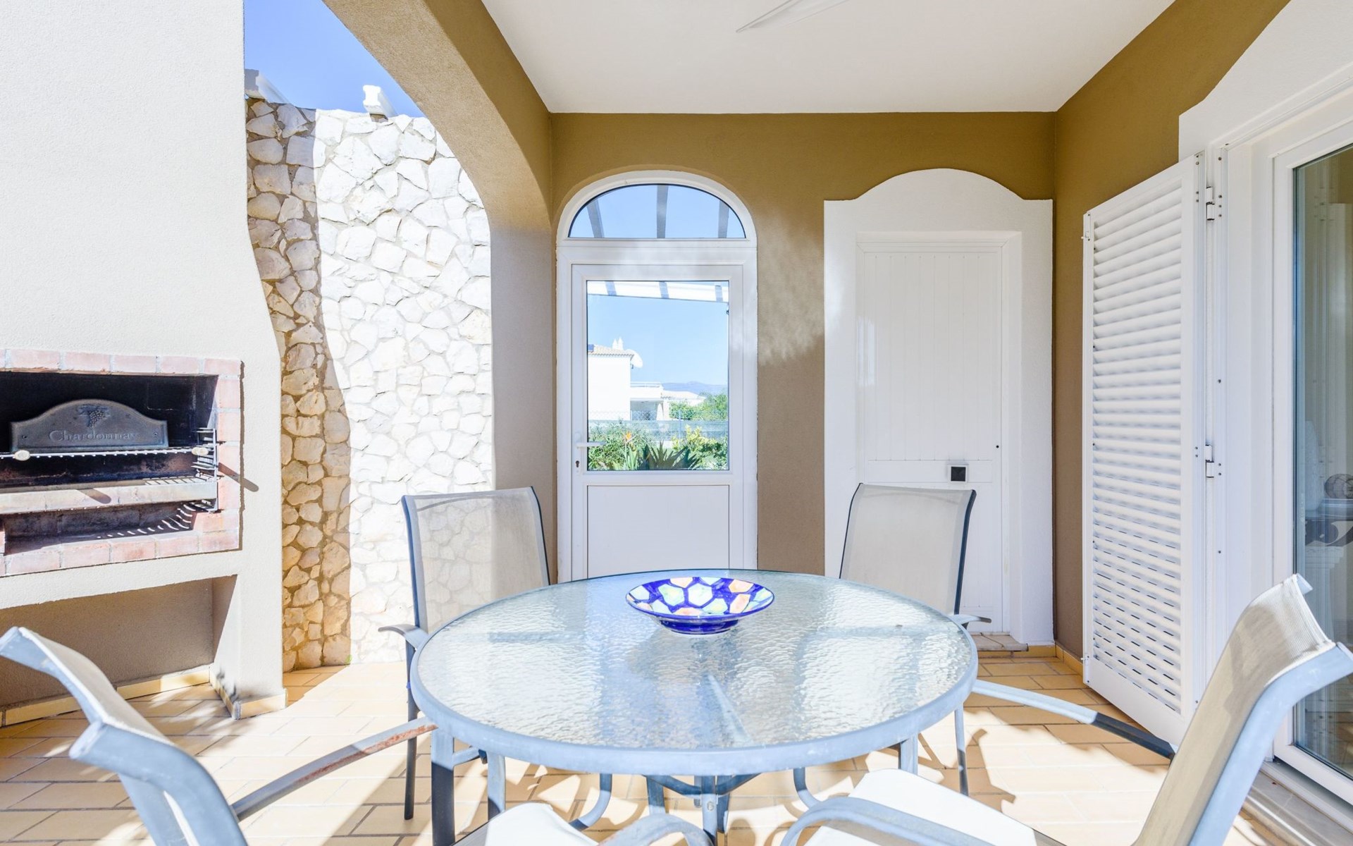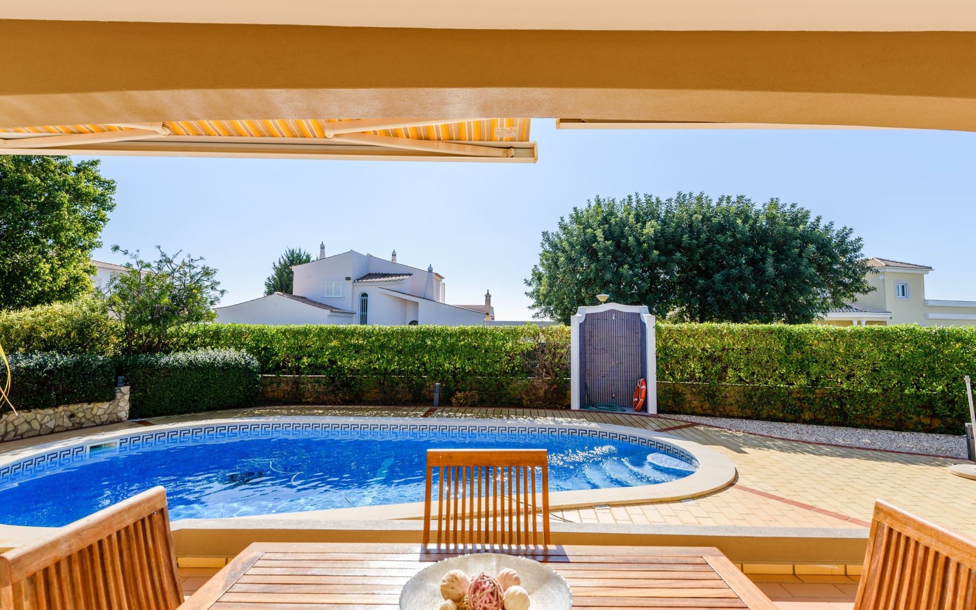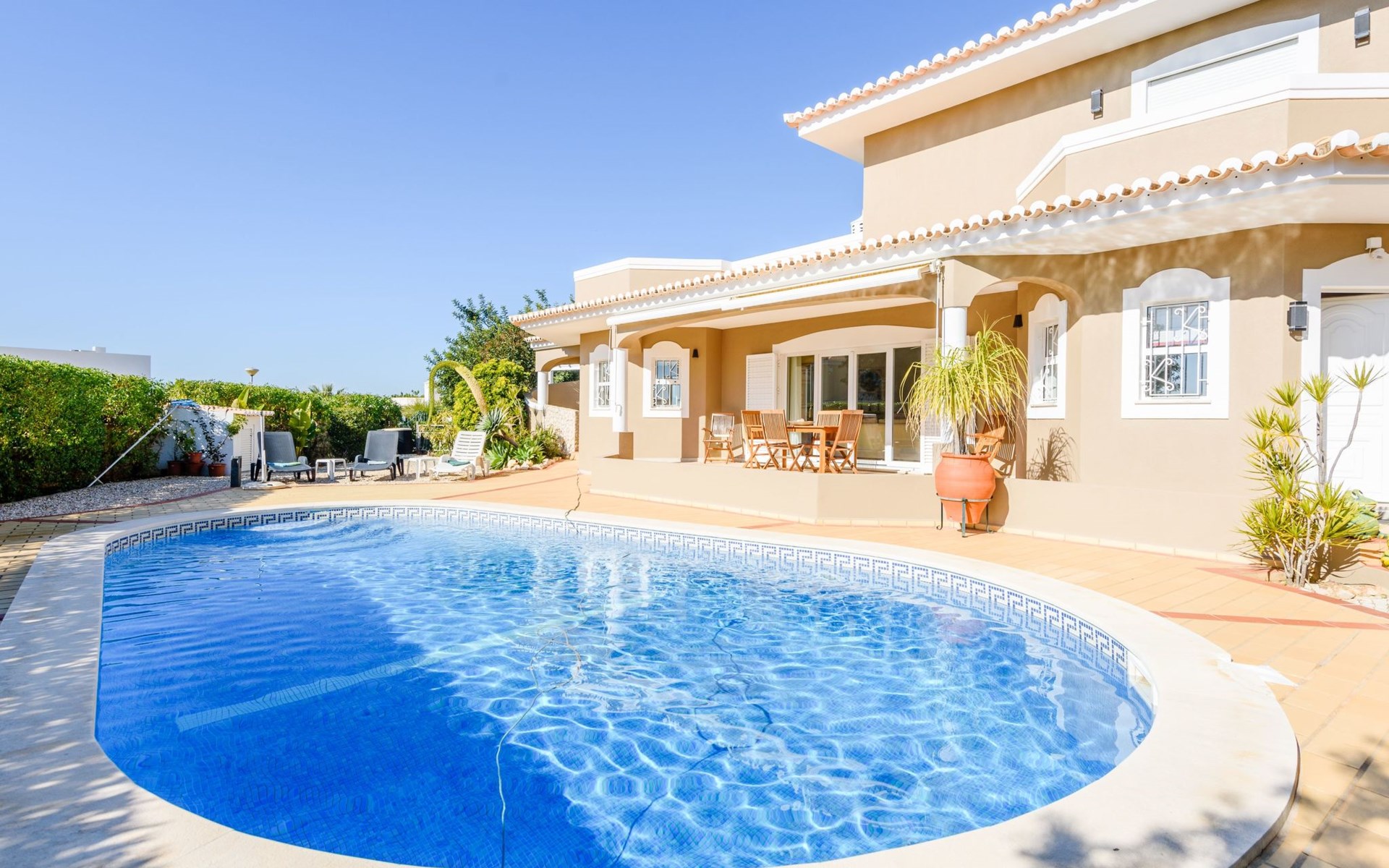 Das Äußere von Casa Rita ist eine Verkörperung von Freizeit und Entspannung. Der weitläufige, gesicherte Garten mit seinen vielen Obstbäumen bildet eine herrliche Kulisse für den privaten Pool und den Grillplatz. Die überdachte Terrasse bietet einen großzügigen, schattigen Zufluchtsort vor der Wärme der Sonne und ist der perfekte Ort, um den Außenpool zu genießen. Sonnenliegen und zusätzliche Schattenspender sorgen für ein erfrischendes und entspannendes Erlebnis im Freien.