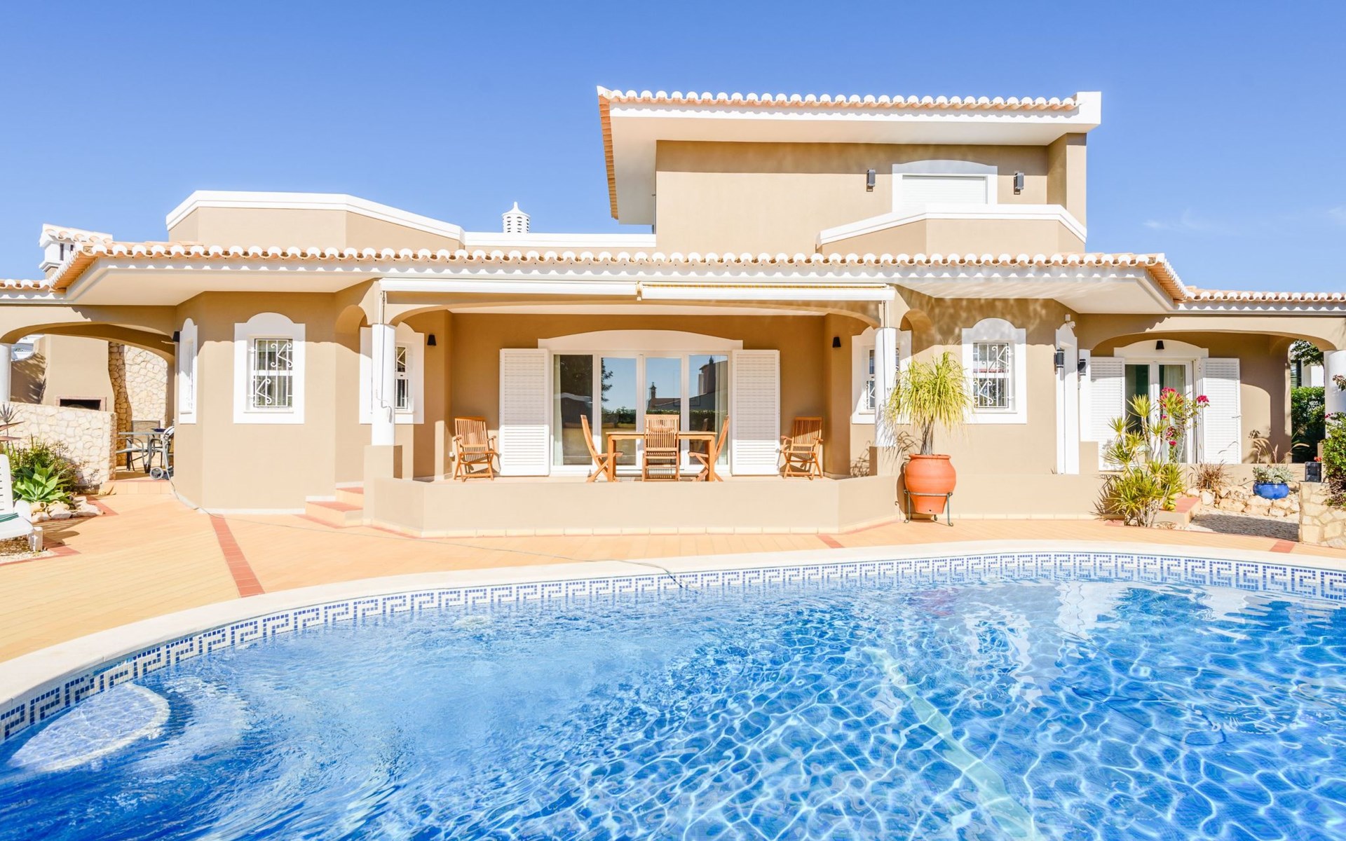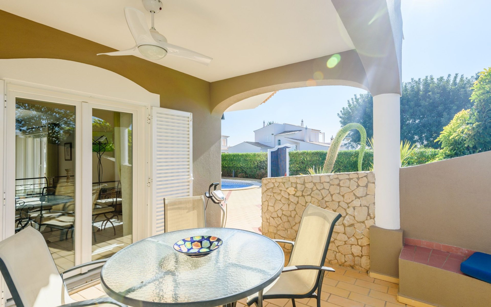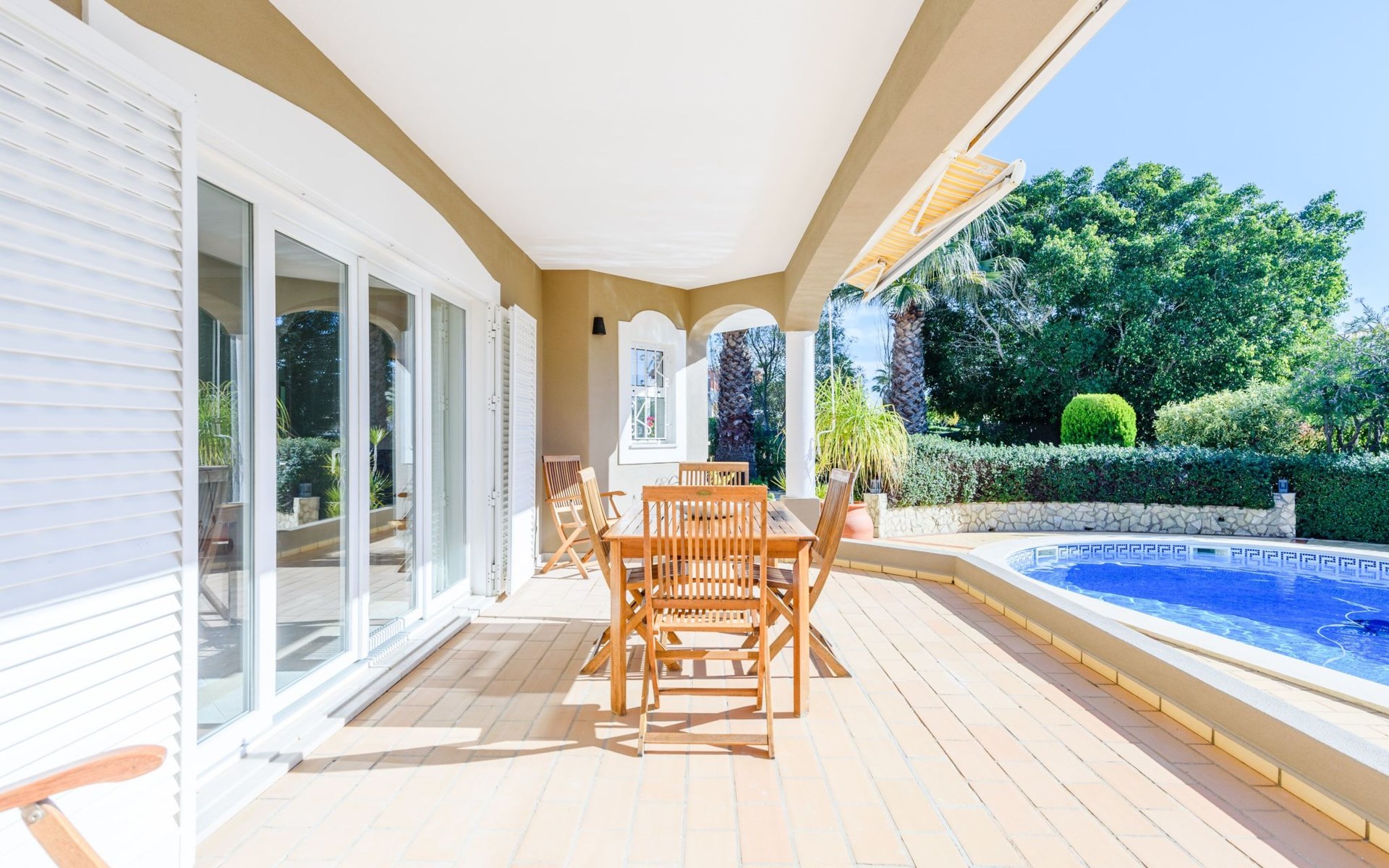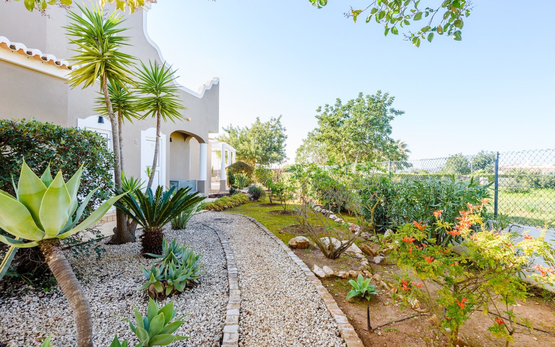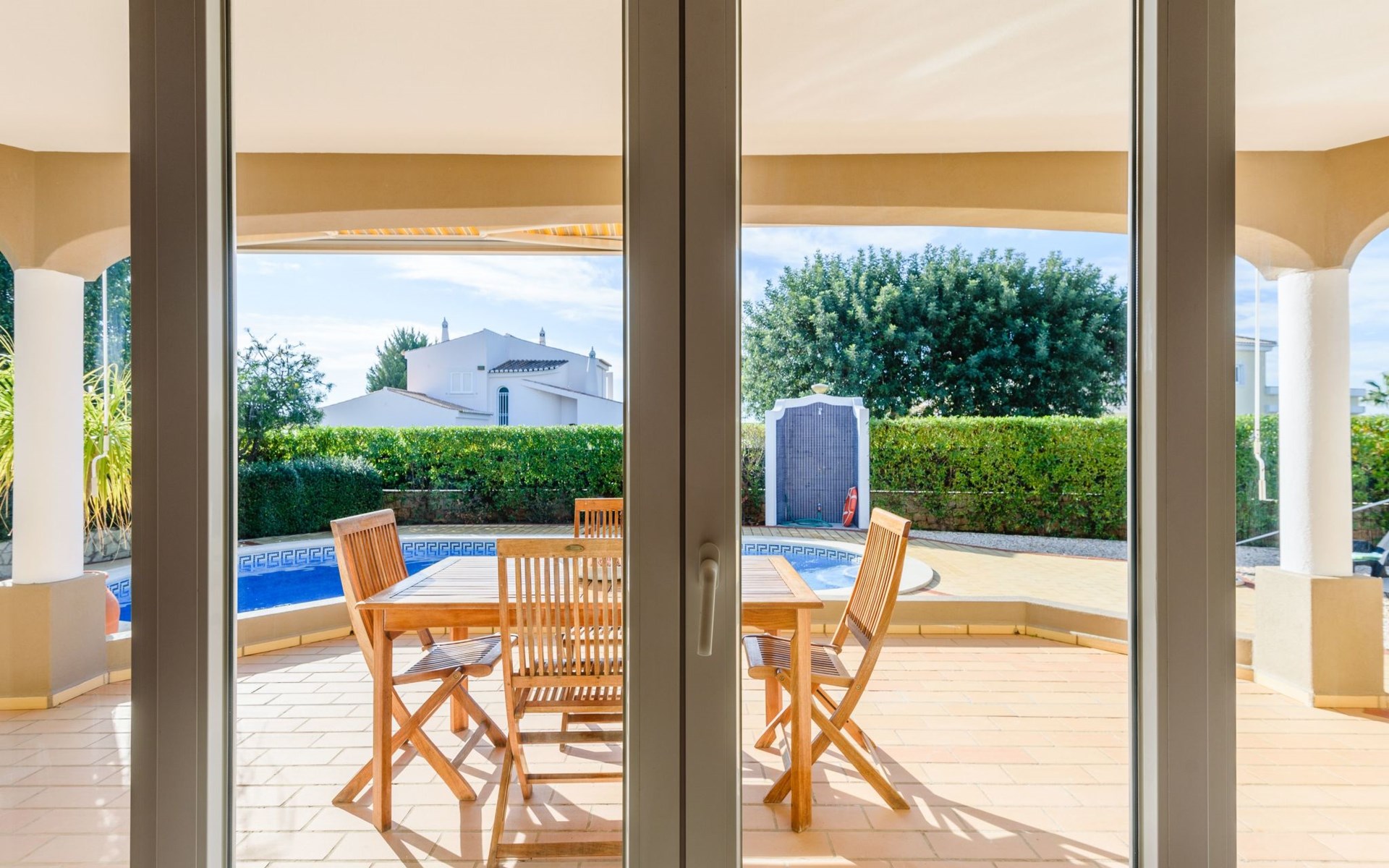 Das Äußere von Casa Rita ist eine Verkörperung von Freizeit und Entspannung. Der weitläufige, gesicherte Garten mit seinen vielen Obstbäumen bildet eine herrliche Kulisse für den privaten Pool und den Grillplatz. Die überdachte Terrasse bietet einen großzügigen, schattigen Zufluchtsort vor der Wärme der Sonne und ist der perfekte Ort, um den Außenpool zu genießen. Sonnenliegen und zusätzliche Schattenspender sorgen für ein erfrischendes und entspannendes Erlebnis im Freien.