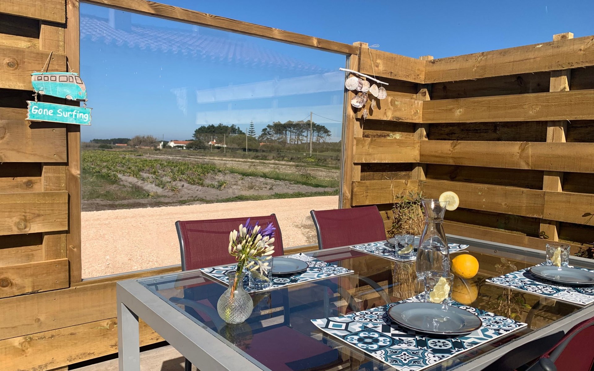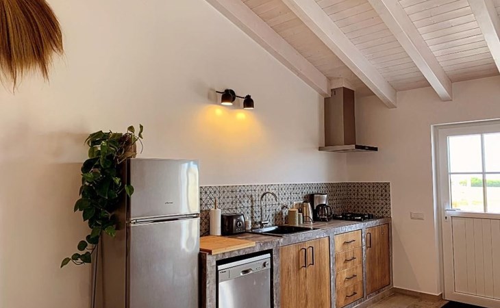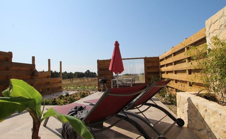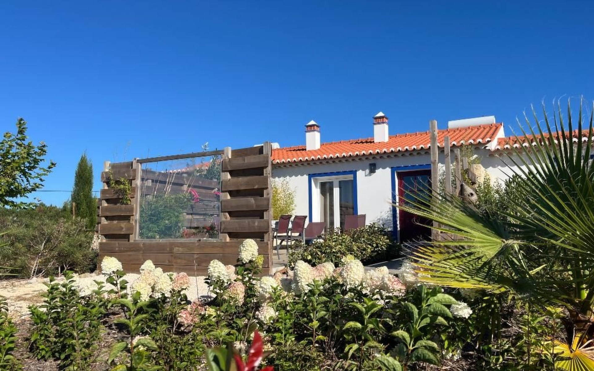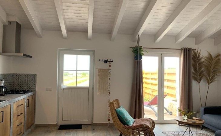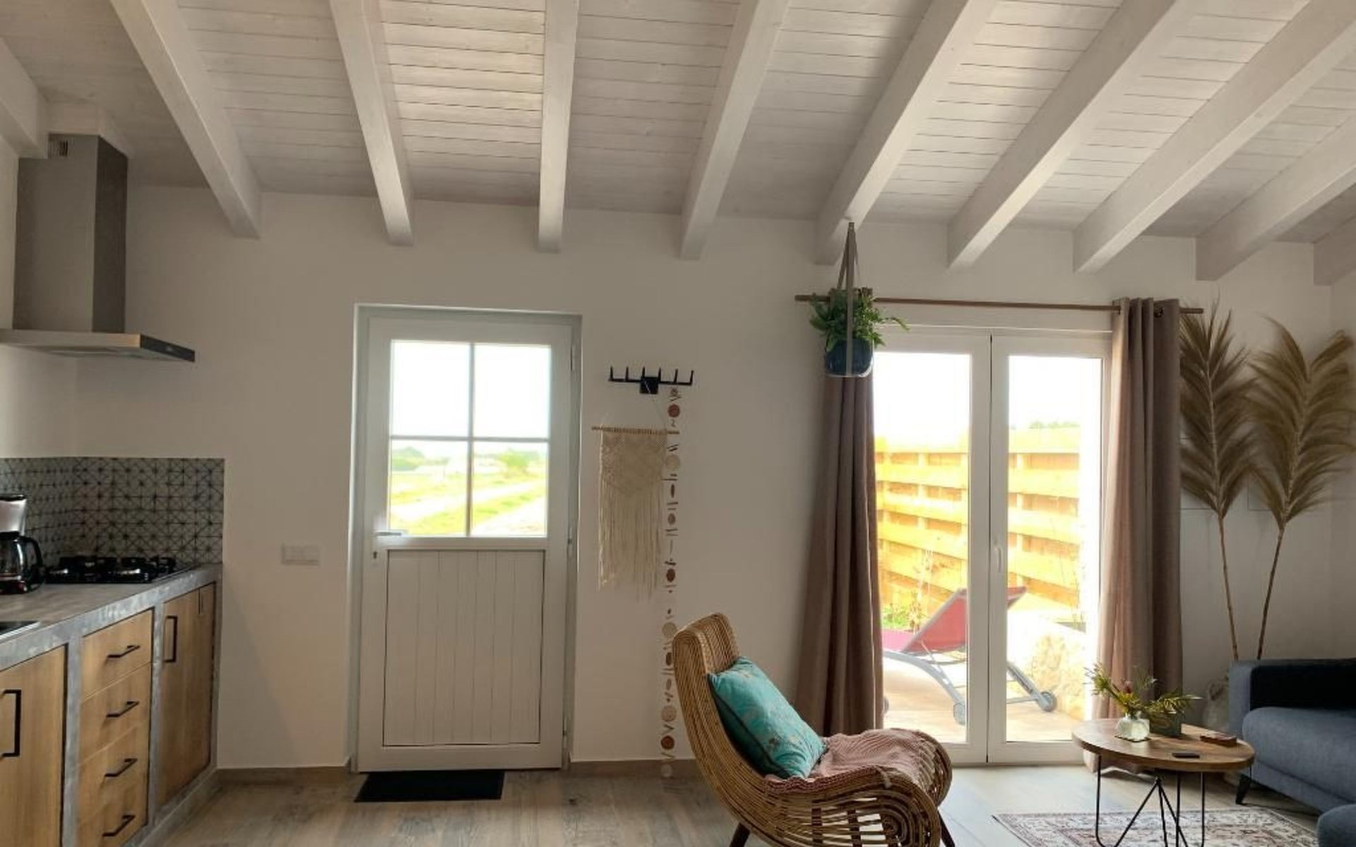 Draußen gibt es eine ruhige Terrasse mit Möbeln, Liegestühlen und Grill und einen Garten drum herum. In der Umgebung gibt es kleine landwirtschaftliche Betriebe, schöne Ausblicke über die Blumenfelder bis zum Meer.