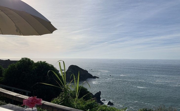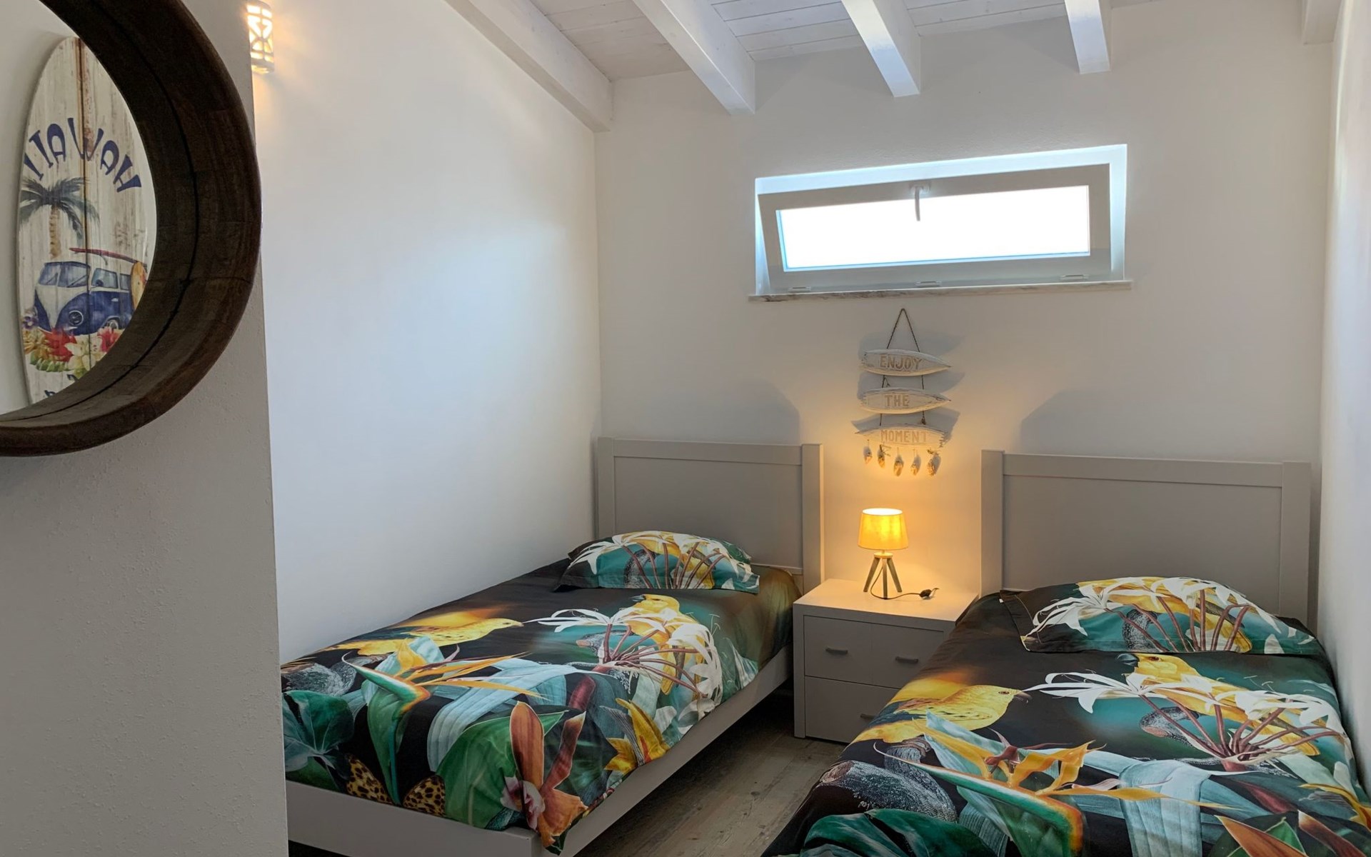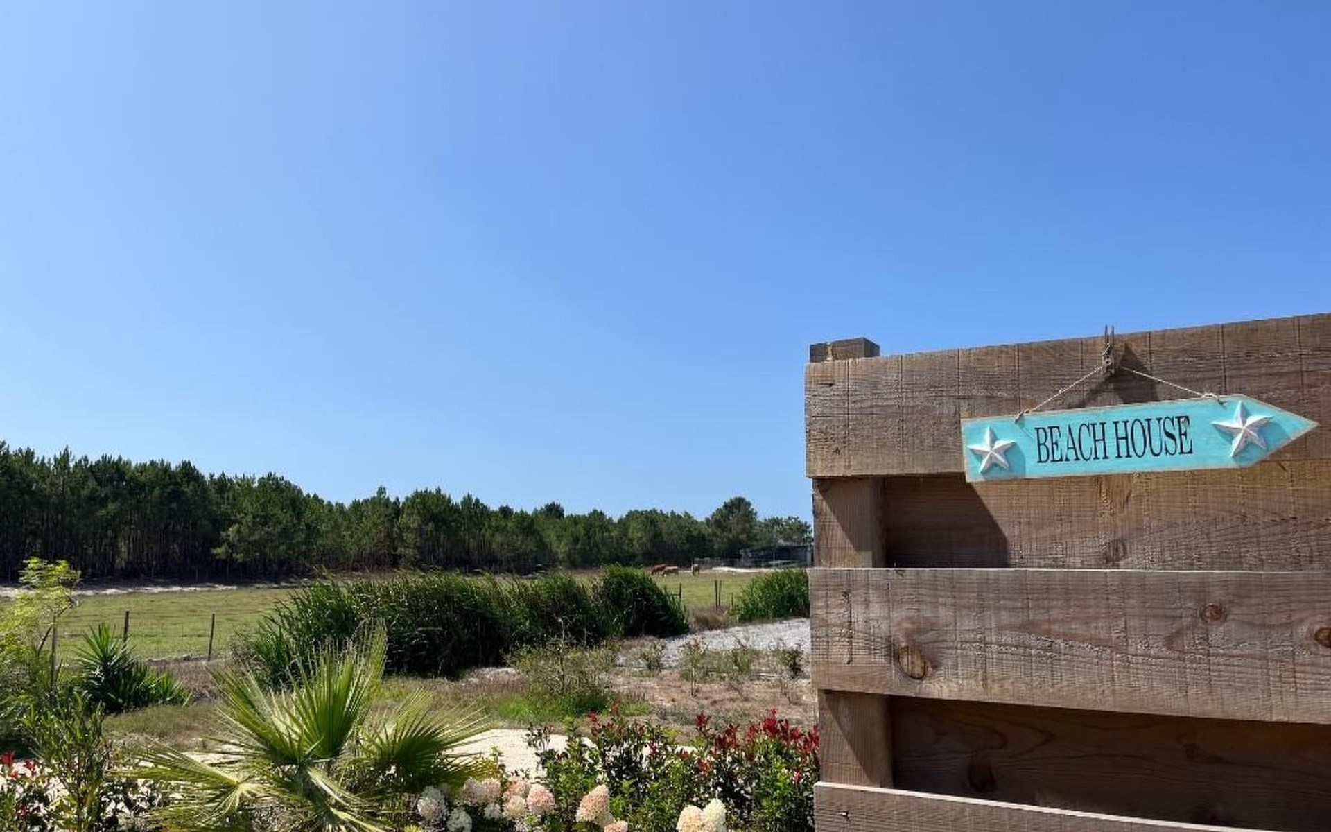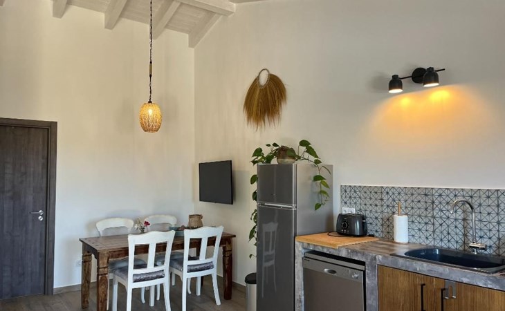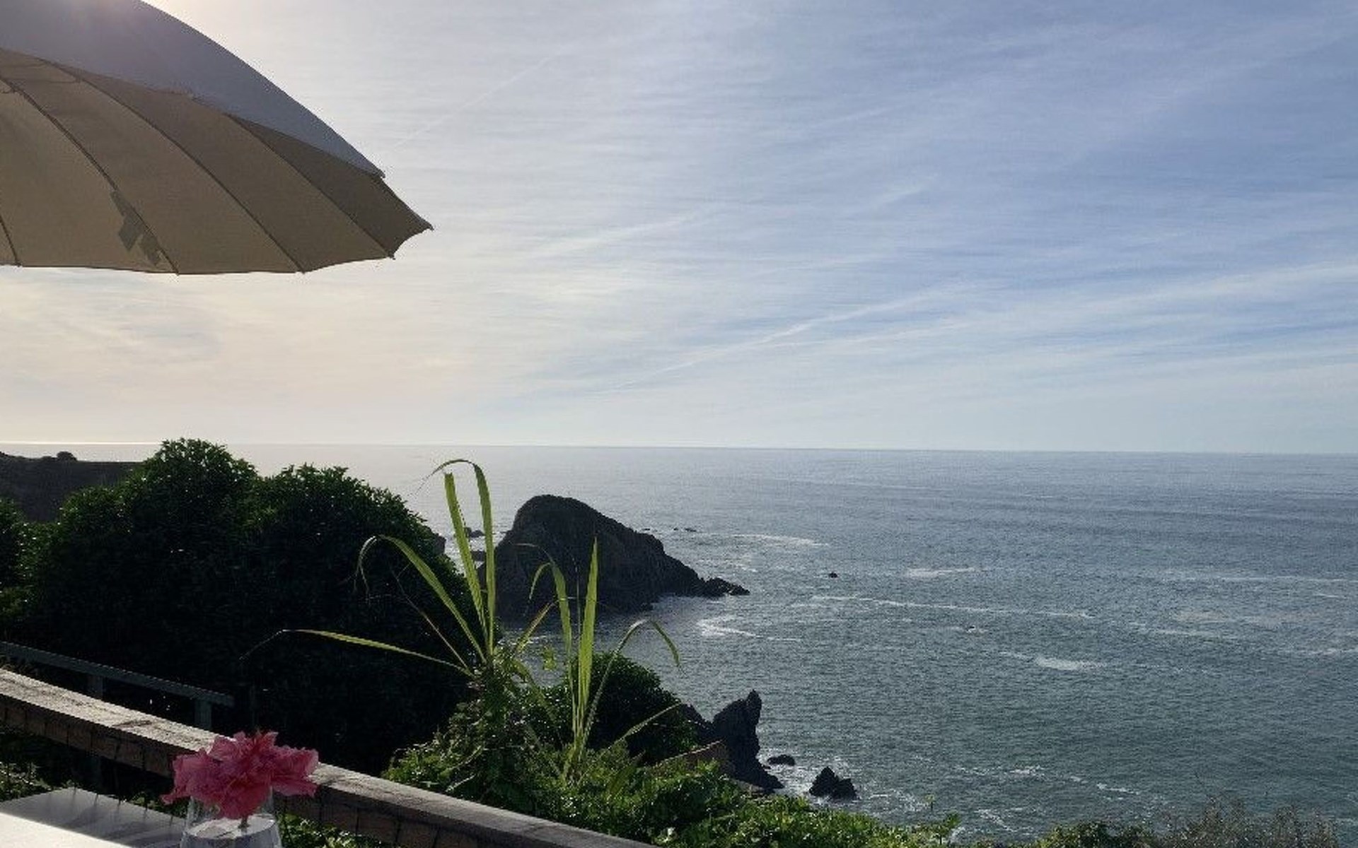 Draußen gibt es eine ruhige Terrasse mit Möbeln, Liegestühlen und Grill und einen Garten drum herum. In der Umgebung gibt es kleine landwirtschaftliche Betriebe, schöne Ausblicke über die Blumenfelder bis zum Meer.