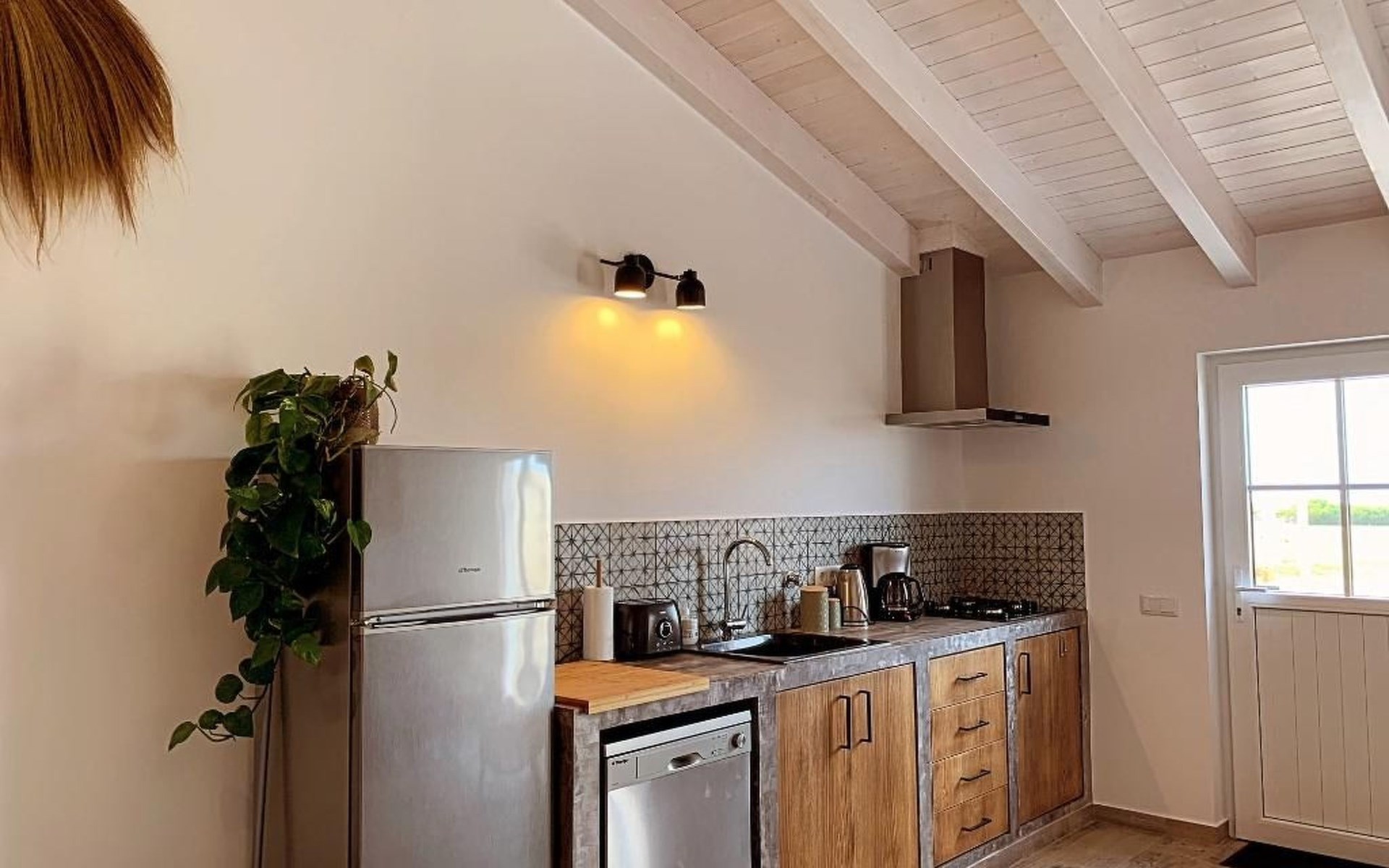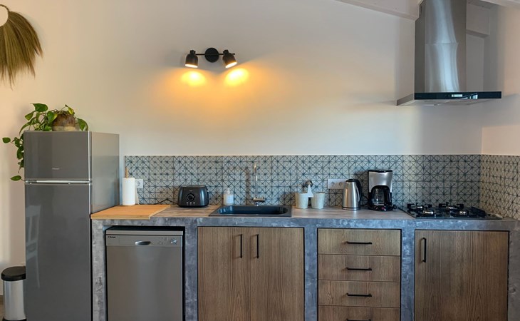 * Küchenzeile mit 4-Flammen-Herd, Kühl-/Gefrierschrank, Geschirrspüler, Toaster und Kaffeemaschine