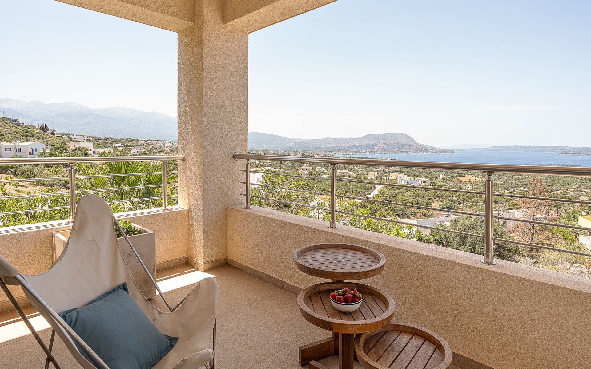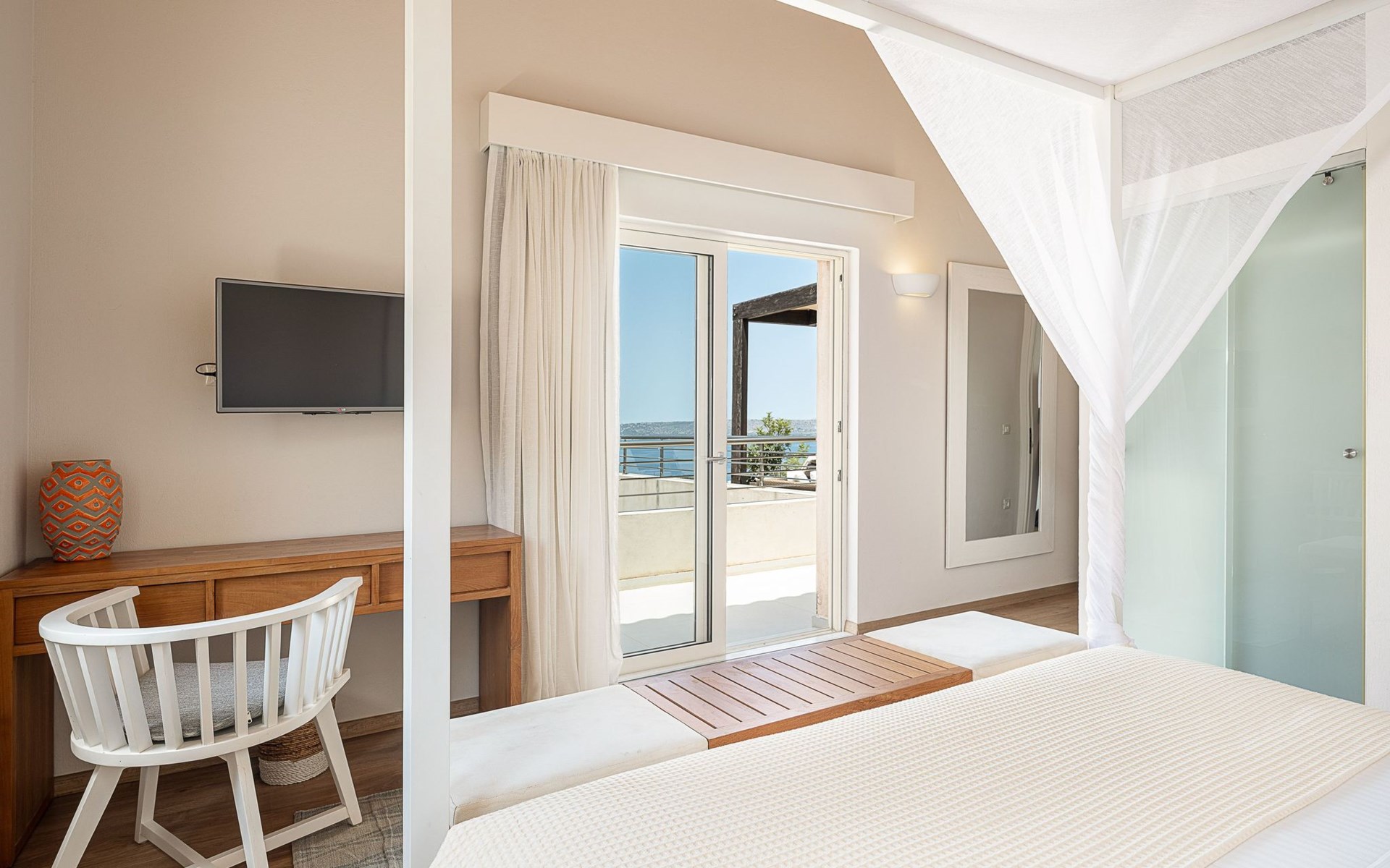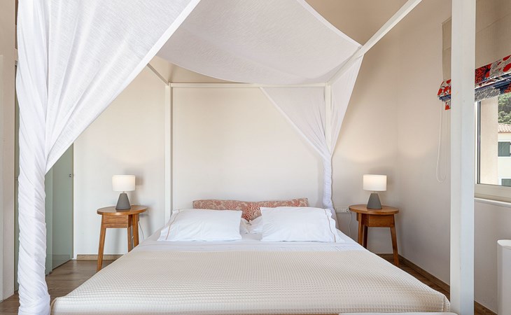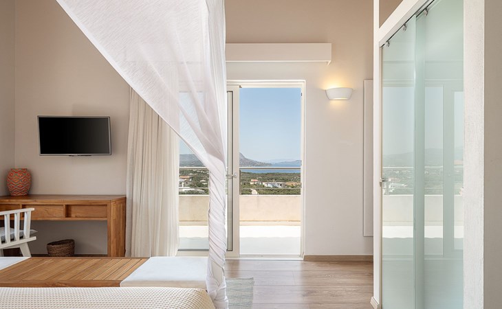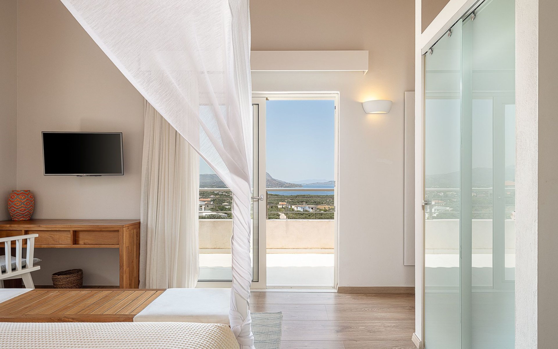 Schlafzimmer 2: Kingsize-Bett (1,80×2,00) mit Himmelbett, en-suite Badezimmer mit Badewanne, 36'' LED TV, große Terrasse mit Liegestühlen, Sofa und Panoramablick